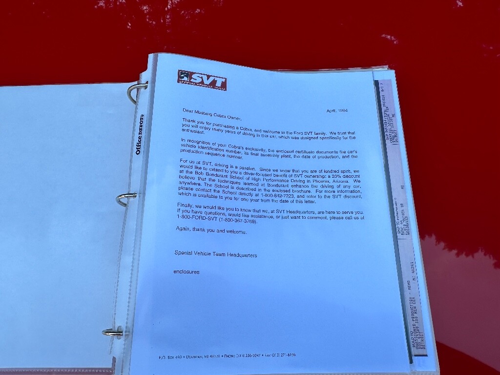 1993 Ford Mustang Cobra R with 9K Miles on it and is a 1 Owner. The 1993 R GMP Model Car was used to build the model and numbered model goes with the car. Great Mustang History. Vibrant Red in Color and is riding on the factory Cobra R Wheels. The interior has the Opal Gray Cloth and powered by the 5.0L V8 with the 5 Speed manual. This Mustang has Orignal Window Sticker, SVT Certification, Copy of Original Title and much more documentation. FOR MORE INFORMATION ABOUT THIS VEHICLE PLEASE GIVE MIKE MORRISON SR A CALL AT 704-782-7716. Morrison Motor Cars Inc. is a Family owned and operated business that has been in business for many years. We have been in business for so many years due to so many great reasons. One way, is we don't play the mind games and keep you here at the dealership for many hours. Another way is we don't charge all the dealership fees like (Admin, inspection, process fee), we only have a documentation fee. We strive to make your vehicle buying experience as easy as possible. If you need financing, our financing department is here to get you the best deal out there. We don't ruin your credit by sending it to 10 different lenders or banks. Our financing manager wants to keep your credit good and get you the best deal. Have a Trade? We take those also, all years and makes. For more details about Morrison Cars Inc. please go to our company website to learn more about us and see our current inventory. We are not just here just to sell you one car, we are here to develop a relationship so we can sell you many vehicles over the years. Thank you for the interest in this vehicle and we look forward to doing business with you.