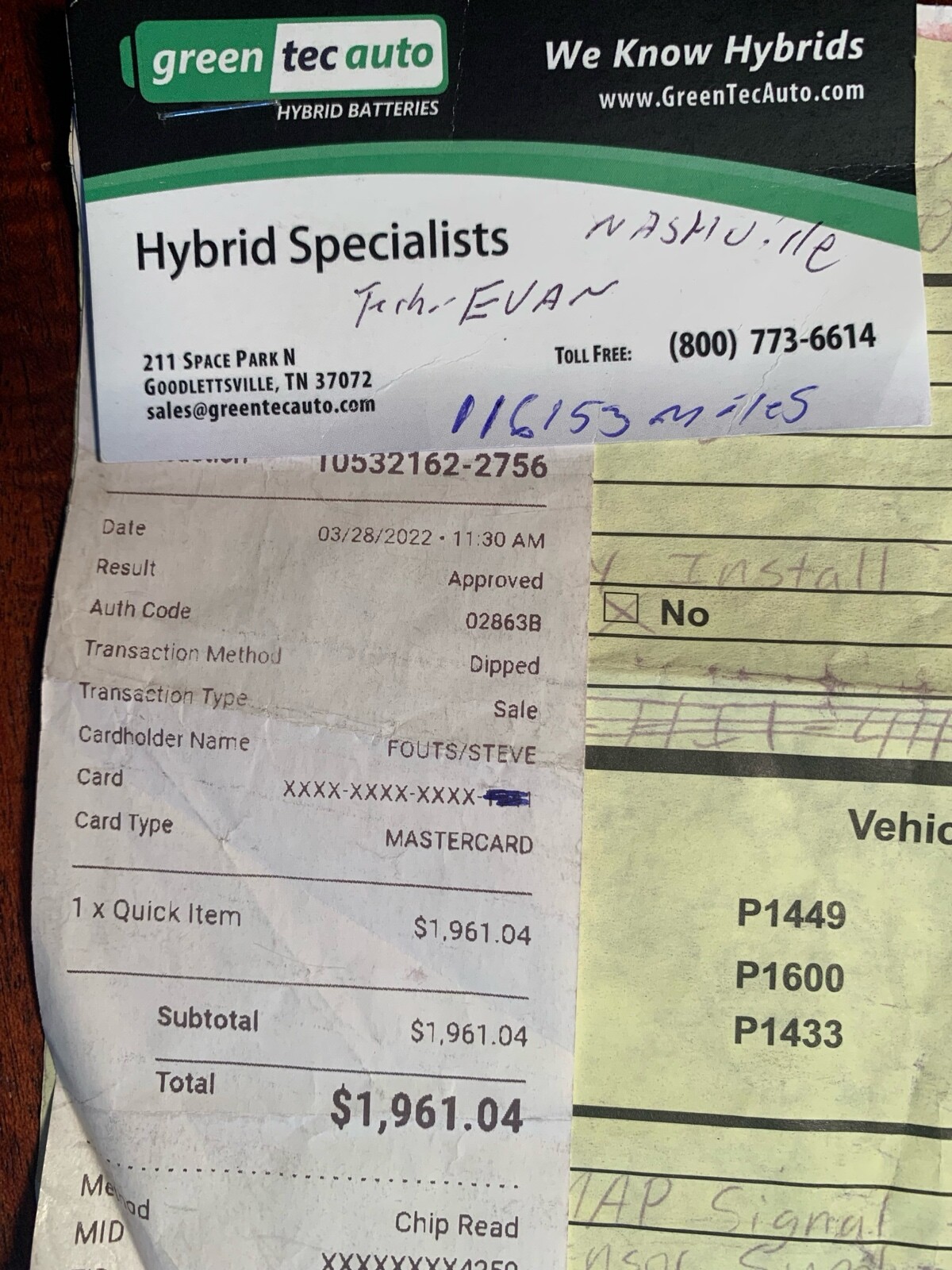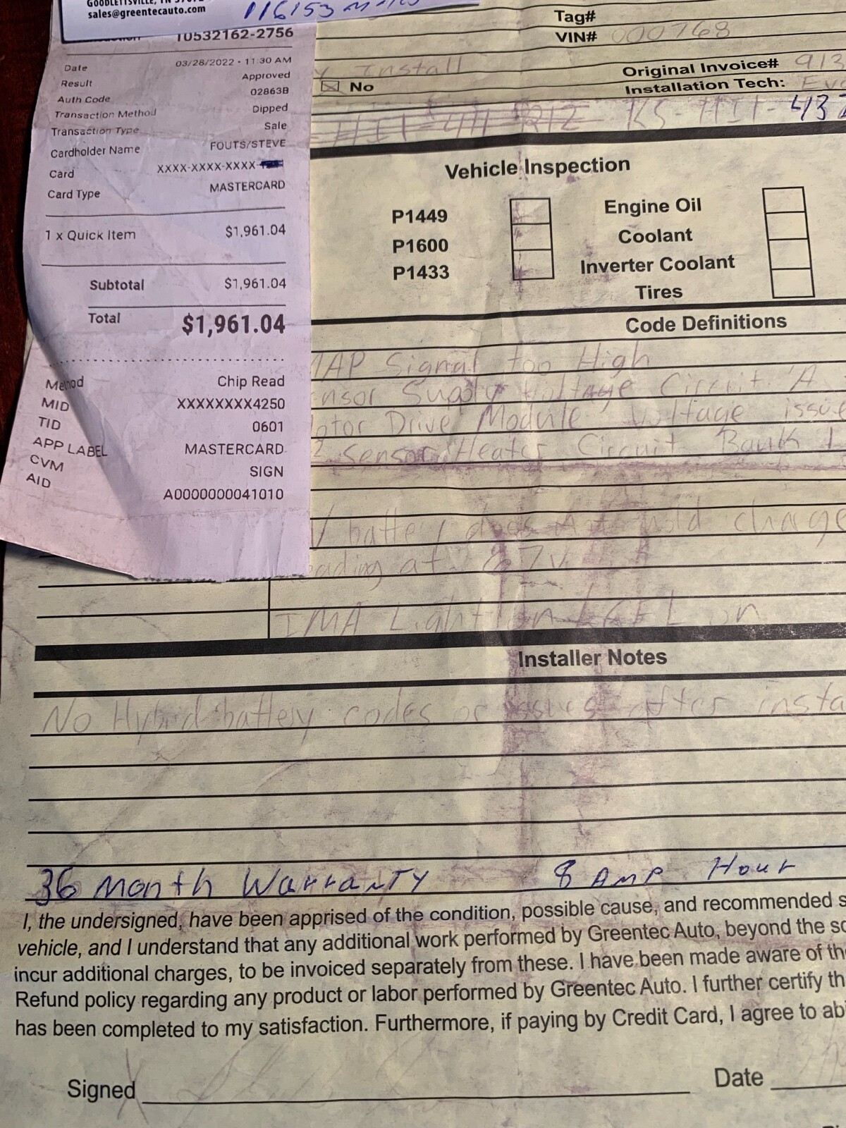 Replaced Hybrid Battery by green tec auto On 3/28/22 with new , not rebuilt battery. With 36 month transferable warranty. Warranty good till 3/28/25 .Vehicle Details