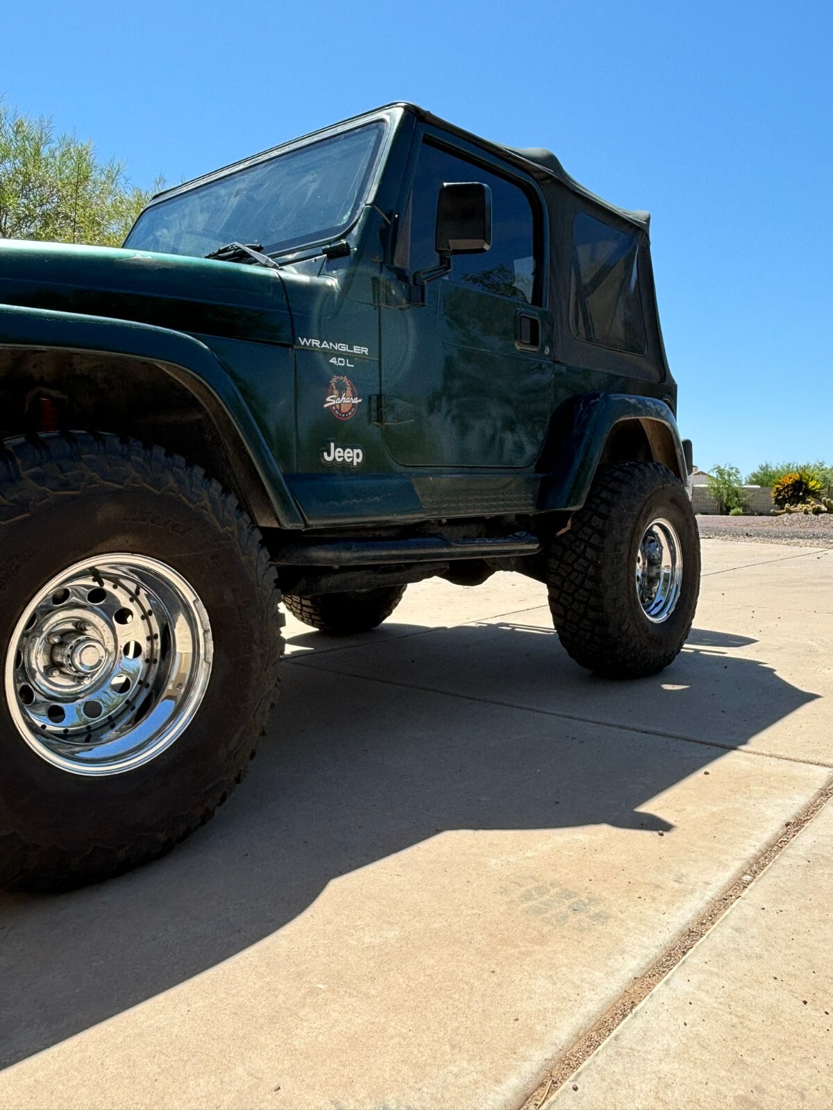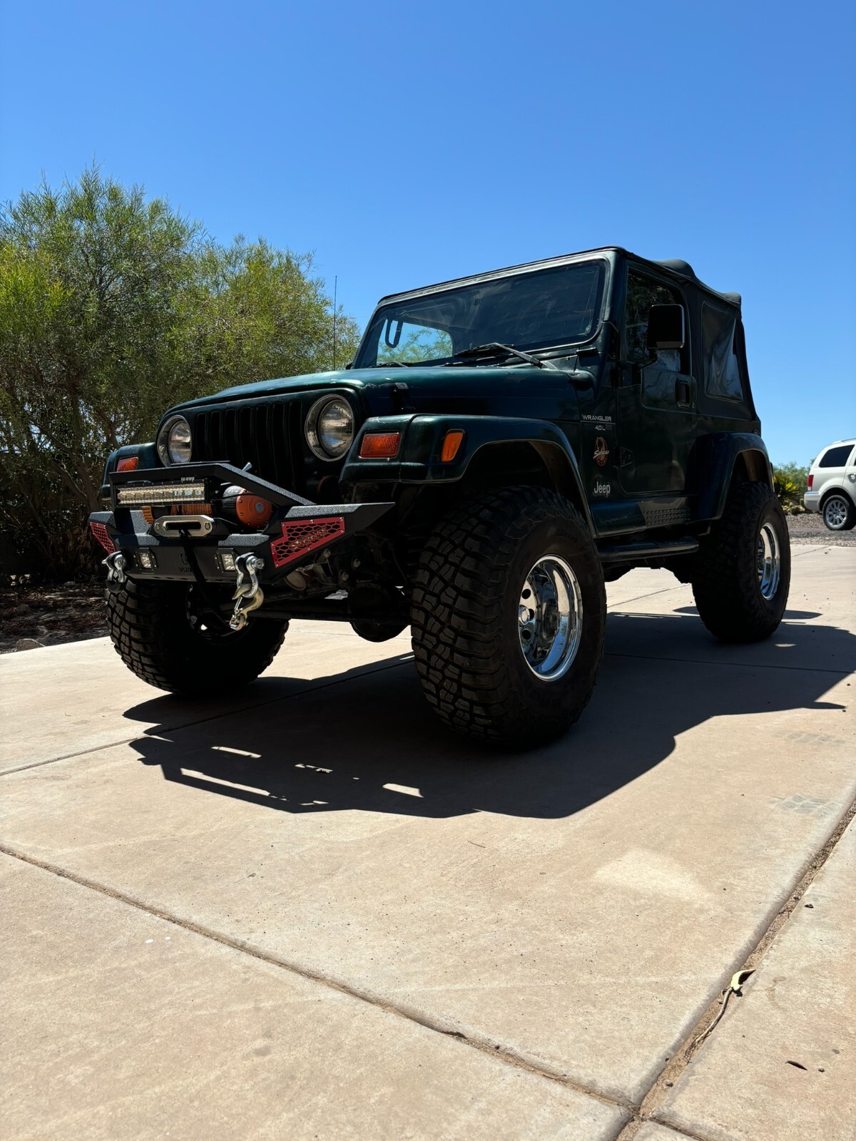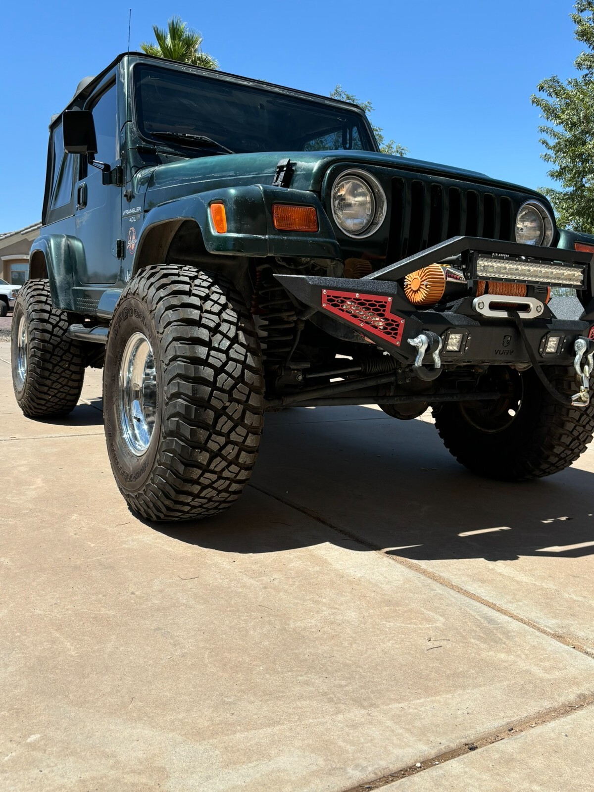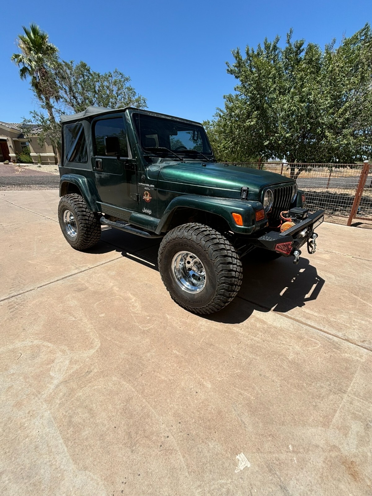 Rust free Saraha TJ with 5 speed manual, 4.0 inline 6, lift, 35" BFG Mud Terrains with little use. New font seats and carpet. This southwestern TJ runs smooth, shifts smooth and has plenty of power. New exhaust manifold, exhaust pipes, muffler, catalytic converter and steering stabilizer. Fresh tune up with plugs wires, cap and rotor. AC has a slow refrigerant leak but blows cold when fully charged. Clear coat on the hood and top of fenders is starting to come off. Stereo speakers are not hooked up. The previous owner had an amplifier and took it when they sold the Jeep and didn't hook up the speakers. Everything works as it should. This is a nice jeep that will go anywhere.