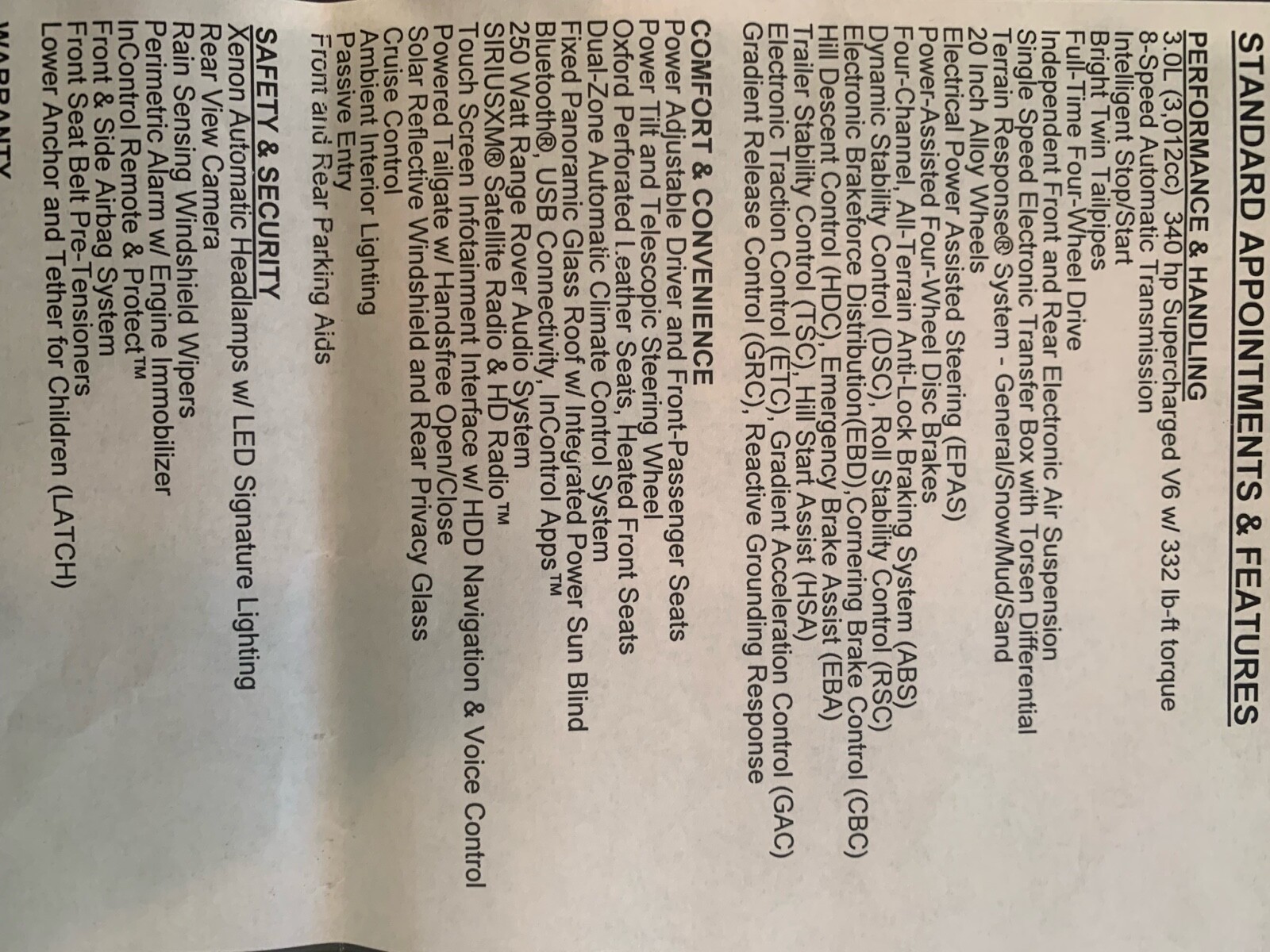 The car is well optioned with all options (see window sticker). The heated and air conditioning seats make this a very comfortable ride in all climates. The panoramic Sun roof opens wide to provide an almost convertible feel. The optional 22” wheels provide an upscale impression and a smooth highway ride. This car is “Supercharged”. It is surprisingly quick with lots of torque and making up to 380 HP with the V6 engine while averaging around 21 mpg.