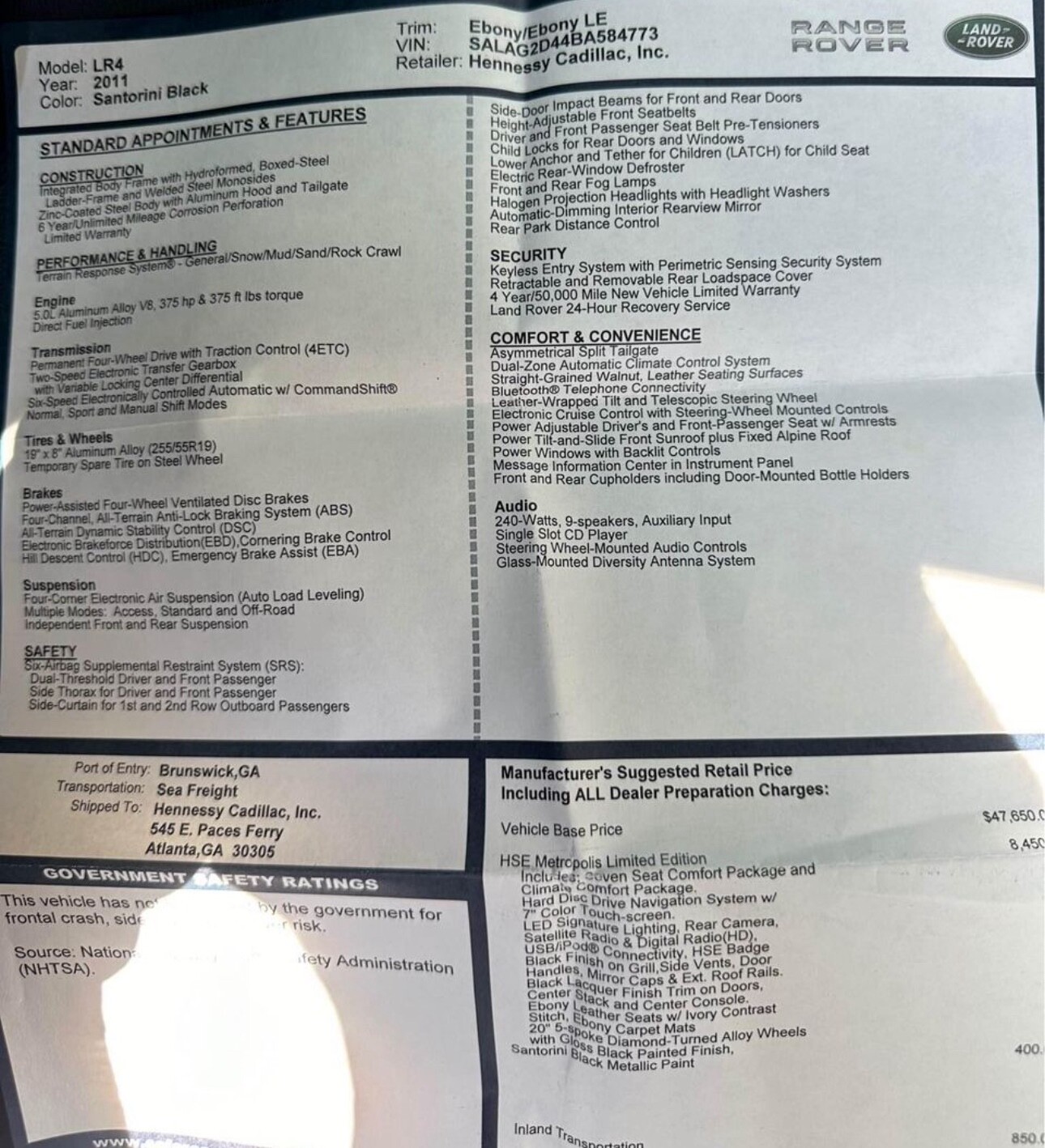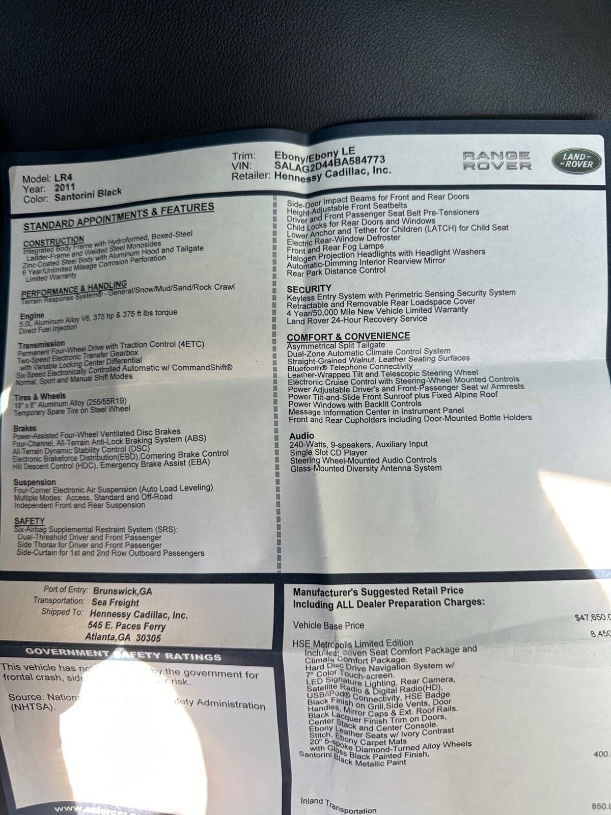 For sale is a 2011 Land Rover LR4 HSE Metropolis Limited Edition. Running great and ready to go. All black from factory. Very unique package and not another one like it in the country in terms of condition. 108k miles. Clean carfax. No rust. Always a souther vehicle. Trailer wiring is done and I will include the Land Rover hitch adapter. Gapiid tool also included. Please feel free to reach out with any questions. Title in hand.