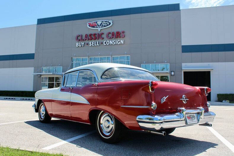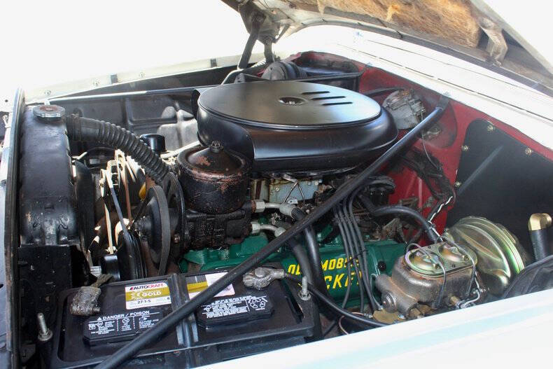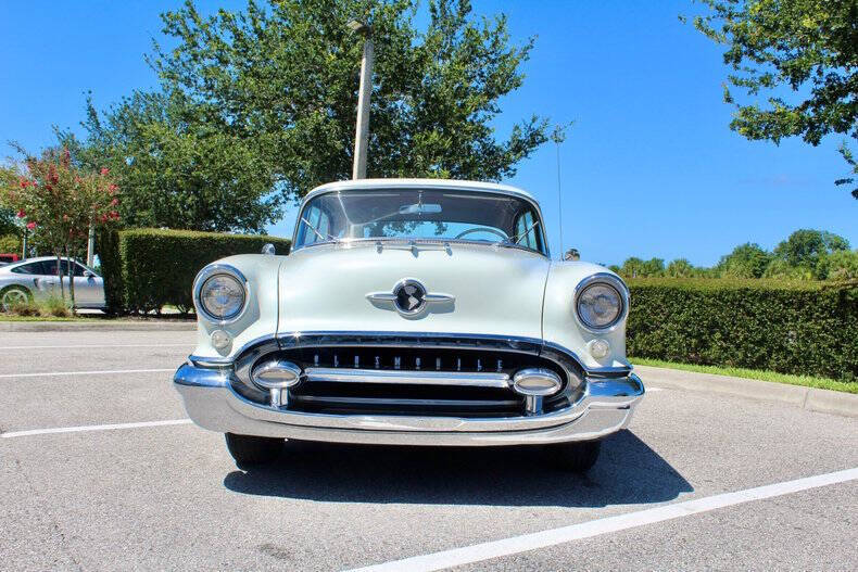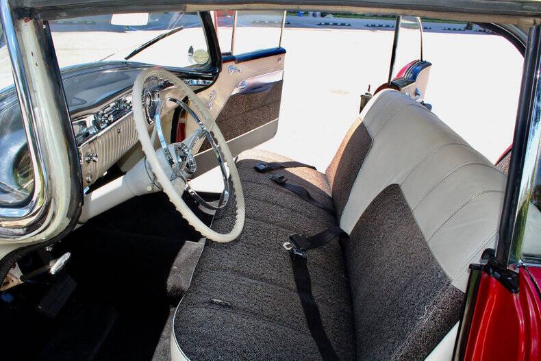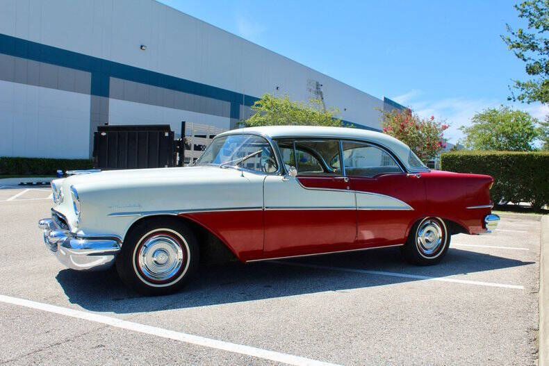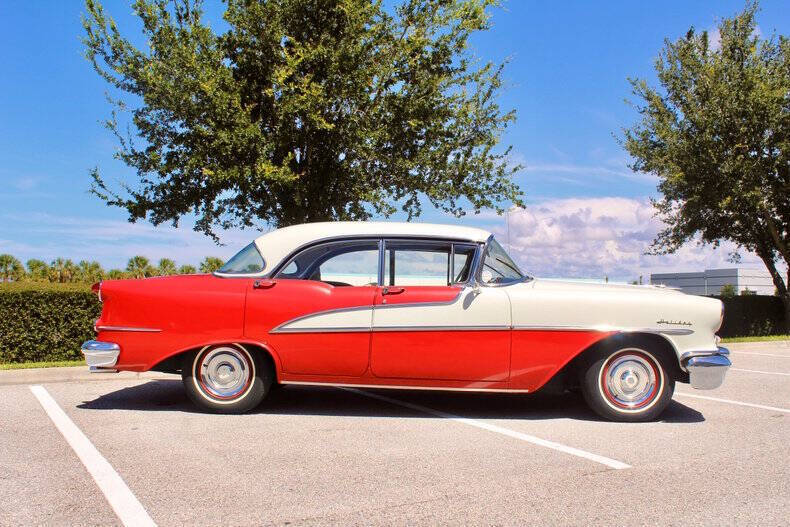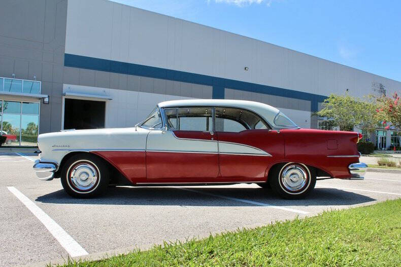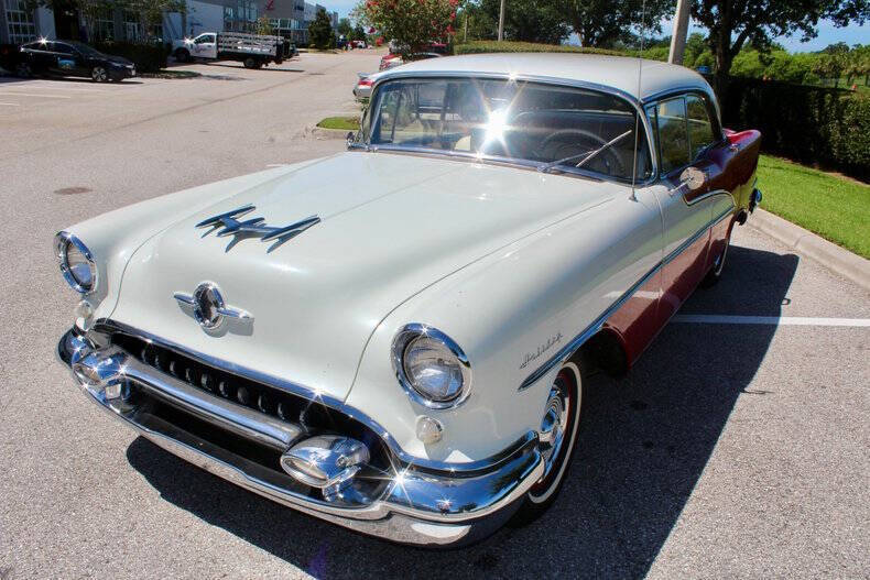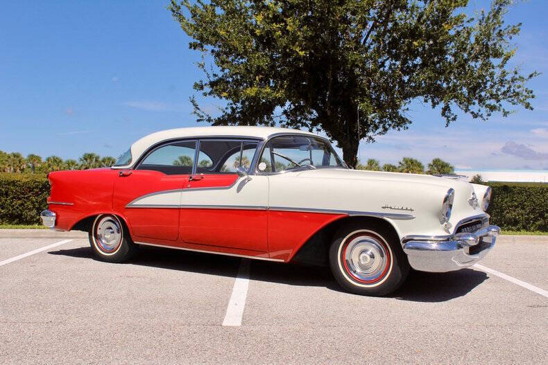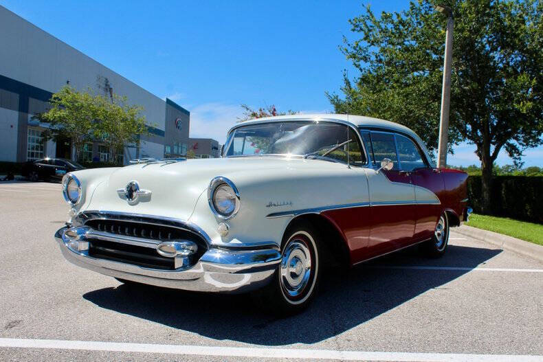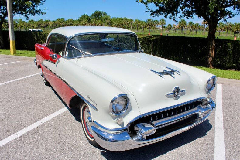 1955 Oldsmobile Super 88 Holiday Step back in time with this incredible survivor 1955 Oldsmobile Super 88, a true icon of mid-century American automotive design. Combining powerful performance with unparalleled style, this classic car is a must-have for any enthusiast or collector. This 1955 Super 88 Holiday 4 door hard top comes with a two-tone paint in red and polar white exterior over charcoal anthracite interior. Experience the raw power and smooth performance that made Oldsmobile a leader in the '50s. It is powered by Rocket V8 324CI engine mated to a Hydra-Matic 4-speed automatic - Enjoy a seamless driving experience with this advanced (for its time) transmission. The odometer shows 28,116 which the owner believes to be original, and the title shows miles as exempt. The vehicle was on display at Jim Dewar Oldsmobile in Johnstown, PA for over 30 years. The chrome accents and iconic rocket emblems are in excellent condition, adding to the car's authentic look. Whitewall tire mounted on steel wheels with Oldsmobile hubcaps for that period-correct appearance. AM radio to enjoy your favorite vintage tunes. Power Steering and Brakes for driving comfort with classic styling. The 1955 Super 88 represents a pivotal era in automotive history, known for its revolutionary design and performance. The elegant curves, distinctive grille, and two-tone paint make this car a head-turner at any event or on the open road. Classic cars like the Oldsmobile Super 88 not only provide joy and nostalgia but also tend to appreciate in value over time. EXTERIOR: aˆc Red aˆc Chrome Olds hubcaps aˆc Hardtop aˆc Chrome bumpers INTERIOR: aˆc Charcoal anthracite bench seat aˆc AM Radio aˆc Seat belts MECHANICS: aˆc 8-cyl. 324cid/202hp aˆc 4-Speed automatic UNDERCARRIAGE: aˆc Clean Call us at941-208-6886, a live person answers the phones from 9am - 9pm (EST) Financing is available on our website We can ship this vehicle worldwide door to door Our indoor showroom is located at 7910 25th Court East Unit 107 Sarasota, FL 34243