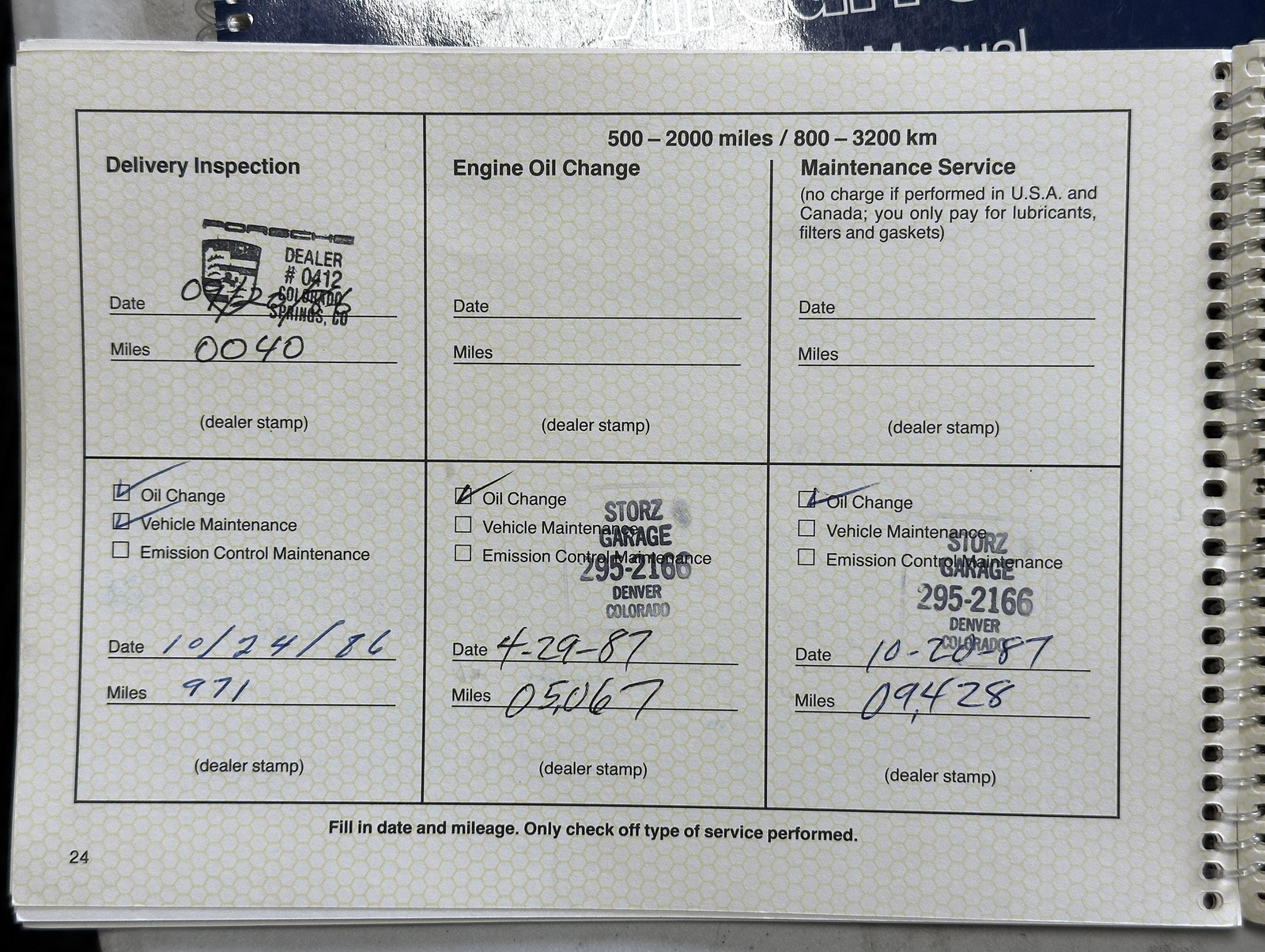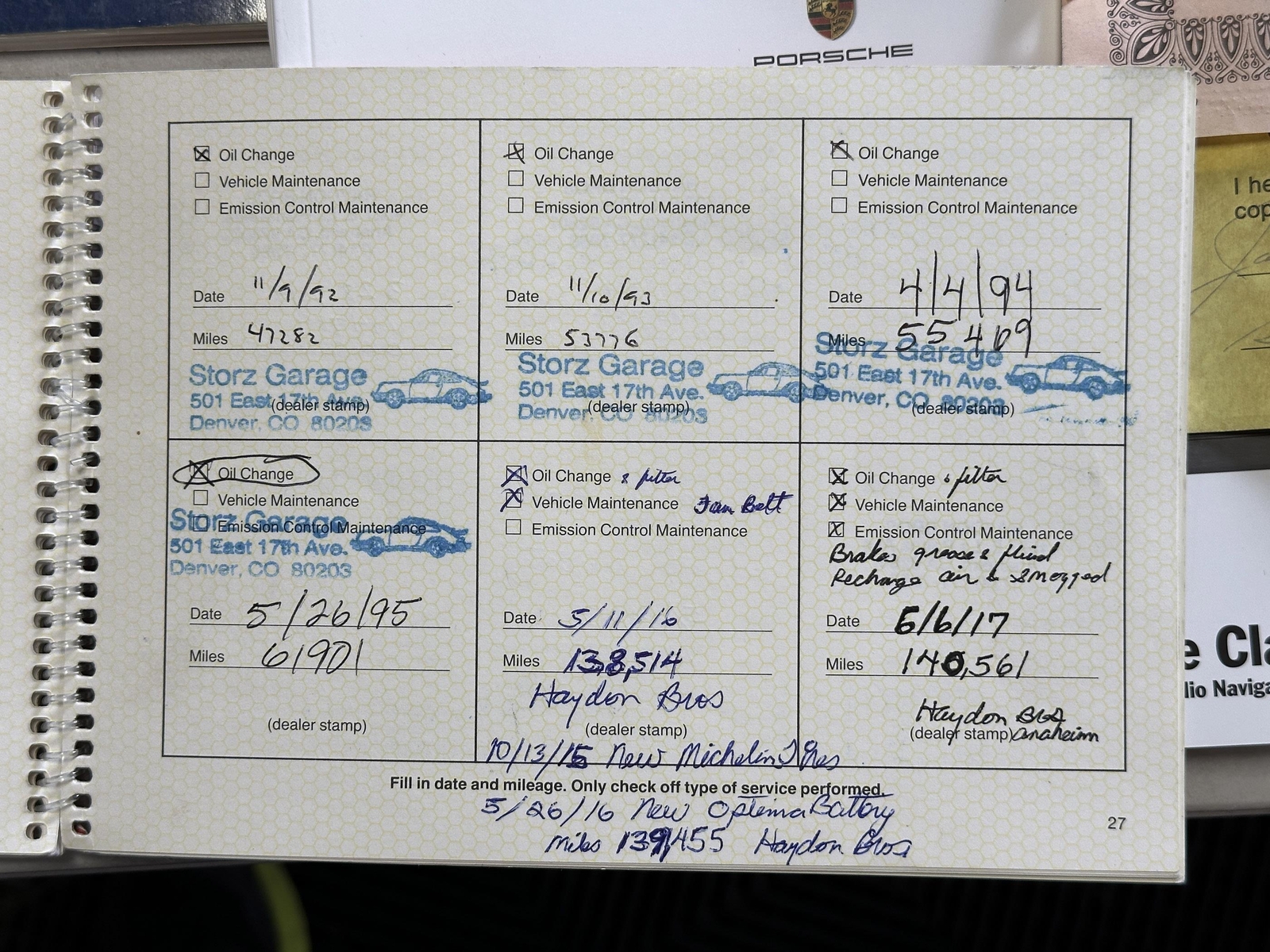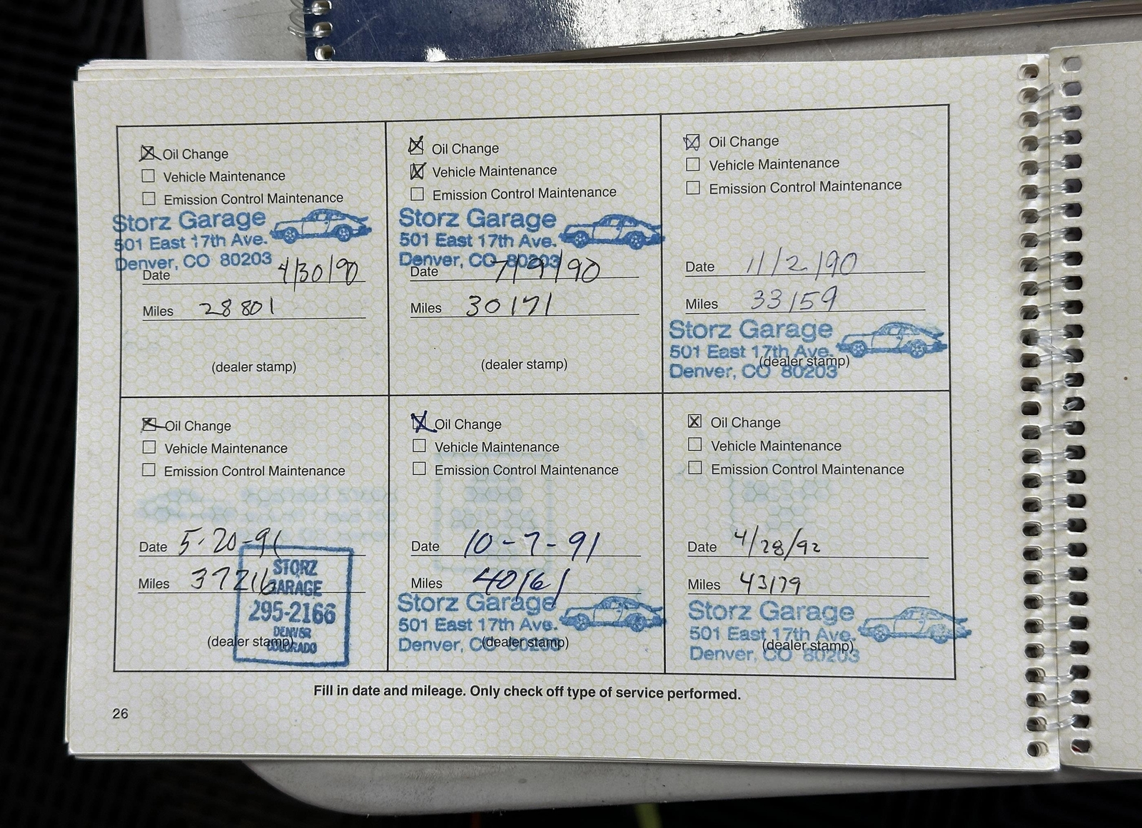 The first owner was Jack Henderson of Denver, Colorado. He kept this 911 for 18 years/95k miles. He serviced it regularly at either the local Porsche dealer or an independent specialist. He kept not only every service receipt but also had the maintenance booklet stamped. This is one of the first maintenance booklets I’ve seen stamped from new until the present day.