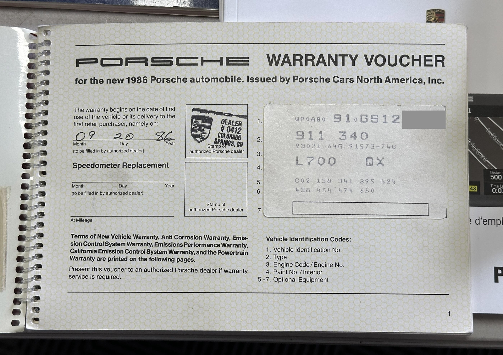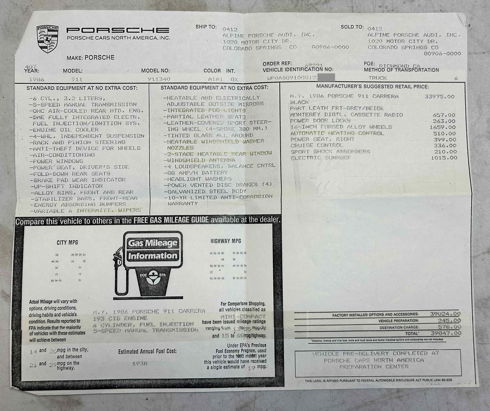 This 911 was a very late ’86 example. It was built in June of 1986 and sold new by Alpine Porsche + Audi in Colorado Springs, California on September 20, 1986. The factory options include: