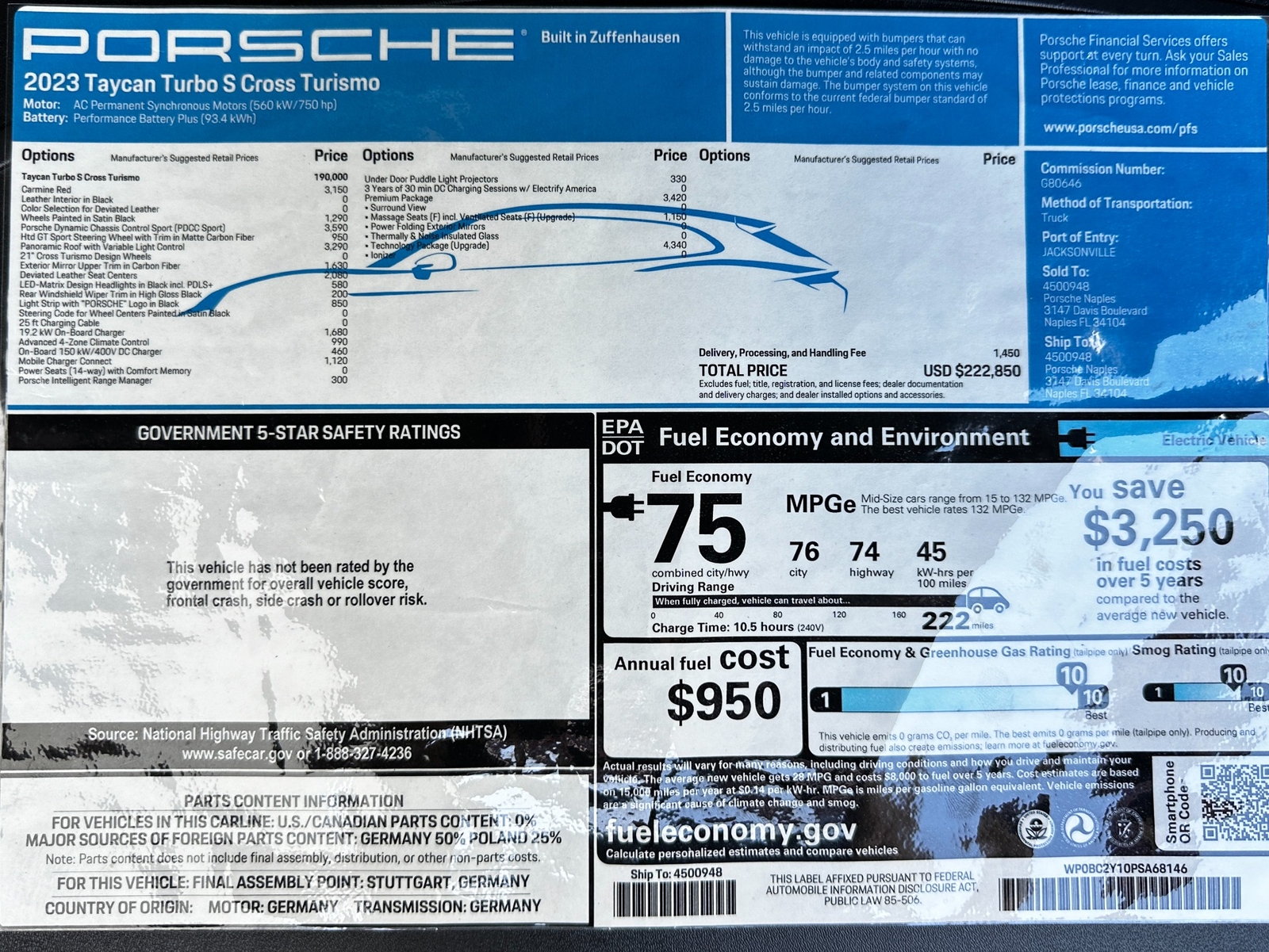 Marino Performance Motors proudly presents this 2023 Porsche Taycan Turbo S Cross Turismo. Fresh trade in , it is Equipped with an absolutely stunning color scheme and optioned with a host of comfort and beauty packages, This Taycan Turbo S with it's 750 horsepower electric motors manages an impressive 0-60 of under 3 seconds.