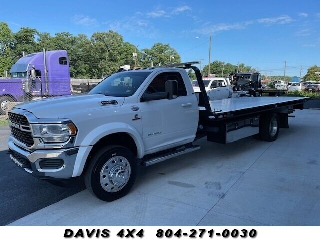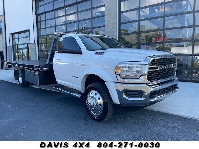 2022 Ram 5500 Cummins Rollback Flat Bed Tow Truck. We just traded this unit in on a fresh replacement. We sold it when it was basically new with 1000 miles Miller industries Vulcan steel bed 19.5 x 102, two car carrier with wheel lift LED lights work lights strobe light bar for fresh rear tires left and right side toolbox, SLT trim package side, Steps alloy, wheels, chrome appearance package, dark tinted windows, Cummins turbo diesel engine, remote keyless entry, clean damage free interior with full power options fold out Towing mirrors color matched front Alcoa wheels this truck needs nothing it is 100% ready to put to work serviced and maintained properly and on time.