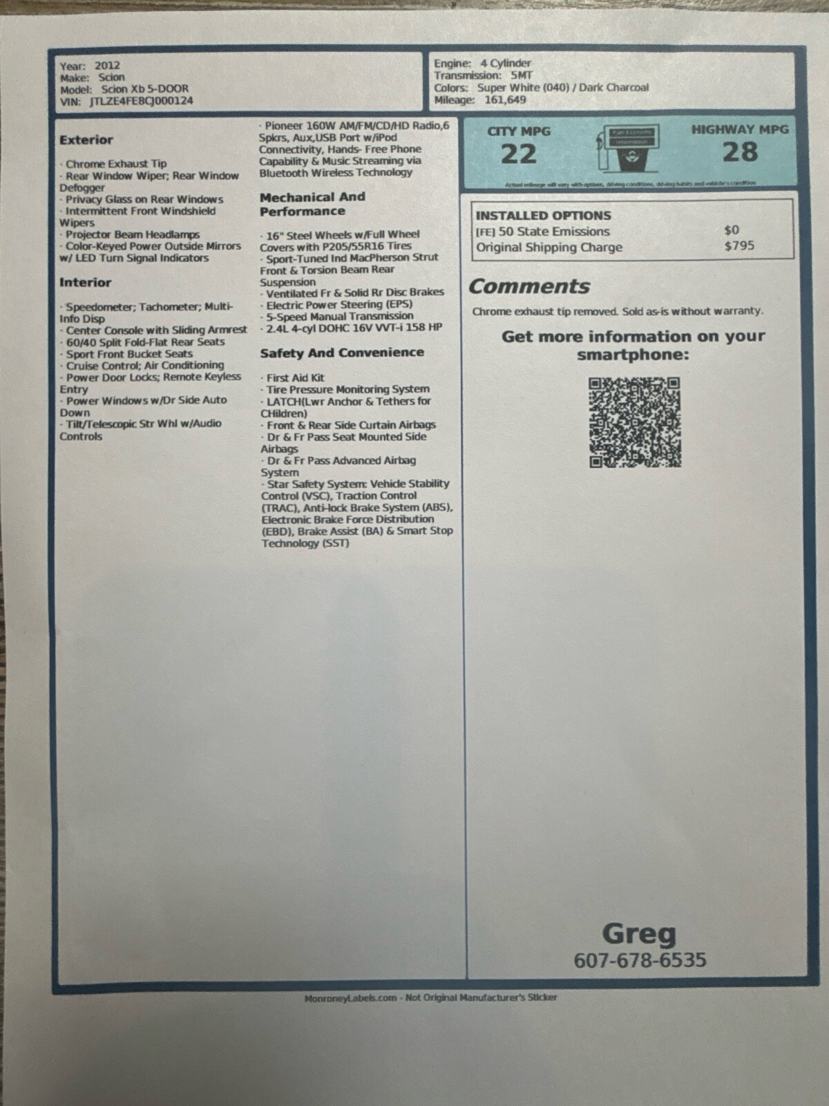 Window sticker link: https://monroneylabels.com/cars/11967206-2012-scion-scion-xbVehicle Details