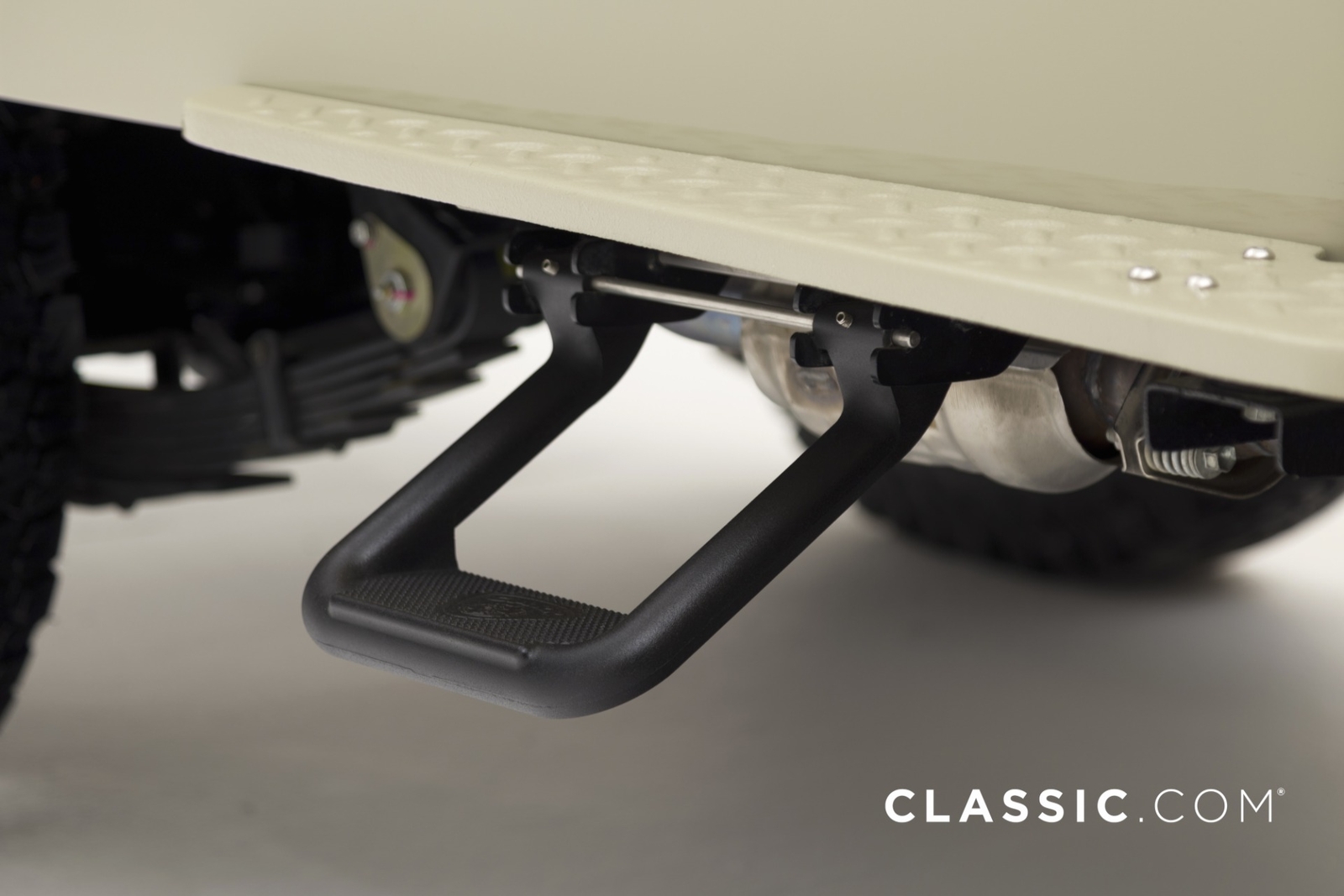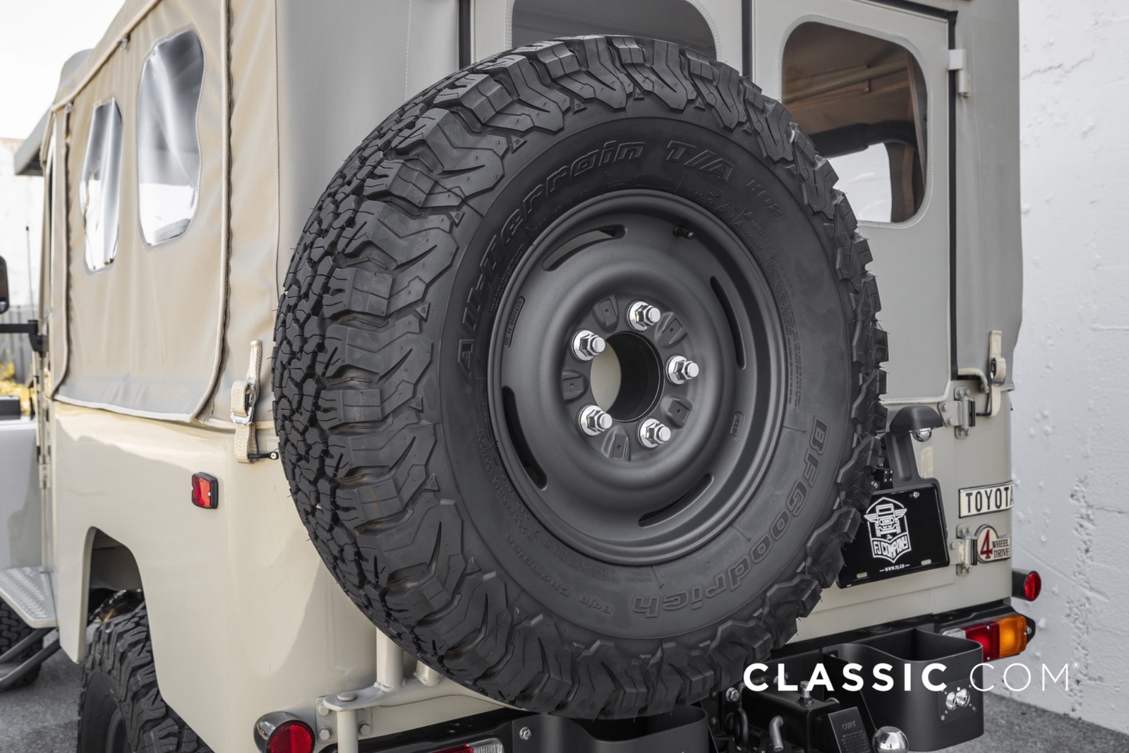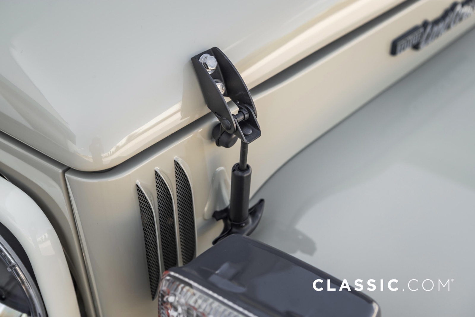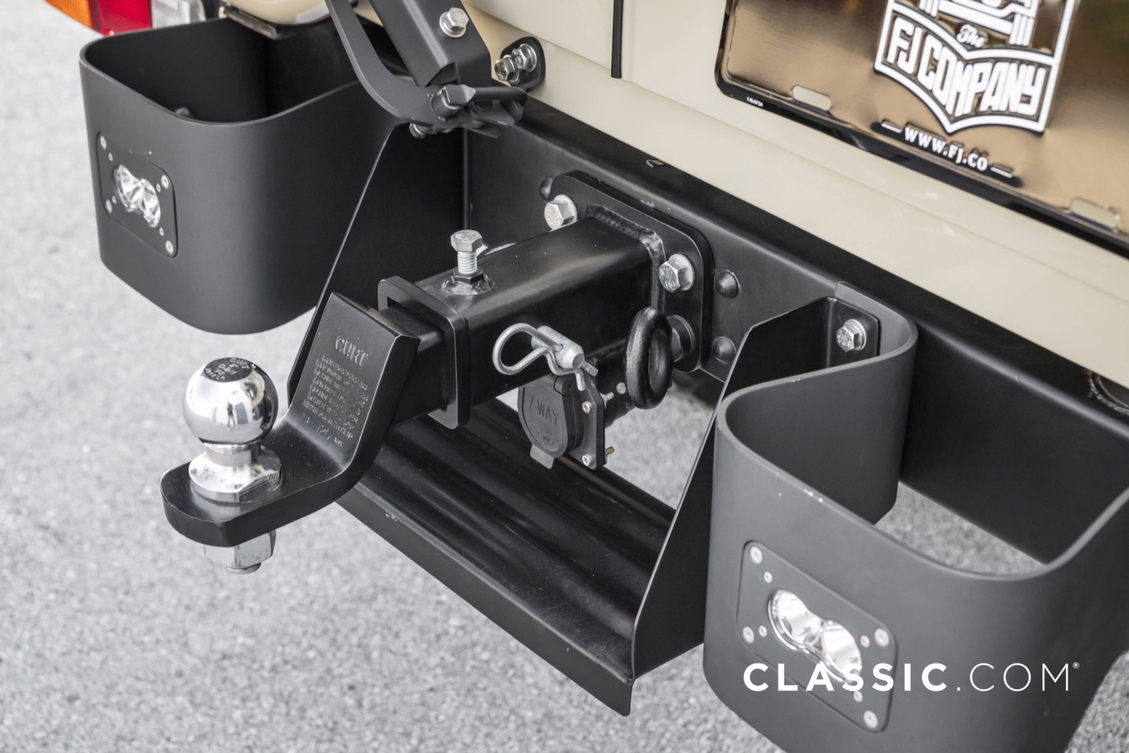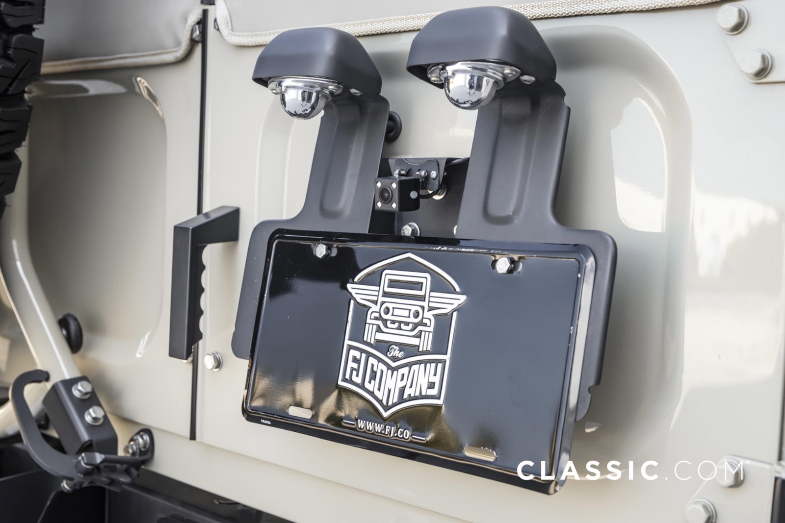 Under the classic exterior, significant upgrades provide superior performance including a modern front coil spring suspension, auto-locking hubs, and essential safety features such as electronic vehicle stability control, traction control, ABS, and a Borla muffler. Aesthetically, this truck stands out with custom 16-inch wheels by Braid for The FJ Company, a retro-styled grille, custom mirrors, bumpers, and added fog lights, maintaining an iconic look while integrating modern touches.