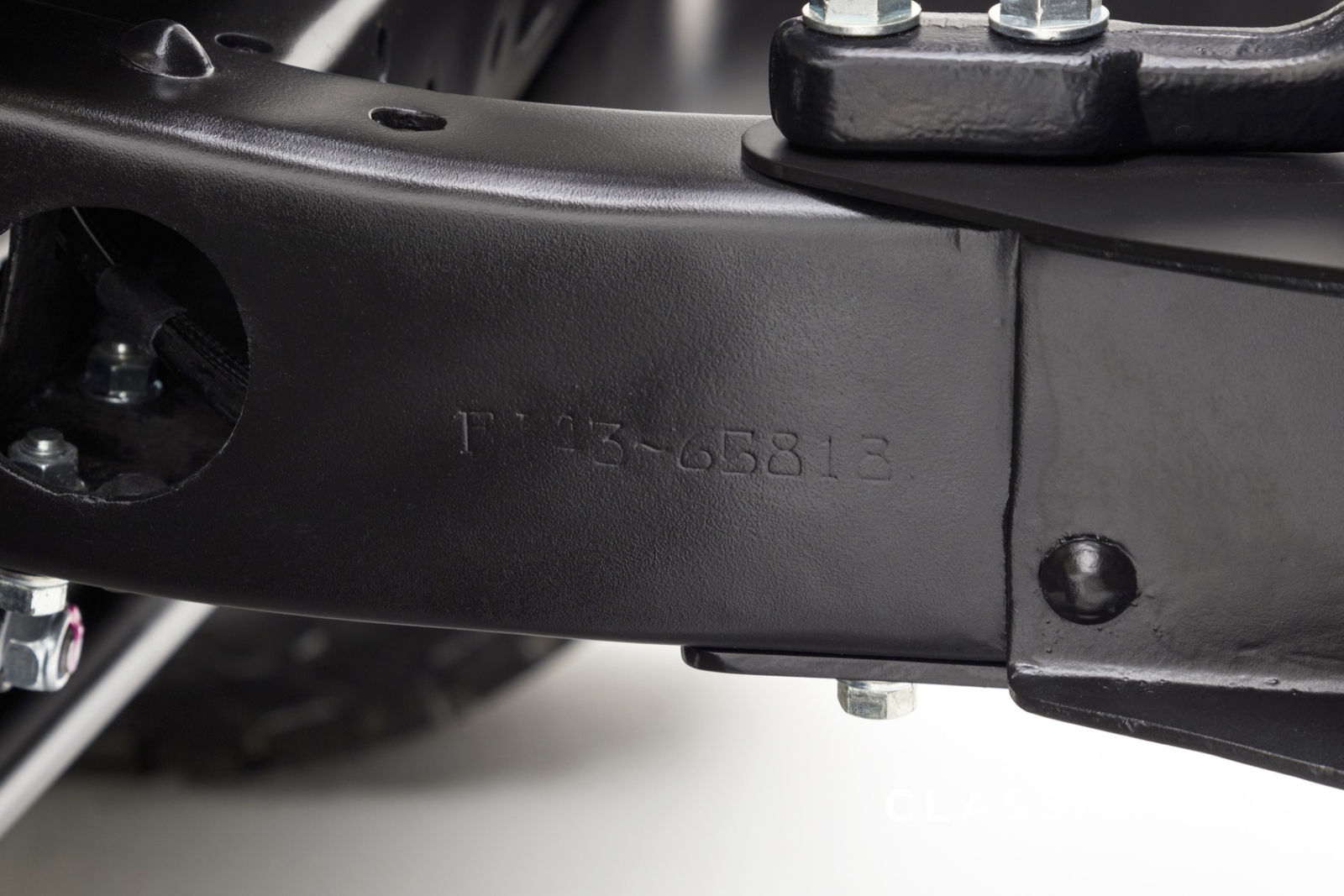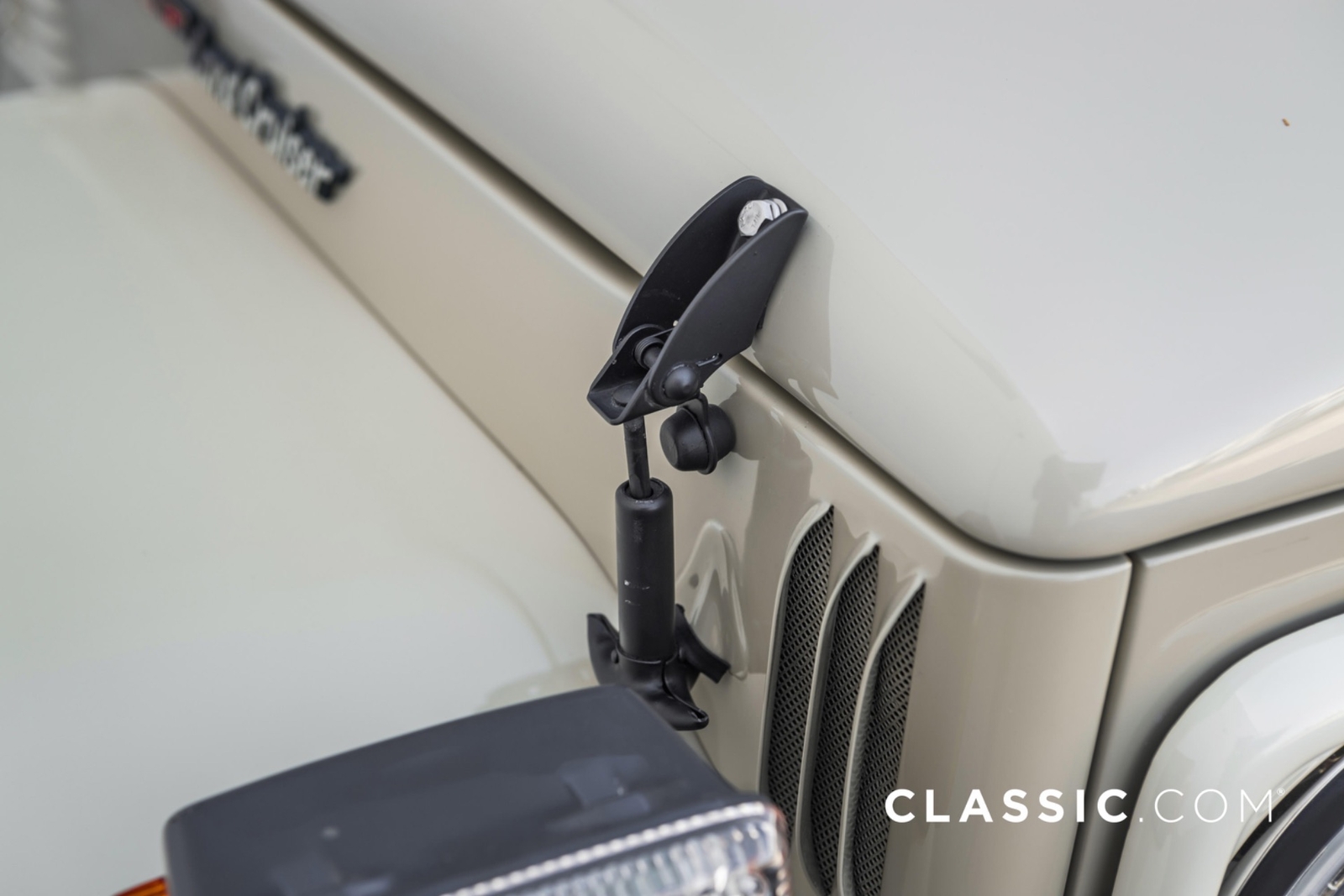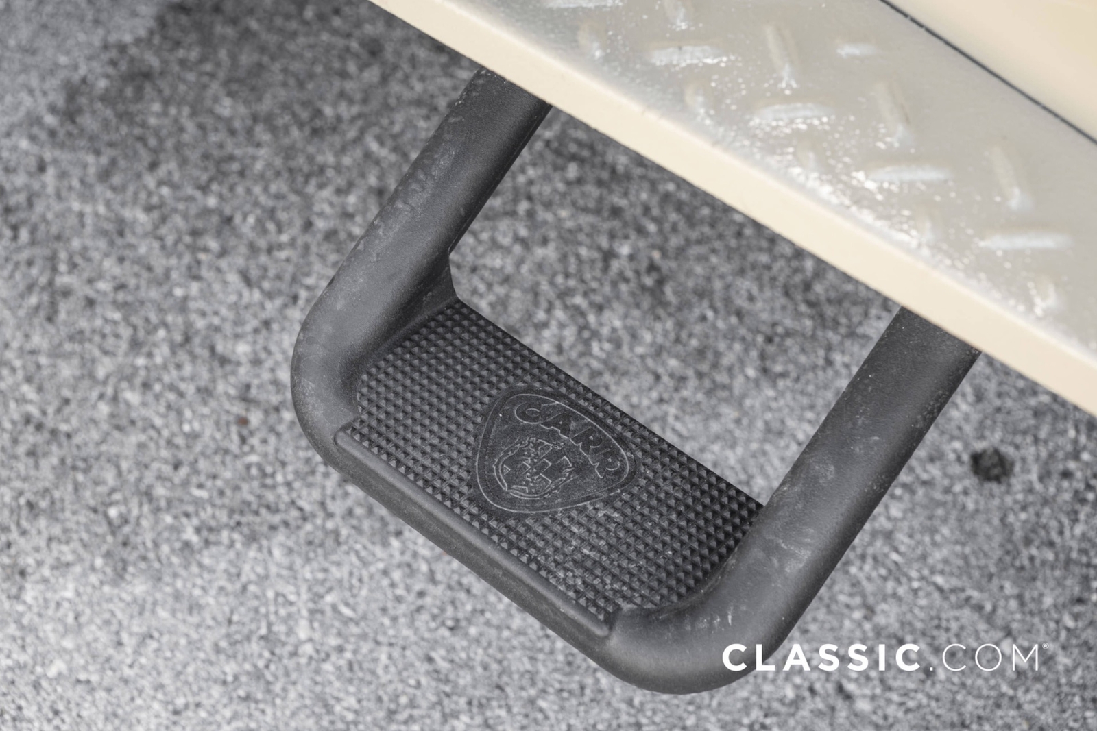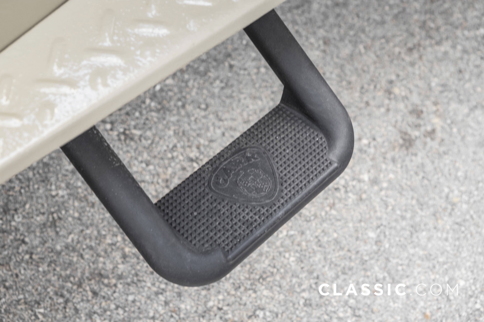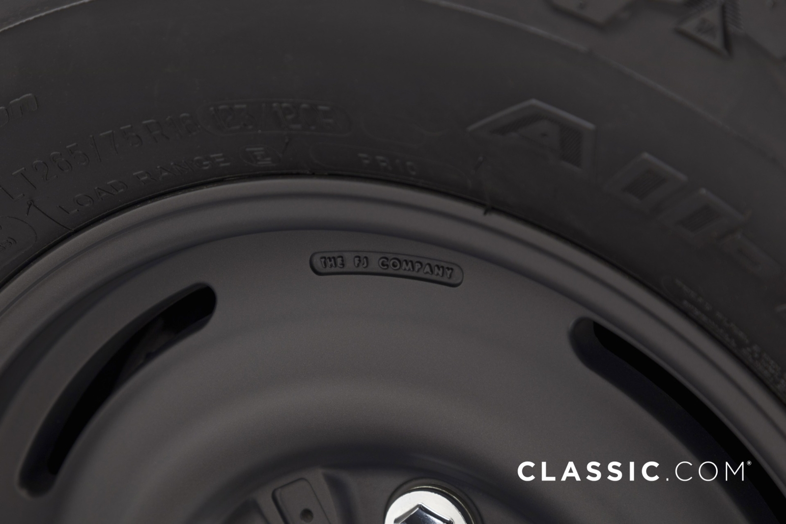 Under the classic exterior, significant upgrades provide superior performance including a modern front coil spring suspension, auto-locking hubs, and essential safety features such as electronic vehicle stability control, traction control, ABS, and a Borla muffler. Aesthetically, this truck stands out with custom 16-inch wheels by Braid for The FJ Company, a retro-styled grille, custom mirrors, bumpers, and added fog lights, maintaining an iconic look while integrating modern touches.
