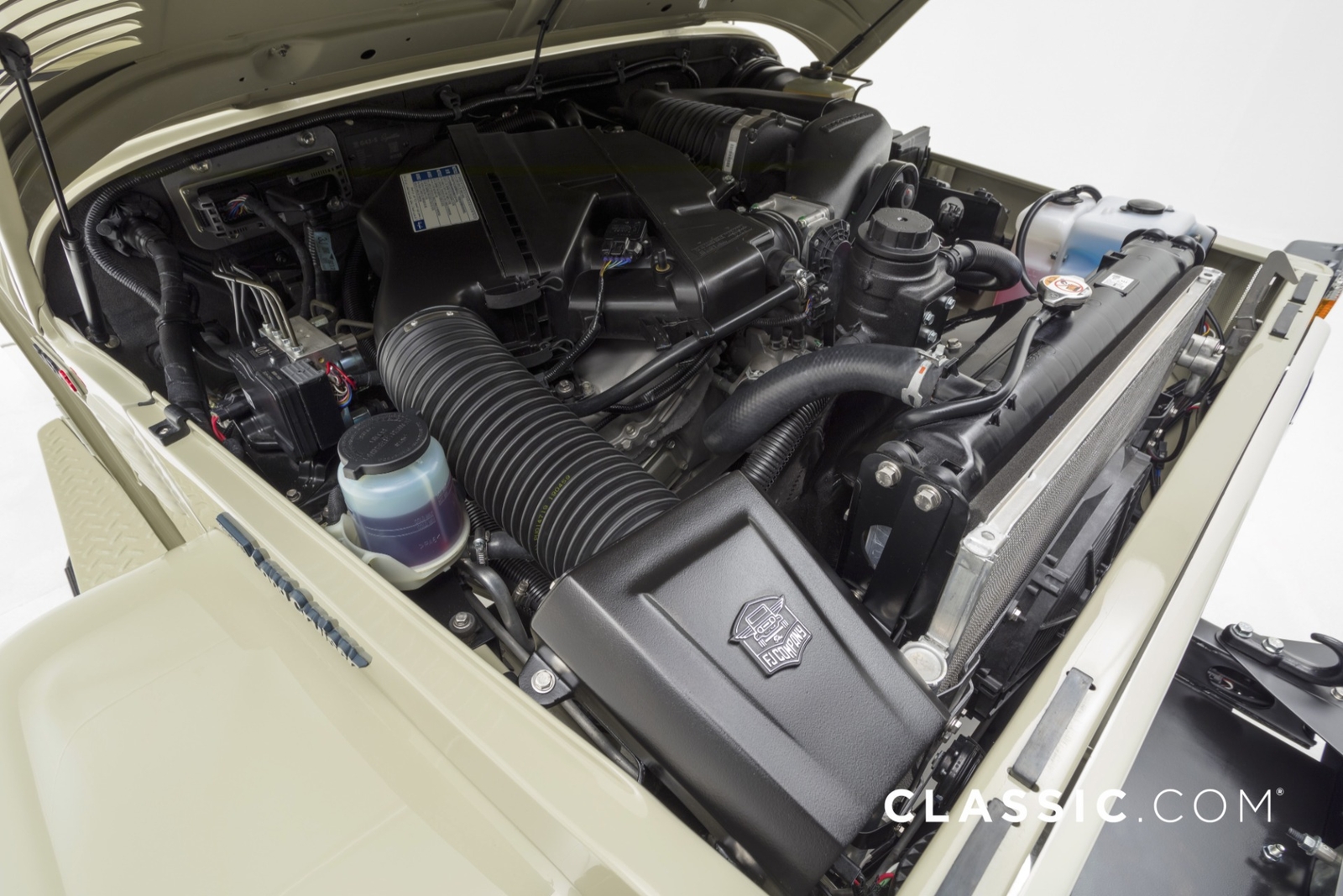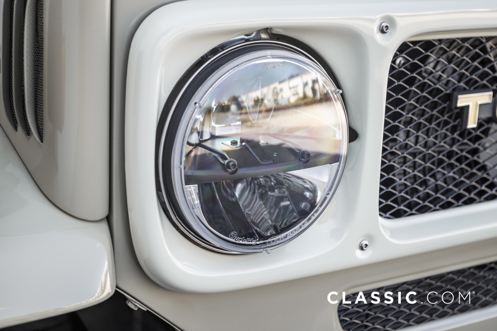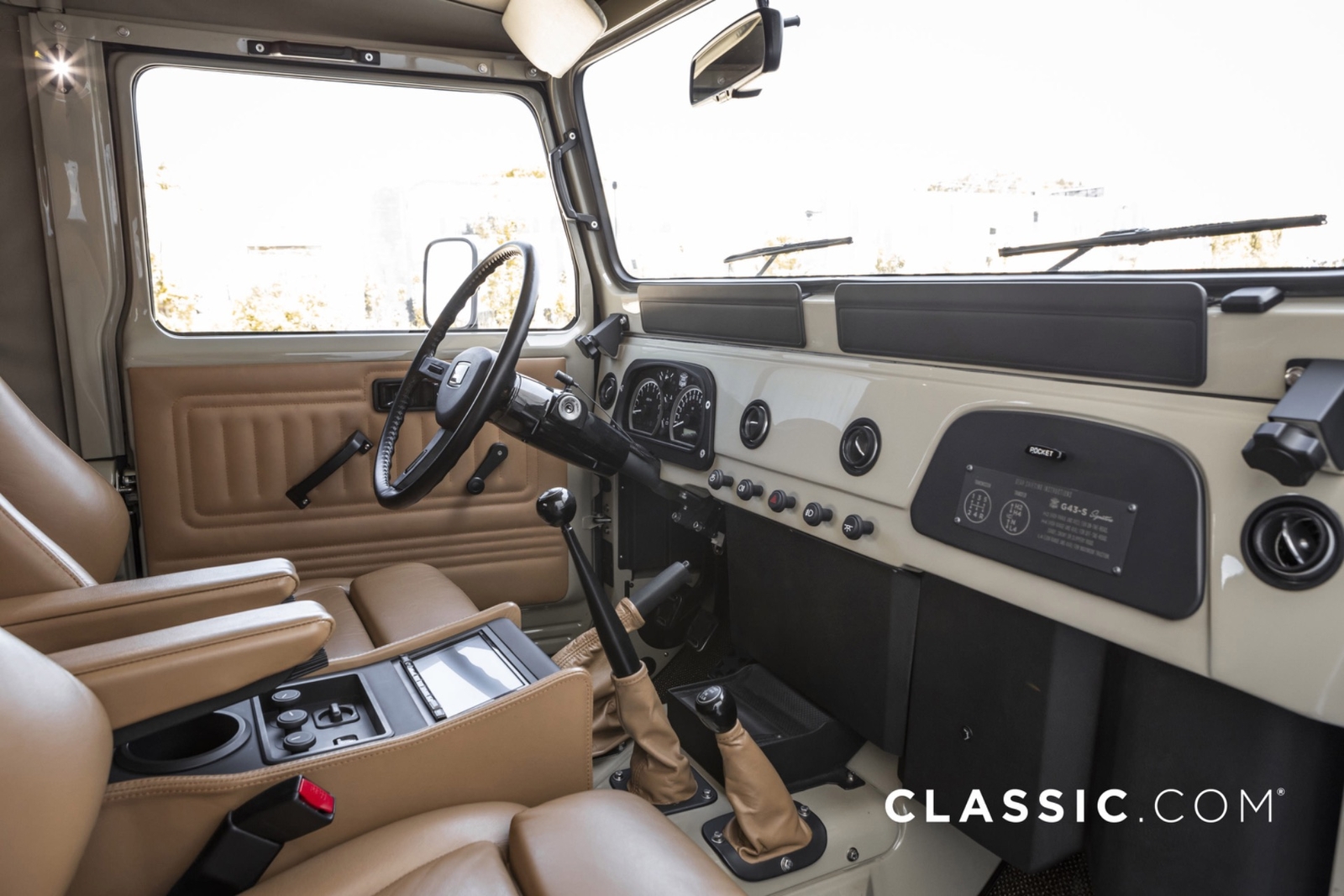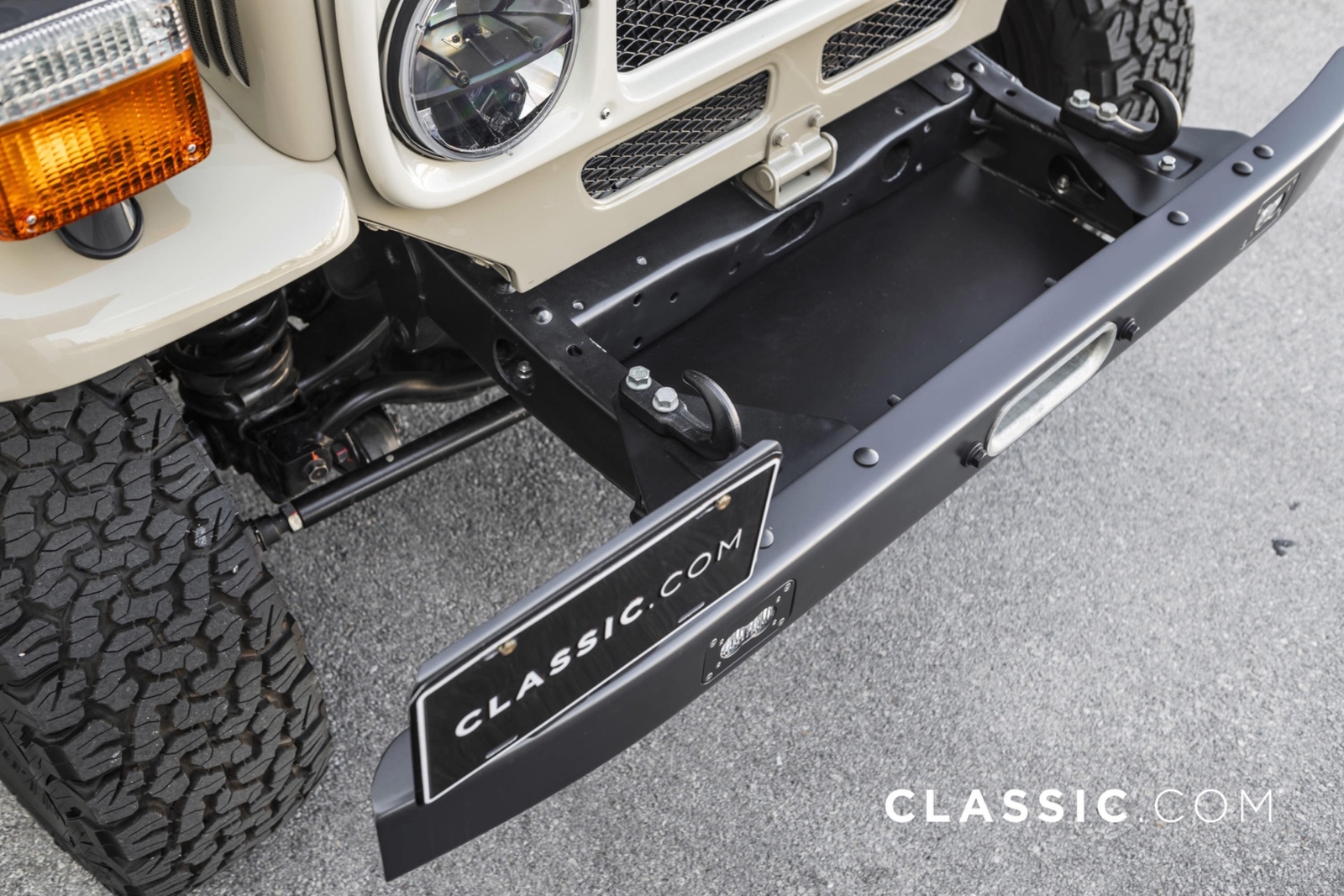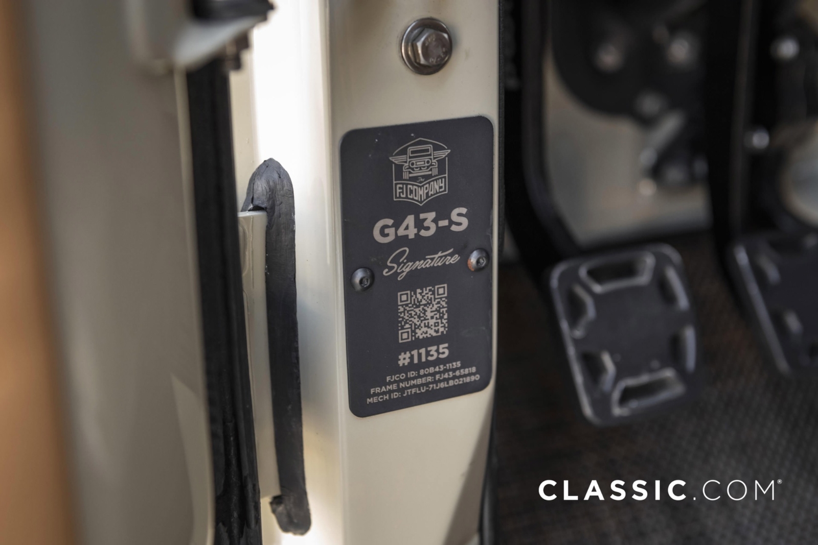 This custom 1980 Toyota Land Cruiser seamlessly blends timeless style with modern technology. This truck was originally a stock FJ43 that underwent a comprehensive custom build by The FJ Company in 2020-2021 and evolved into their G43-S Heritage model and now has just 1,890 km since that time. This transformation involved the integration of all new and modern mechanical components, propelling this classic into the contemporary era and enhancing its ride and capability. Power is created by a custom Toyota 4.0L V6 1GR-FE engine, with an optional Magnuson Supercharger, coupling to all four wheels through a robust five-speed manual transmission. The paint is a subtle yet captivating Beige (464) paired with brown leather Recaro seats that offer style and comfort.