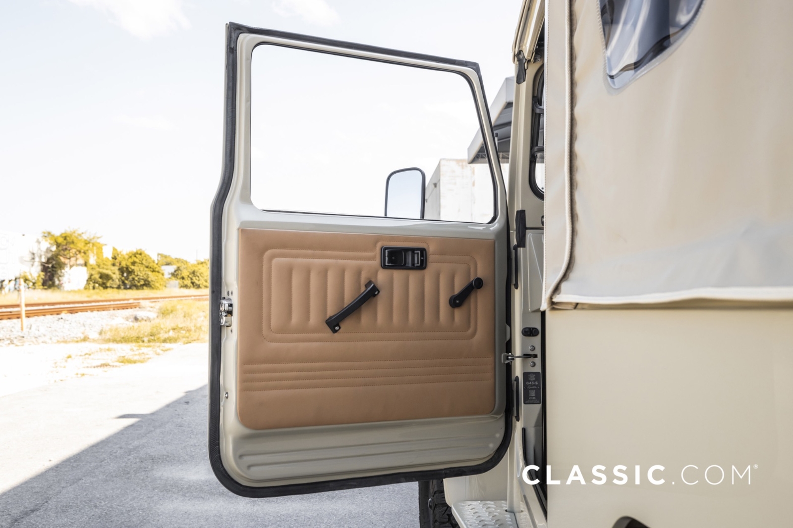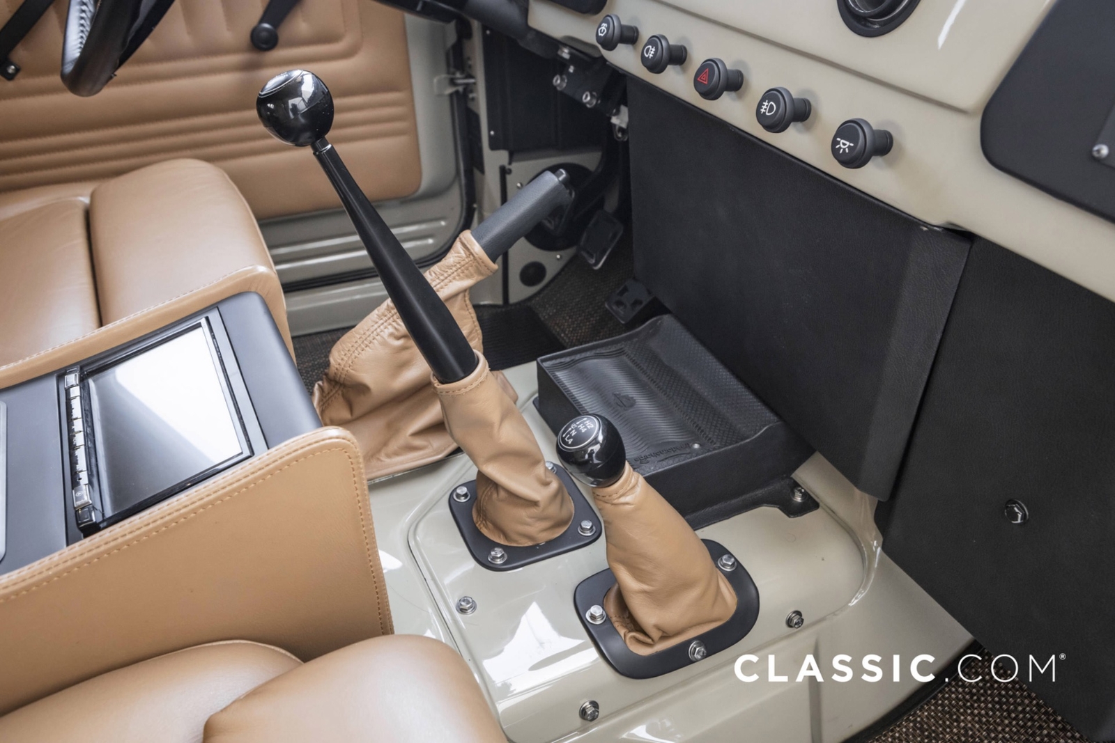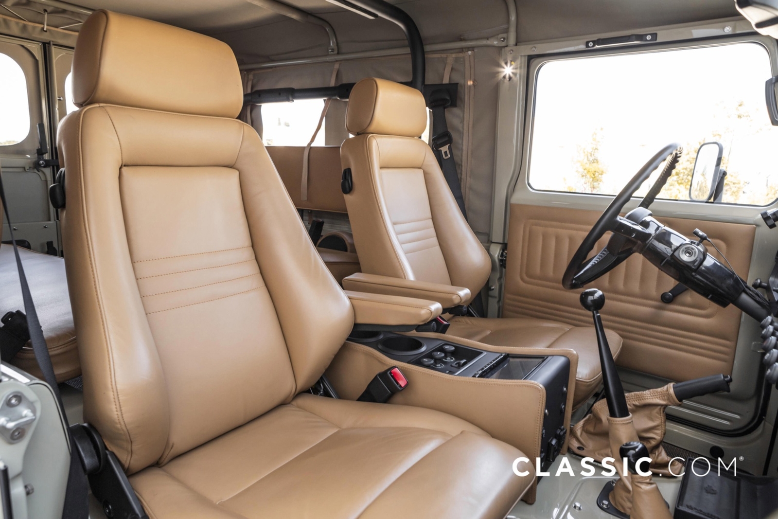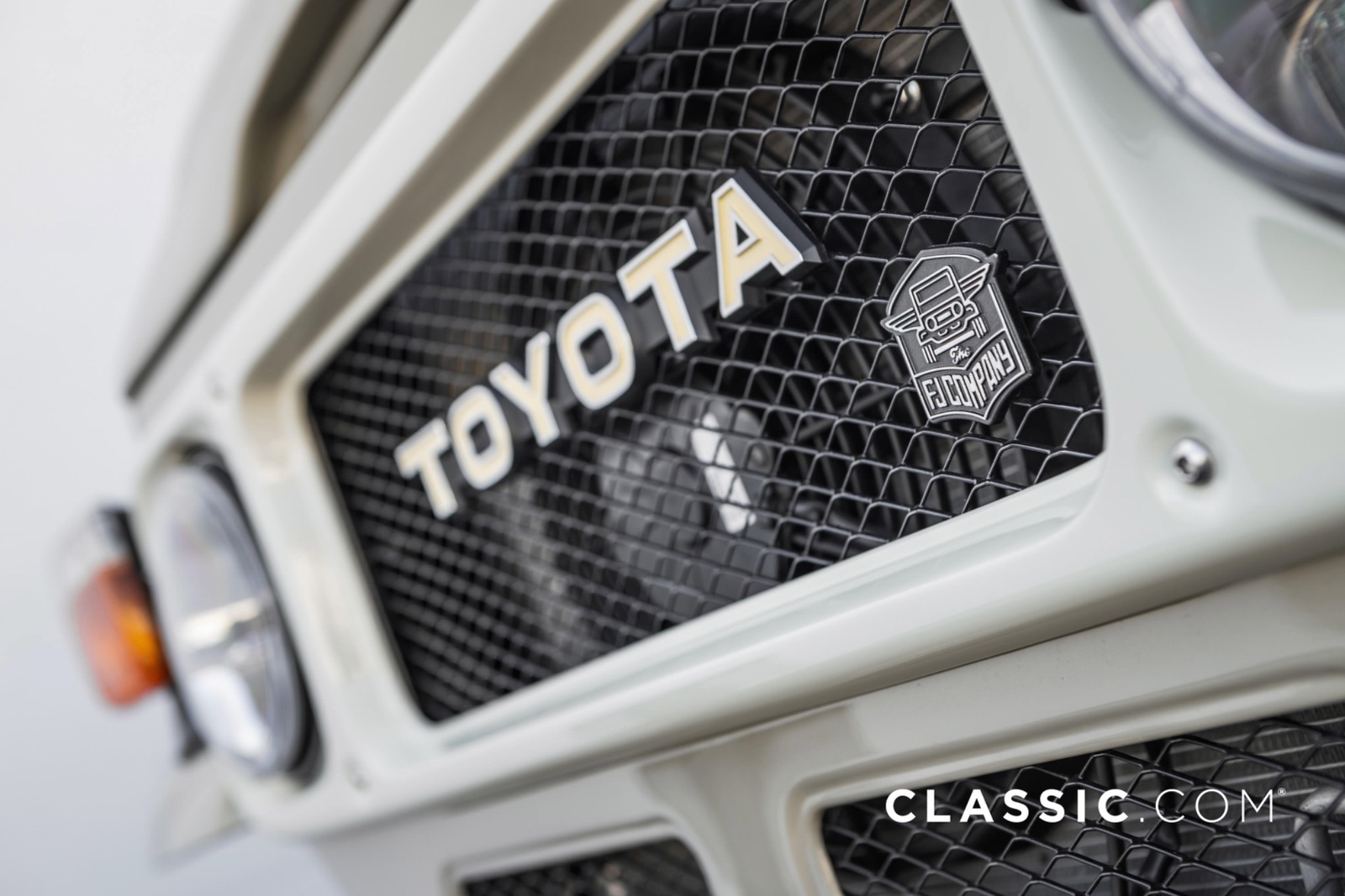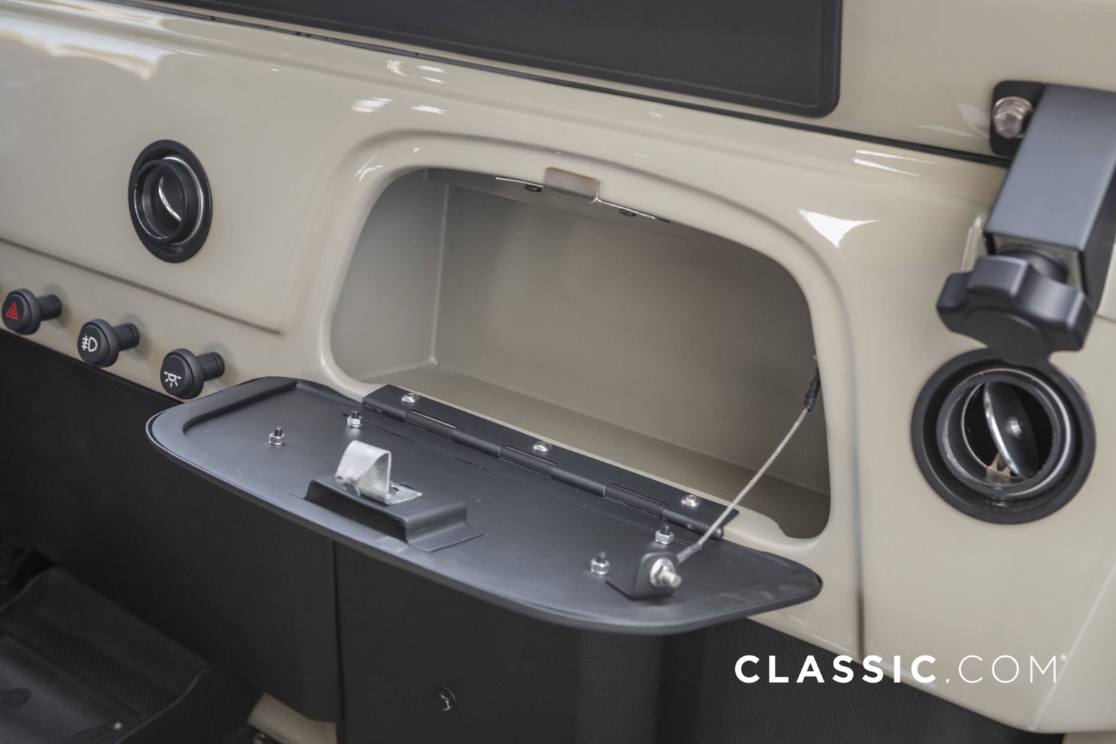 This custom 1980 Toyota Land Cruiser seamlessly blends timeless style with modern technology. This truck was originally a stock FJ43 that underwent a comprehensive custom build by The FJ Company in 2020-2021 and evolved into their G43-S Heritage model and now has just 1,890 km since that time. This transformation involved the integration of all new and modern mechanical components, propelling this classic into the contemporary era and enhancing its ride and capability. Power is created by a custom Toyota 4.0L V6 1GR-FE engine, with an optional Magnuson Supercharger, coupling to all four wheels through a robust five-speed manual transmission. The paint is a subtle yet captivating Beige (464) paired with brown leather Recaro seats that offer style and comfort.