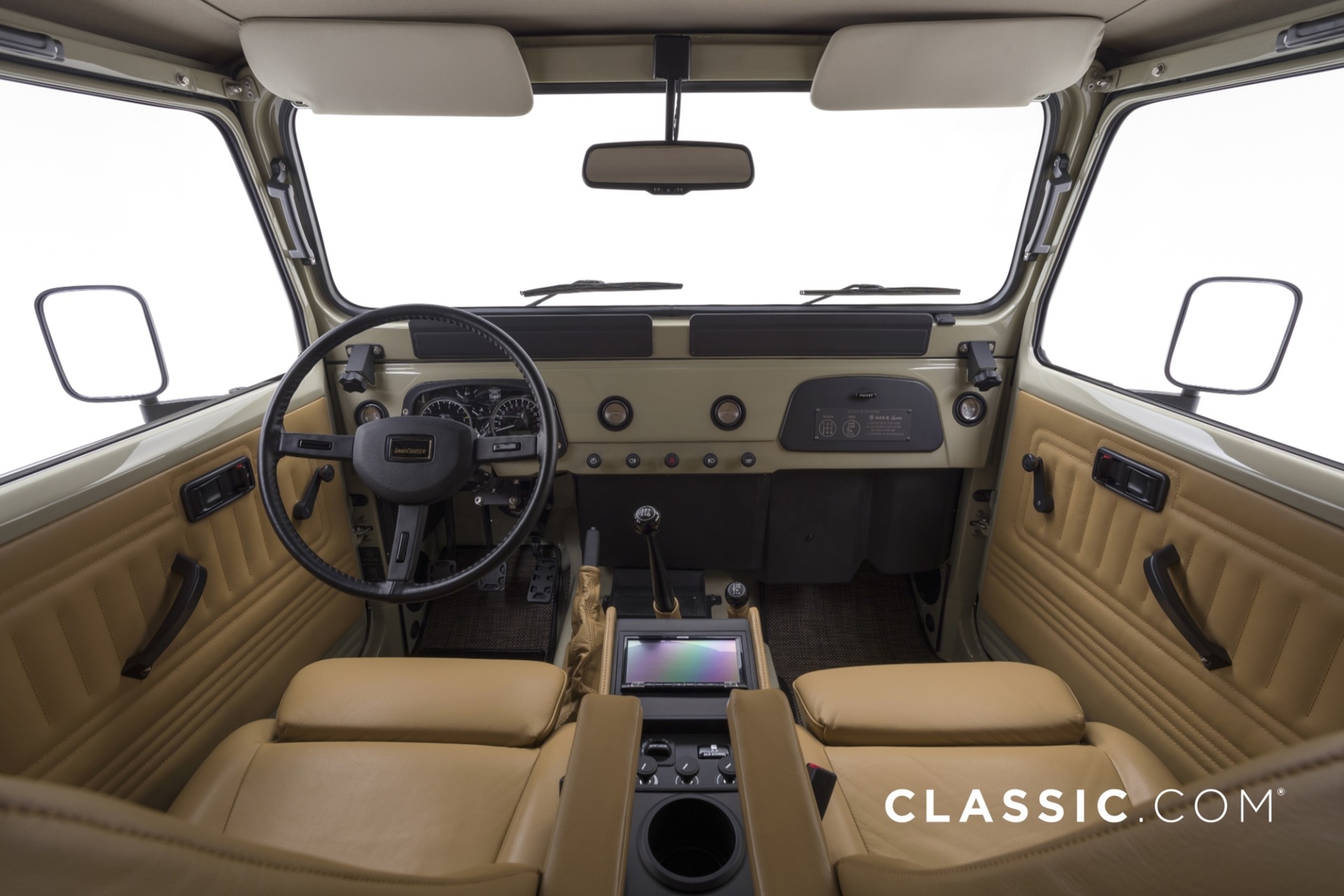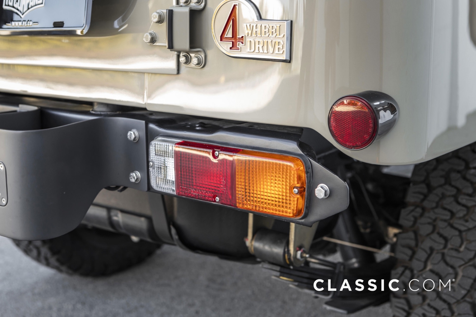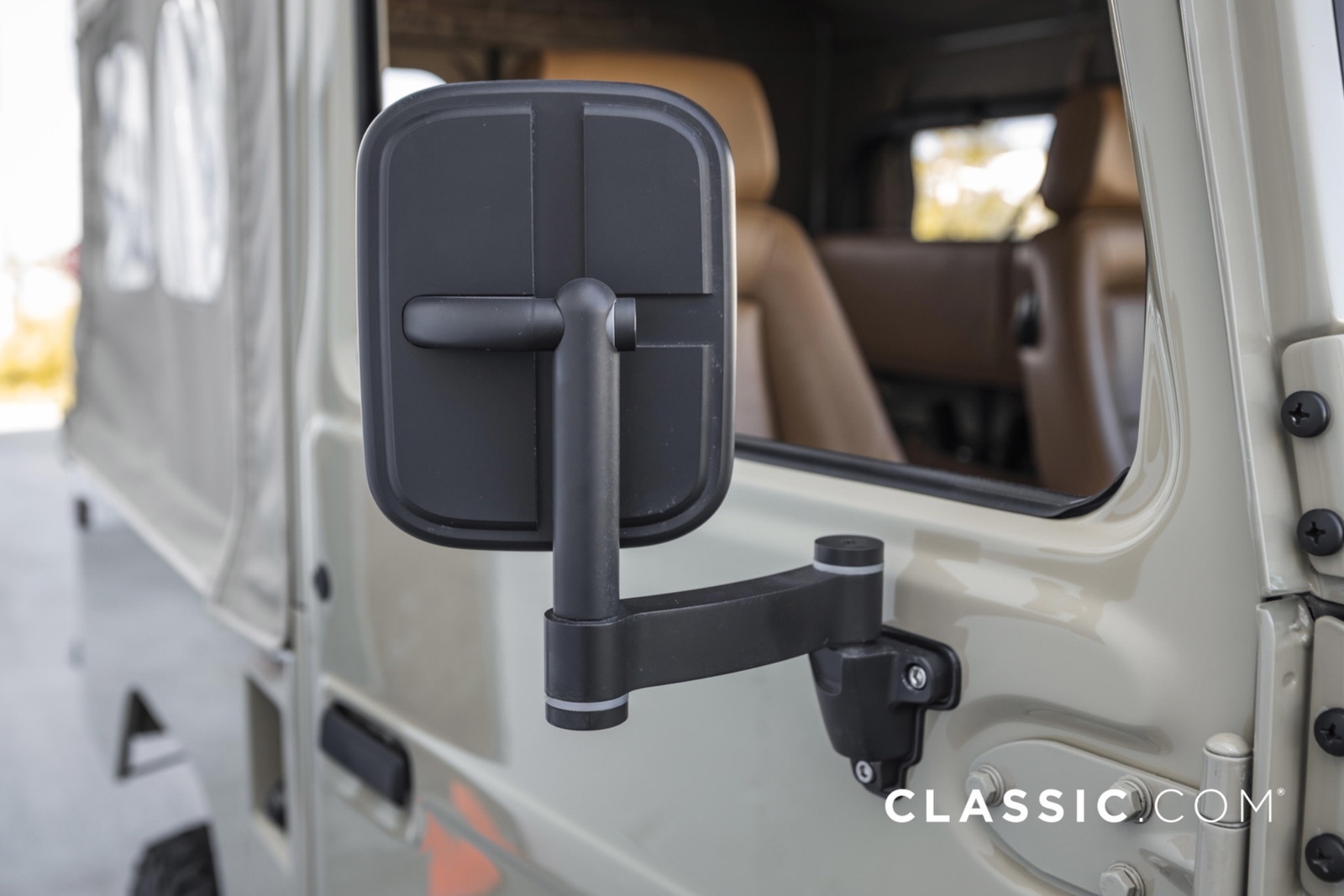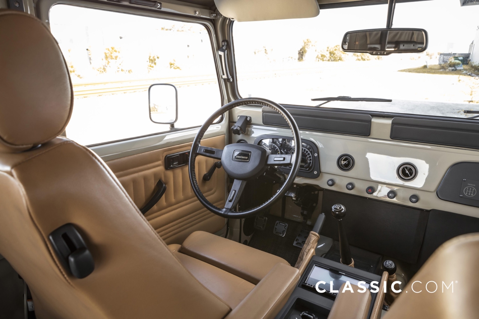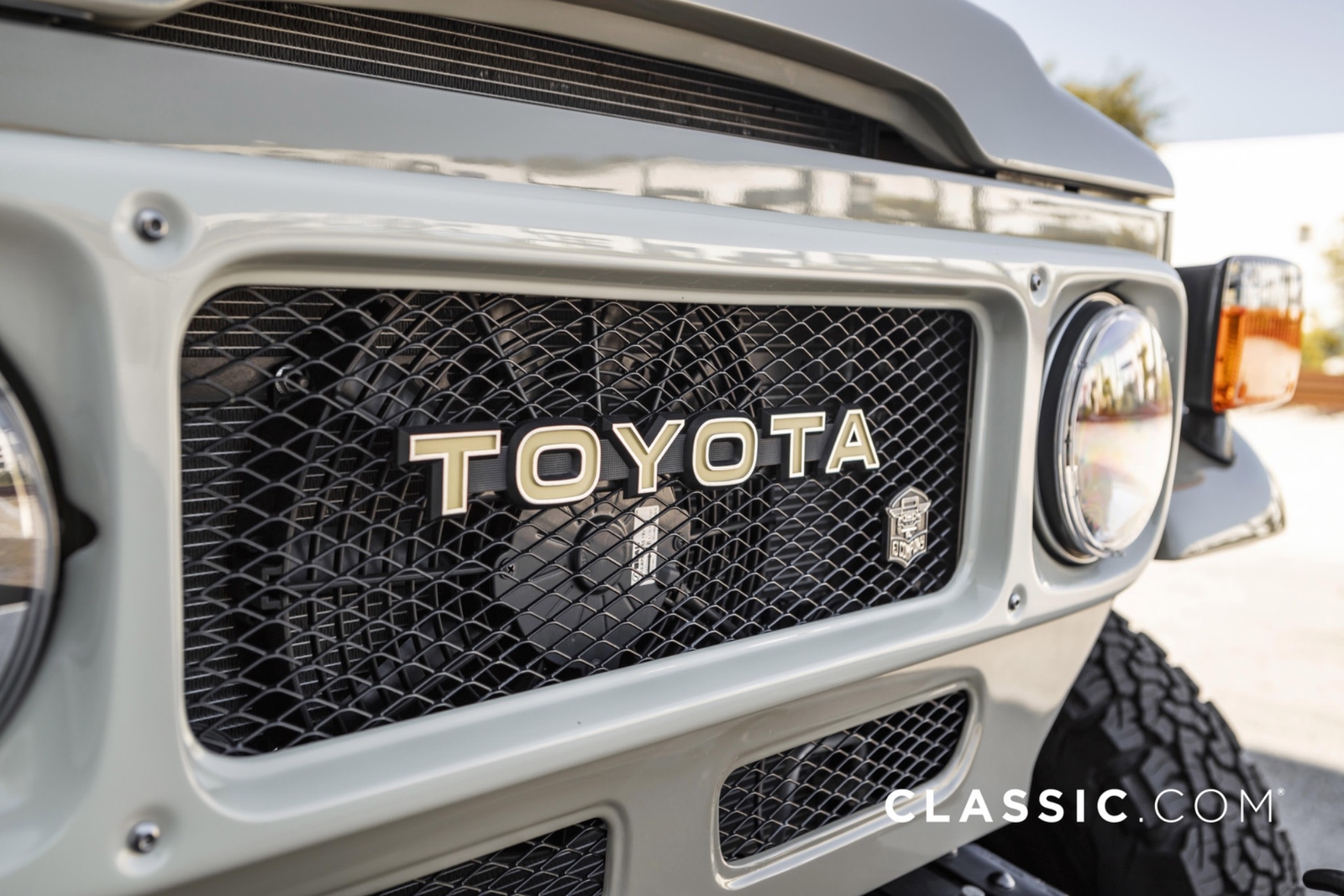 This custom 1980 Toyota Land Cruiser seamlessly blends timeless style with modern technology. This truck was originally a stock FJ43 that underwent a comprehensive custom build by The FJ Company in 2020-2021 and evolved into their G43-S Heritage model and now has just 1,890 km since that time. This transformation involved the integration of all new and modern mechanical components, propelling this classic into the contemporary era and enhancing its ride and capability. Power is created by a custom Toyota 4.0L V6 1GR-FE engine, with an optional Magnuson Supercharger, coupling to all four wheels through a robust five-speed manual transmission. The paint is a subtle yet captivating Beige (464) paired with brown leather Recaro seats that offer style and comfort.