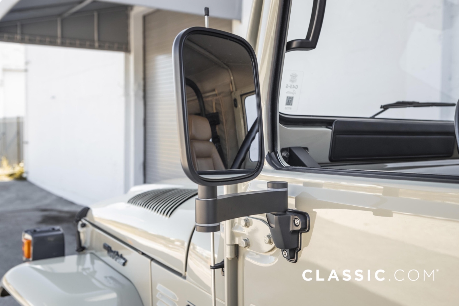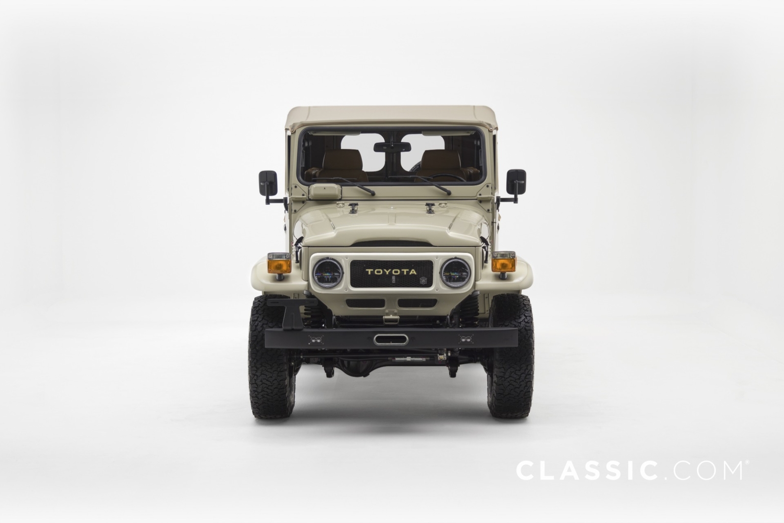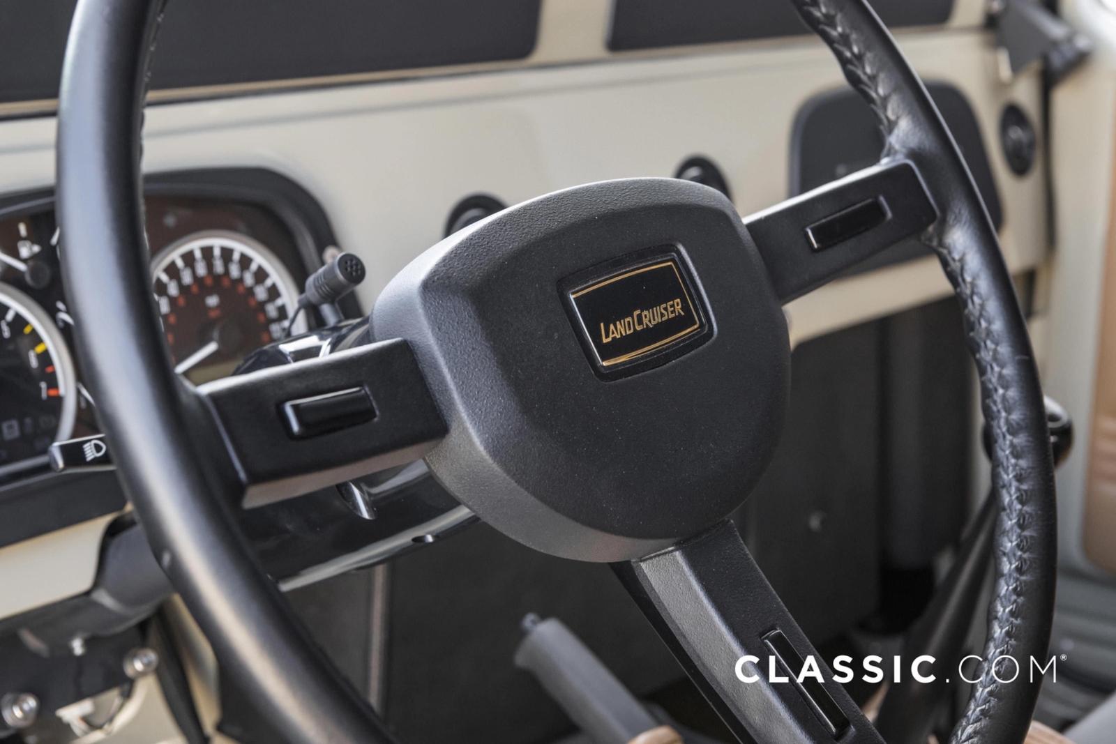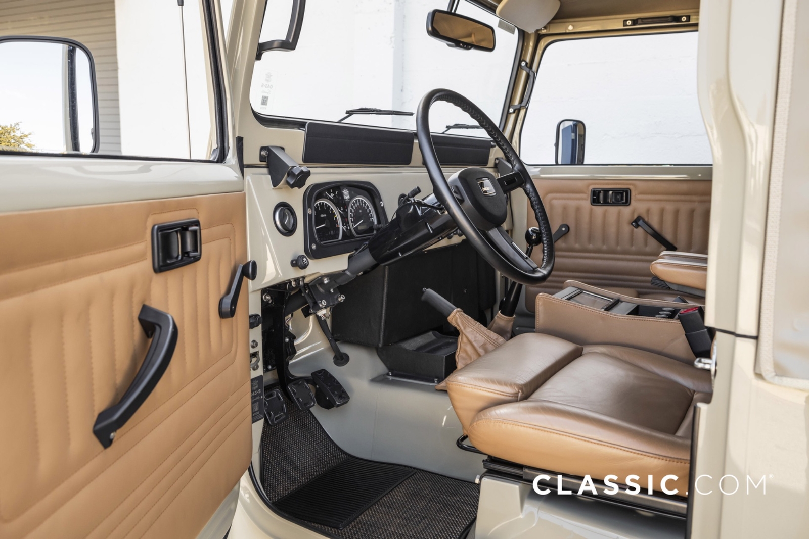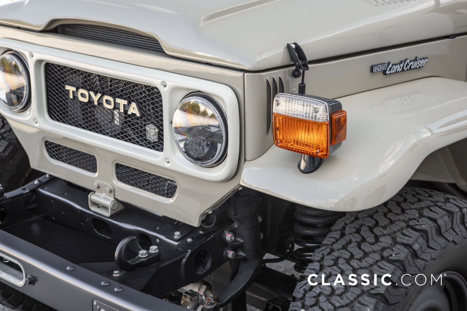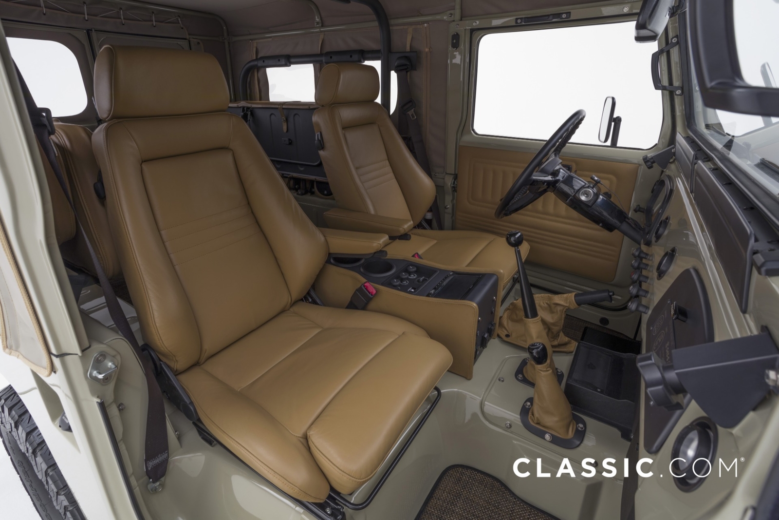 This custom 1980 Toyota Land Cruiser seamlessly blends timeless style with modern technology. This truck was originally a stock FJ43 that underwent a comprehensive custom build by The FJ Company in 2020-2021 and evolved into their G43-S Heritage model and now has just 1,890 km since that time. This transformation involved the integration of all new and modern mechanical components, propelling this classic into the contemporary era and enhancing its ride and capability. Power is created by a custom Toyota 4.0L V6 1GR-FE engine, with an optional Magnuson Supercharger, coupling to all four wheels through a robust five-speed manual transmission. The paint is a subtle yet captivating Beige (464) paired with brown leather Recaro seats that offer style and comfort.