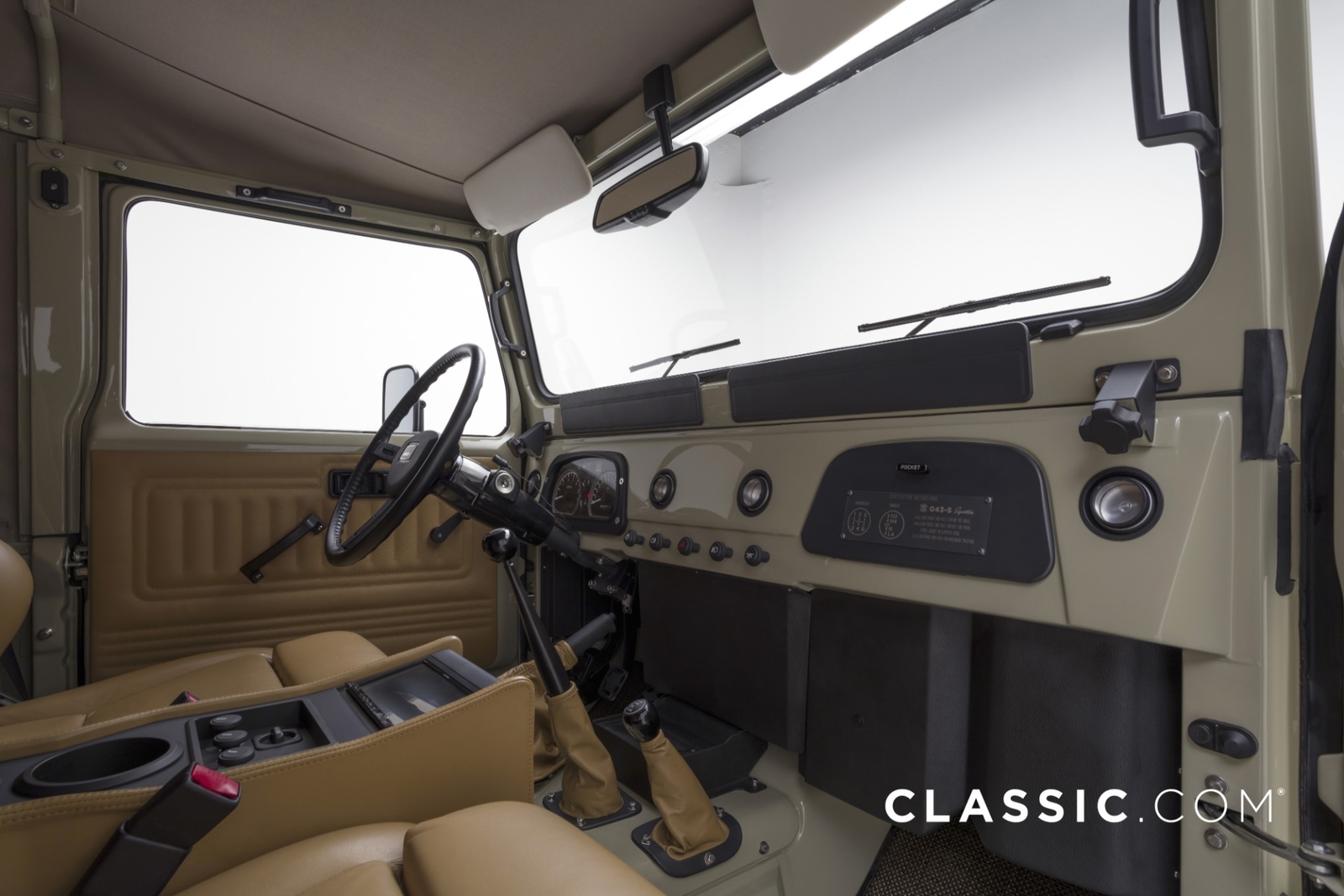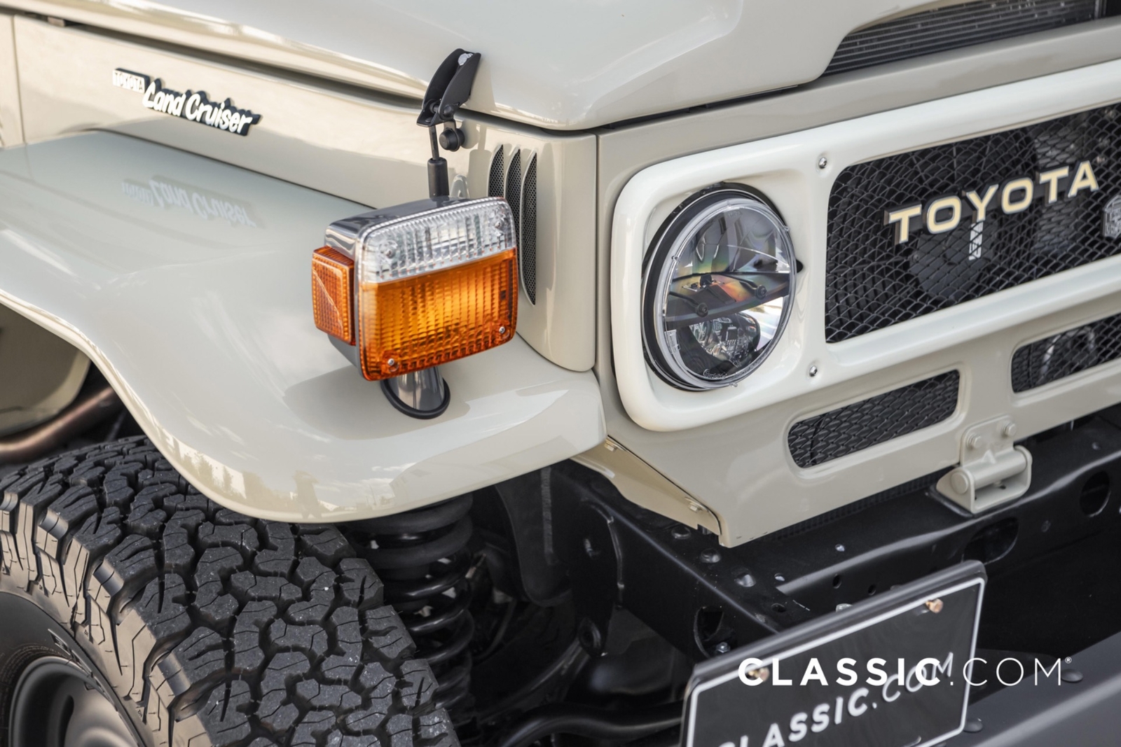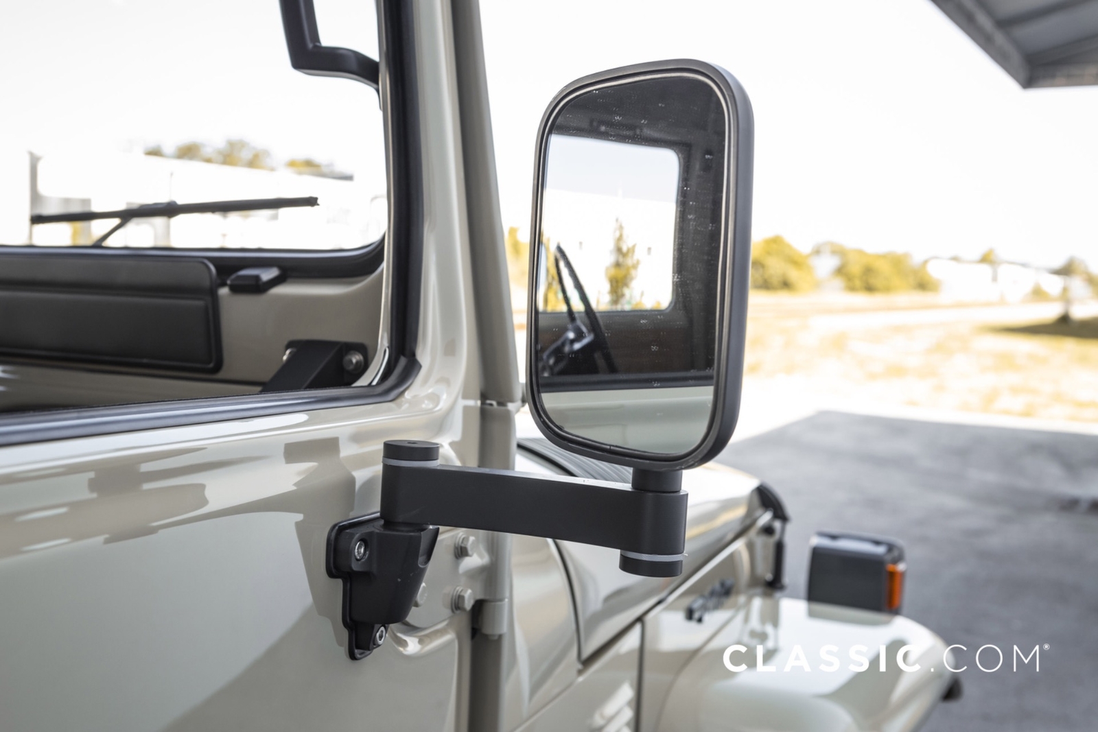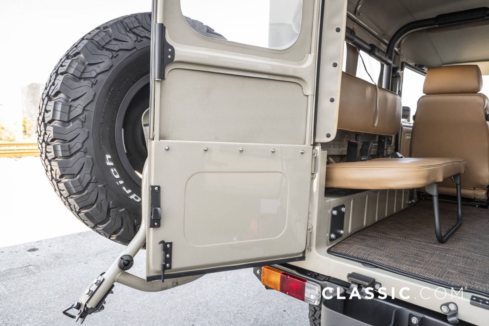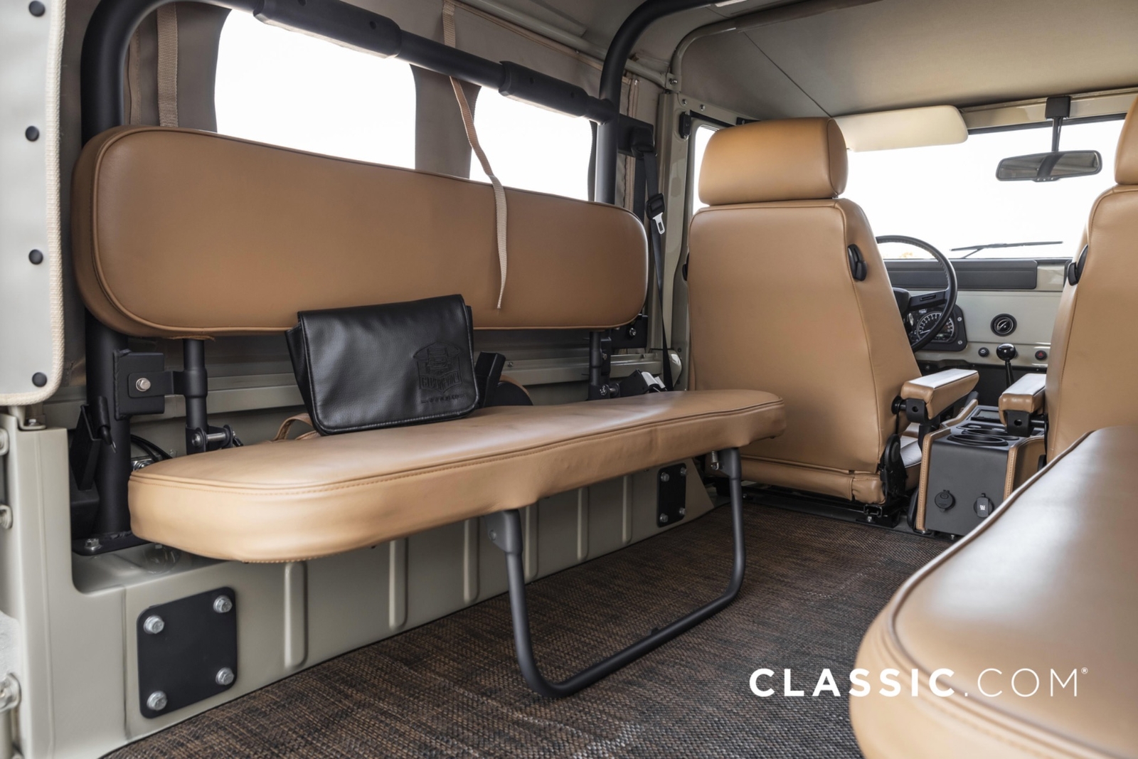 This custom 1980 Toyota Land Cruiser seamlessly blends timeless style with modern technology. This truck was originally a stock FJ43 that underwent a comprehensive custom build by The FJ Company in 2020-2021 and evolved into their G43-S Heritage model and now has just 1,890 km since that time. This transformation involved the integration of all new and modern mechanical components, propelling this classic into the contemporary era and enhancing its ride and capability. Power is created by a custom Toyota 4.0L V6 1GR-FE engine, with an optional Magnuson Supercharger, coupling to all four wheels through a robust five-speed manual transmission. The paint is a subtle yet captivating Beige (464) paired with brown leather Recaro seats that offer style and comfort.