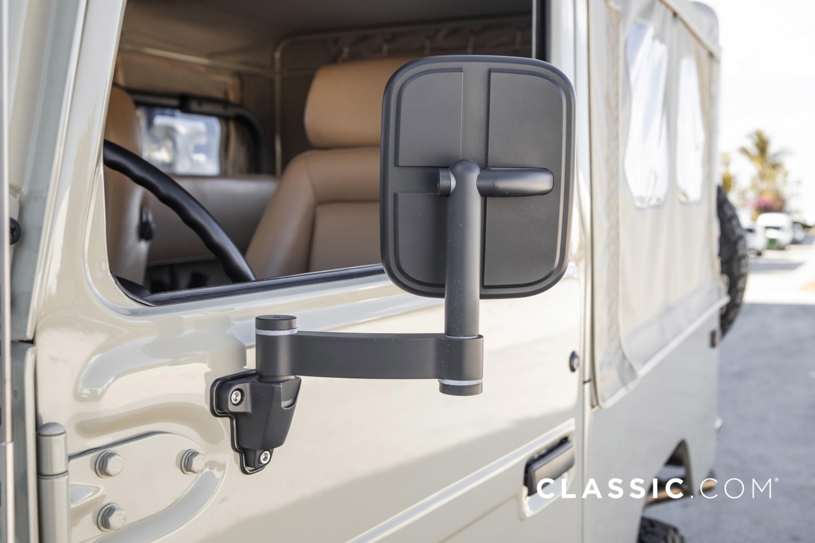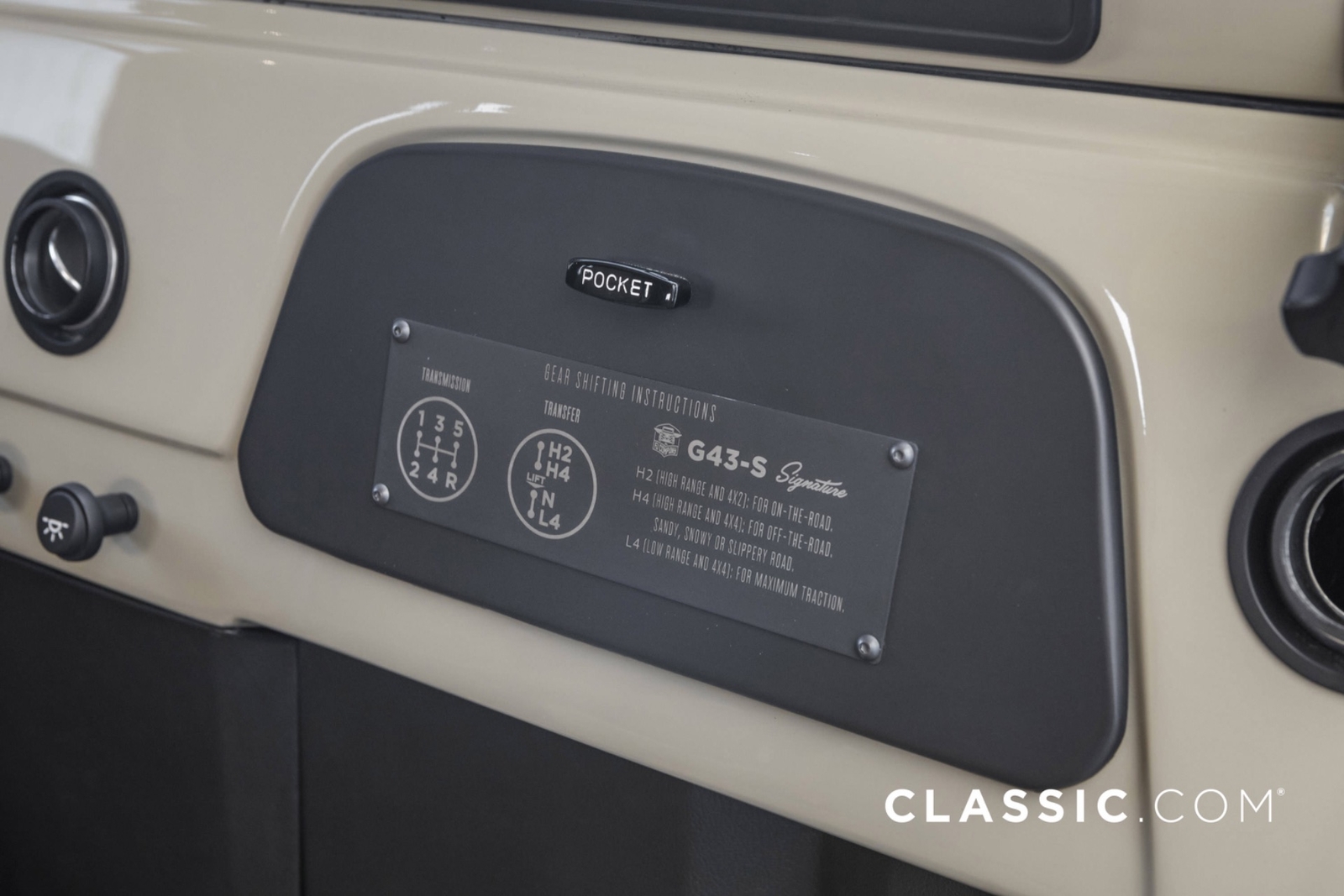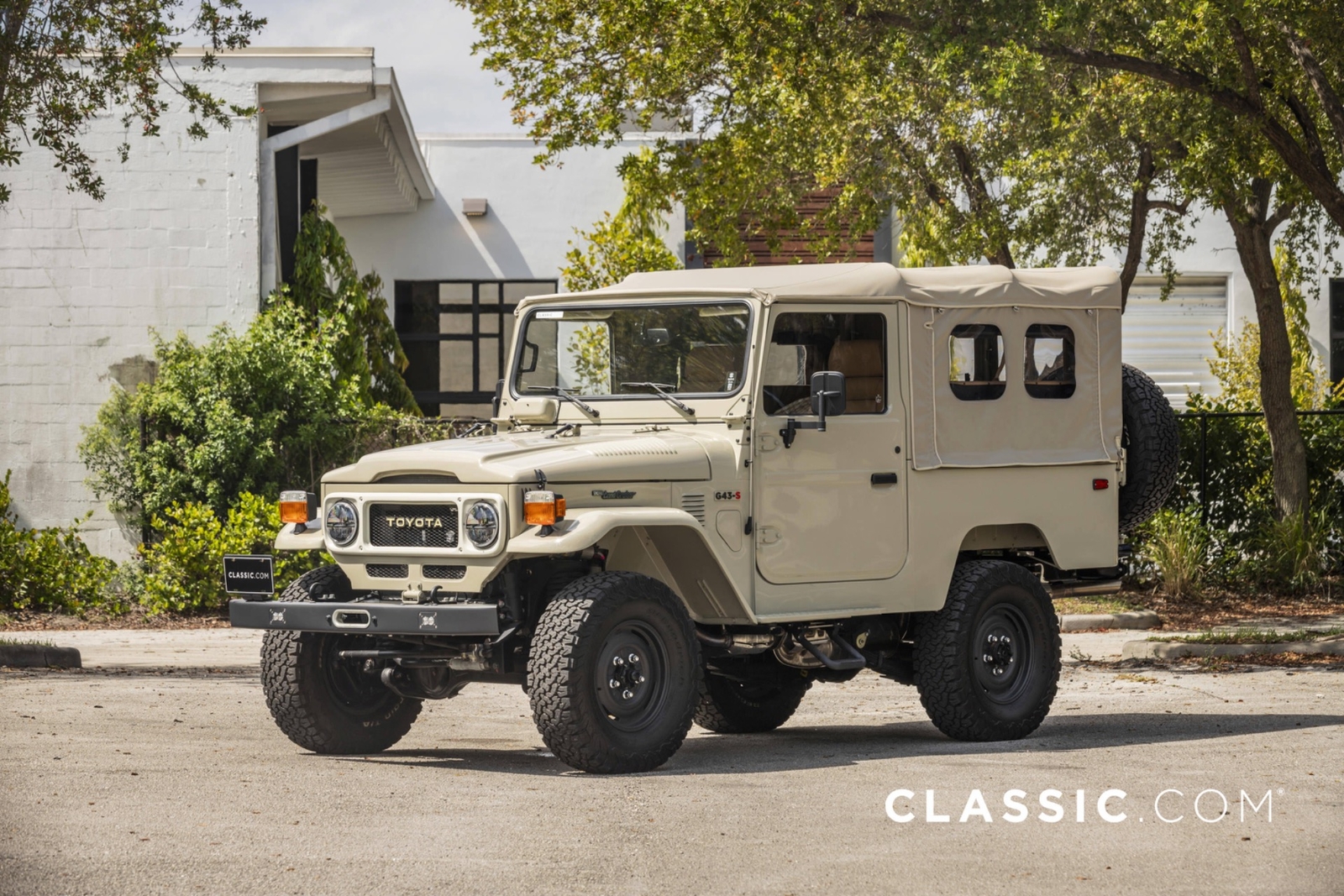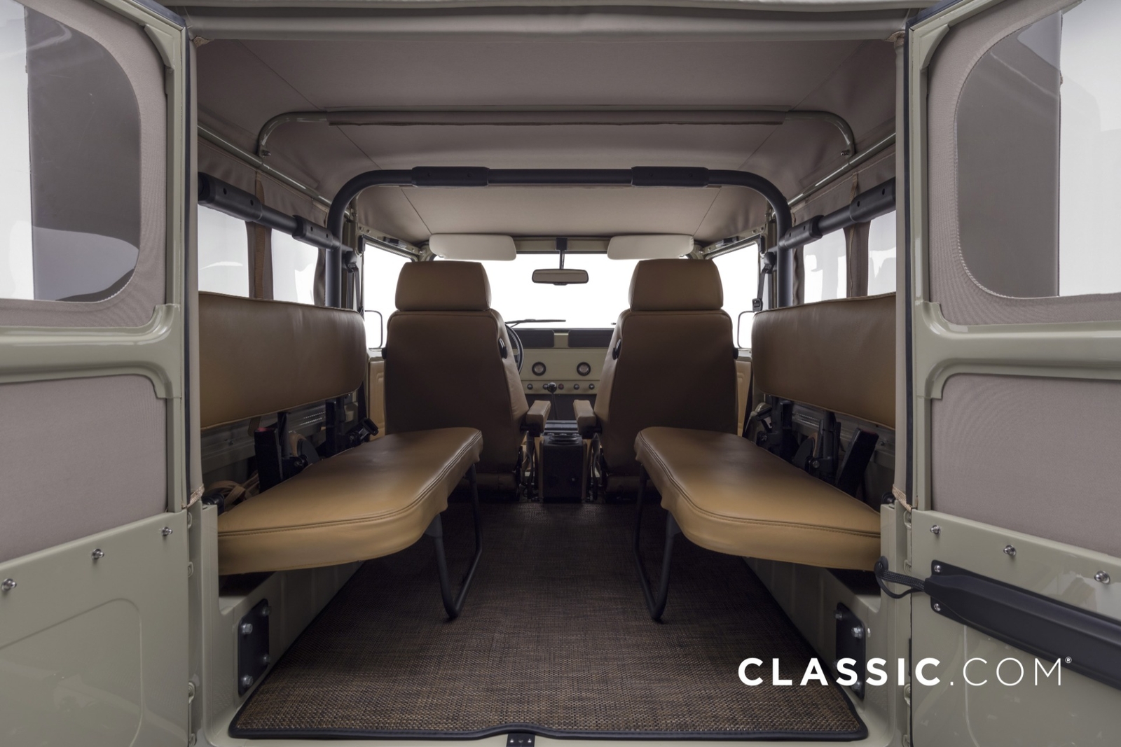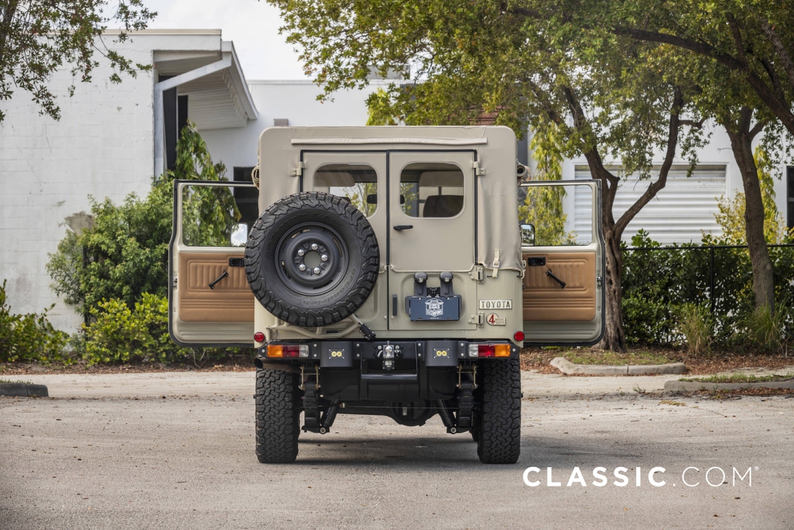 This custom 1980 Toyota Land Cruiser seamlessly blends timeless style with modern technology. This truck was originally a stock FJ43 that underwent a comprehensive custom build by The FJ Company in 2020-2021 and evolved into their G43-S Heritage model and now has just 1,890 km since that time. This transformation involved the integration of all new and modern mechanical components, propelling this classic into the contemporary era and enhancing its ride and capability. Power is created by a custom Toyota 4.0L V6 1GR-FE engine, with an optional Magnuson Supercharger, coupling to all four wheels through a robust five-speed manual transmission. The paint is a subtle yet captivating Beige (464) paired with brown leather Recaro seats that offer style and comfort.