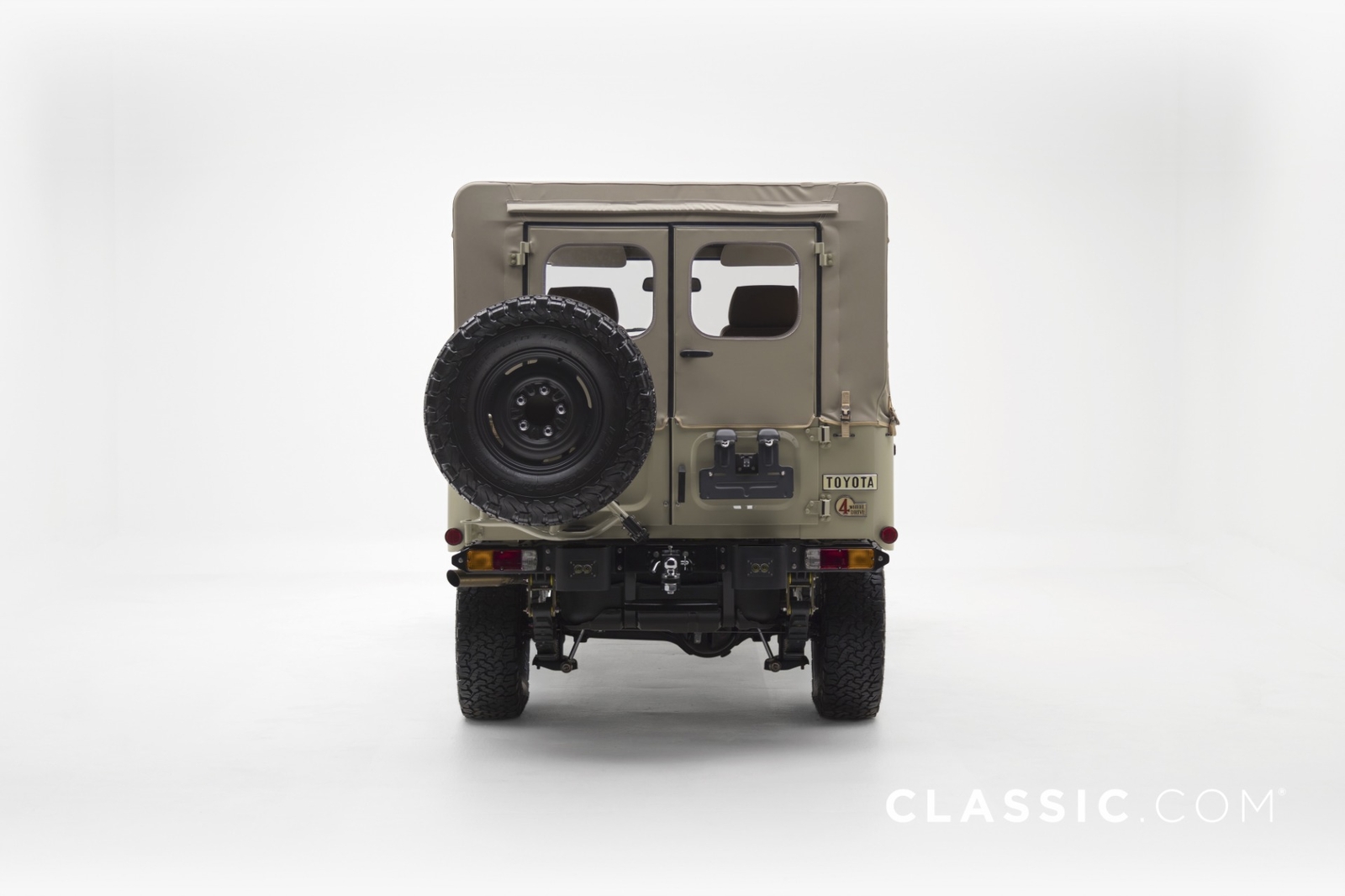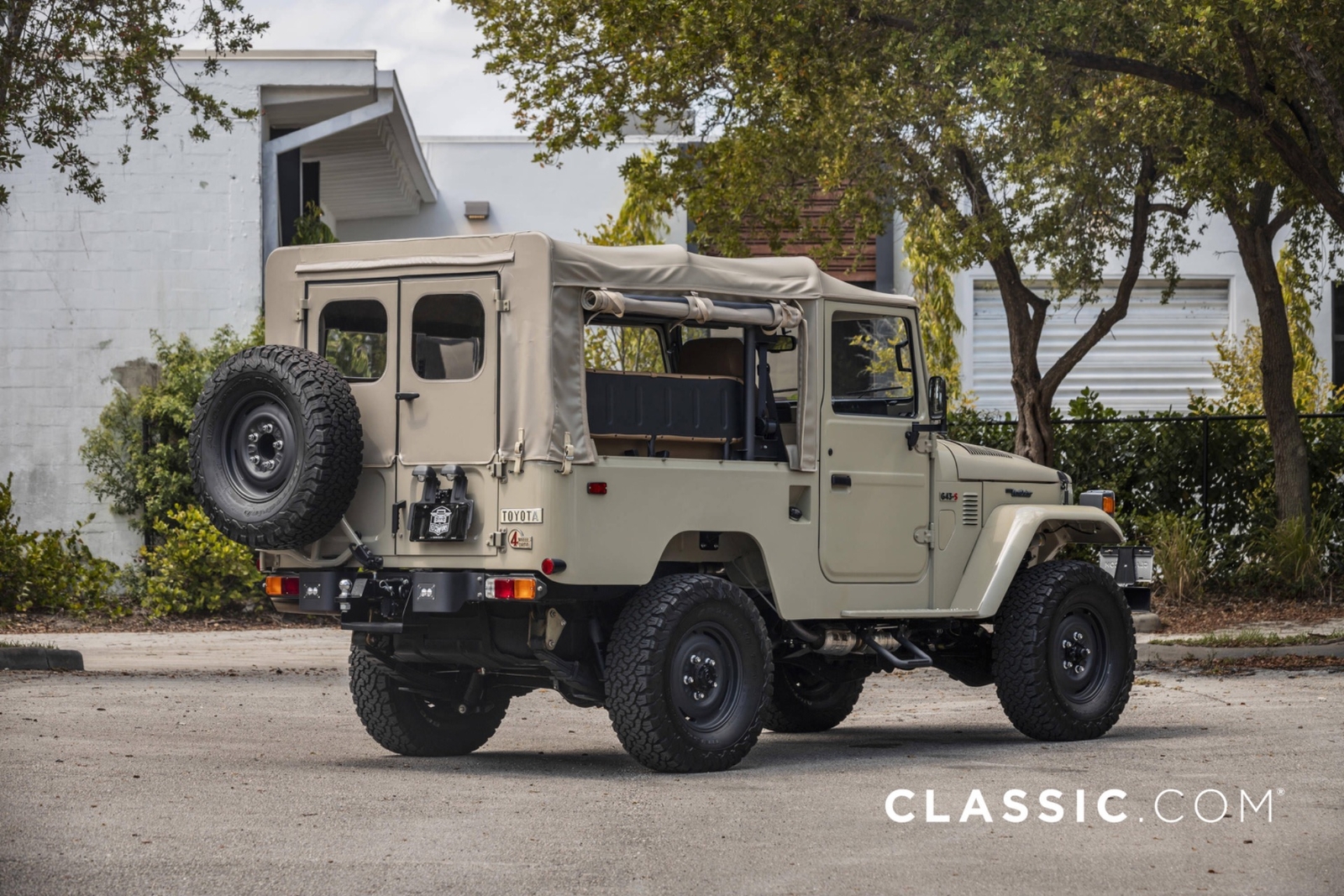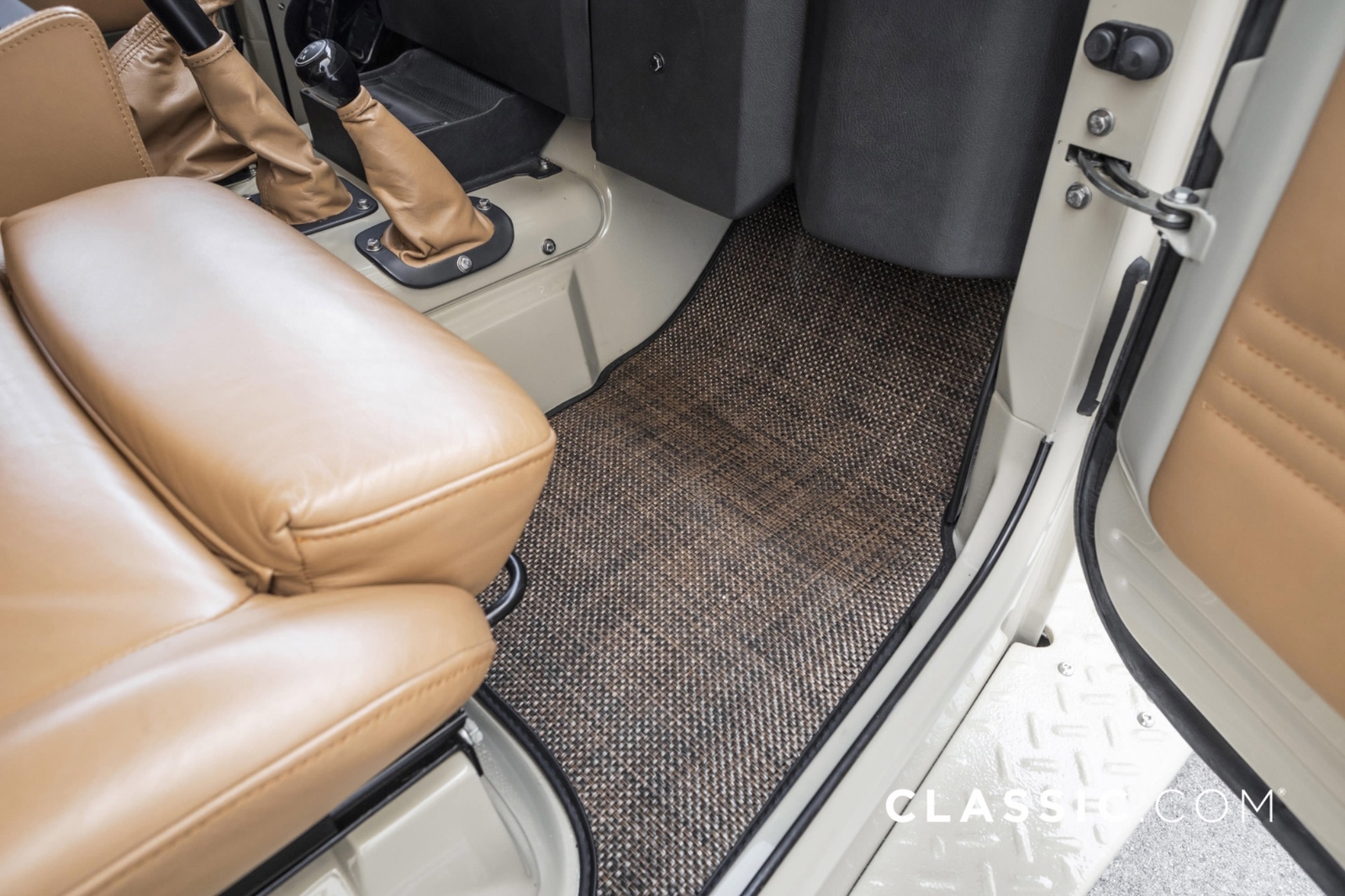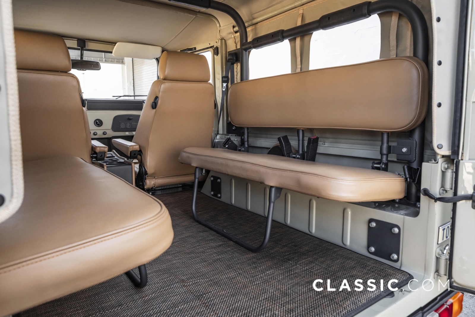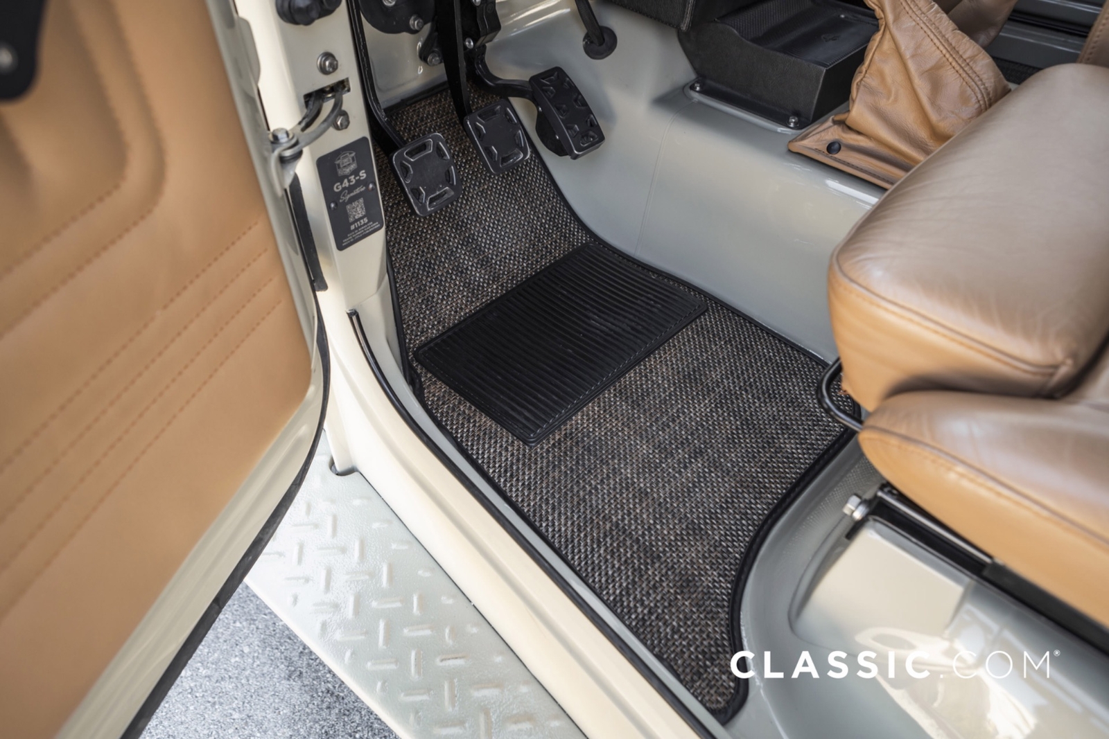 This custom 1980 Toyota Land Cruiser seamlessly blends timeless style with modern technology. This truck was originally a stock FJ43 that underwent a comprehensive custom build by The FJ Company in 2020-2021 and evolved into their G43-S Heritage model and now has just 1,890 km since that time. This transformation involved the integration of all new and modern mechanical components, propelling this classic into the contemporary era and enhancing its ride and capability. Power is created by a custom Toyota 4.0L V6 1GR-FE engine, with an optional Magnuson Supercharger, coupling to all four wheels through a robust five-speed manual transmission. The paint is a subtle yet captivating Beige (464) paired with brown leather Recaro seats that offer style and comfort.