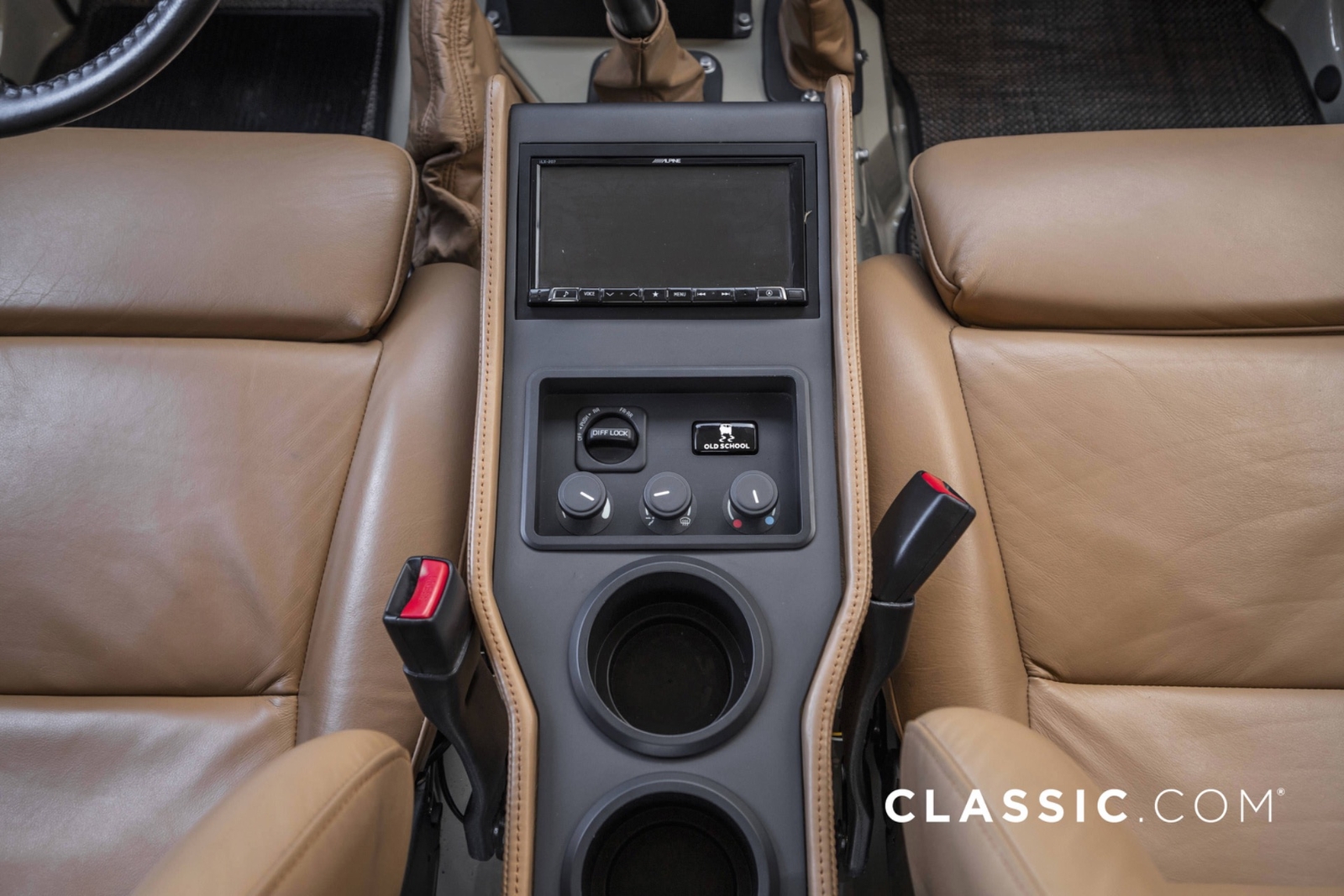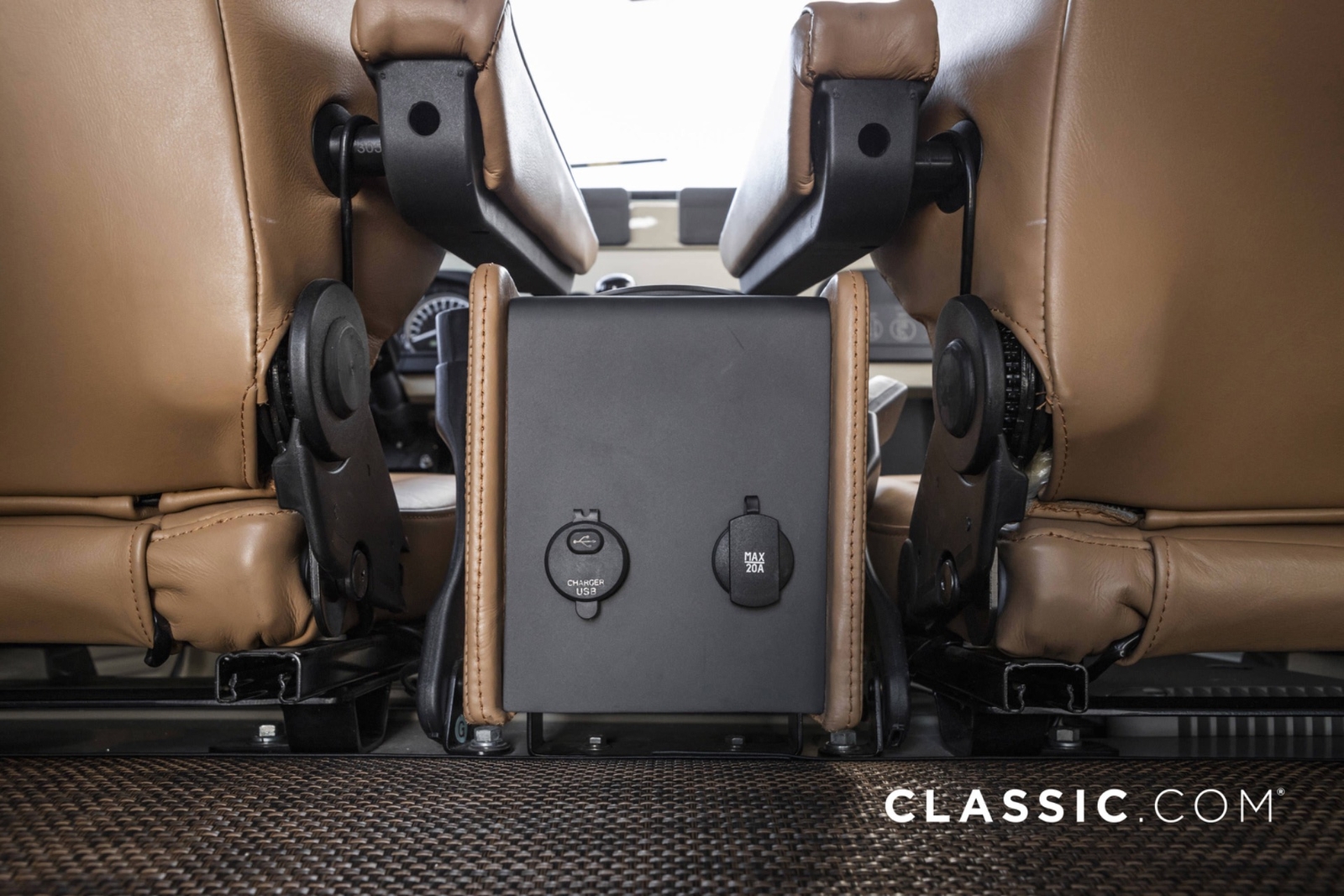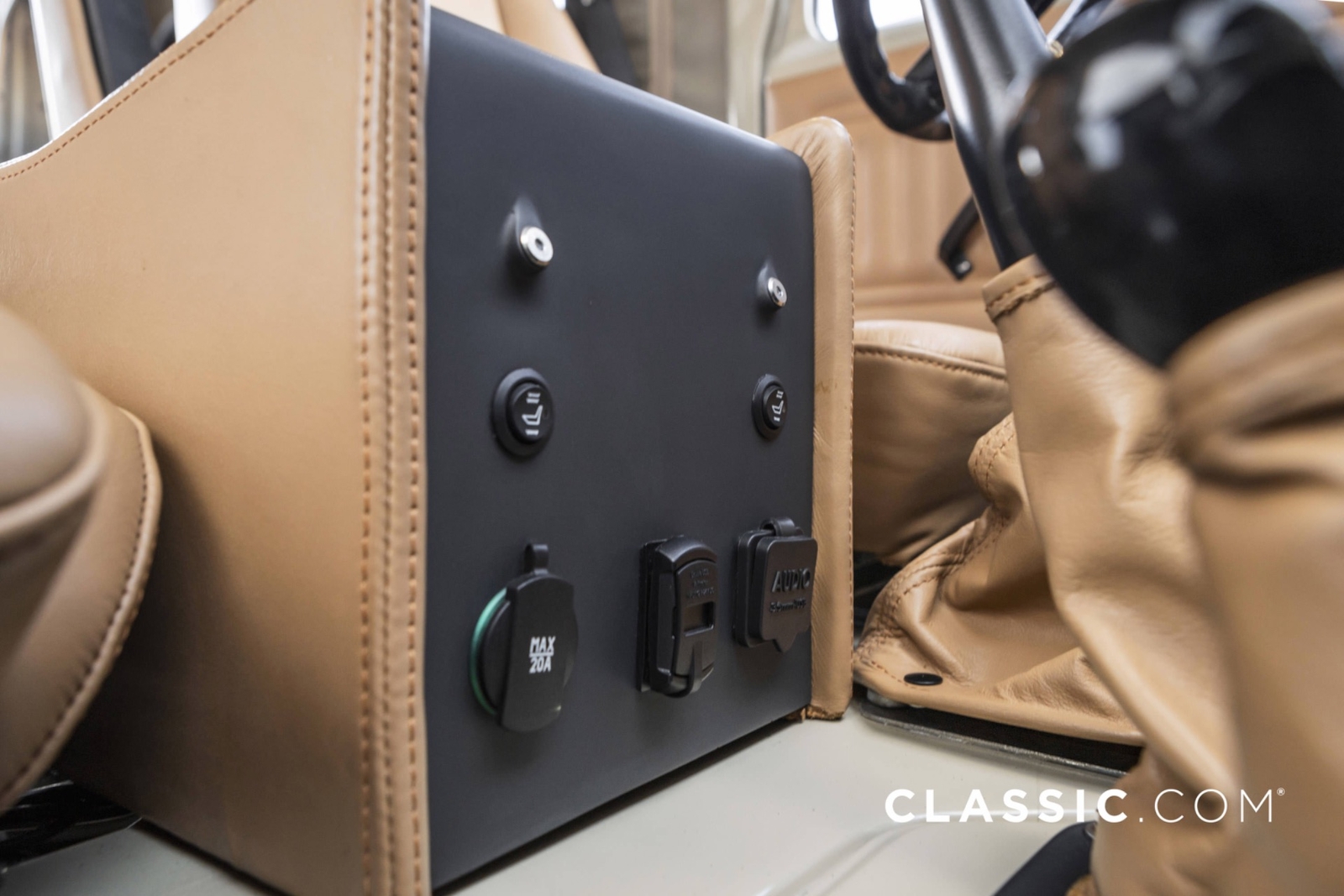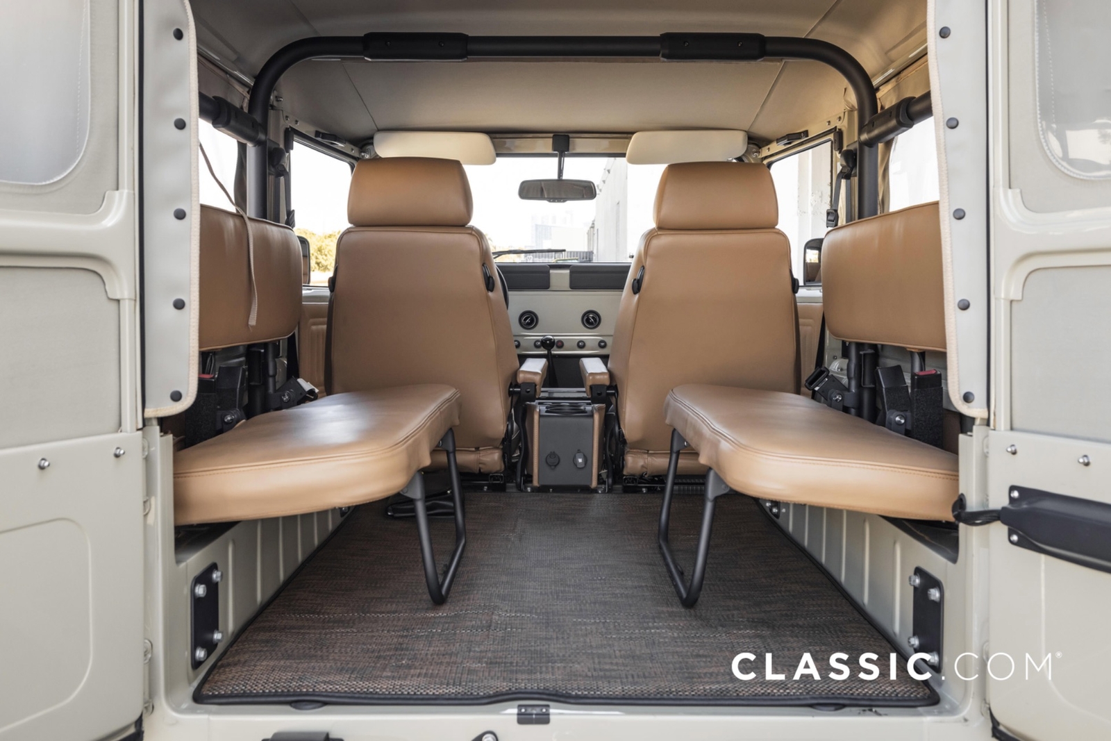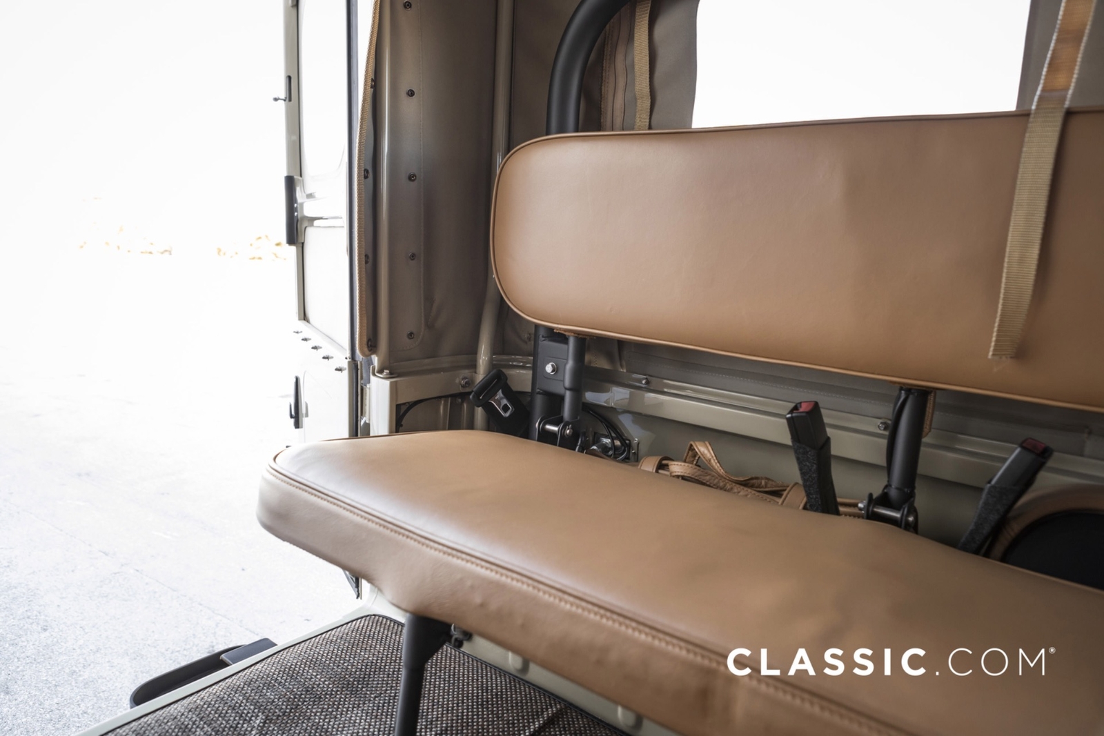 Inside, the vehicle boasts a Vintage Air HVAC system, retractable shoulder belts, and a backup camera, and includes a console-mounted Double-Din stereo equipped with CarPlay/AndroidAuto. Rear inward-facing benches are also covered in brown leather and provide plenty of room for passengers or fold when not in use. The result is a supremely capable custom Land Cruiser that feels equally at home at car shows and around town as it does in the mountains.