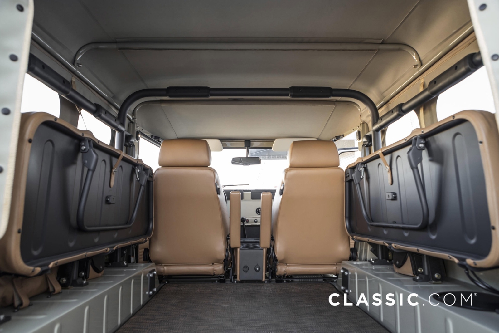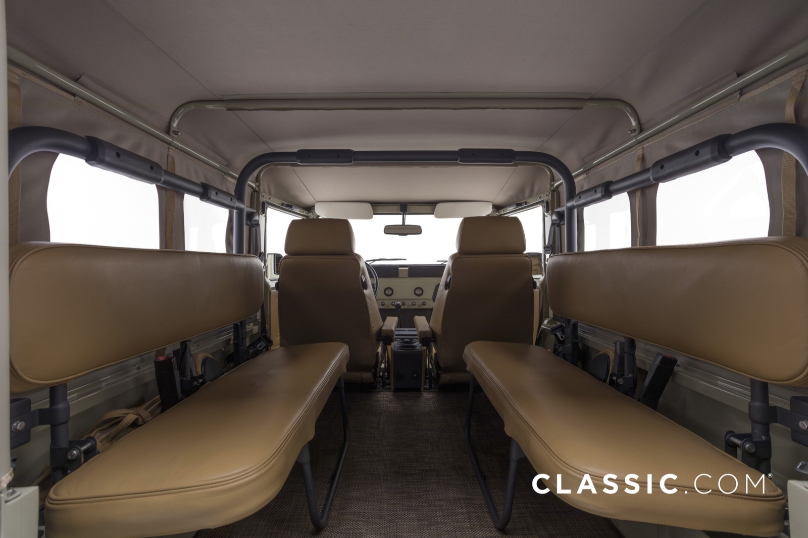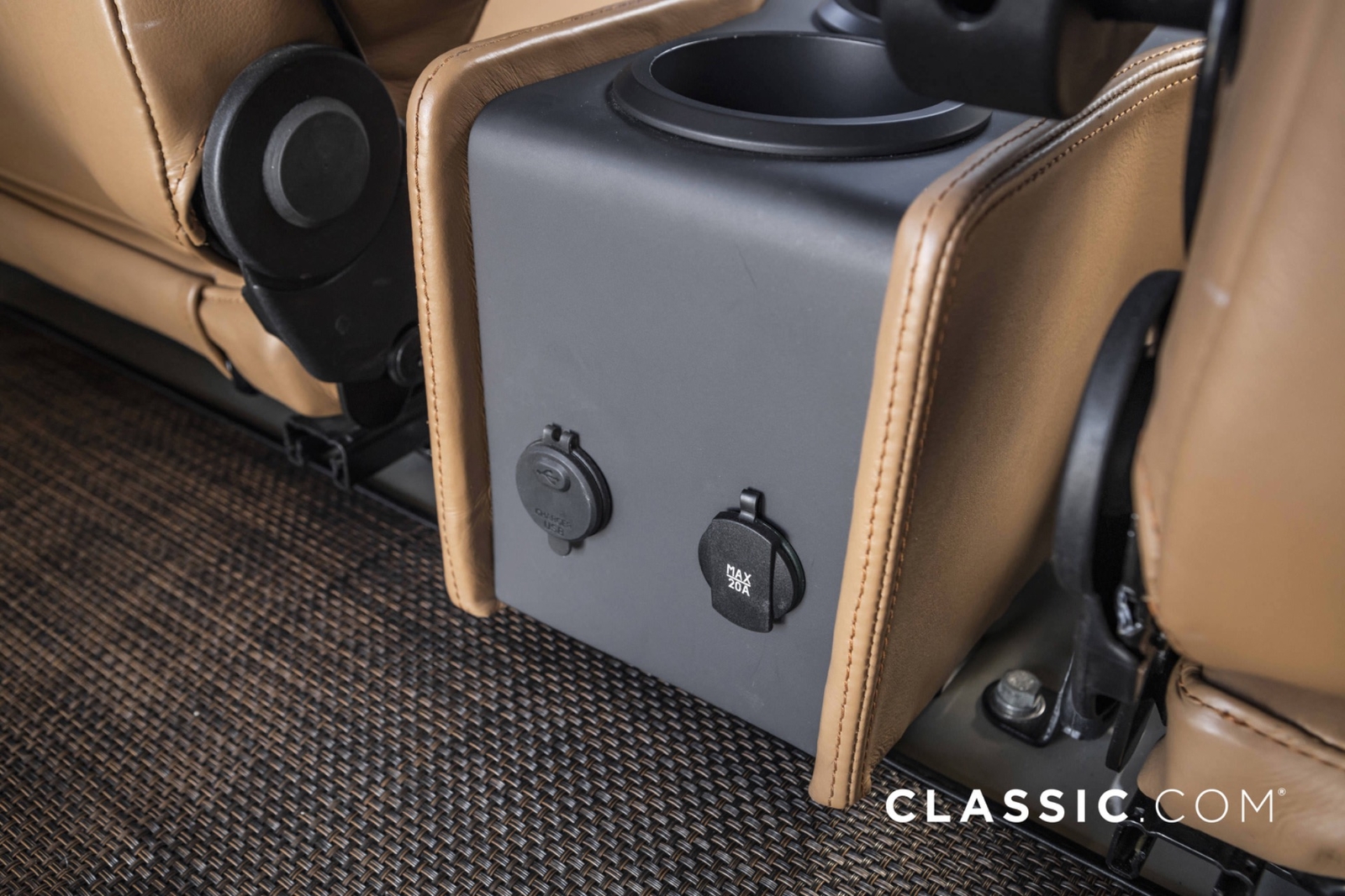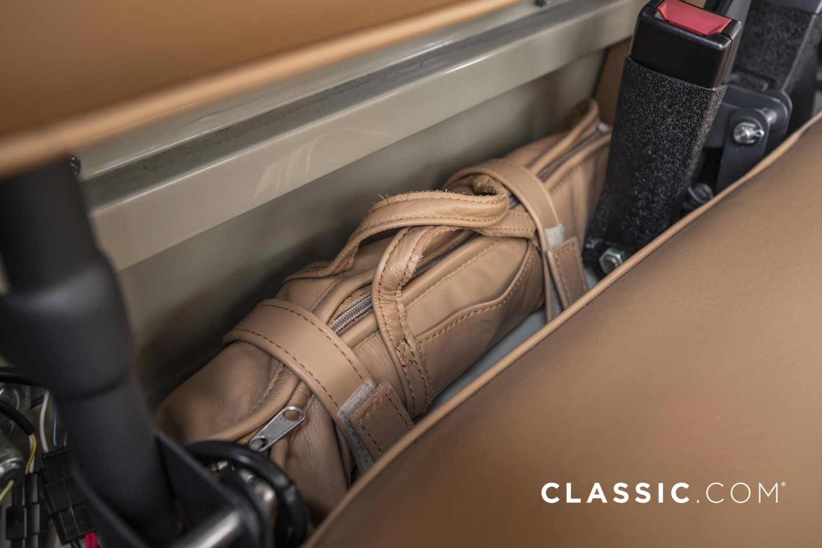 Inside, the vehicle boasts a Vintage Air HVAC system, retractable shoulder belts, and a backup camera, and includes a console-mounted Double-Din stereo equipped with CarPlay/AndroidAuto. Rear inward-facing benches are also covered in brown leather and provide plenty of room for passengers or fold when not in use. The result is a supremely capable custom Land Cruiser that feels equally at home at car shows and around town as it does in the mountains.