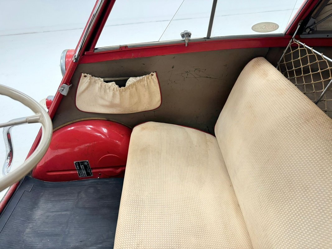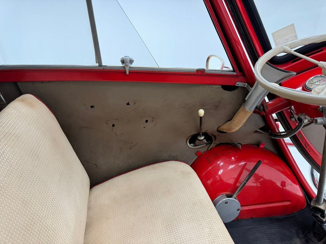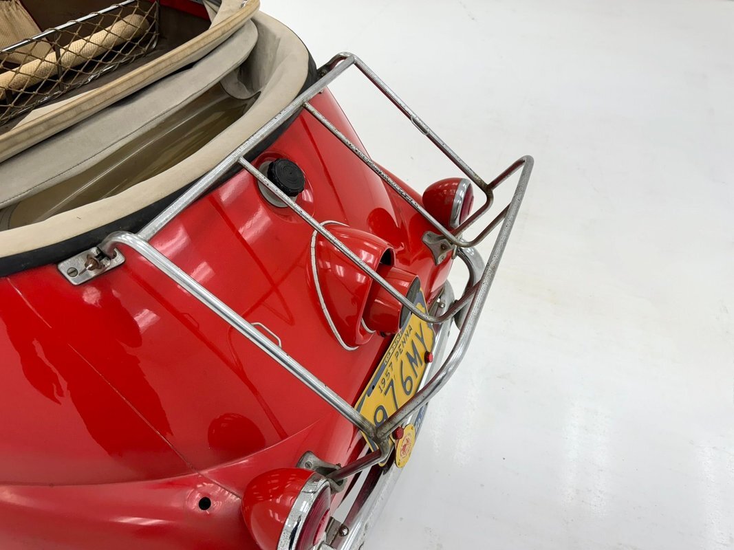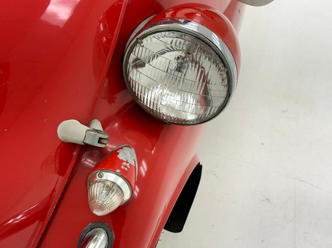 Despite the need for paint restoration, this is an instant show car. A good looker at 30 feet, red really suits this car. Walking up on the car reveals its unrestored condition with areas of discolored paint, chipping paint, dings and brightwork that's no longer bright. That said, it is an Isetta and retains all the charm; an interesting little bug-a-boo with its wide-open round headlights hanging off either side of the bodywork, to its narrowing rear with taillights not to be outdone by the headlights, hanging off the bodywork as well. Bumpers, more like push-bars, are seen all around gracing each corner, and are accompanied by low profile front and rear bumpers. A luggage rack, (a logical option), is mounted to the back, looking very European indeed. Sliding front windows and tall windows leave a field of exterior viewing almost panoramic with all the glass. A small canvas sunroof, also in need of restoration, is seen on top and to complete the conversion to cabriolet means the folding rear quarter coming off a stationary b-pillar hoop. We would be remiss if we were not mentioning the full front swinging entry door complete with tilt out steering column and wheel for easy access. The 10-inch wheels have been powder coated and are wrapped by miniature 4.80-10's front tires and rear.