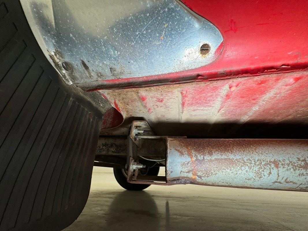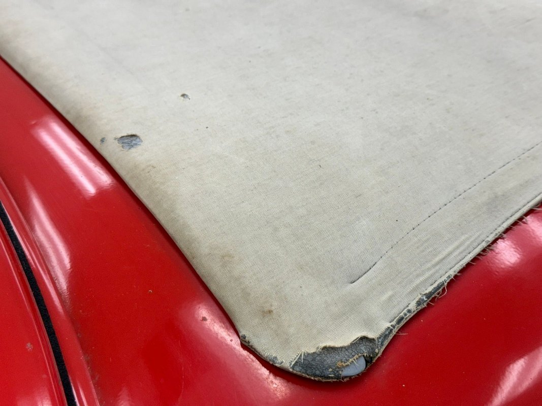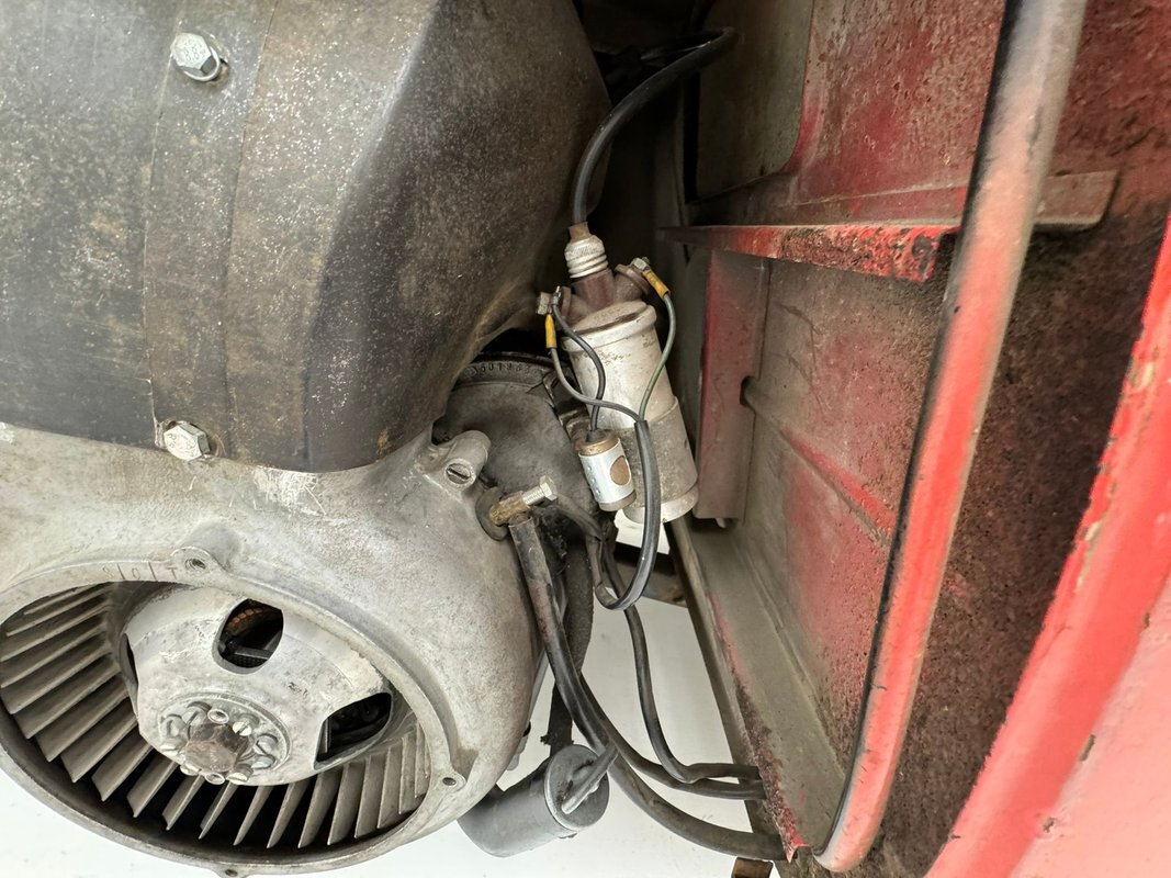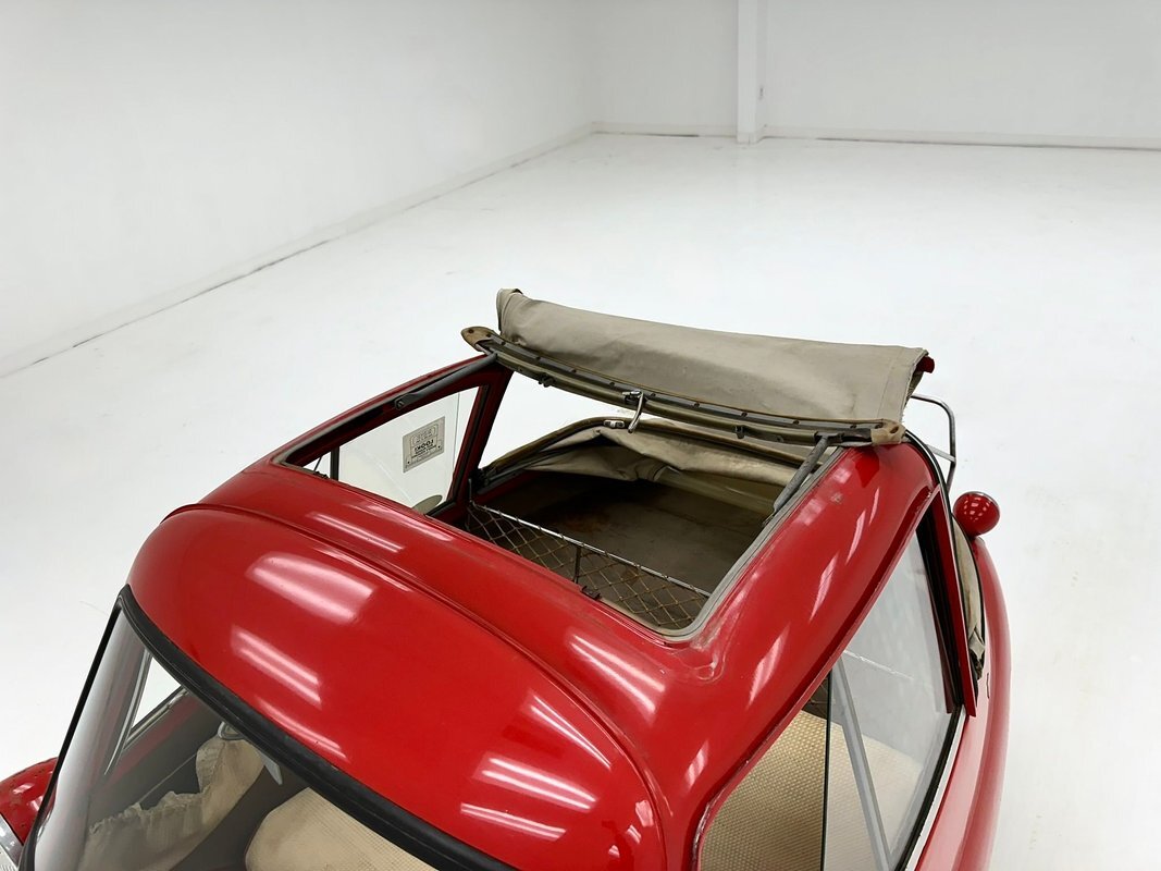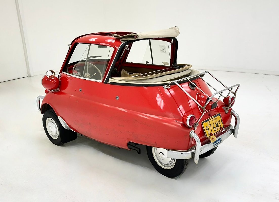Despite the need for paint restoration, this is an instant show car. A good looker at 30 feet, red really suits this car. Walking up on the car reveals its unrestored condition with areas of discolored paint, chipping paint, dings and brightwork that's no longer bright. That said, it is an Isetta and retains all the charm; an interesting little bug-a-boo with its wide-open round headlights hanging off either side of the bodywork, to its narrowing rear with taillights not to be outdone by the headlights, hanging off the bodywork as well. Bumpers, more like push-bars, are seen all around gracing each corner, and are accompanied by low profile front and rear bumpers. A luggage rack, (a logical option), is mounted to the back, looking very European indeed. Sliding front windows and tall windows leave a field of exterior viewing almost panoramic with all the glass. A small canvas sunroof, also in need of restoration, is seen on top and to complete the conversion to cabriolet means the folding rear quarter coming off a stationary b-pillar hoop. We would be remiss if we were not mentioning the full front swinging entry door complete with tilt out steering column and wheel for easy access. The 10-inch wheels have been powder coated and are wrapped by miniature 4.80-10's front tires and rear.