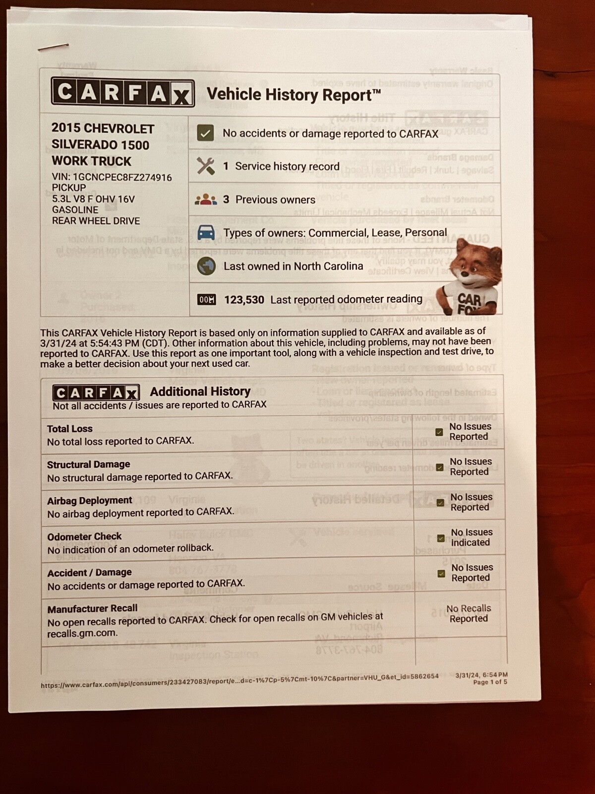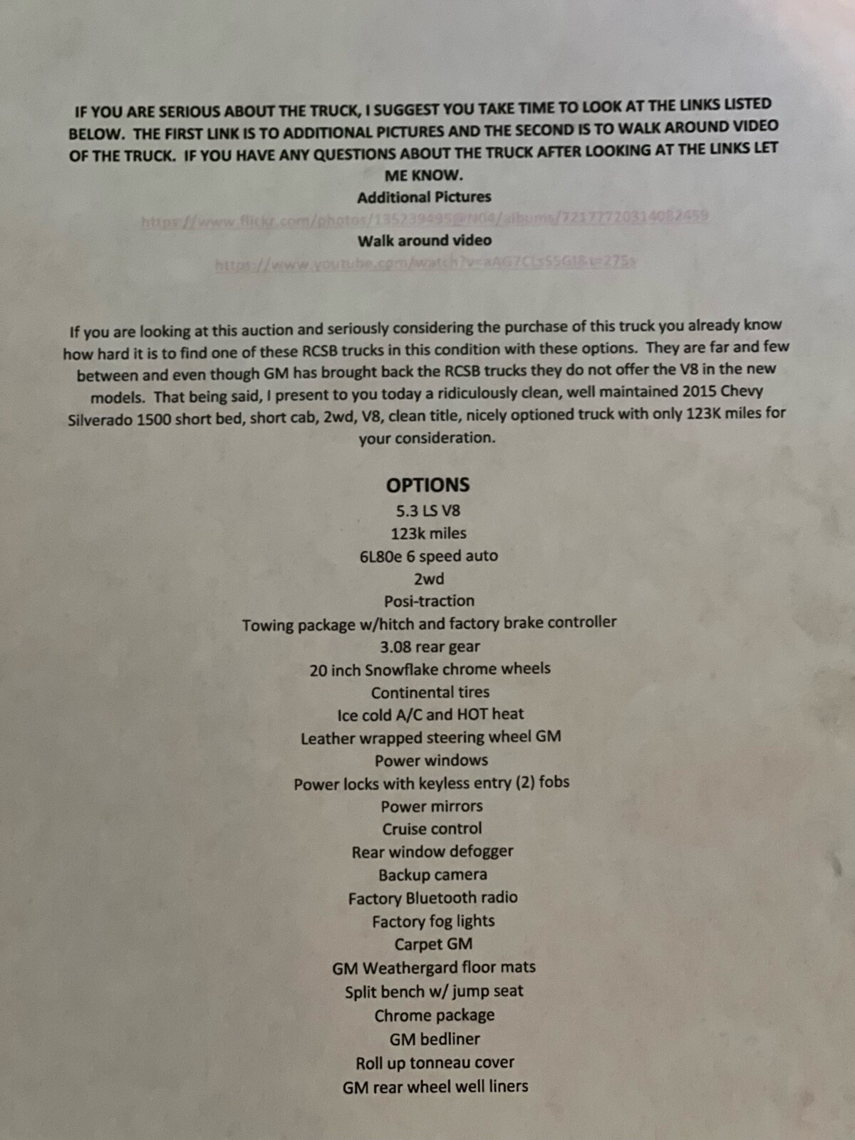 If you are looking at this auction and seriously considering the purchase of this truck, you already know how hard it is to find one of these RCSB trucks in this condition with these options. They are few and far between and even though GM has brought back the RCSB trucks, they do not offer the V8 in the new models. That being said, I present to you today a ridiculously clean, well maintained 2015 Chevy Silverado 1500 short bed, short cab, 2wd, V8, clean title, nicely optioned truck with only 126K miles for your consideration. The paint and body of the truck is very, very (one more time) VERY nice as you see from the photos. The pictures cannot capture just how nice the paint really is on the truck. You will absolutely not be disappointed. A very expensive paint correction process was done on the truck to include a 4 step high speed buff using all 3M products, then waxed. The result is nothing short of outstanding. This truck has been cleaned on the underside as well. This is a 3 owner, clean Carfax truck.Seller's Notes