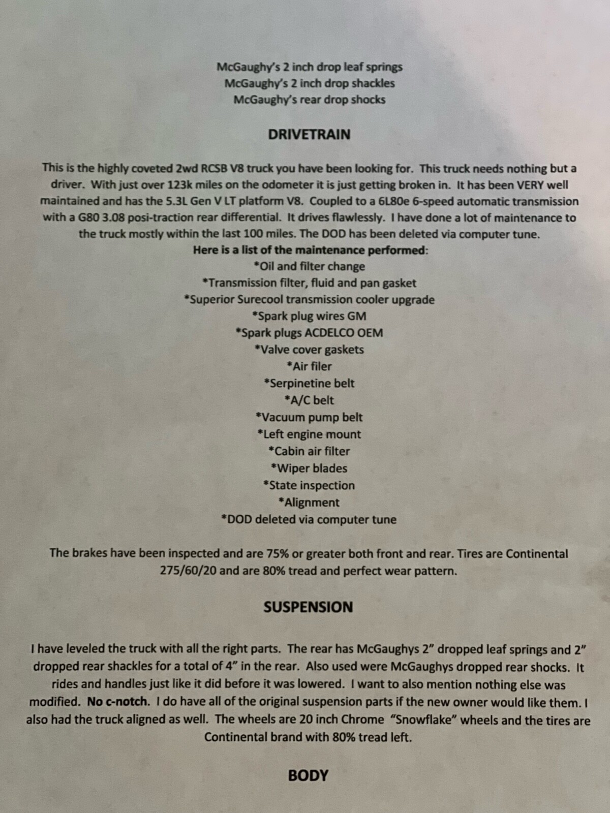 This is the highly coveted 2wd RCSB V8 truck you have been looking for. This truck needs nothing but a driver. With just over 126K miles on the odometer it is just getting broken in. It has been VERY well maintained and has the 5.3L Gen V LT platform V8. Coupled to a 6L80e 6-speed automatic transmission with a G80 3.08 posi-traction rear differential. It drives flawlessly.