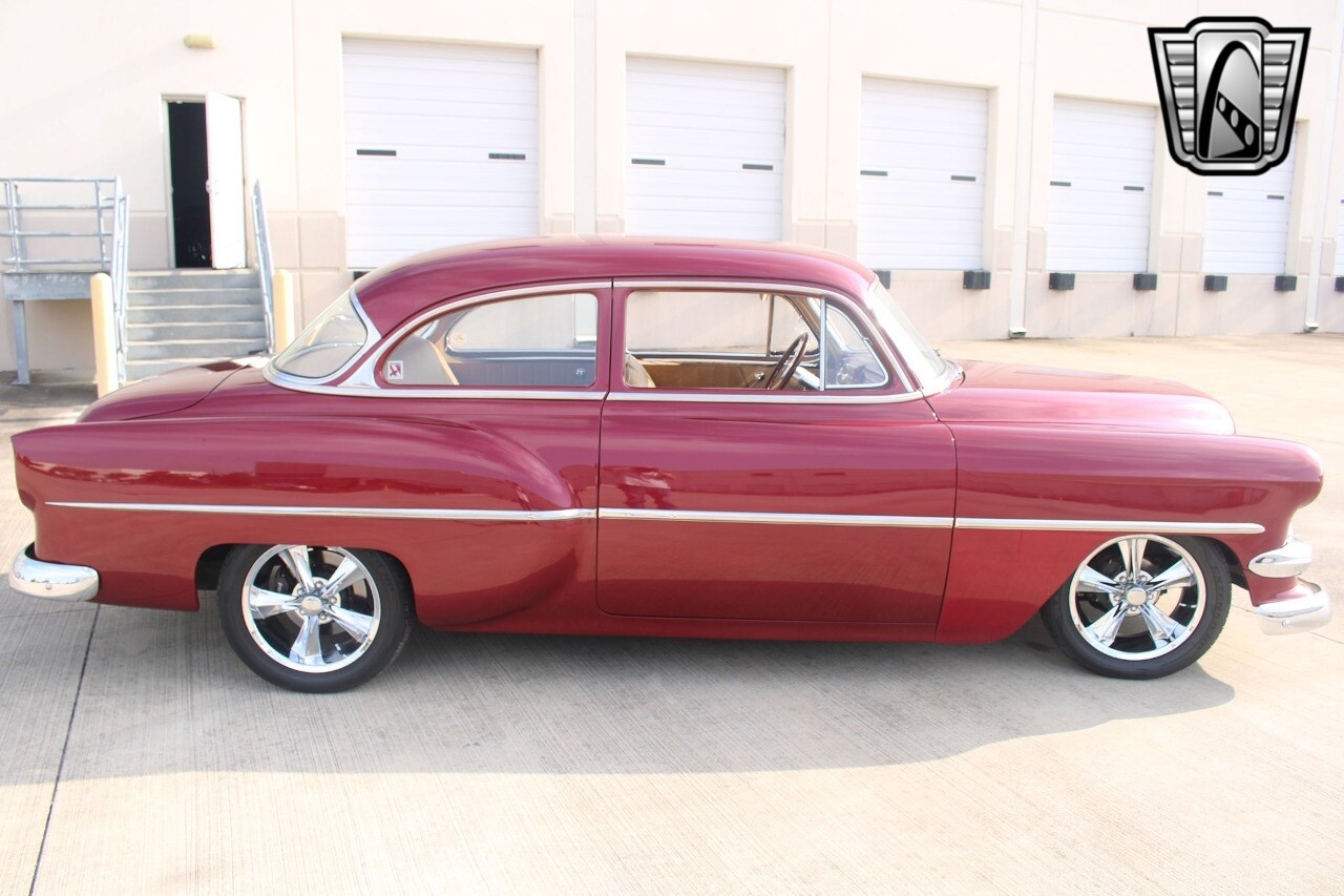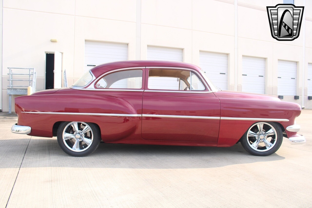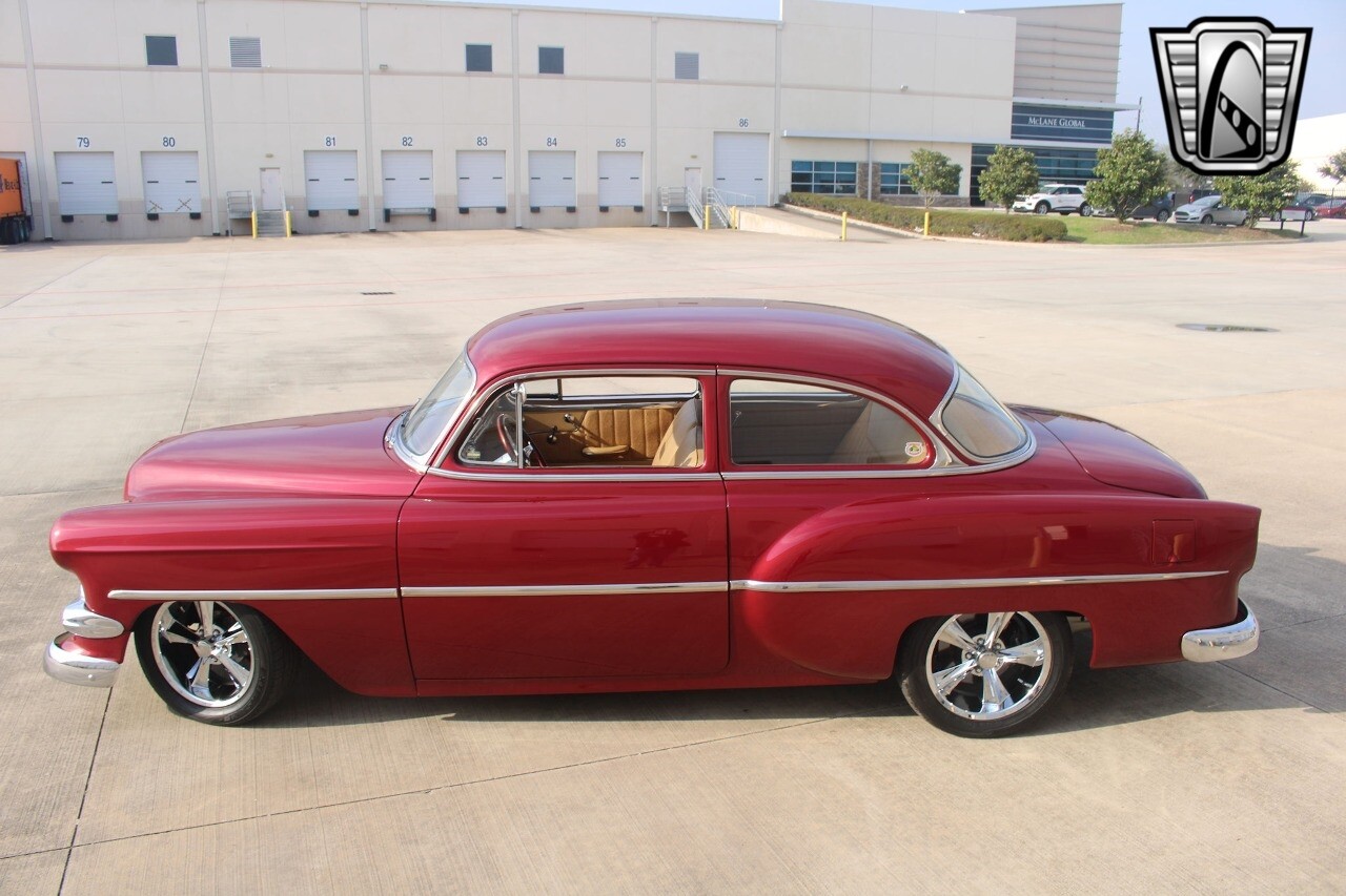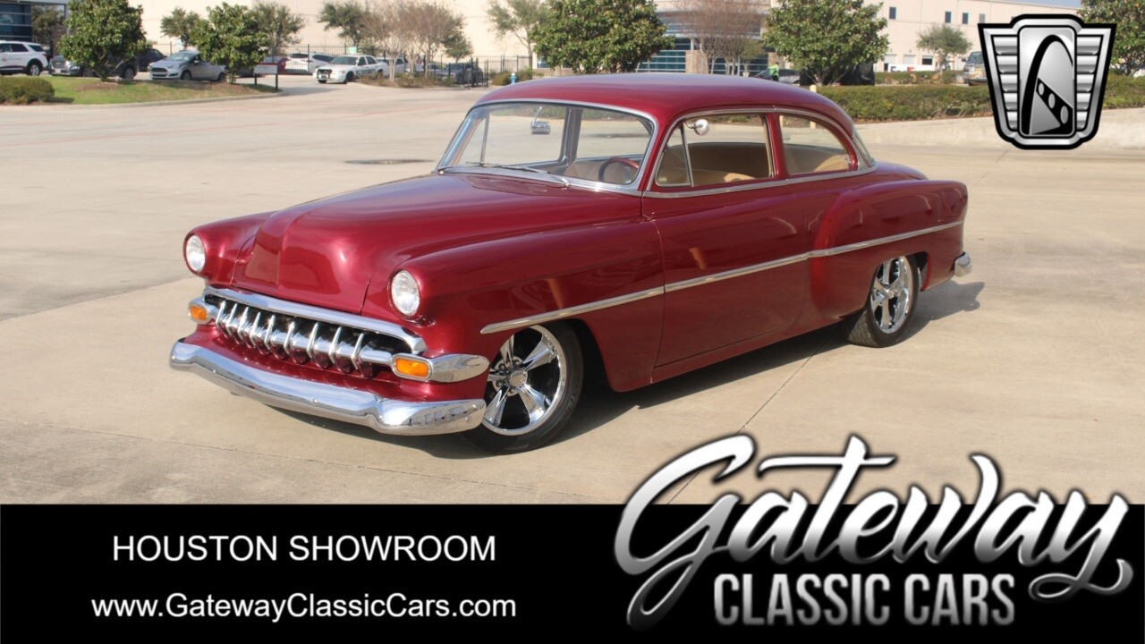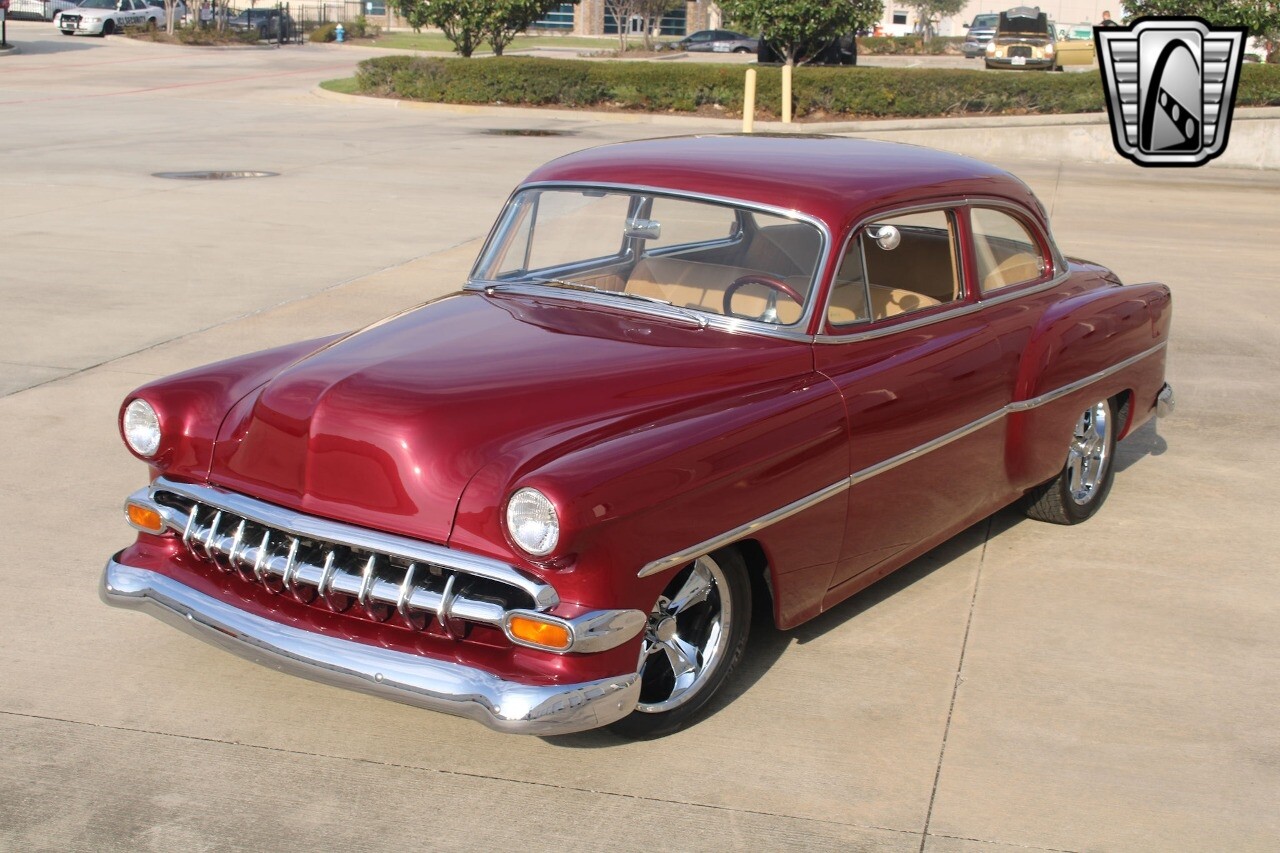 Gateway Classic Cars Houston Showroom is excited to offer this one of a kind custom 1954 Chevrolet 210 for sale. This sleek ride has many custom touches and packs quite a punch, too! The first thing one notices is the luxurious House of Kolors' 2-stage urethane "Kandy Burgundy" paint (code KBC06), which is just beautiful in bright light. It was applied after the headlights and taillights were frenched, blocking and decking the hood, shaving the firewall, door handles and trunk locks, and adding door & trunk poppers (with emergency backup release), and the intensive prep labor shows in the result! The chrome trim will blind you if the sun hits it just right, too! The build was done to order in 2007 in Michigan (builder unknown), and was enhanced by its current owner, who purchased it from its first "post-build" owner in 2015. Since purchasing it, both the front and rear suspension were replaced with upgraded components and powder coated. In the front, it now features a Mustang II steering rack, tubular upper control arms and Wilwood disc brakes with multi-piston calipers. Out back, it has an adjustable 4-link rear with polished QA1 coilovers, a 9-inch Ford third member (with 3.73:1 gears and limited slip diff), and Wilwood disc brakes with multi-piston calipers. Under the hood is a freshly upgraded GM ZZ4 Crate 350 CID V8, which has been bored .030", along with being fully balanced: so it's now a 355 CID V8. That mighty mouse is topped by a polished Street & Performance upper and lower intake, with Tuned Port Injection, which feeds the air/fuel mix into the ported and polished aluminum heads. A set of ceramic coated shorty headers funnel the exhaust into the Flowmaster muffler-equipped dual exhaust, which really provide for a nice, muscular sound. A massive polished BeCool aluminum radiator with twin electric fans keeps the small block cooled very effectively. Behind the 355 CID V8 is a fresh 700R4 4-speed automatic, which was built to handle up to 600 HP/600 TQ, so it's more than up to the task of getting the power to the rear via the custom-built driveshaft. Inside, the clean looking tan interior features vinyl-trimmed cloth bench seating for both front and rear passengers, with seatbelts for up to 4 occupants. The glove box is hiding a large LCD screen-equipped entertainment system, so you'll not have to worry about giving up your favorite cruisin' jams! The driver gets the pleasure of viewing a custom set of VDO gauges, through the wood-rimmed billet aluminum steering wheel atop the polished iDidit steering column. The VDO gauges provide a vintage look, but modern tech behind them. Everyone inside will enjoy the cold Vintage Air A/C system, as well. A Lokar shifter falls easily to hand for the driver, and not only looks cool, but provides easy gear selection. The interior chrome surfaces are just as bright as the exterior chrome, so you may need to wear your sunglasses at night, too. [ omitted ].