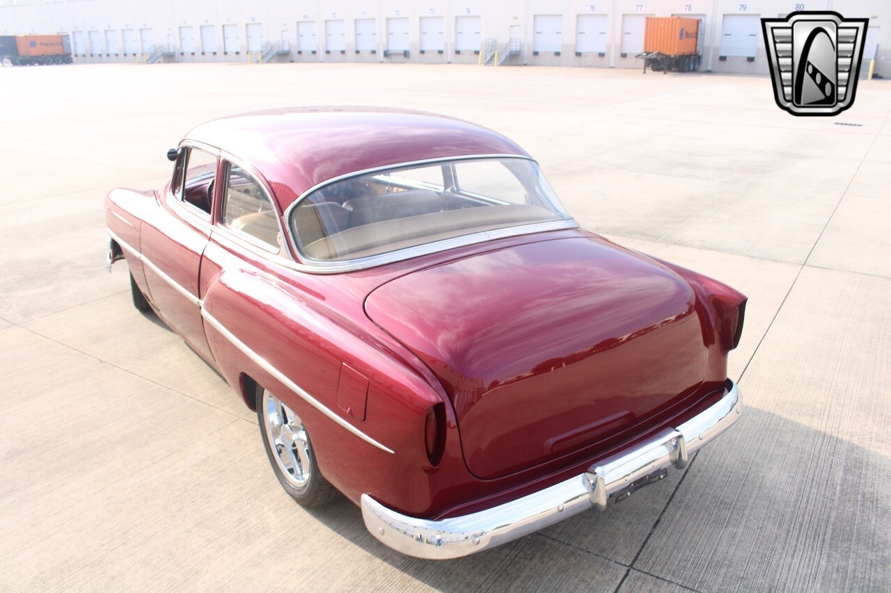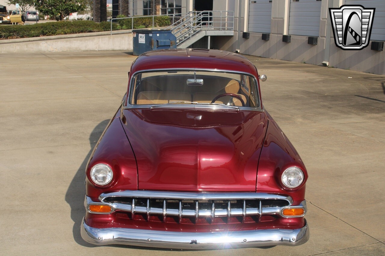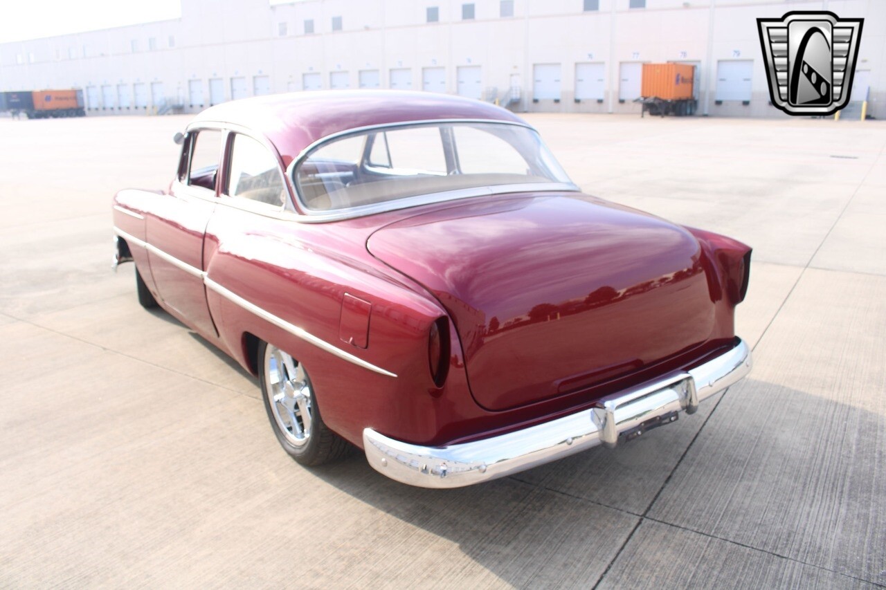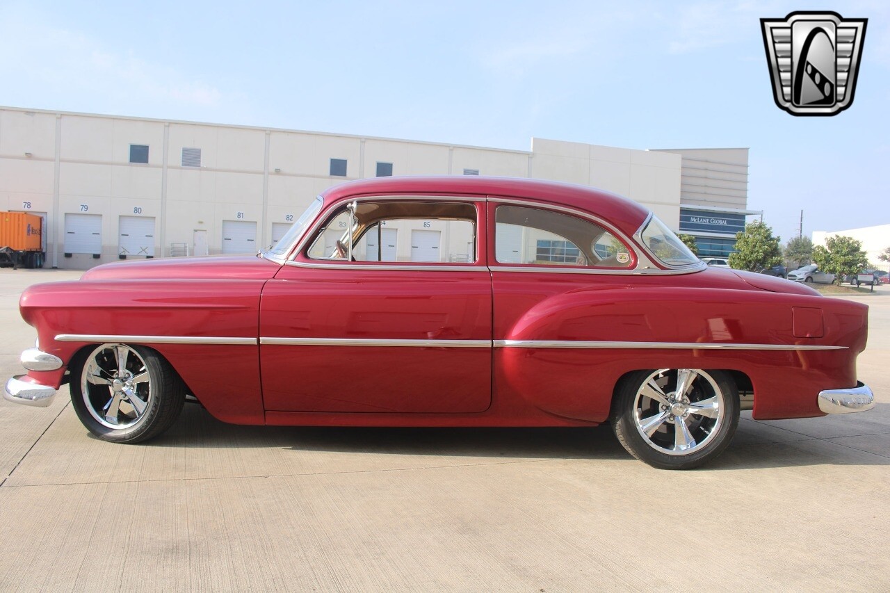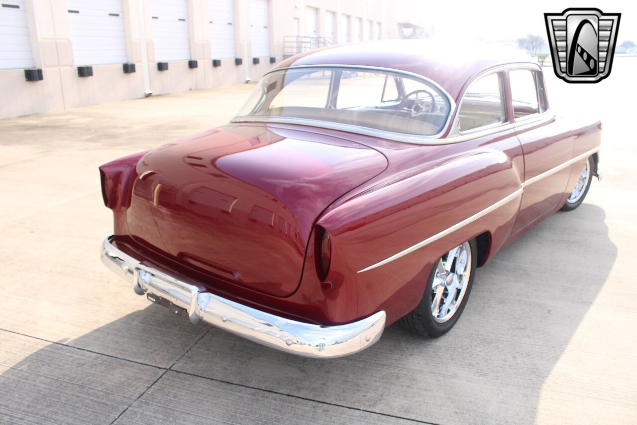 Gateway Classic Cars Houston Showroom is excited to offer this one of a kind custom 1954 Chevrolet 210 for sale. This sleek ride has many custom touches and packs quite a punch, too! The first thing one notices is the luxurious House of Kolors' 2-stage urethane "Kandy Burgundy" paint (code KBC06), which is just beautiful in bright light. It was applied after the headlights and taillights were frenched, blocking and decking the hood, shaving the firewall, door handles and trunk locks, and adding door & trunk poppers (with emergency backup release), and the intensive prep labor shows in the result! The chrome trim will blind you if the sun hits it just right, too! The build was done to order in 2007 in Michigan (builder unknown), and was enhanced by its current owner, who purchased it from its first "post-build" owner in 2015. Since purchasing it, both the front and rear suspension were replaced with upgraded components and powder coated. In the front, it now features a Mustang II steering rack, tubular upper control arms and Wilwood disc brakes with multi-piston calipers. Out back, it has an adjustable 4-link rear with polished QA1 coilovers, a 9-inch Ford third member (with 3.73:1 gears and limited slip diff), and Wilwood disc brakes with multi-piston calipers. Under the hood is a freshly upgraded GM ZZ4 Crate 350 CID V8, which has been bored .030", along with being fully balanced: so it's now a 355 CID V8. That mighty mouse is topped by a polished Street & Performance upper and lower intake, with Tuned Port Injection, which feeds the air/fuel mix into the ported and polished aluminum heads. A set of ceramic coated shorty headers funnel the exhaust into the Flowmaster muffler-equipped dual exhaust, which really provide for a nice, muscular sound. A massive polished BeCool aluminum radiator with twin electric fans keeps the small block cooled very effectively. Behind the 355 CID V8 is a fresh 700R4 4-speed automatic, which was built to handle up to 600 HP/600 TQ, so it's more than up to the task of getting the power to the rear via the custom-built driveshaft. Inside, the clean looking tan interior features vinyl-trimmed cloth bench seating for both front and rear passengers, with seatbelts for up to 4 occupants. The glove box is hiding a large LCD screen-equipped entertainment system, so you'll not have to worry about giving up your favorite cruisin' jams! The driver gets the pleasure of viewing a custom set of VDO gauges, through the wood-rimmed billet aluminum steering wheel atop the polished iDidit steering column. The VDO gauges provide a vintage look, but modern tech behind them. Everyone inside will enjoy the cold Vintage Air A/C system, as well. A Lokar shifter falls easily to hand for the driver, and not only looks cool, but provides easy gear selection. The interior chrome surfaces are just as bright as the exterior chrome, so you may need to wear your sunglasses at night, too. [ omitted ].