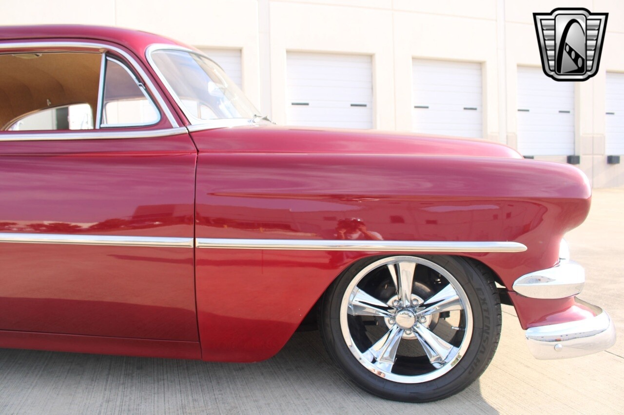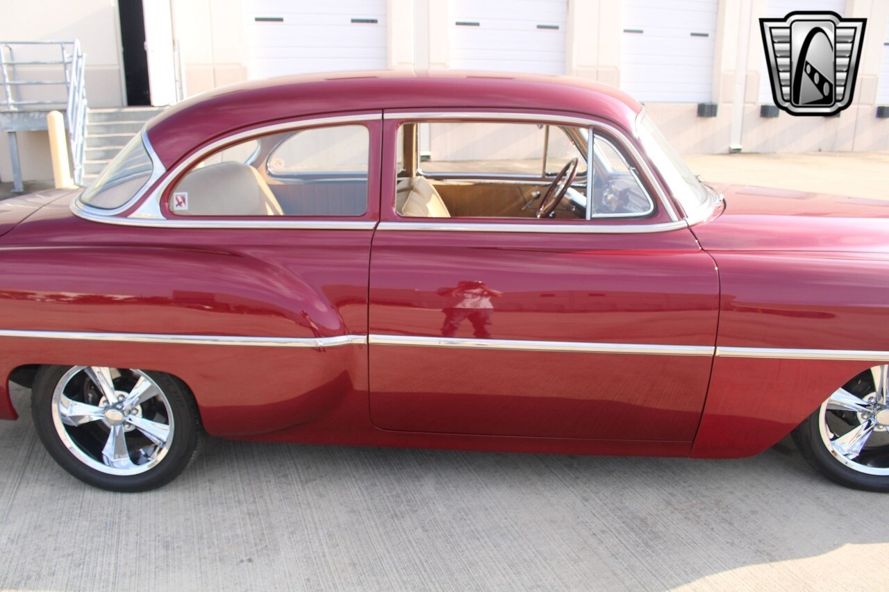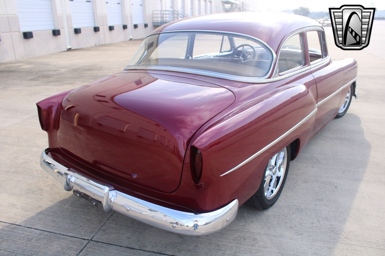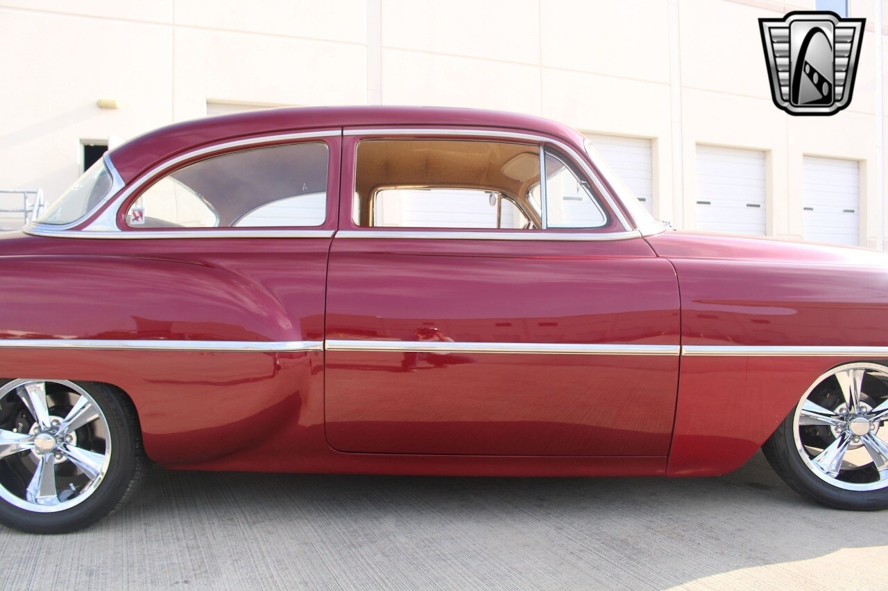 Gateway Classic Cars Houston Showroom is excited to offer this one of a kind custom 1954 Chevrolet 210 for sale. This sleek ride has many custom touches and packs quite a punch, too! The first thing one notices is the luxurious House of Kolors' 2-stage urethane "Kandy Burgundy" paint (code KBC06), which is just beautiful in bright light. It was applied after the headlights and taillights were frenched, blocking and decking the hood, shaving the firewall, door handles and trunk locks, and adding door & trunk poppers (with emergency backup release), and the intensive prep labor shows in the result! The chrome trim will blind you if the sun hits it just right, too! The build was done to order in 2007 in Michigan (builder unknown), and was enhanced by its current owner, who purchased it from its first "post-build" owner in 2015. Since purchasing it, both the front and rear suspension were replaced with upgraded components and powder coated. In the front, it now features a Mustang II steering rack, tubular upper control arms and Wilwood disc brakes with multi-piston calipers. Out back, it has an adjustable 4-link rear with polished QA1 coilovers, a 9-inch Ford third member (with 3.73:1 gears and limited slip diff), and Wilwood disc brakes with multi-piston calipers. Under the hood is a freshly upgraded GM ZZ4 Crate 350 CID V8, which has been bored .030", along with being fully balanced: so it's now a 355 CID V8. That mighty mouse is topped by a polished Street & Performance upper and lower intake, with Tuned Port Injection, which feeds the air/fuel mix into the ported and polished aluminum heads. A set of ceramic coated shorty headers funnel the exhaust into the Flowmaster muffler-equipped dual exhaust, which really provide for a nice, muscular sound. A massive polished BeCool aluminum radiator with twin electric fans keeps the small block cooled very effectively. Behind the 355 CID V8 is a fresh 700R4 4-speed automatic, which was built to handle up to 600 HP/600 TQ, so it's more than up to the task of getting the power to the rear via the custom-built driveshaft. Inside, the clean looking tan interior features vinyl-trimmed cloth bench seating for both front and rear passengers, with seatbelts for up to 4 occupants. The glove box is hiding a large LCD screen-equipped entertainment system, so you'll not have to worry about giving up your favorite cruisin' jams! The driver gets the pleasure of viewing a custom set of VDO gauges, through the wood-rimmed billet aluminum steering wheel atop the polished iDidit steering column. The VDO gauges provide a vintage look, but modern tech behind them. Everyone inside will enjoy the cold Vintage Air A/C system, as well. A Lokar shifter falls easily to hand for the driver, and not only looks cool, but provides easy gear selection. The interior chrome surfaces are just as bright as the exterior chrome, so you may need to wear your sunglasses at night, too. [ omitted ].