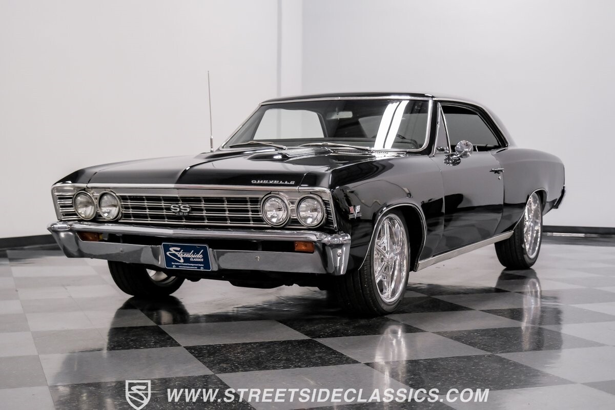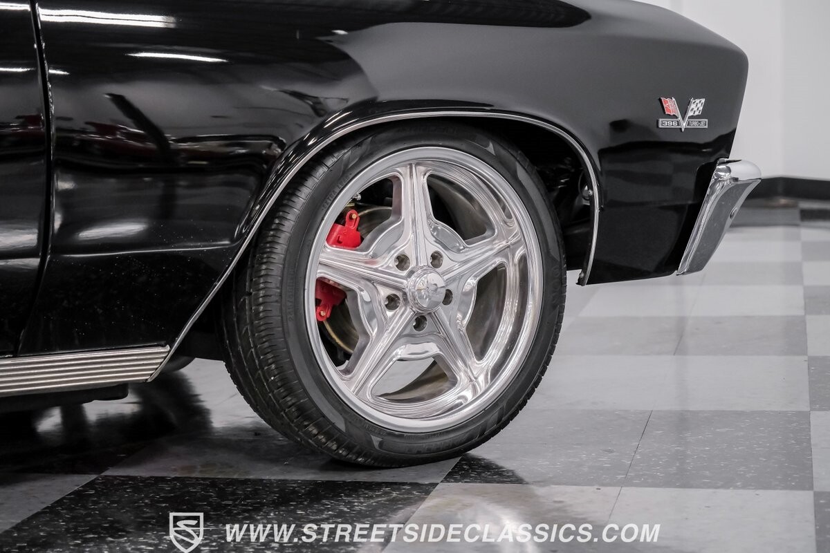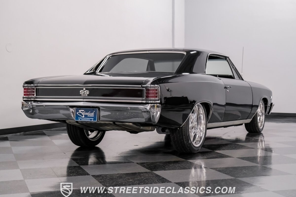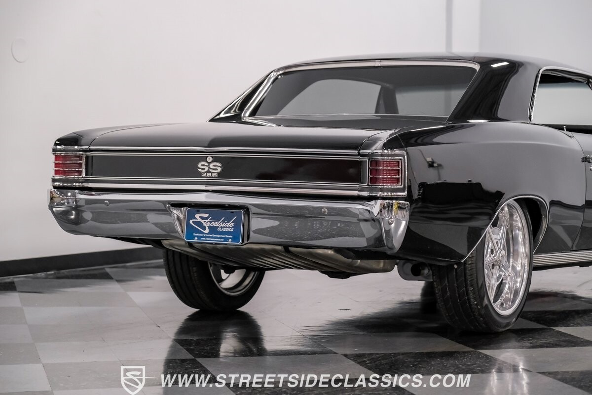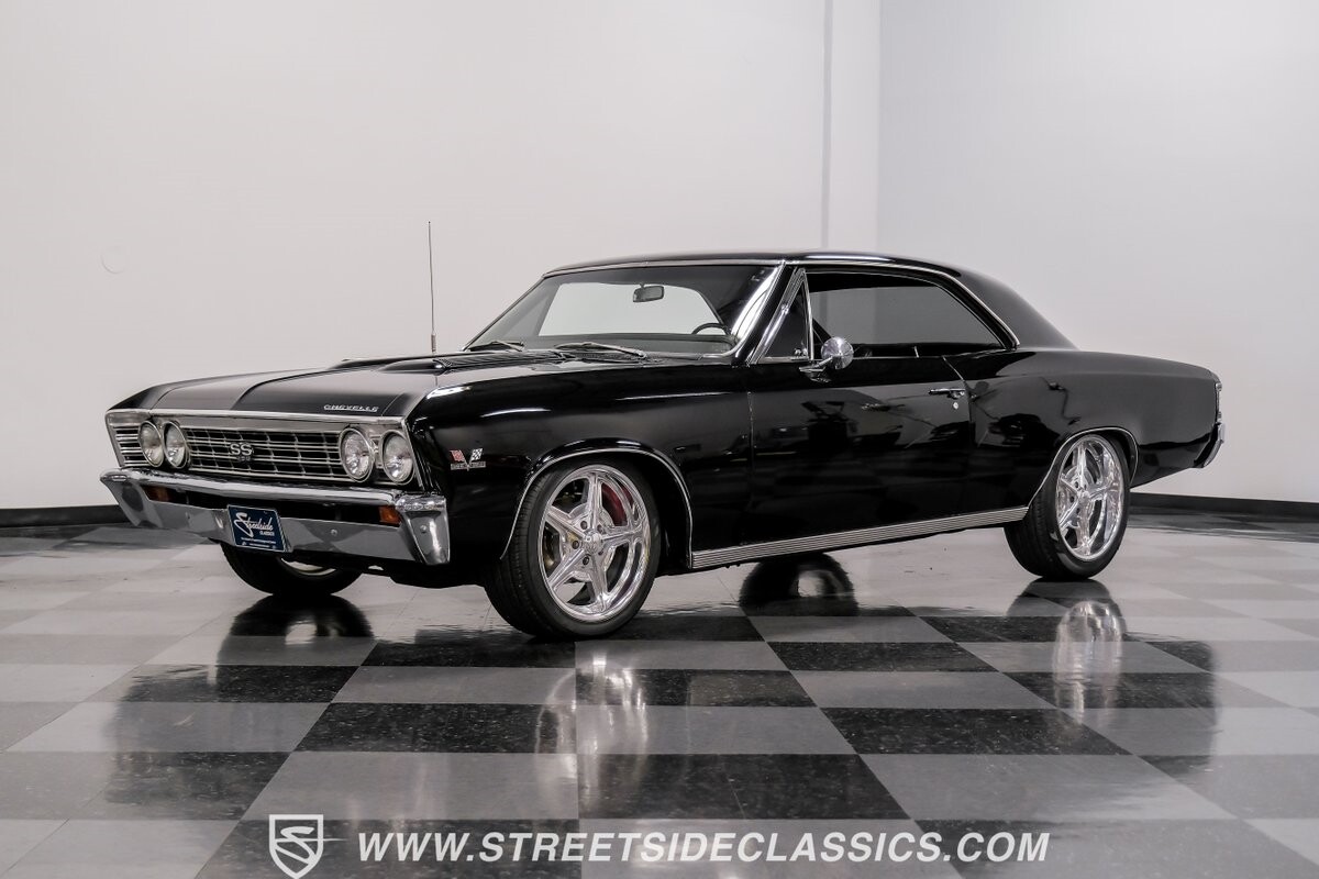 Draped in a glossy black coat, this 1967 Chevrolet Chevelle SS 396 is a true embodiment of American muscle. The chrome accents, like a perfect tie on a sharp suit, add just the right amount of flash to this classic beauty. Rolling on a set of 18" Billet Specialties wheels up front and 20" in the rear, this Chevelle has a stance that screams "I mean business." The lowered suspension gives it an aggressive, ready-to-pounce look that's sure to draw envious glances wherever it goes.