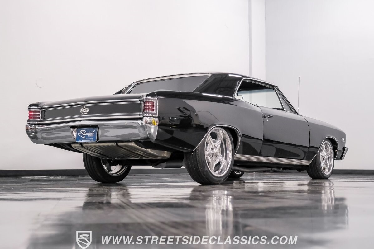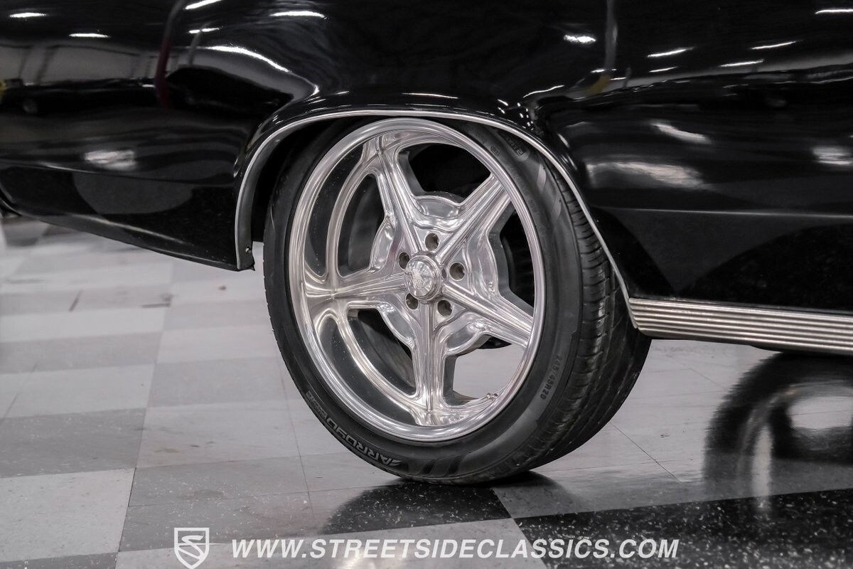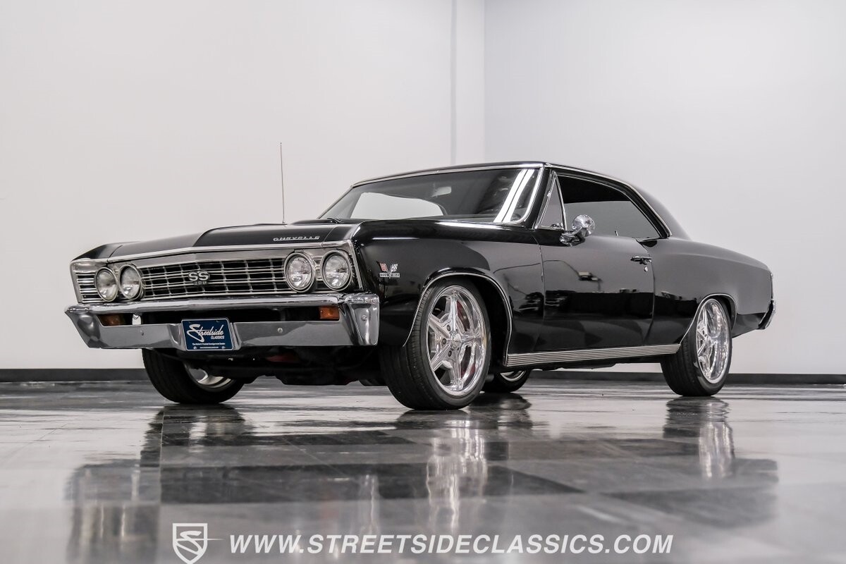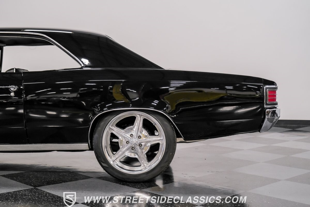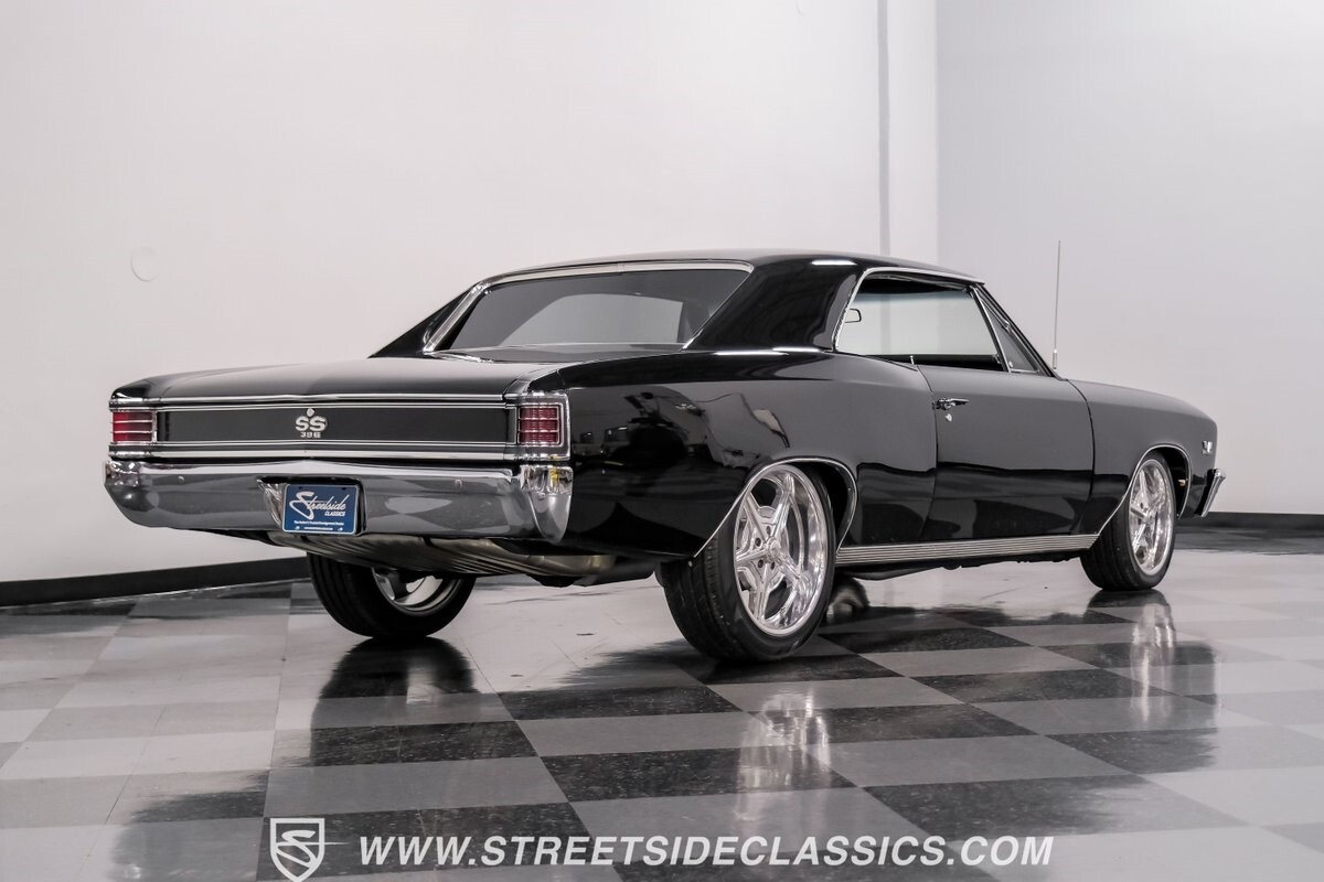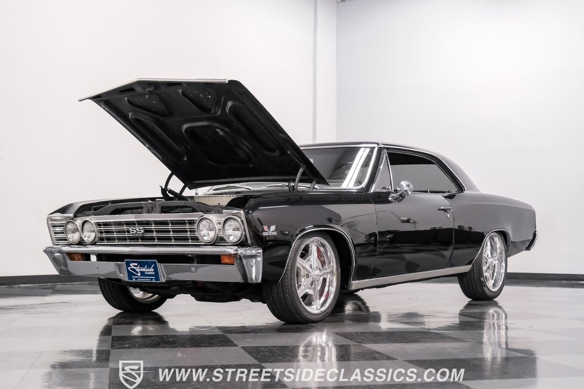 Draped in a glossy black coat, this 1967 Chevrolet Chevelle SS 396 is a true embodiment of American muscle. The chrome accents, like a perfect tie on a sharp suit, add just the right amount of flash to this classic beauty. Rolling on a set of 18" Billet Specialties wheels up front and 20" in the rear, this Chevelle has a stance that screams "I mean business." The lowered suspension gives it an aggressive, ready-to-pounce look that's sure to draw envious glances wherever it goes.