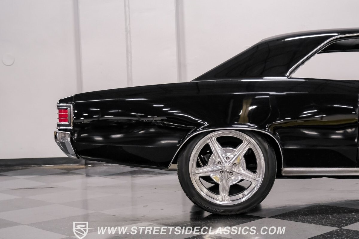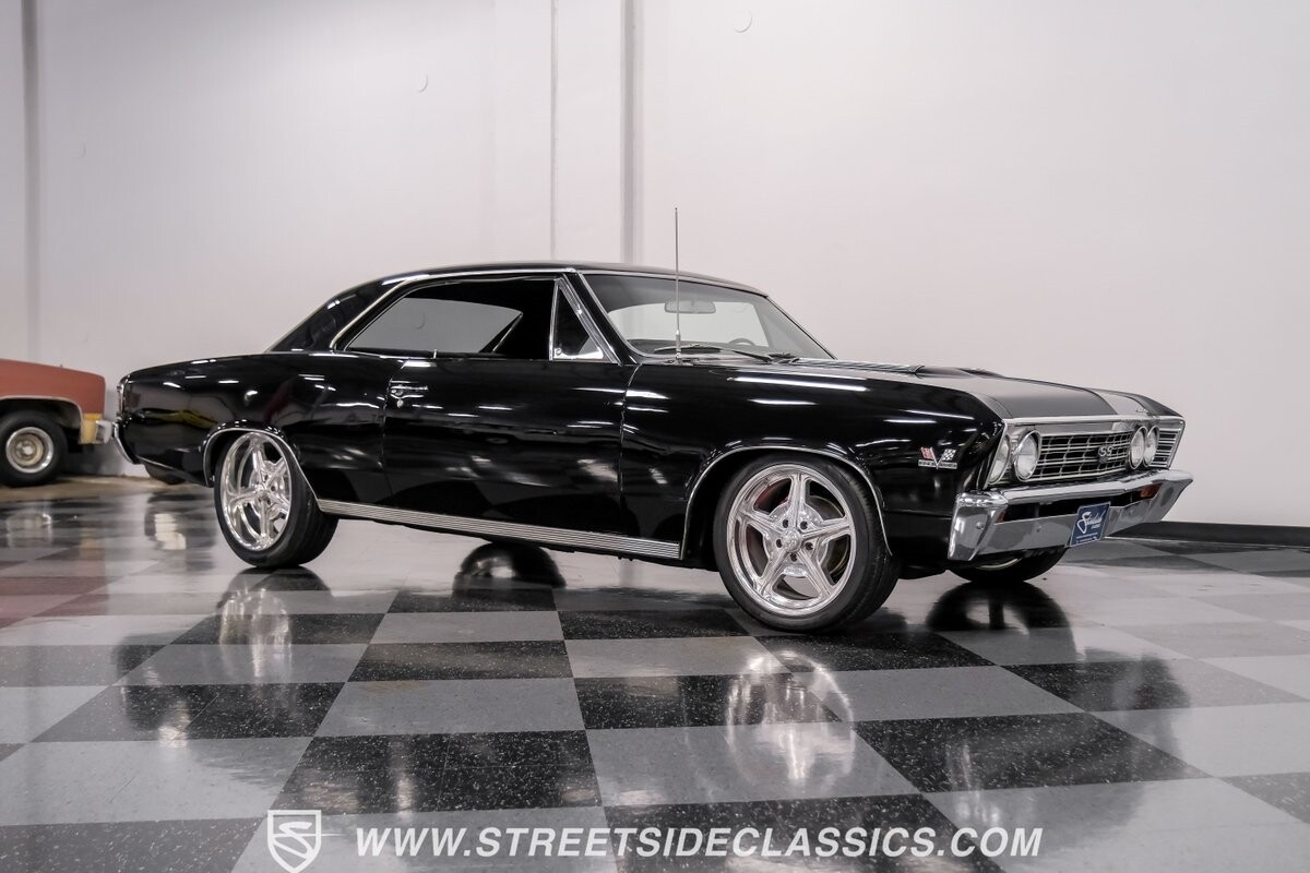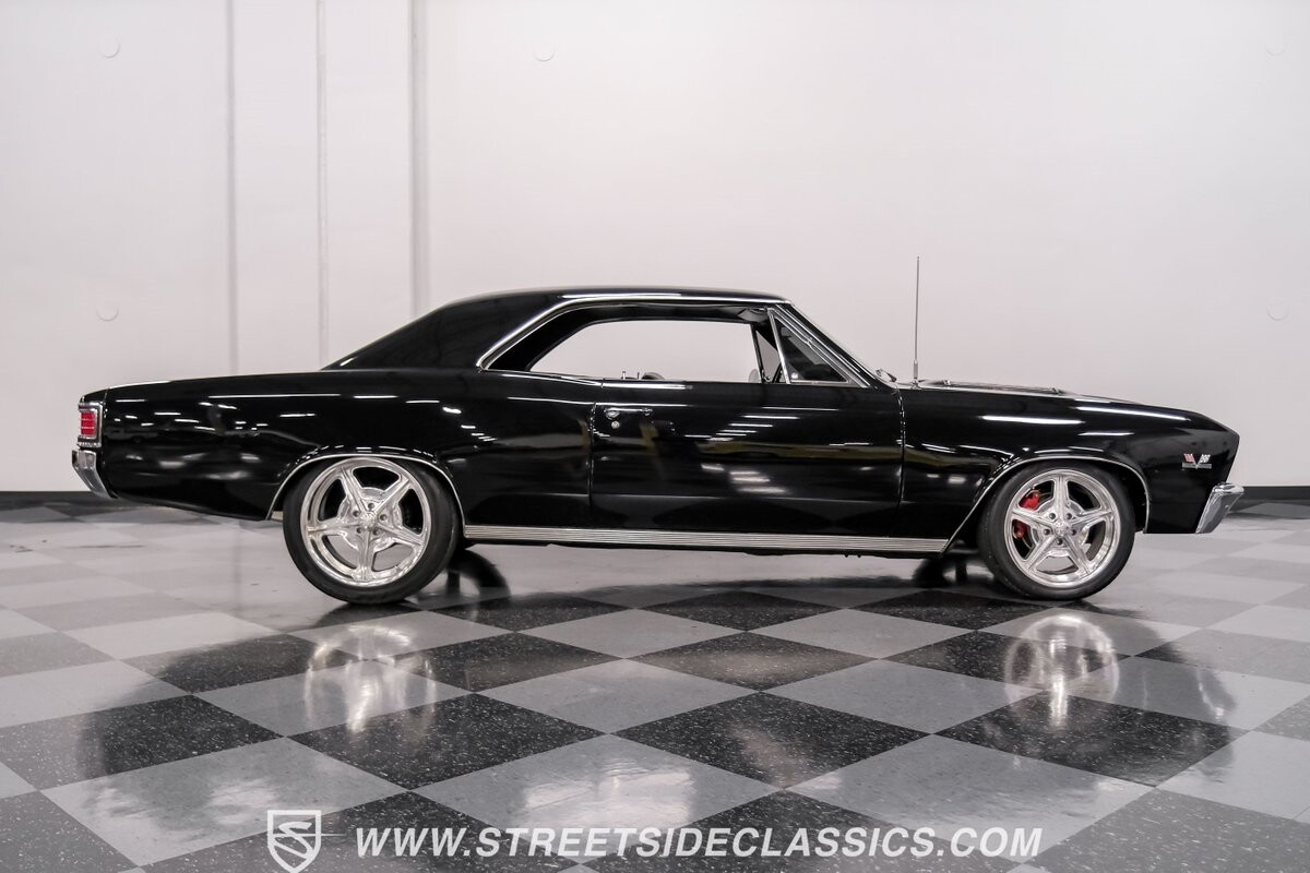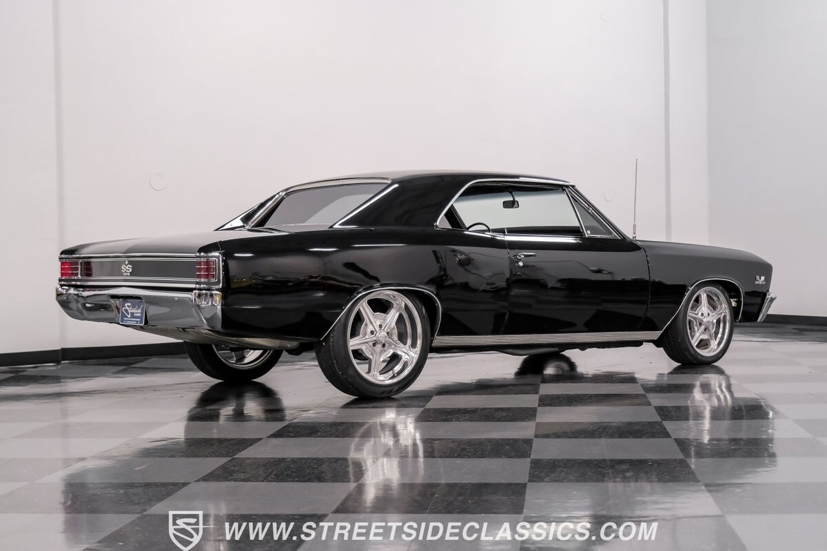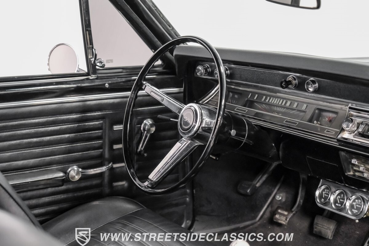 Draped in a glossy black coat, this 1967 Chevrolet Chevelle SS 396 is a true embodiment of American muscle. The chrome accents, like a perfect tie on a sharp suit, add just the right amount of flash to this classic beauty. Rolling on a set of 18" Billet Specialties wheels up front and 20" in the rear, this Chevelle has a stance that screams "I mean business." The lowered suspension gives it an aggressive, ready-to-pounce look that's sure to draw envious glances wherever it goes.