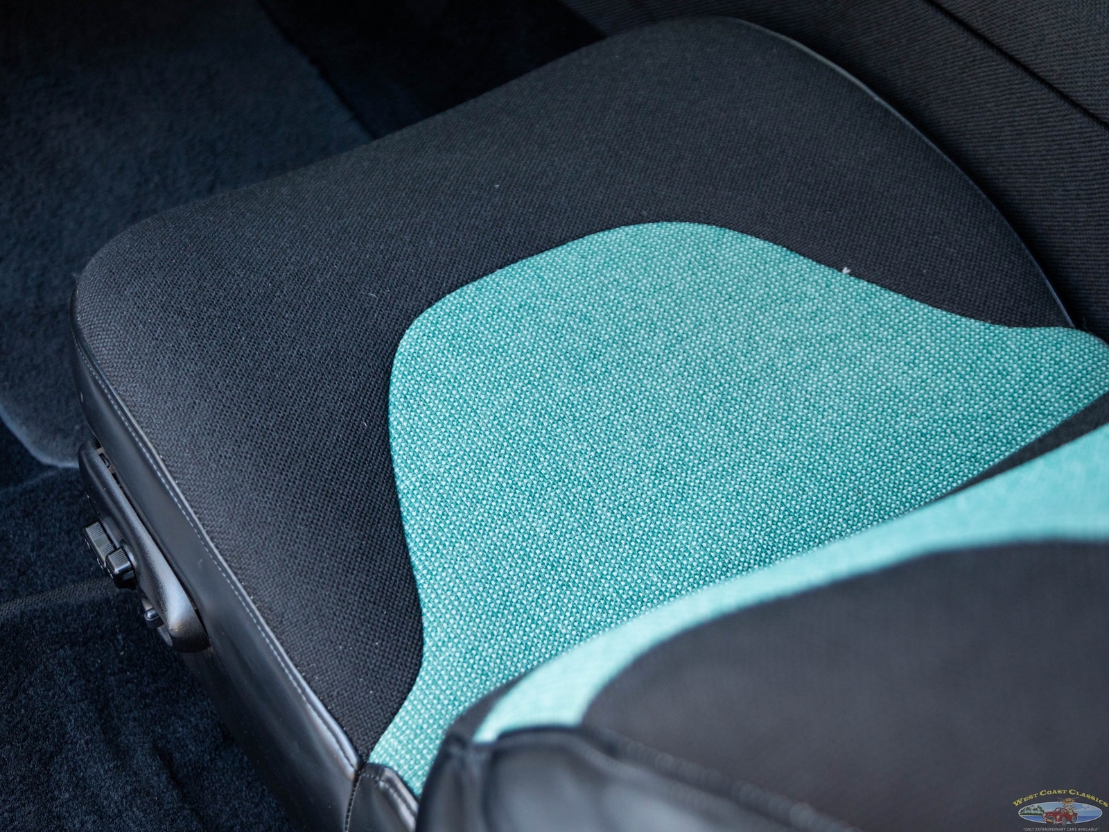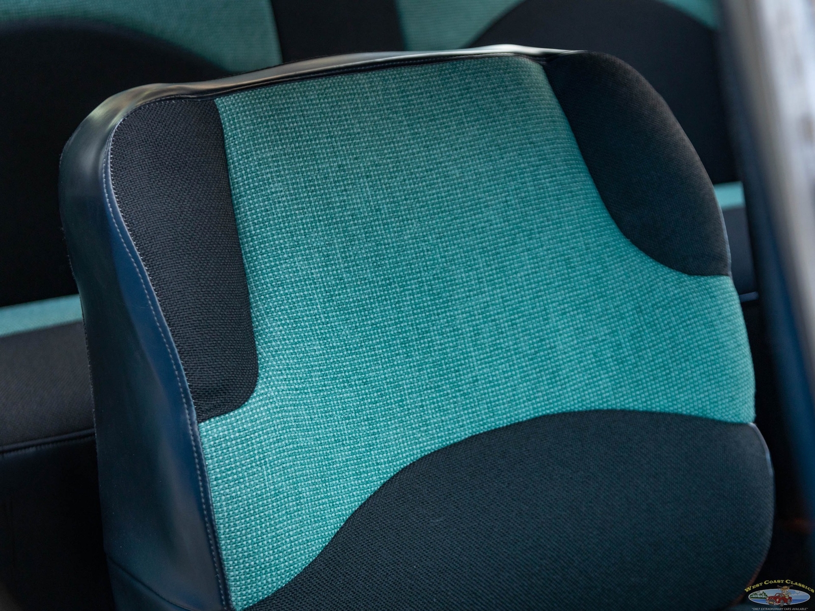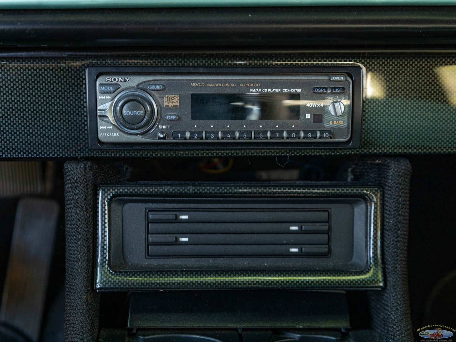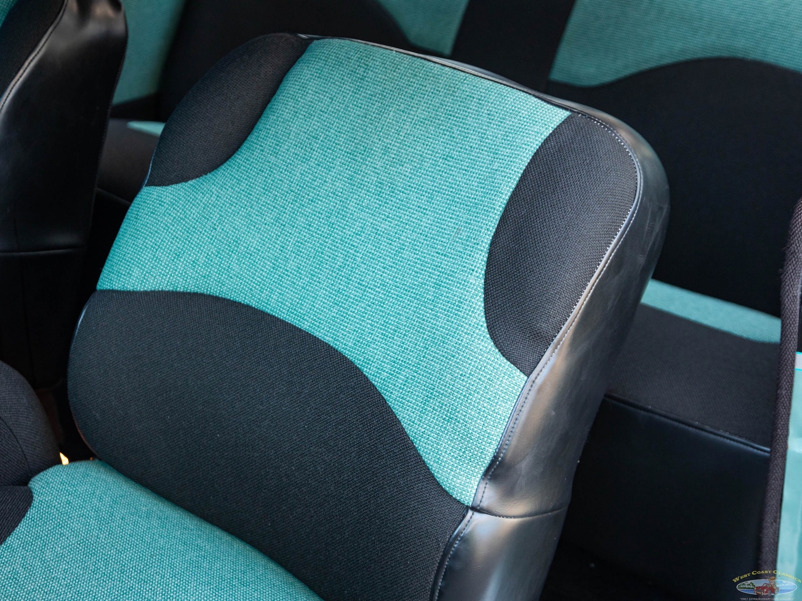 The interior features power-adjustable front bucket seats upholstered in Black tweed with Turquoise tweed insert and black vinyl side. Custom door panels are fitted to match with machined billet armrests and cranks for side and vent windows. A custom fabricated center console covered in black tweed with simulated carbon-fiber trim panel is mounted between the bucket seats, housing the CD changer, a pair of cupholders, and a storage box. The upgraded stereo system features a Sony CDX-C6750 head unit in the dash, 4 interior speakers along with dual Rockford Fosgate amplifiers, and a subwoofer fitted in the fully upholstered trunk.