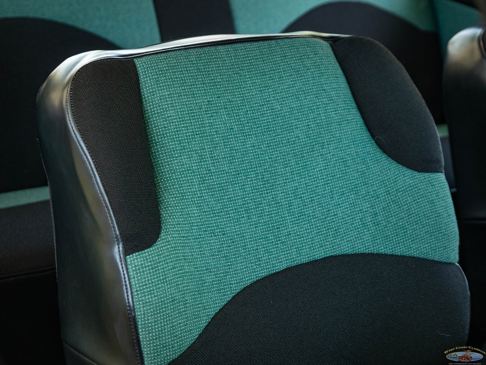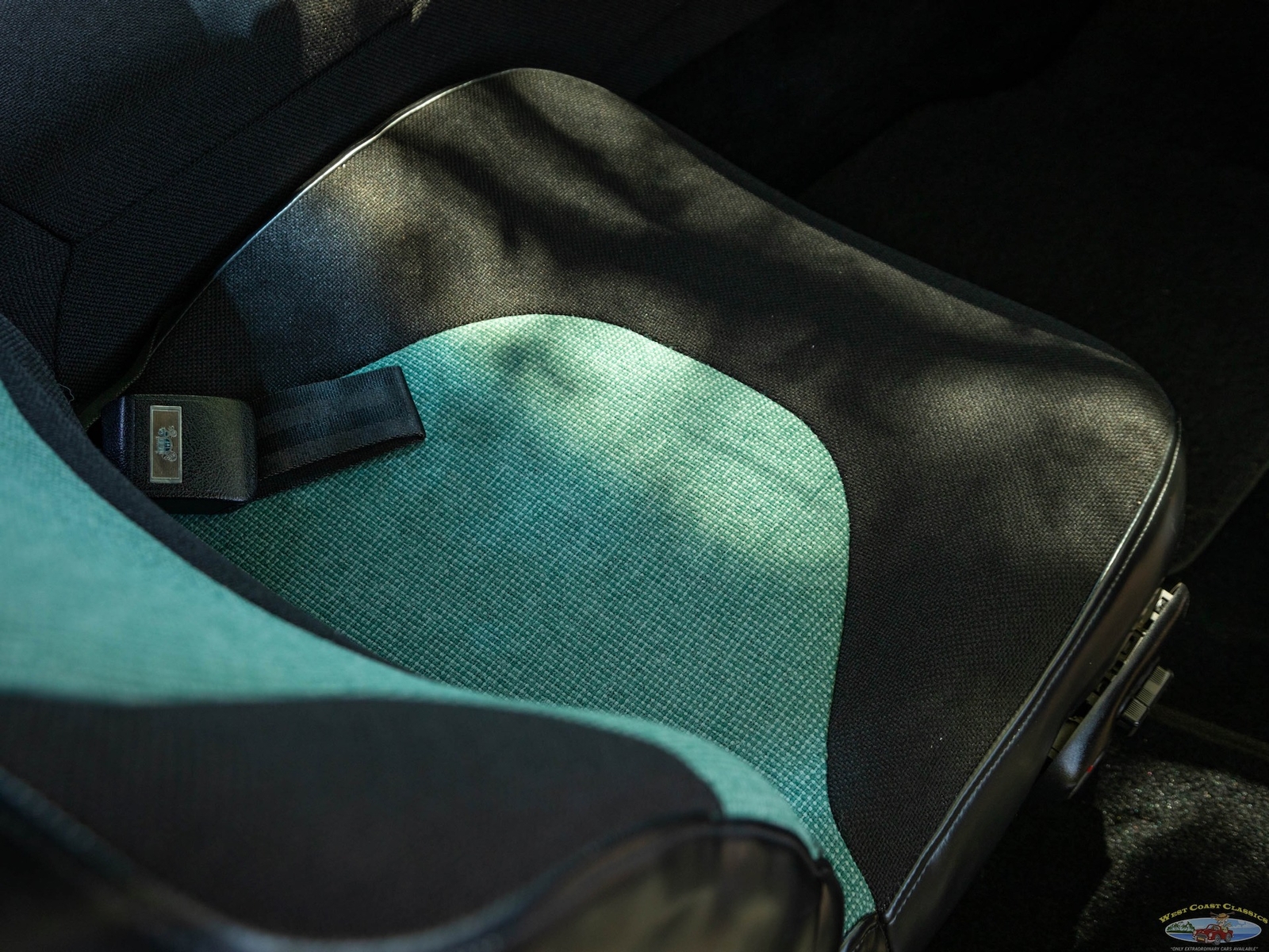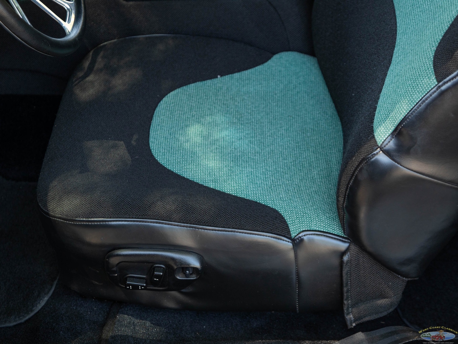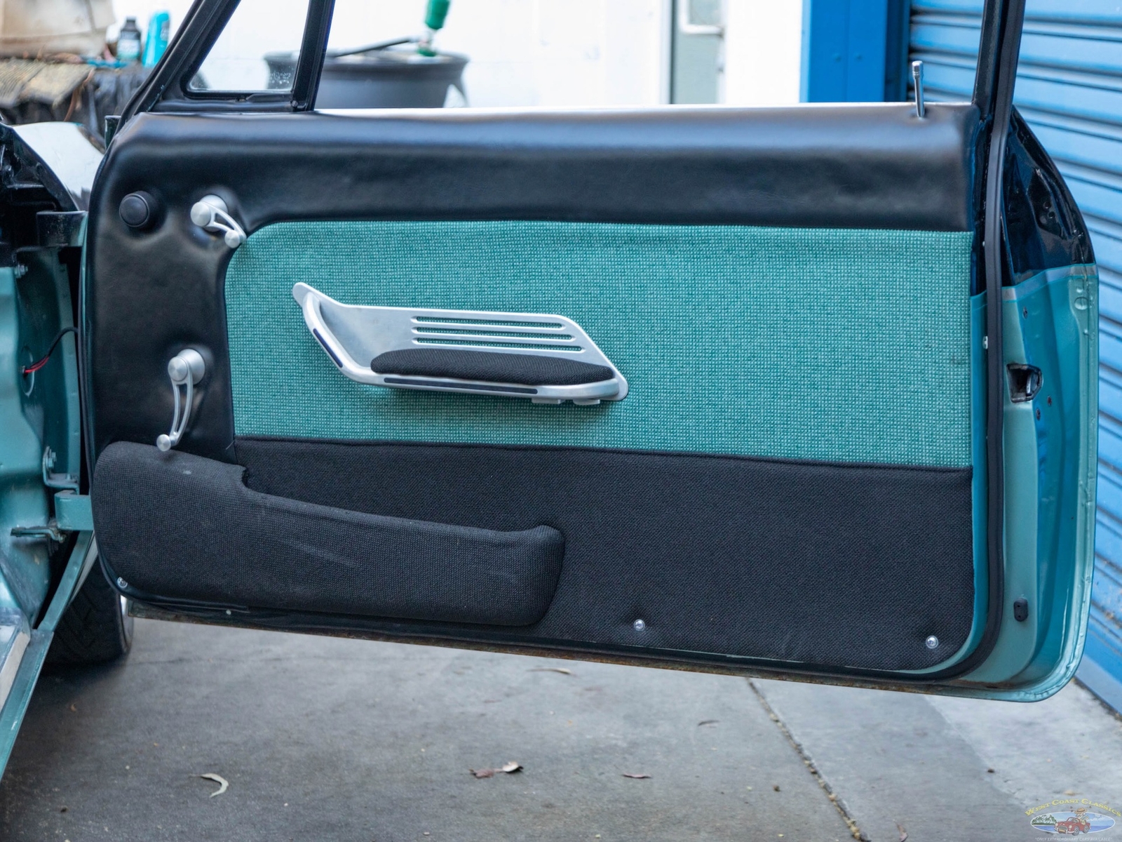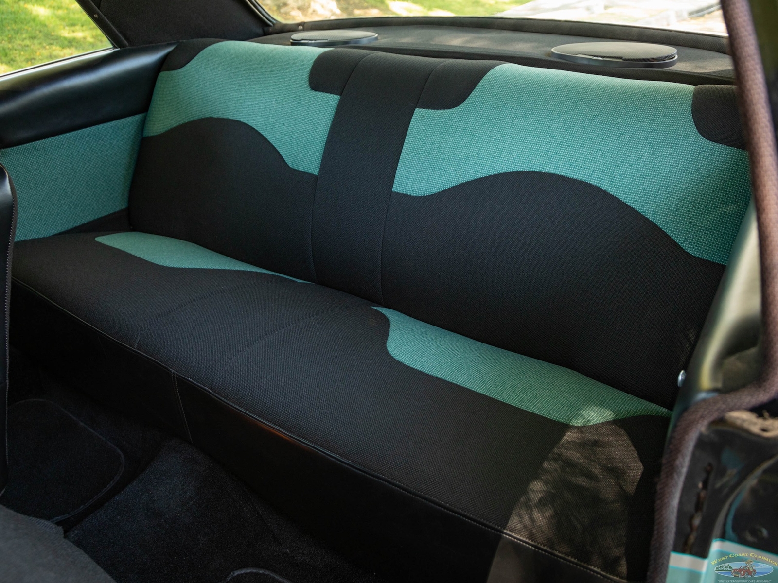The interior features power-adjustable front bucket seats upholstered in Black tweed with Turquoise tweed insert and black vinyl side. Custom door panels are fitted to match with machined billet armrests and cranks for side and vent windows. A custom fabricated center console covered in black tweed with simulated carbon-fiber trim panel is mounted between the bucket seats, housing the CD changer, a pair of cupholders, and a storage box. The upgraded stereo system features a Sony CDX-C6750 head unit in the dash, 4 interior speakers along with dual Rockford Fosgate amplifiers, and a subwoofer fitted in the fully upholstered trunk.