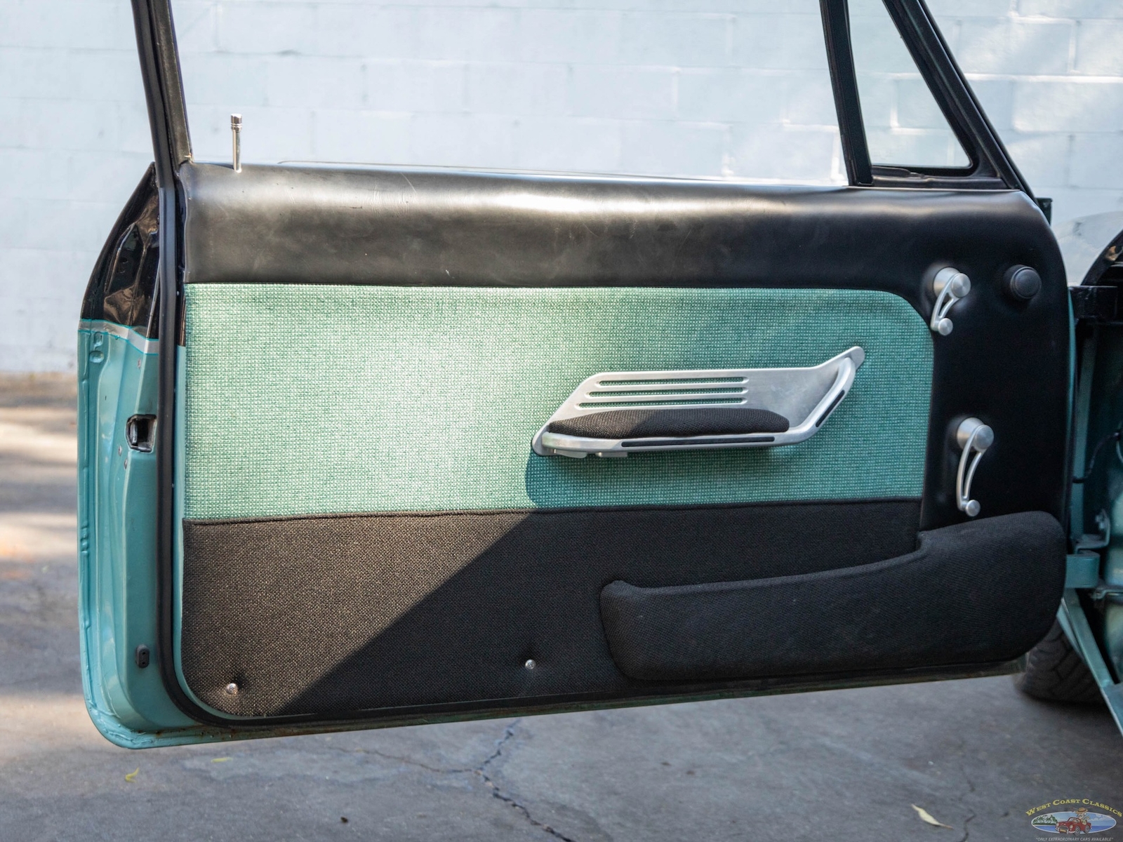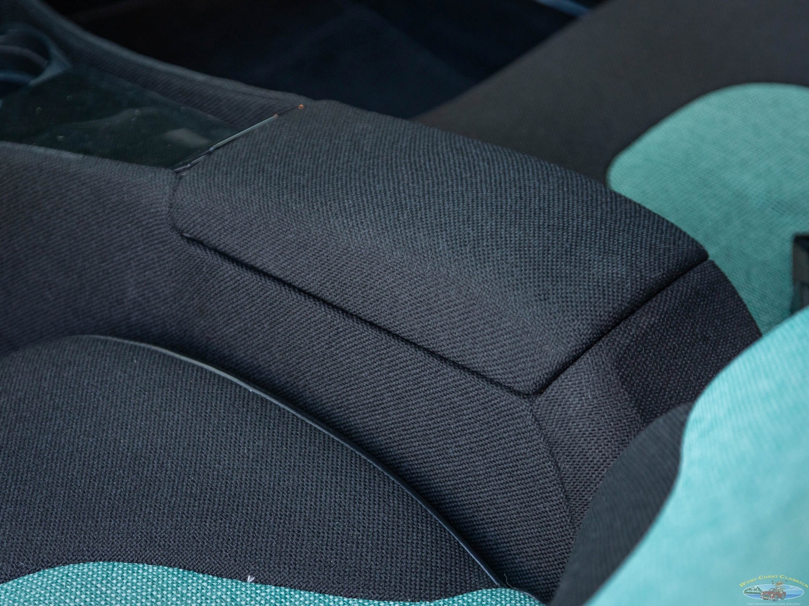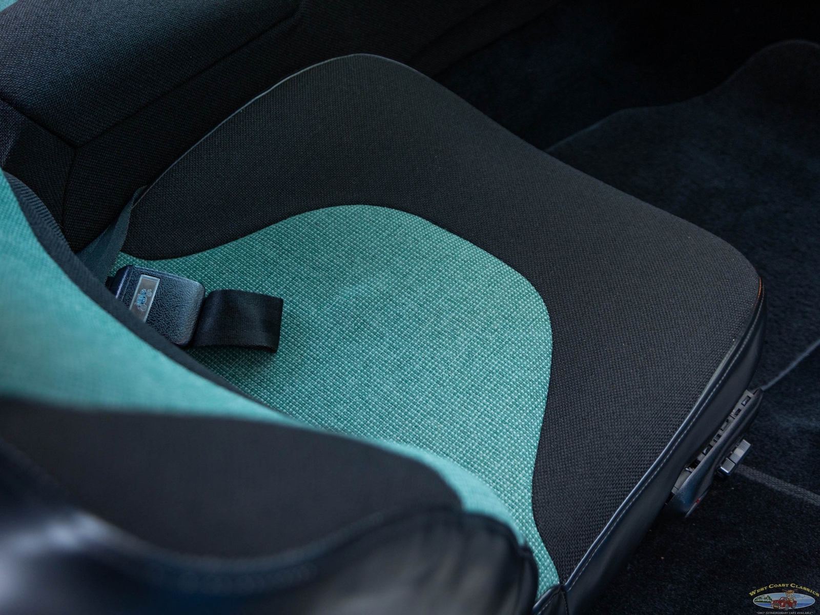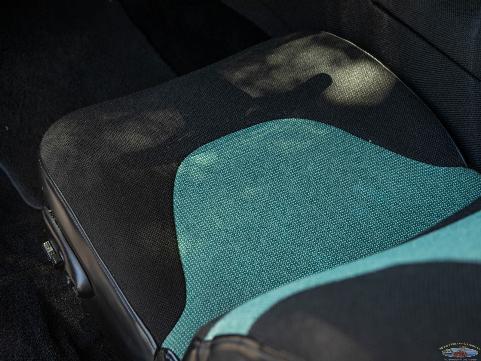 The interior features power-adjustable front bucket seats upholstered in Black tweed with Turquoise tweed insert and black vinyl side. Custom door panels are fitted to match with machined billet armrests and cranks for side and vent windows. A custom fabricated center console covered in black tweed with simulated carbon-fiber trim panel is mounted between the bucket seats, housing the CD changer, a pair of cupholders, and a storage box. The upgraded stereo system features a Sony CDX-C6750 head unit in the dash, 4 interior speakers along with dual Rockford Fosgate amplifiers, and a subwoofer fitted in the fully upholstered trunk.