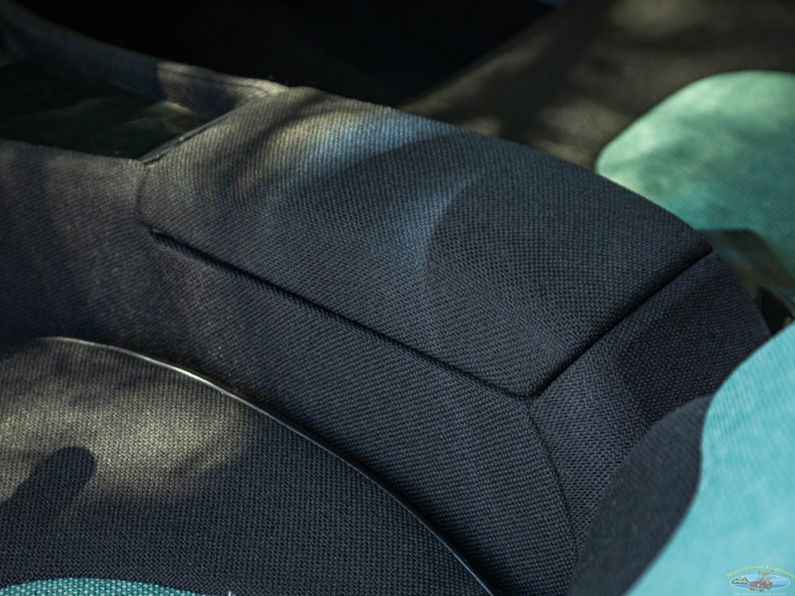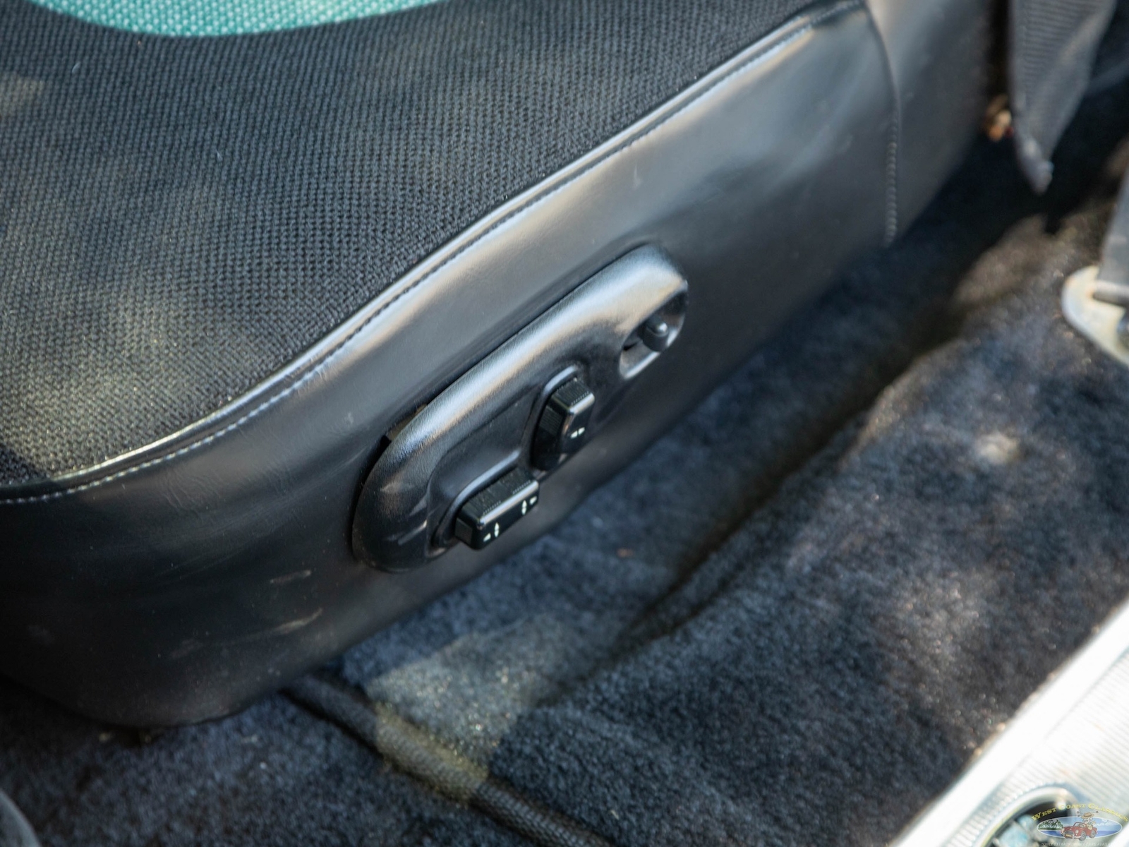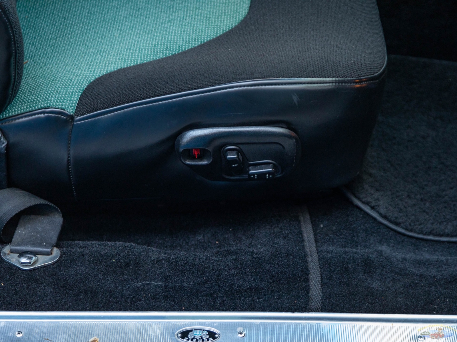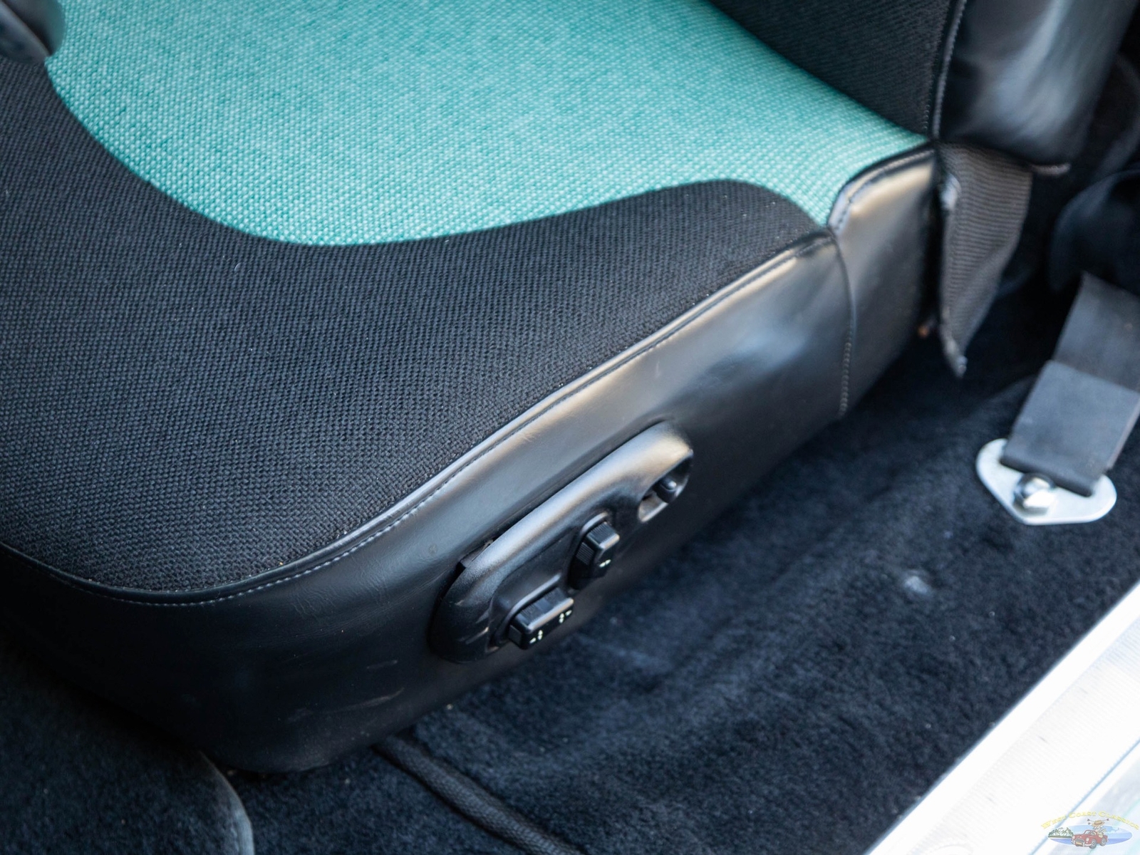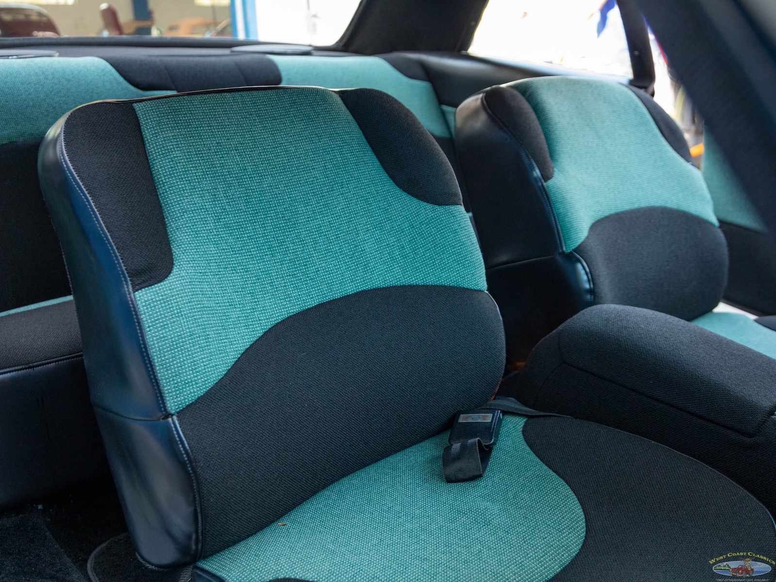 The interior features power-adjustable front bucket seats upholstered in Black tweed with Turquoise tweed insert and black vinyl side. Custom door panels are fitted to match with machined billet armrests and cranks for side and vent windows. A custom fabricated center console covered in black tweed with simulated carbon-fiber trim panel is mounted between the bucket seats, housing the CD changer, a pair of cupholders, and a storage box. The upgraded stereo system features a Sony CDX-C6750 head unit in the dash, 4 interior speakers along with dual Rockford Fosgate amplifiers, and a subwoofer fitted in the fully upholstered trunk.