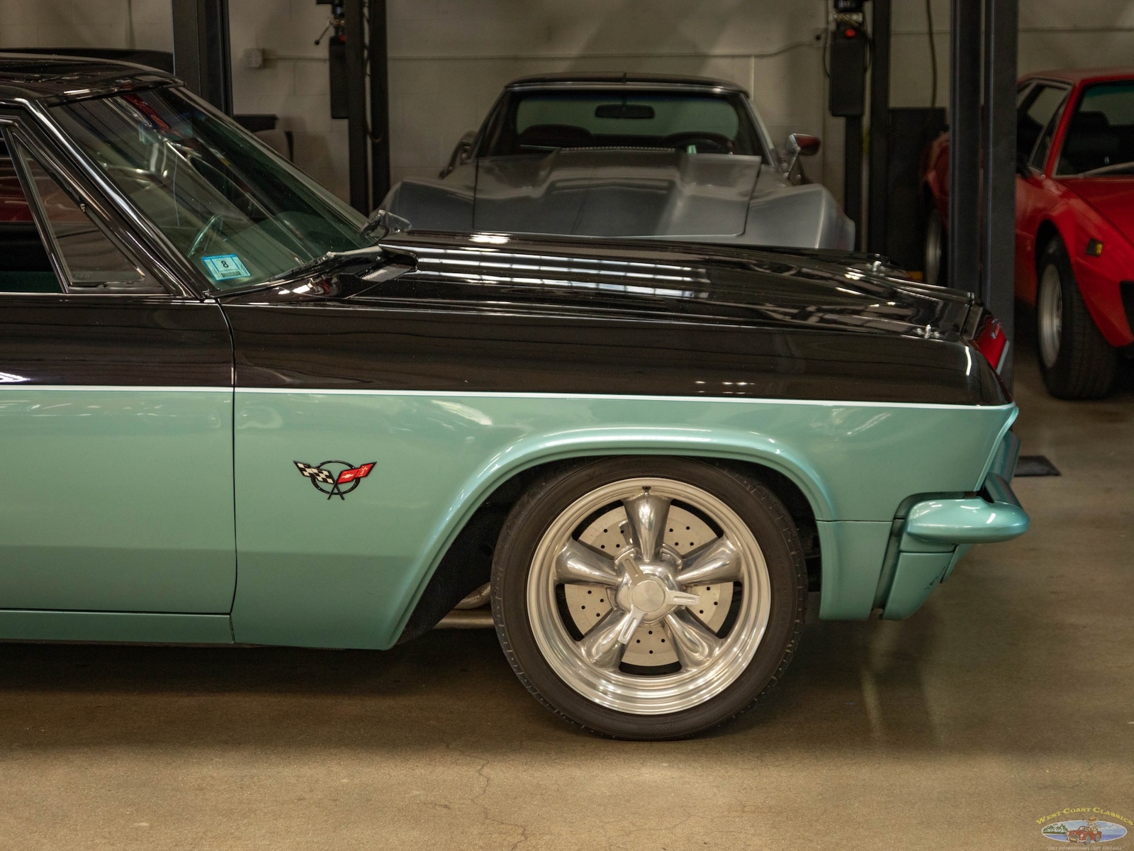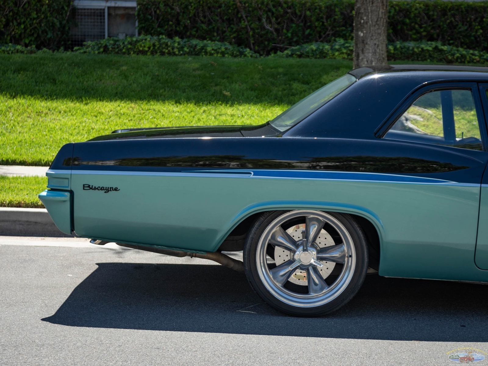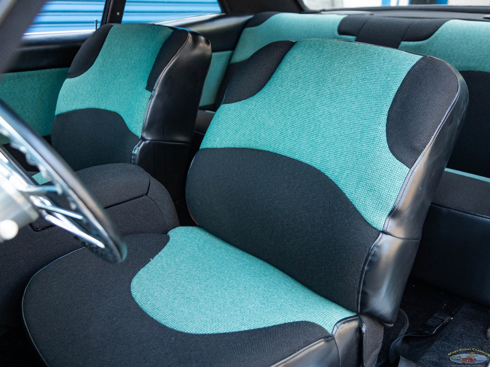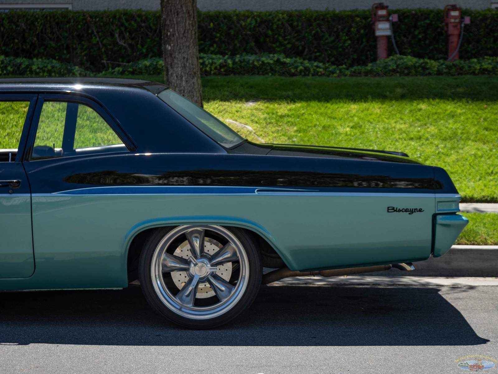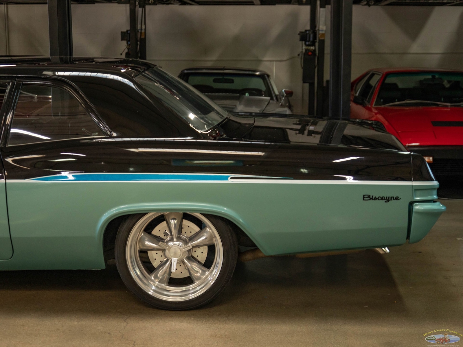 The body of the Biscayne is finished in a custom two-tone scheme featuring Black on the roof and upper half of the body with Turquoise on the lower half. A Silver horizontal stripe runs around the car to divide the two colors with Blue scallops on the rear quarters. To match the body, both bumpers and the grille have been refinished in Turquoise, while all the badging, window trim and chrome have been refinished in Black. Panel fitment and gaps are uniform across doors, panels, trunk and fiberglass hood. Additional features include a raised hood center section with imitation cowl induction scoop, hood pins, and Corvette flag emblems on the fenders.