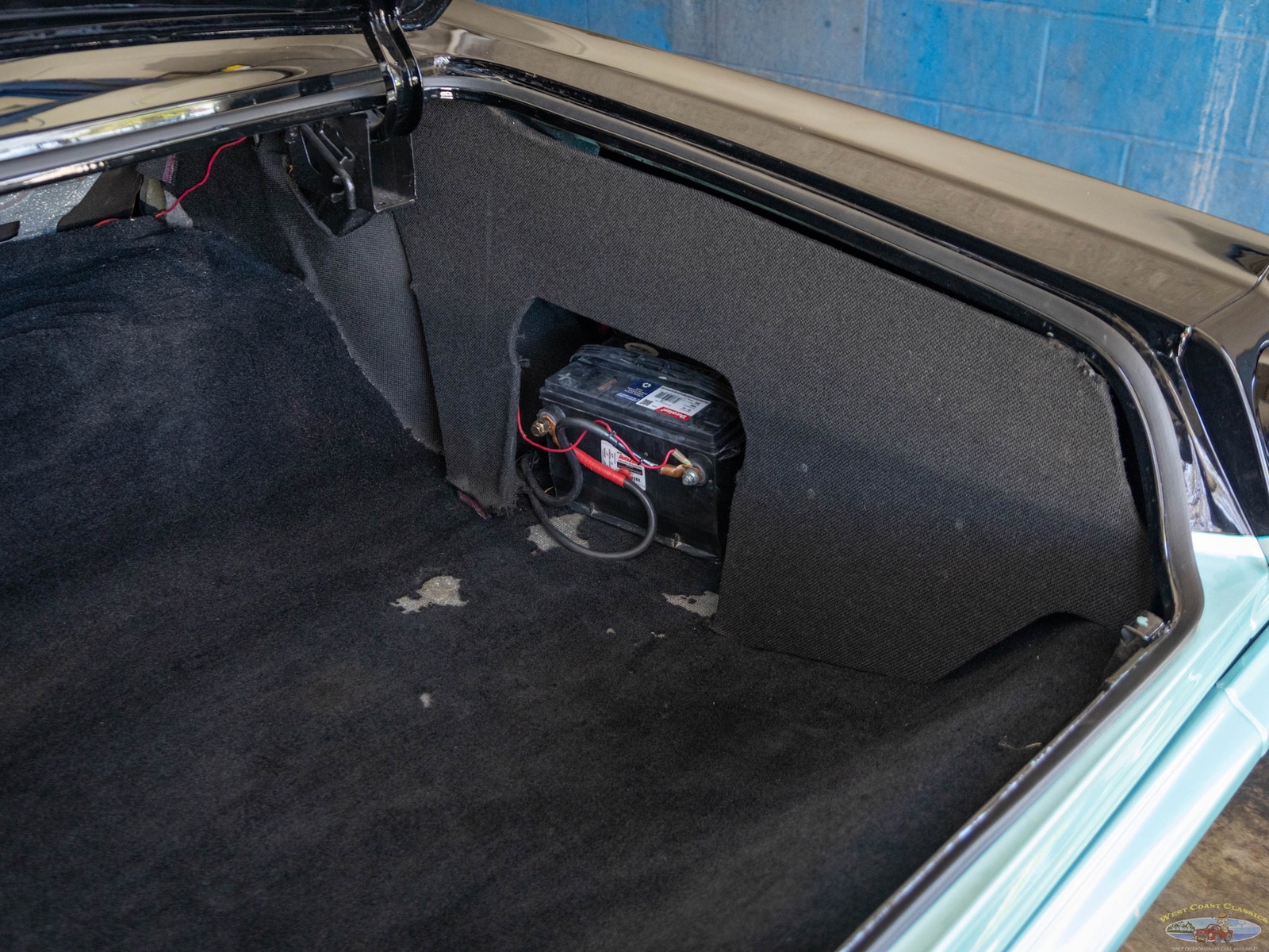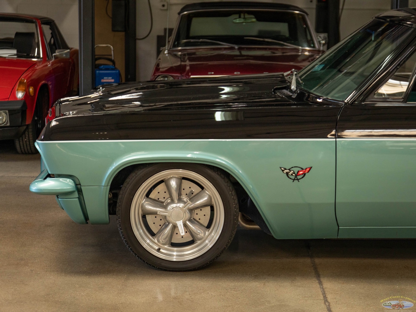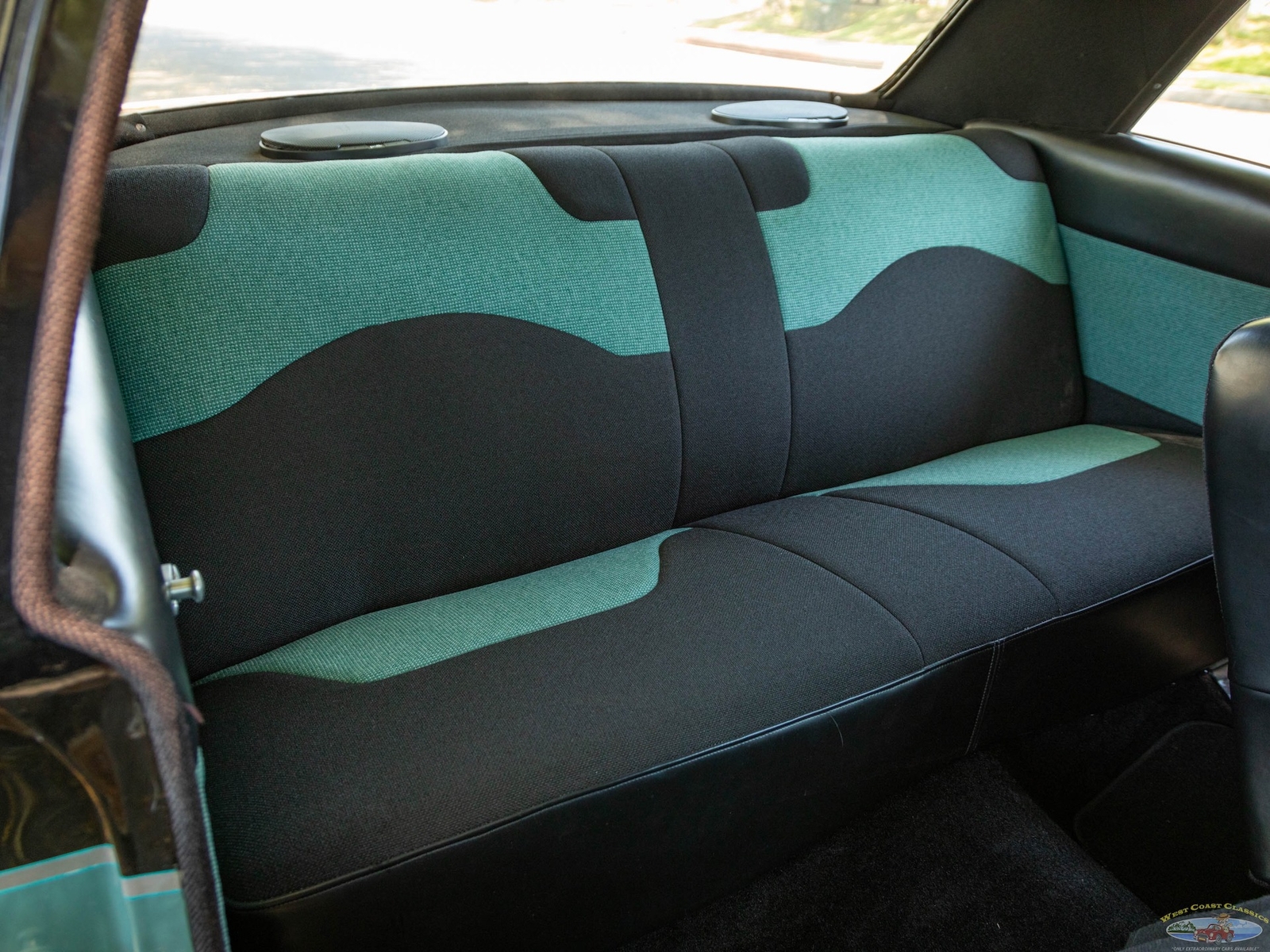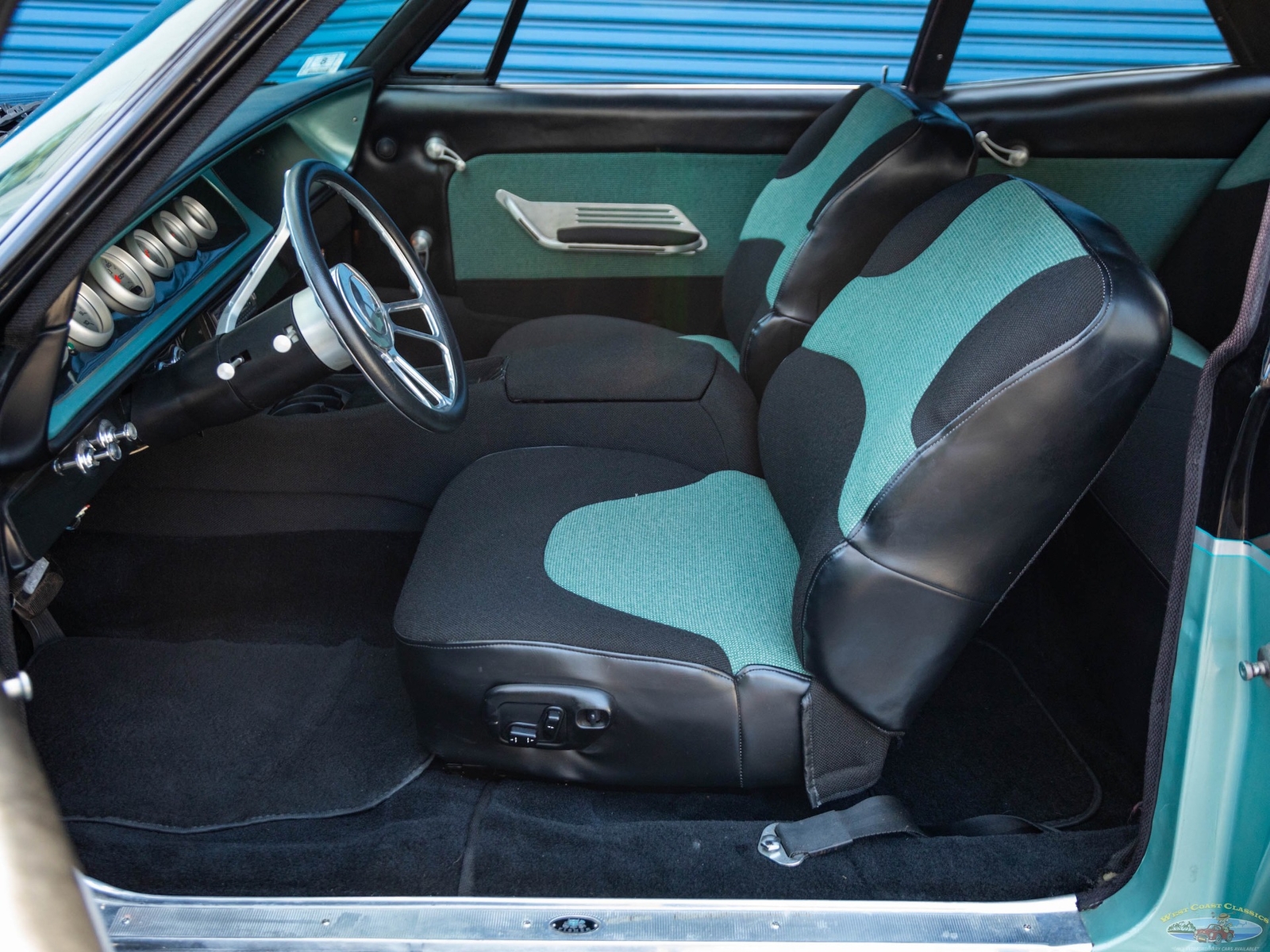 The body of the Biscayne is finished in a custom two-tone scheme featuring Black on the roof and upper half of the body with Turquoise on the lower half. A Silver horizontal stripe runs around the car to divide the two colors with Blue scallops on the rear quarters. To match the body, both bumpers and the grille have been refinished in Turquoise, while all the badging, window trim and chrome have been refinished in Black. Panel fitment and gaps are uniform across doors, panels, trunk and fiberglass hood. Additional features include a raised hood center section with imitation cowl induction scoop, hood pins, and Corvette flag emblems on the fenders.