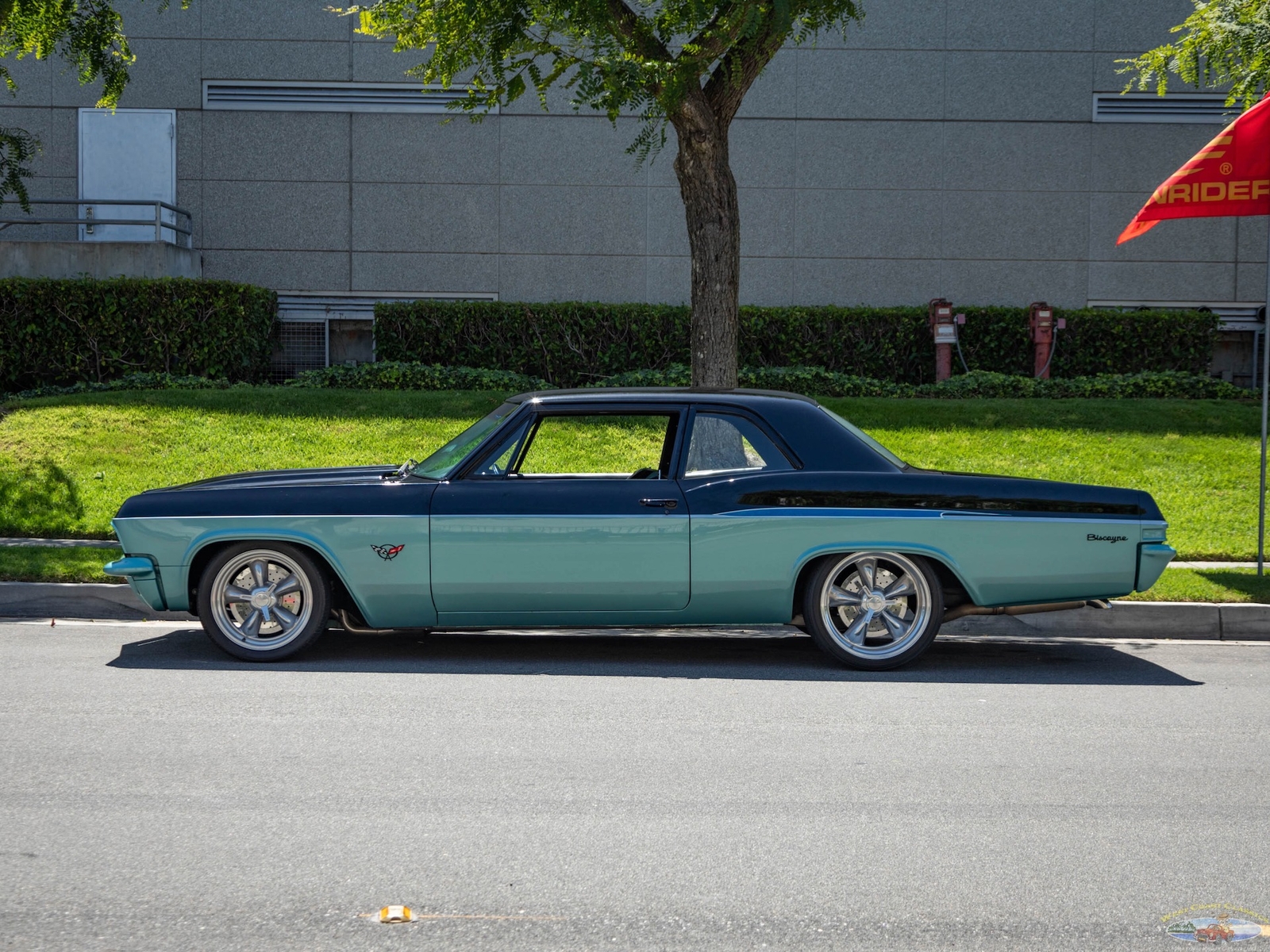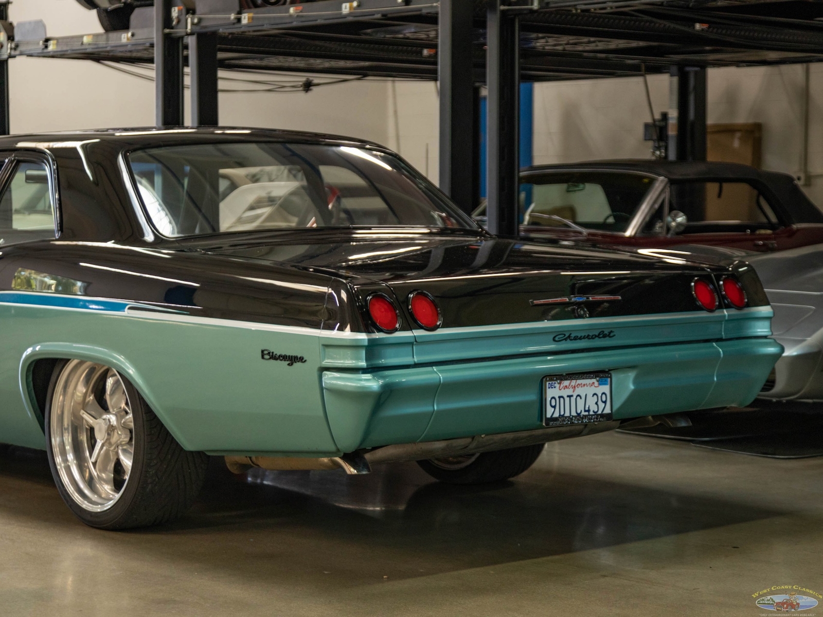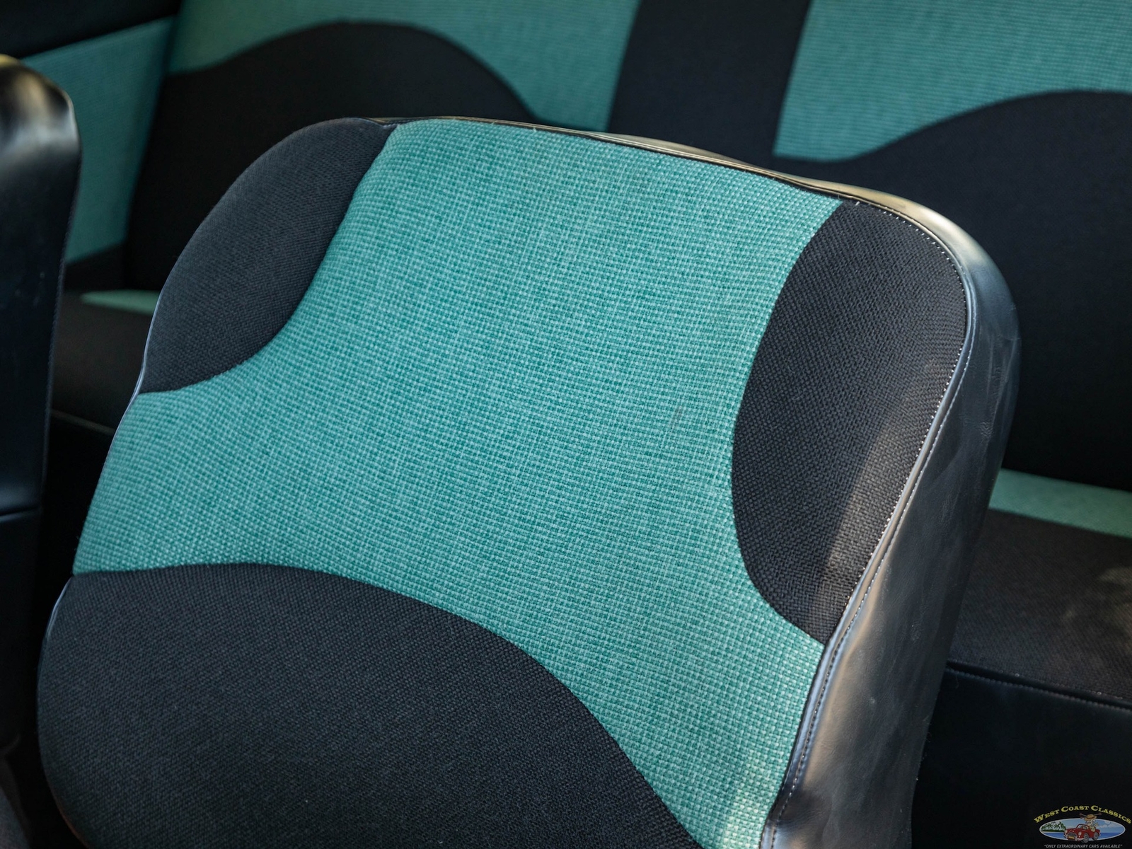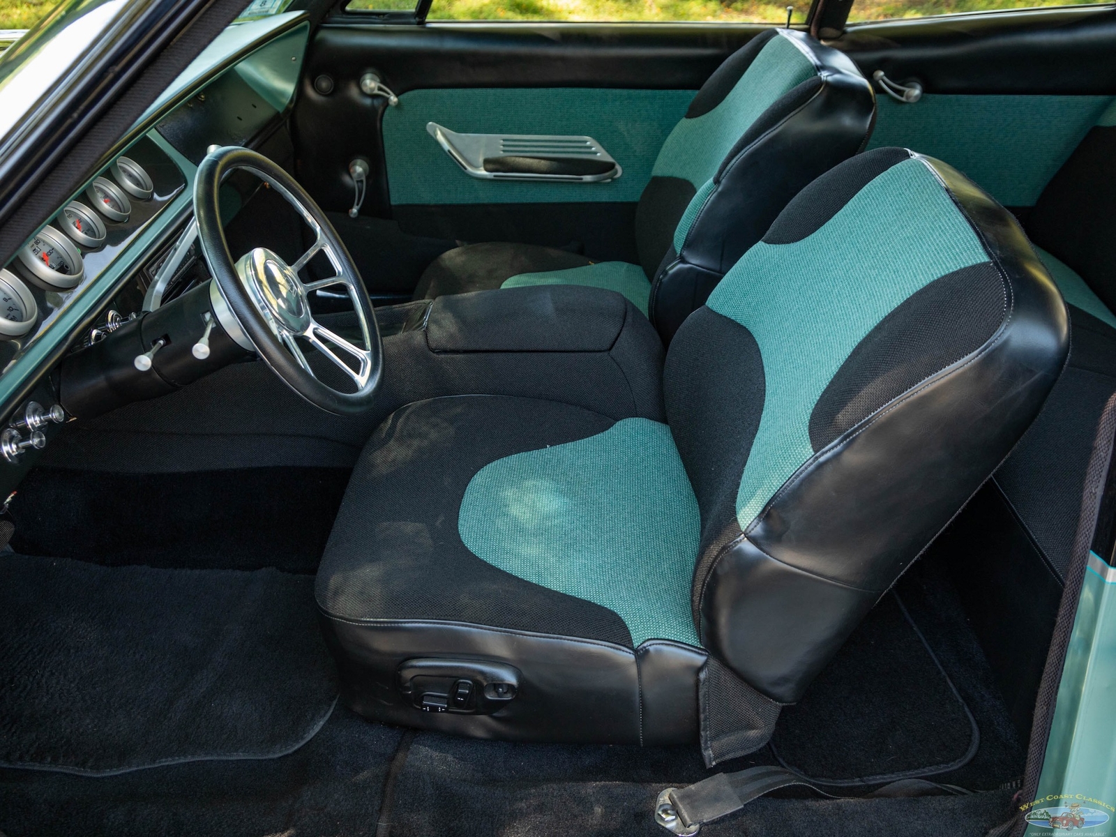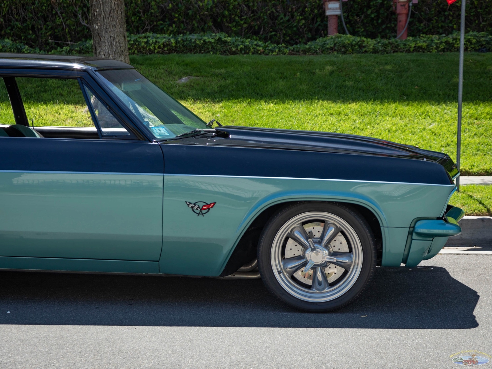 The body of the Biscayne is finished in a custom two-tone scheme featuring Black on the roof and upper half of the body with Turquoise on the lower half. A Silver horizontal stripe runs around the car to divide the two colors with Blue scallops on the rear quarters. To match the body, both bumpers and the grille have been refinished in Turquoise, while all the badging, window trim and chrome have been refinished in Black. Panel fitment and gaps are uniform across doors, panels, trunk and fiberglass hood. Additional features include a raised hood center section with imitation cowl induction scoop, hood pins, and Corvette flag emblems on the fenders.