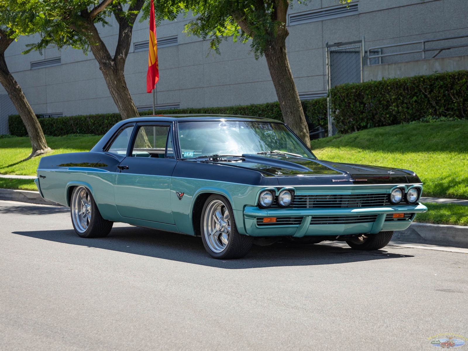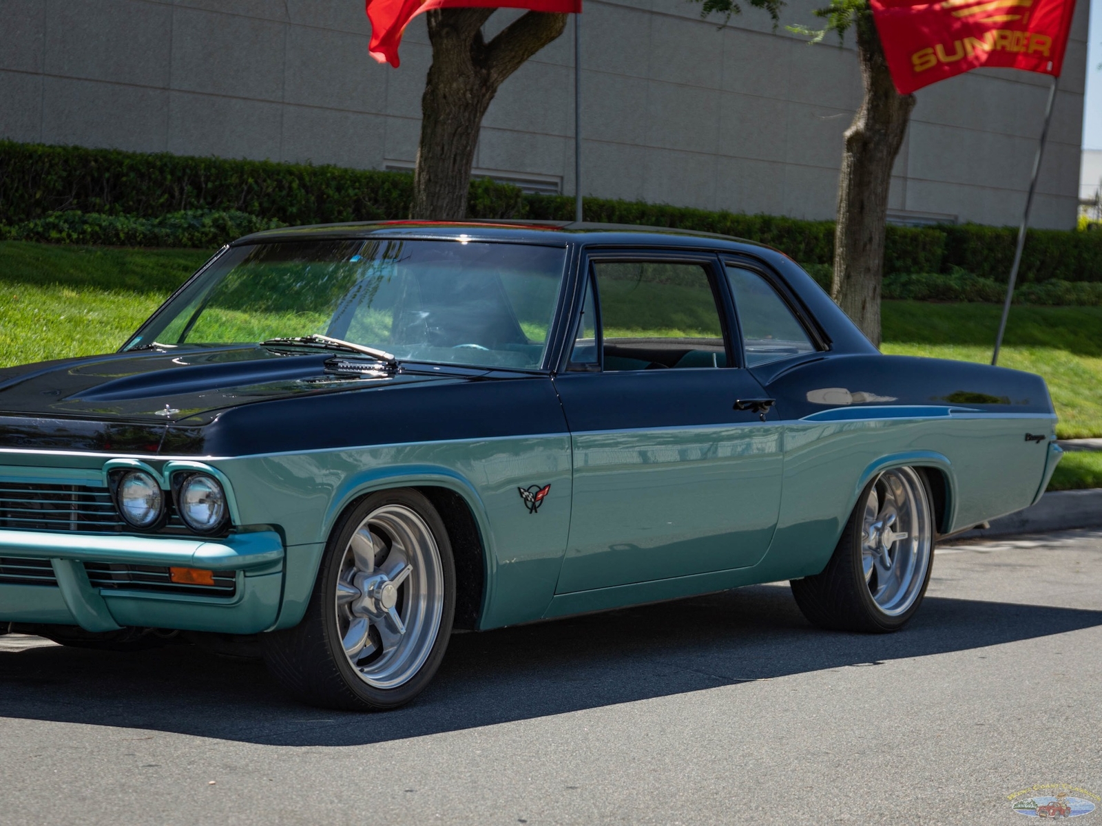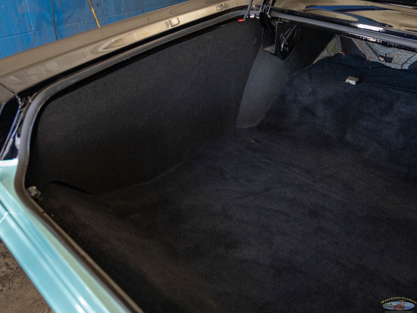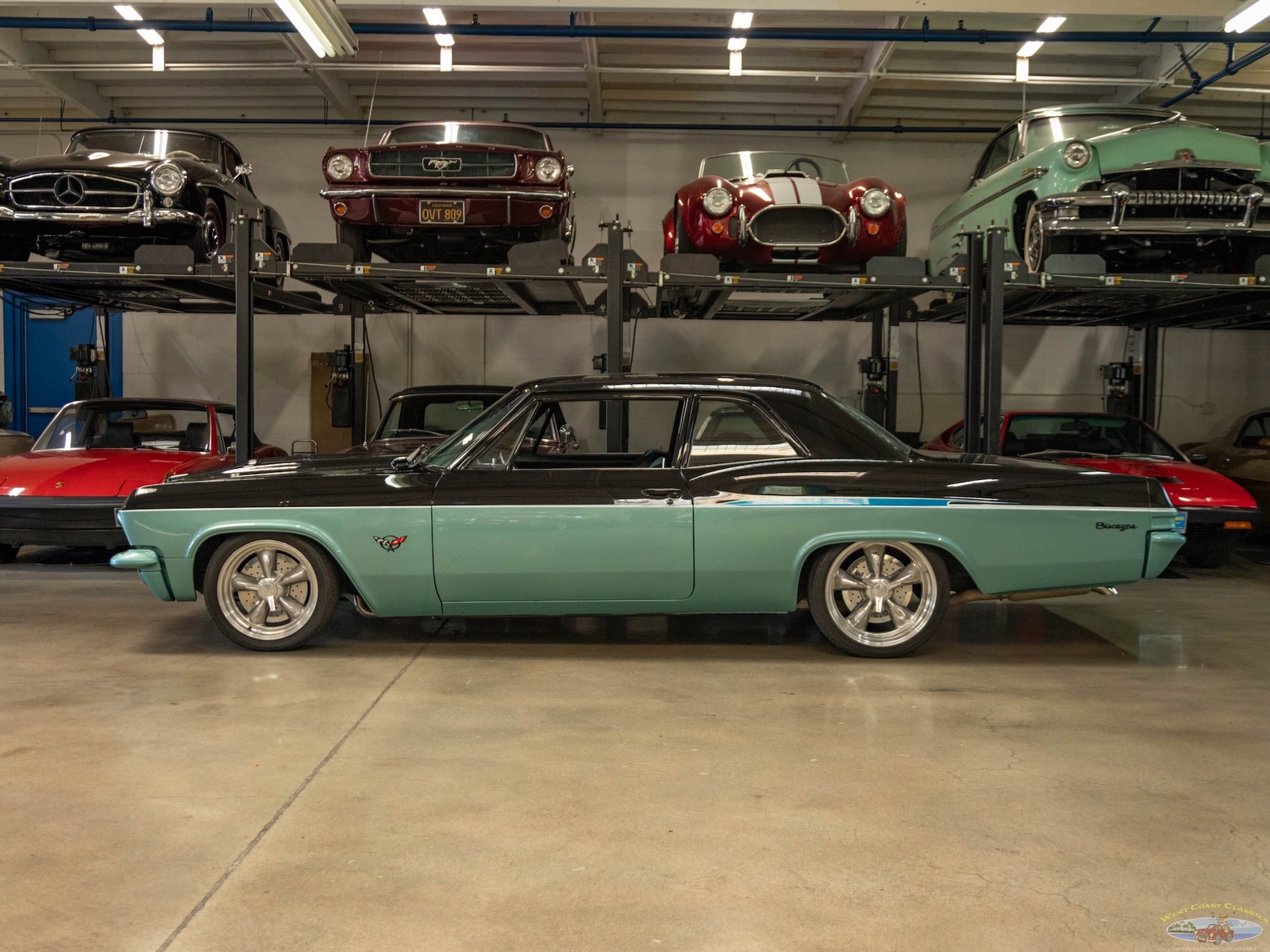 The body of the Biscayne is finished in a custom two-tone scheme featuring Black on the roof and upper half of the body with Turquoise on the lower half. A Silver horizontal stripe runs around the car to divide the two colors with Blue scallops on the rear quarters. To match the body, both bumpers and the grille have been refinished in Turquoise, while all the badging, window trim and chrome have been refinished in Black. Panel fitment and gaps are uniform across doors, panels, trunk and fiberglass hood. Additional features include a raised hood center section with imitation cowl induction scoop, hood pins, and Corvette flag emblems on the fenders.