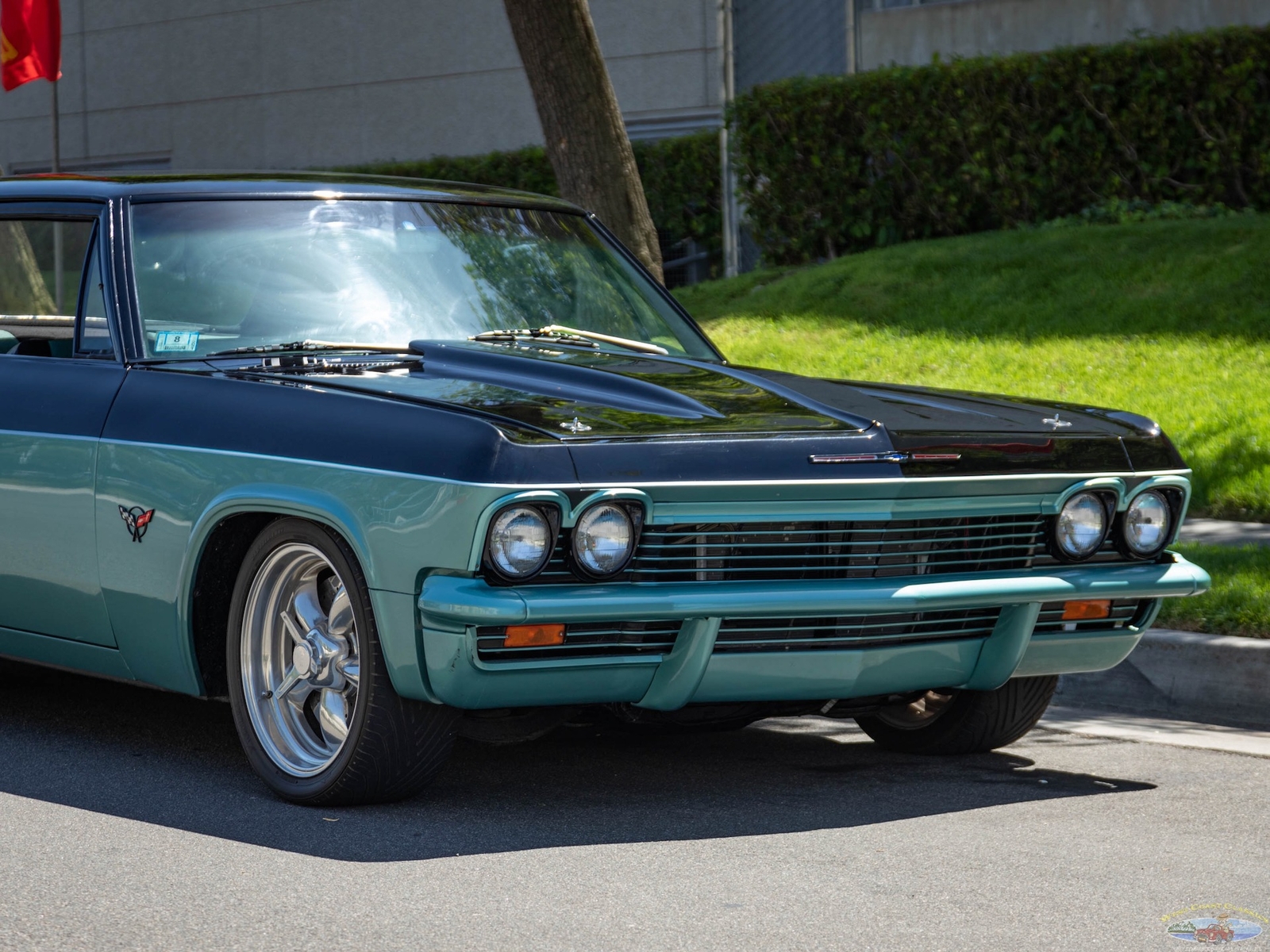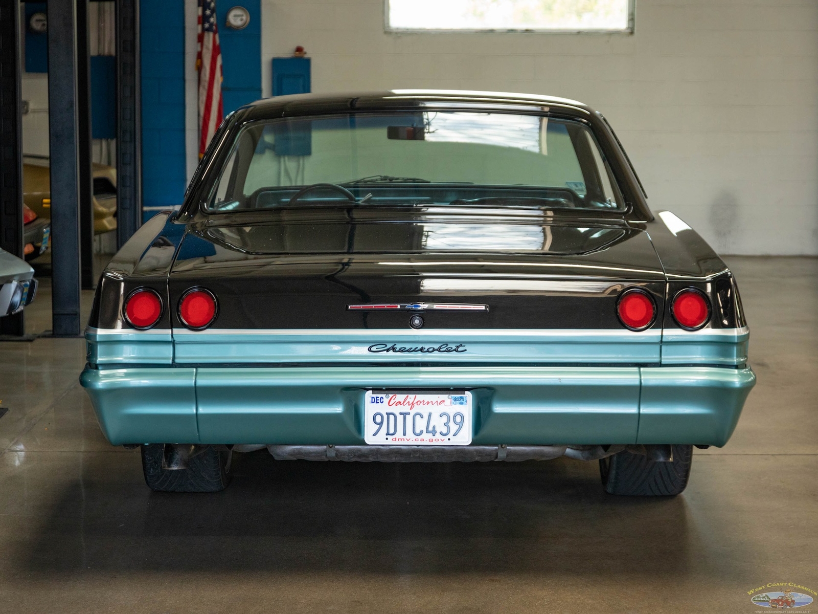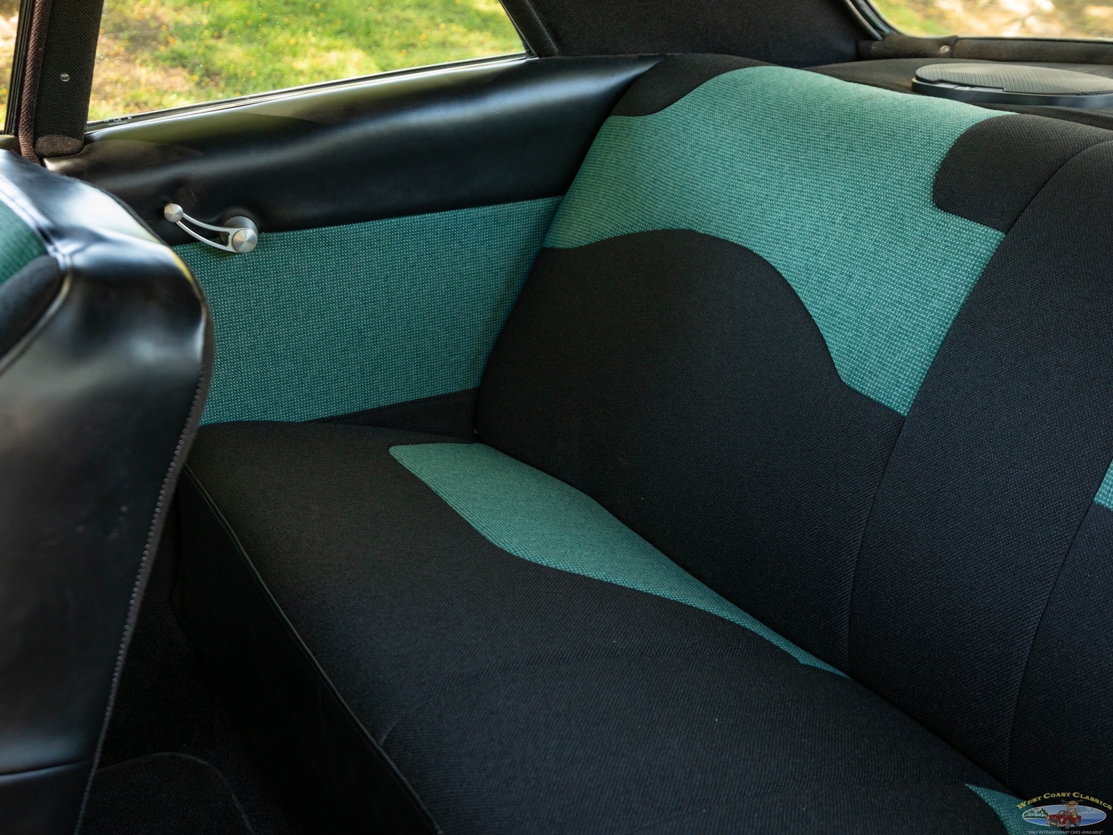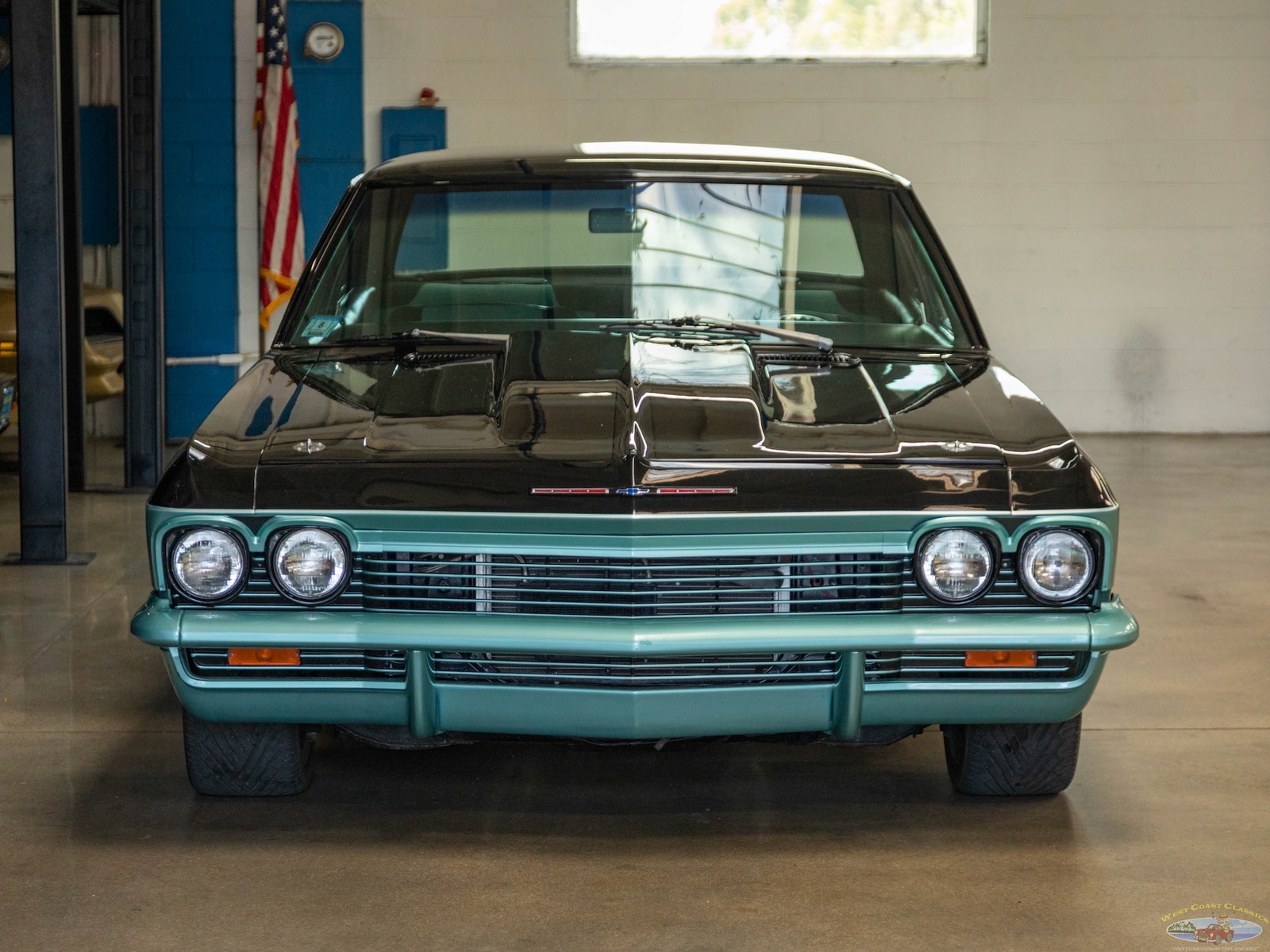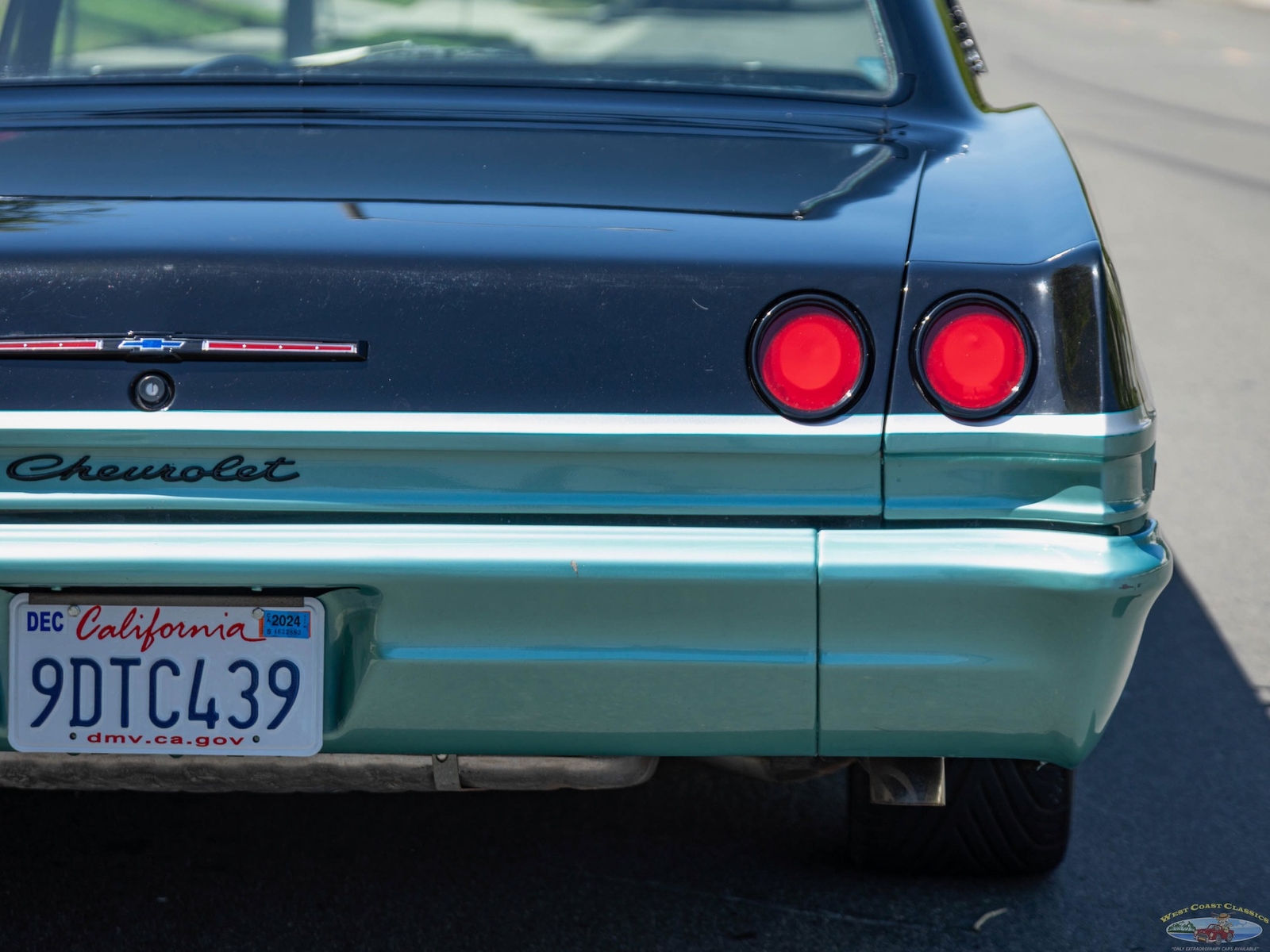 The body of the Biscayne is finished in a custom two-tone scheme featuring Black on the roof and upper half of the body with Turquoise on the lower half. A Silver horizontal stripe runs around the car to divide the two colors with Blue scallops on the rear quarters. To match the body, both bumpers and the grille have been refinished in Turquoise, while all the badging, window trim and chrome have been refinished in Black. Panel fitment and gaps are uniform across doors, panels, trunk and fiberglass hood. Additional features include a raised hood center section with imitation cowl induction scoop, hood pins, and Corvette flag emblems on the fenders.