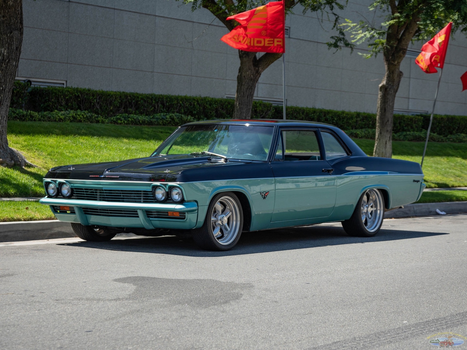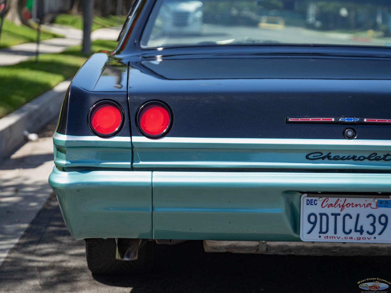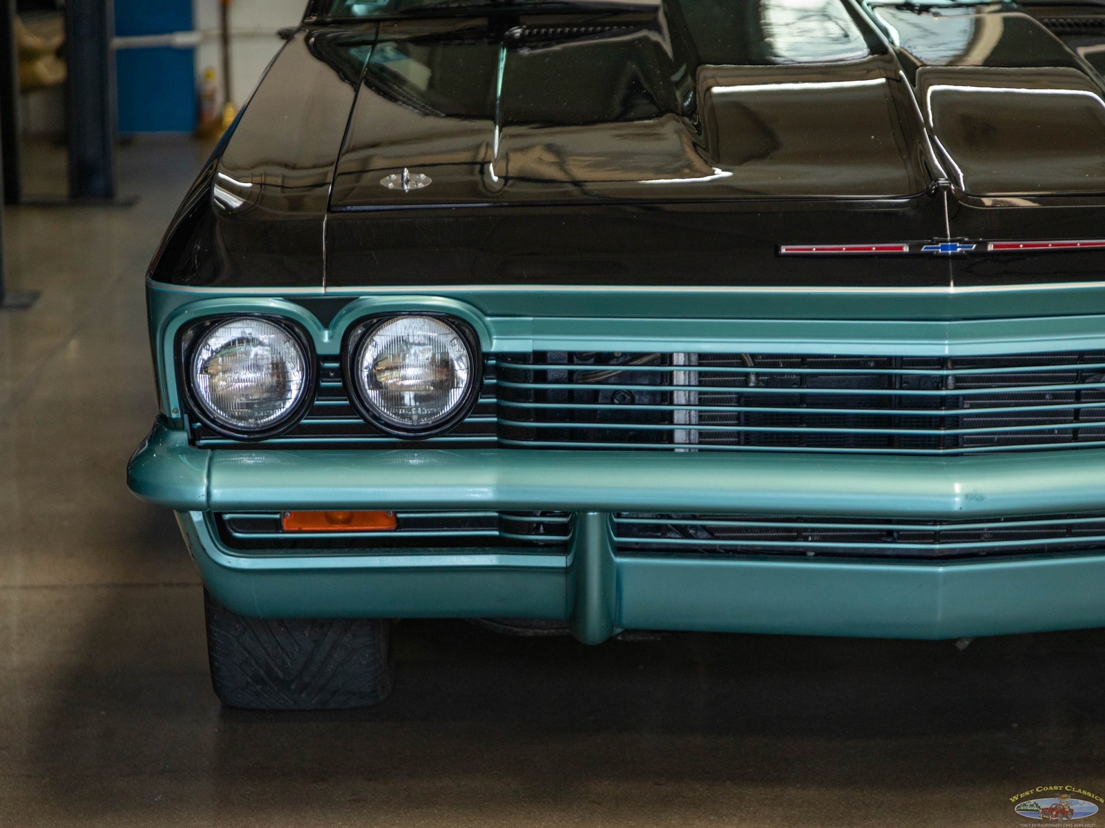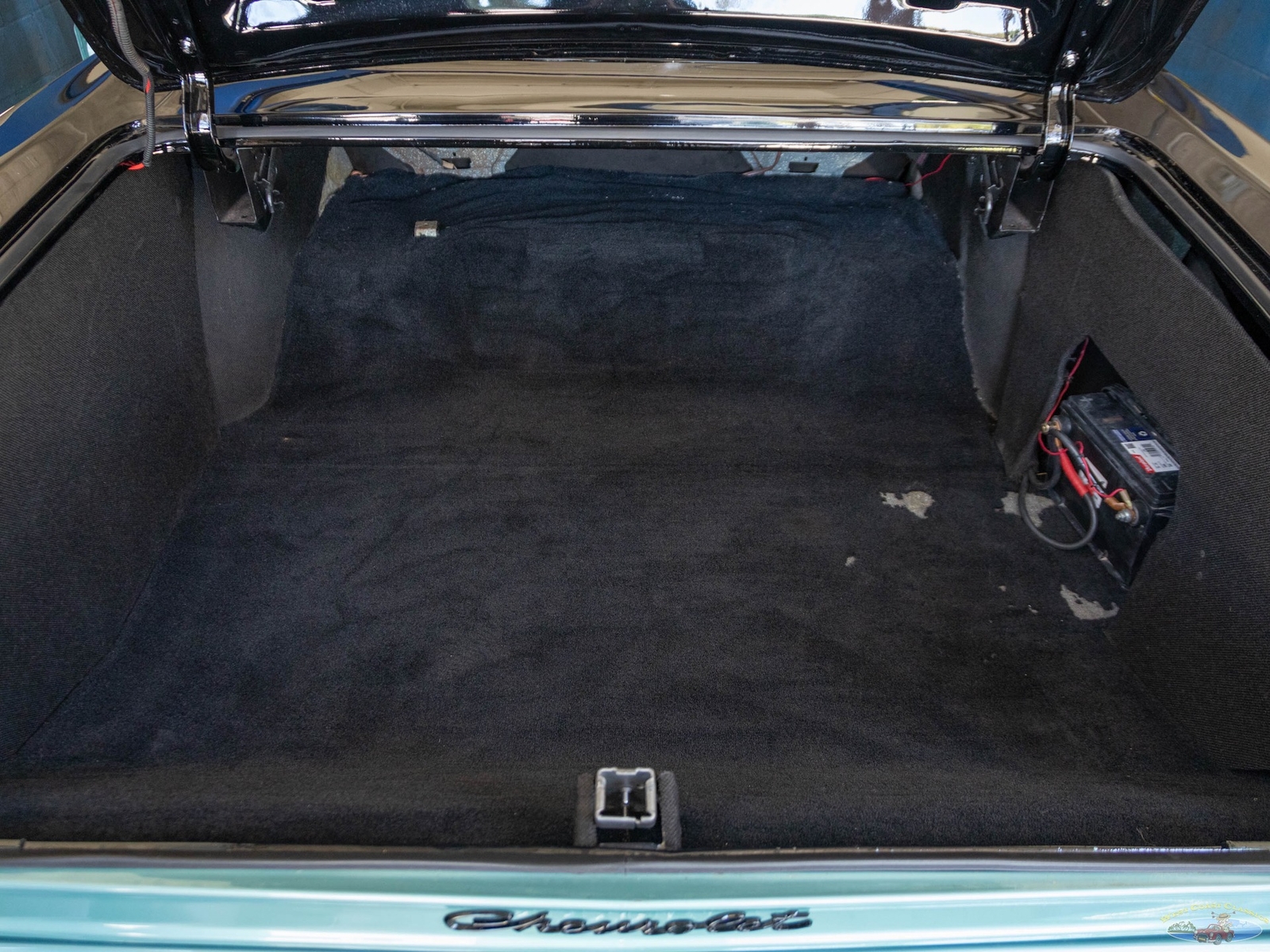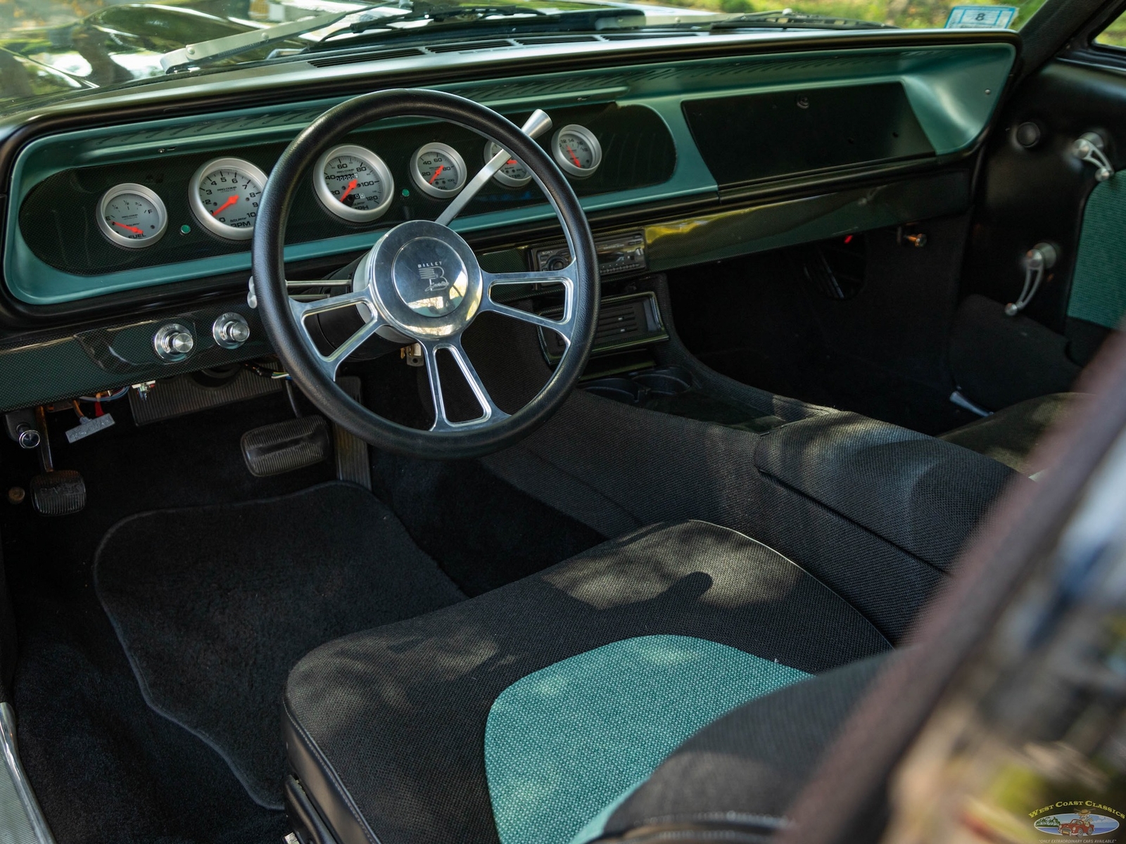 The body of the Biscayne is finished in a custom two-tone scheme featuring Black on the roof and upper half of the body with Turquoise on the lower half. A Silver horizontal stripe runs around the car to divide the two colors with Blue scallops on the rear quarters. To match the body, both bumpers and the grille have been refinished in Turquoise, while all the badging, window trim and chrome have been refinished in Black. Panel fitment and gaps are uniform across doors, panels, trunk and fiberglass hood. Additional features include a raised hood center section with imitation cowl induction scoop, hood pins, and Corvette flag emblems on the fenders.