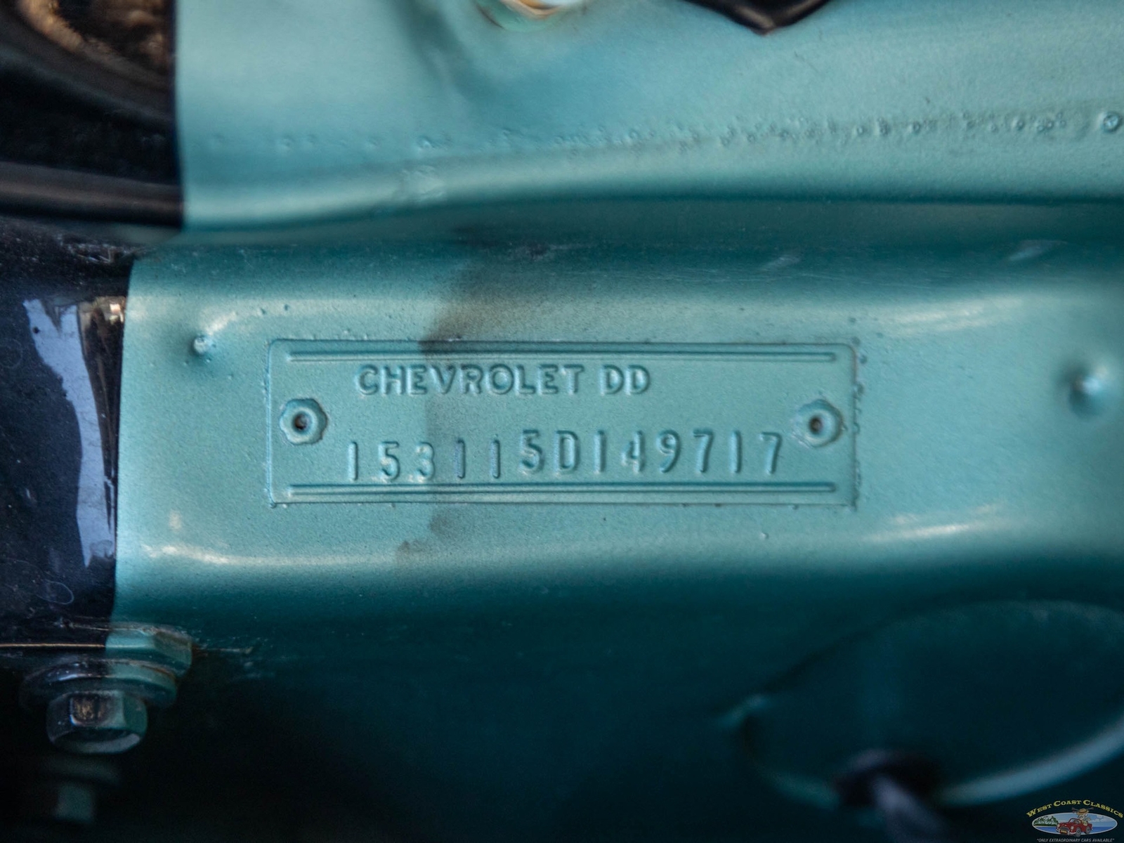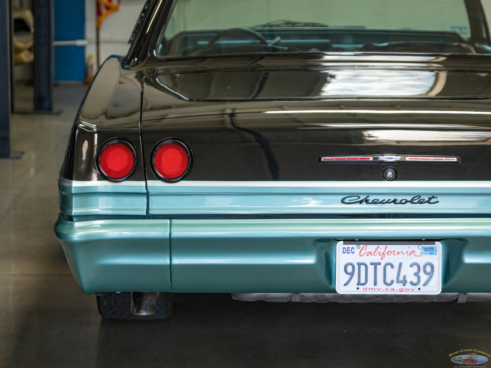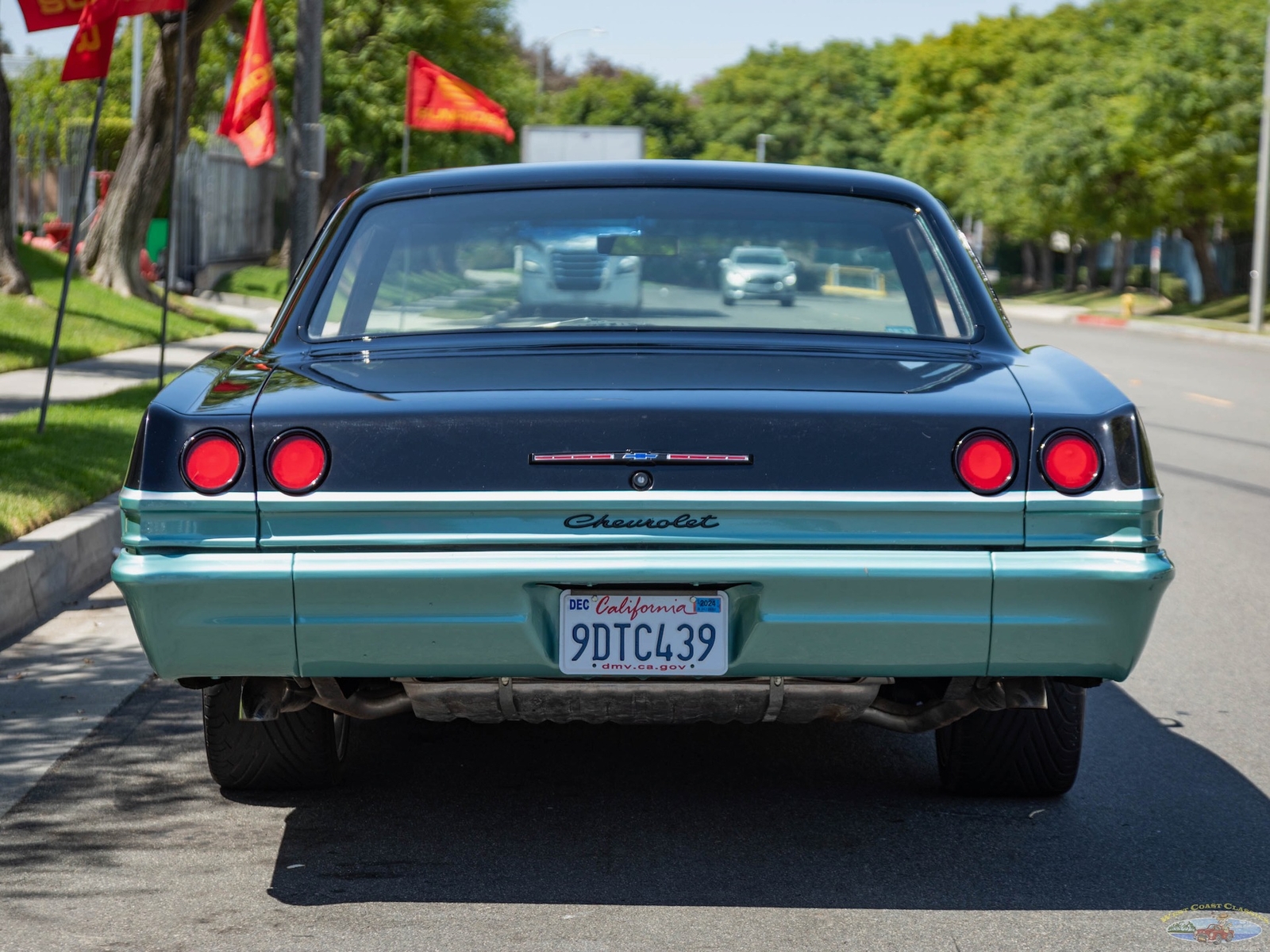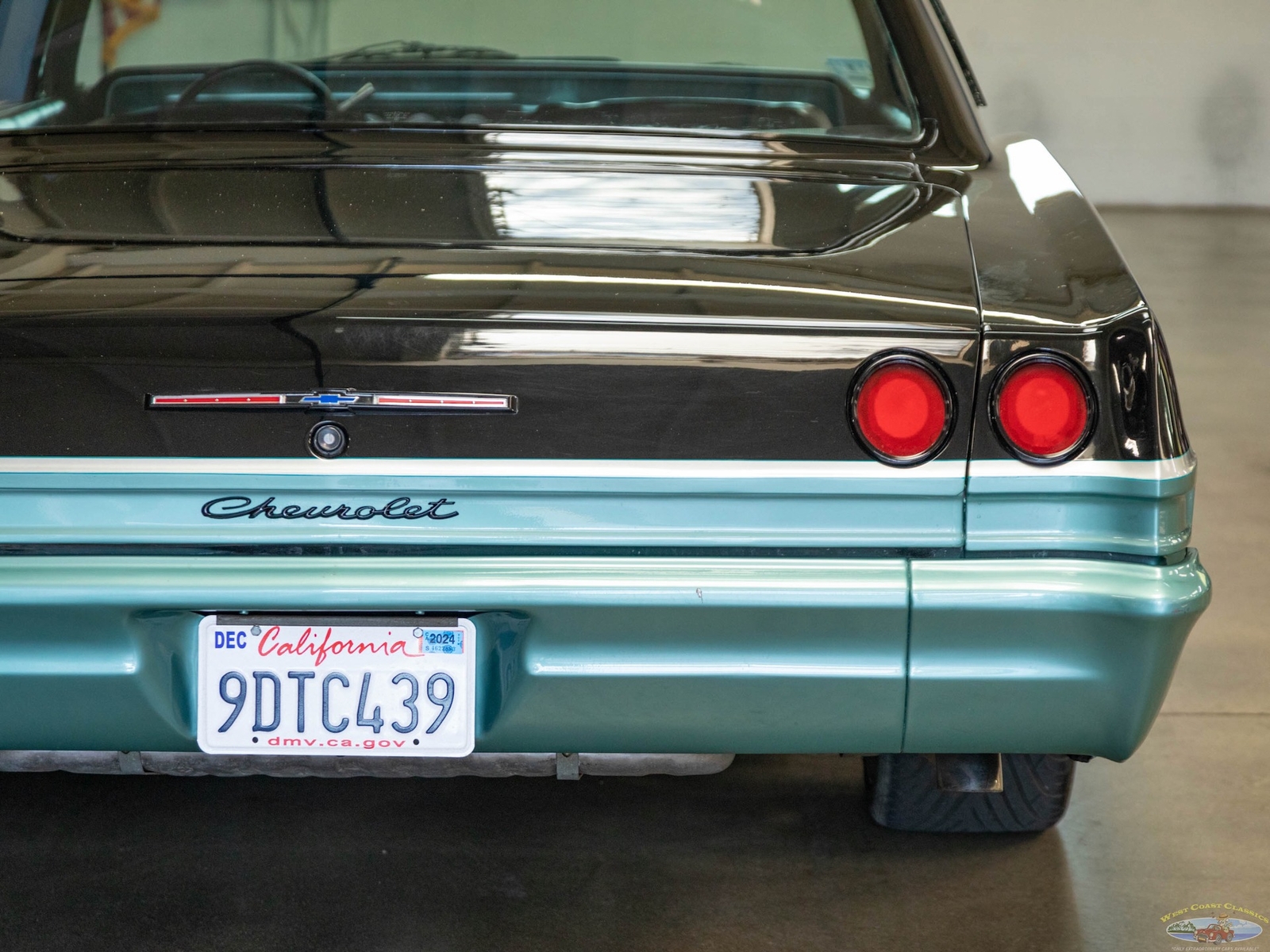 The body of the Biscayne is finished in a custom two-tone scheme featuring Black on the roof and upper half of the body with Turquoise on the lower half. A Silver horizontal stripe runs around the car to divide the two colors with Blue scallops on the rear quarters. To match the body, both bumpers and the grille have been refinished in Turquoise, while all the badging, window trim and chrome have been refinished in Black. Panel fitment and gaps are uniform across doors, panels, trunk and fiberglass hood. Additional features include a raised hood center section with imitation cowl induction scoop, hood pins, and Corvette flag emblems on the fenders.