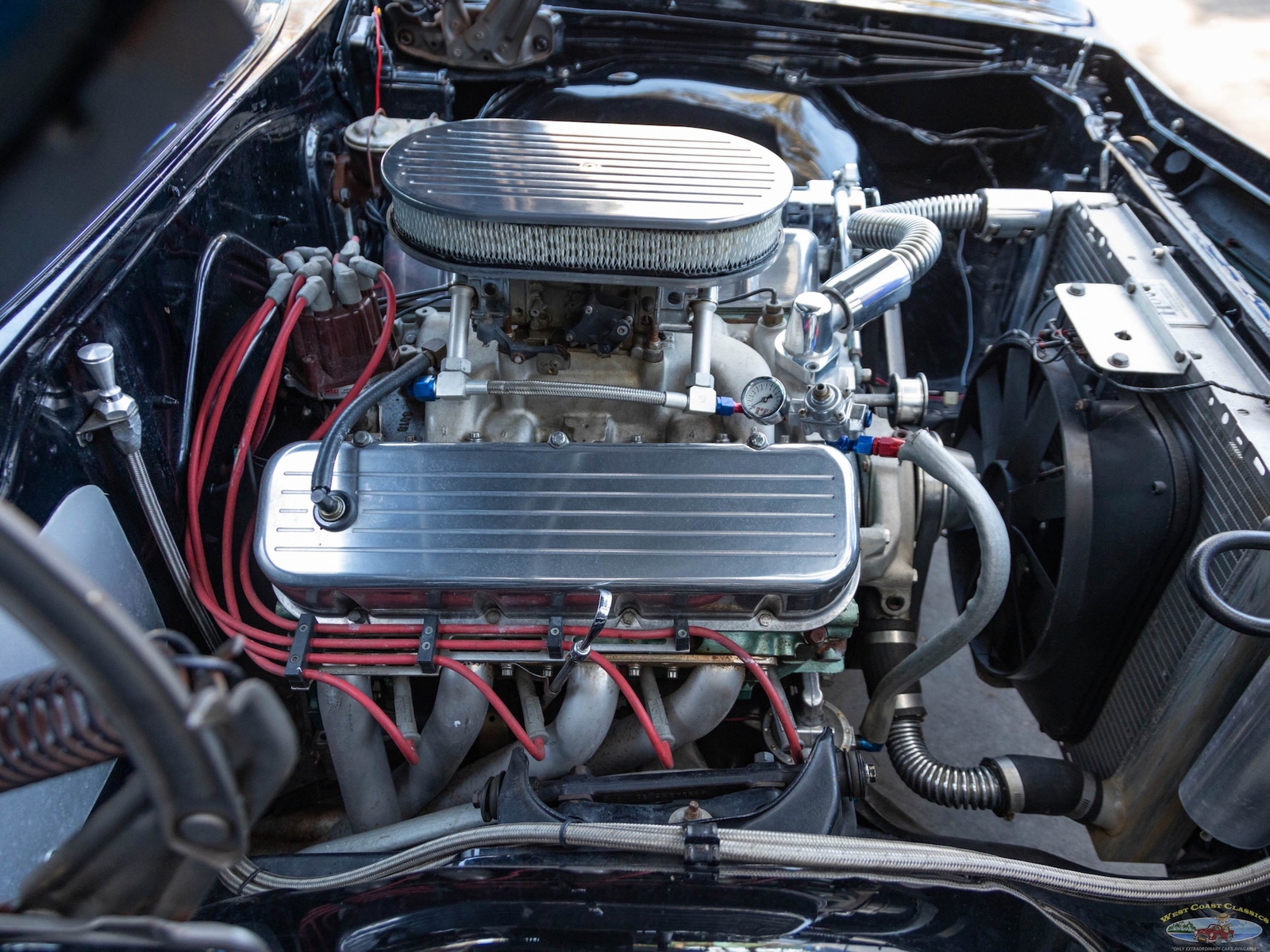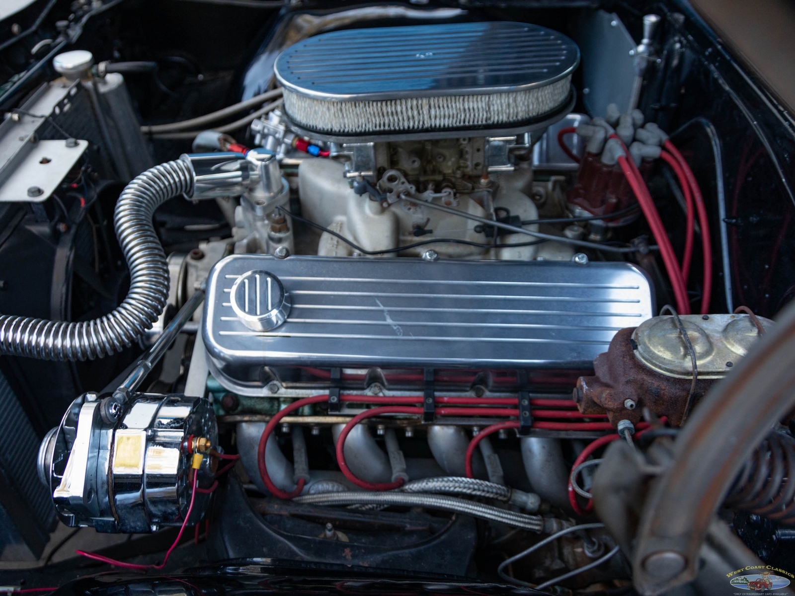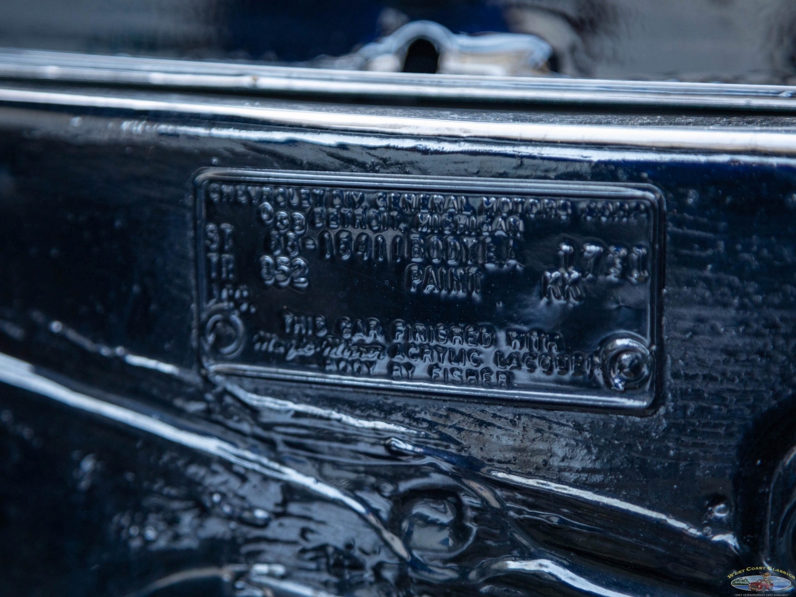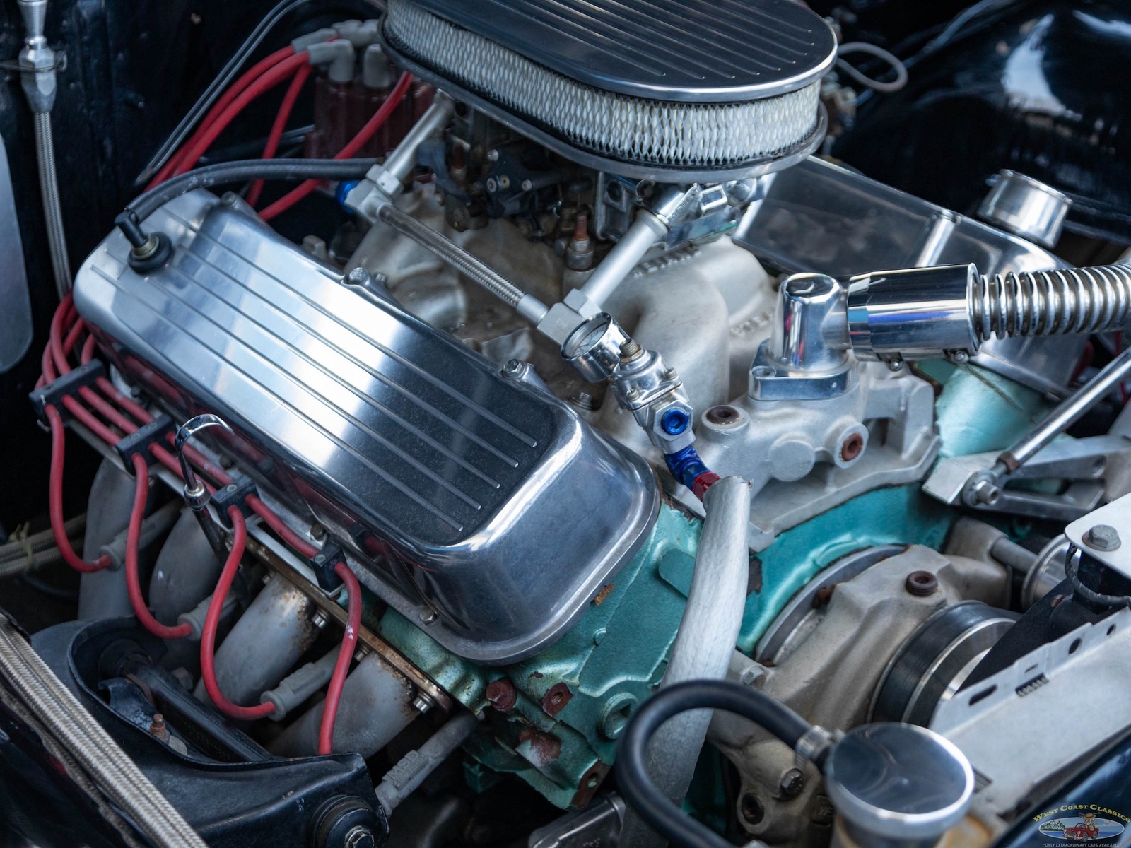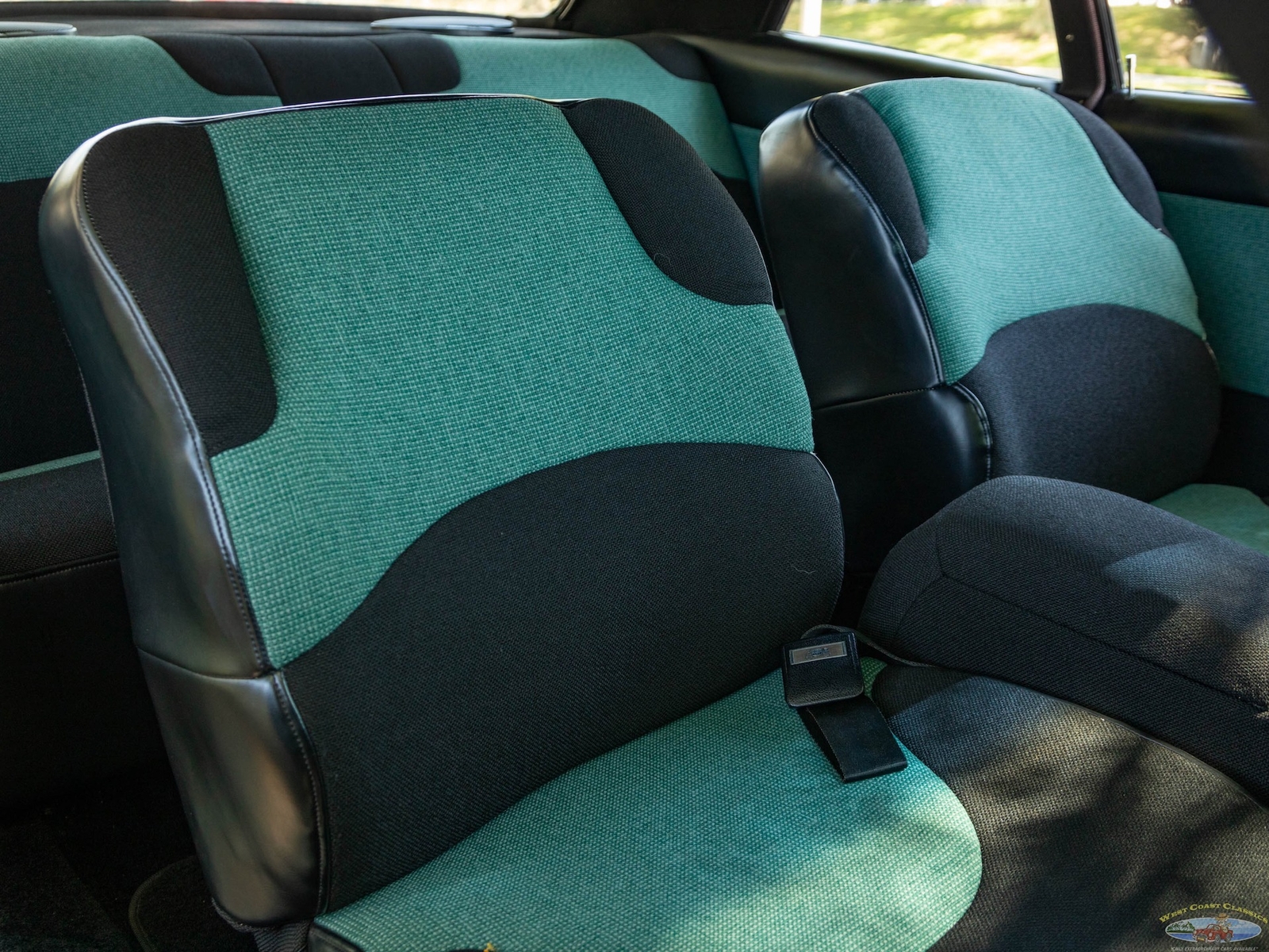 The body of the Biscayne is finished in a custom two-tone scheme featuring Black on the roof and upper half of the body with Turquoise on the lower half. A Silver horizontal stripe runs around the car to divide the two colors with Blue scallops on the rear quarters. To match the body, both bumpers and the grille have been refinished in Turquoise, while all the badging, window trim and chrome have been refinished in Black. Panel fitment and gaps are uniform across doors, panels, trunk and fiberglass hood. Additional features include a raised hood center section with imitation cowl induction scoop, hood pins, and Corvette flag emblems on the fenders.