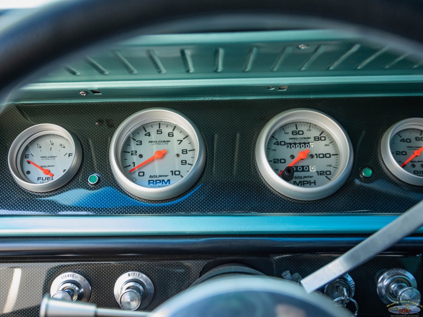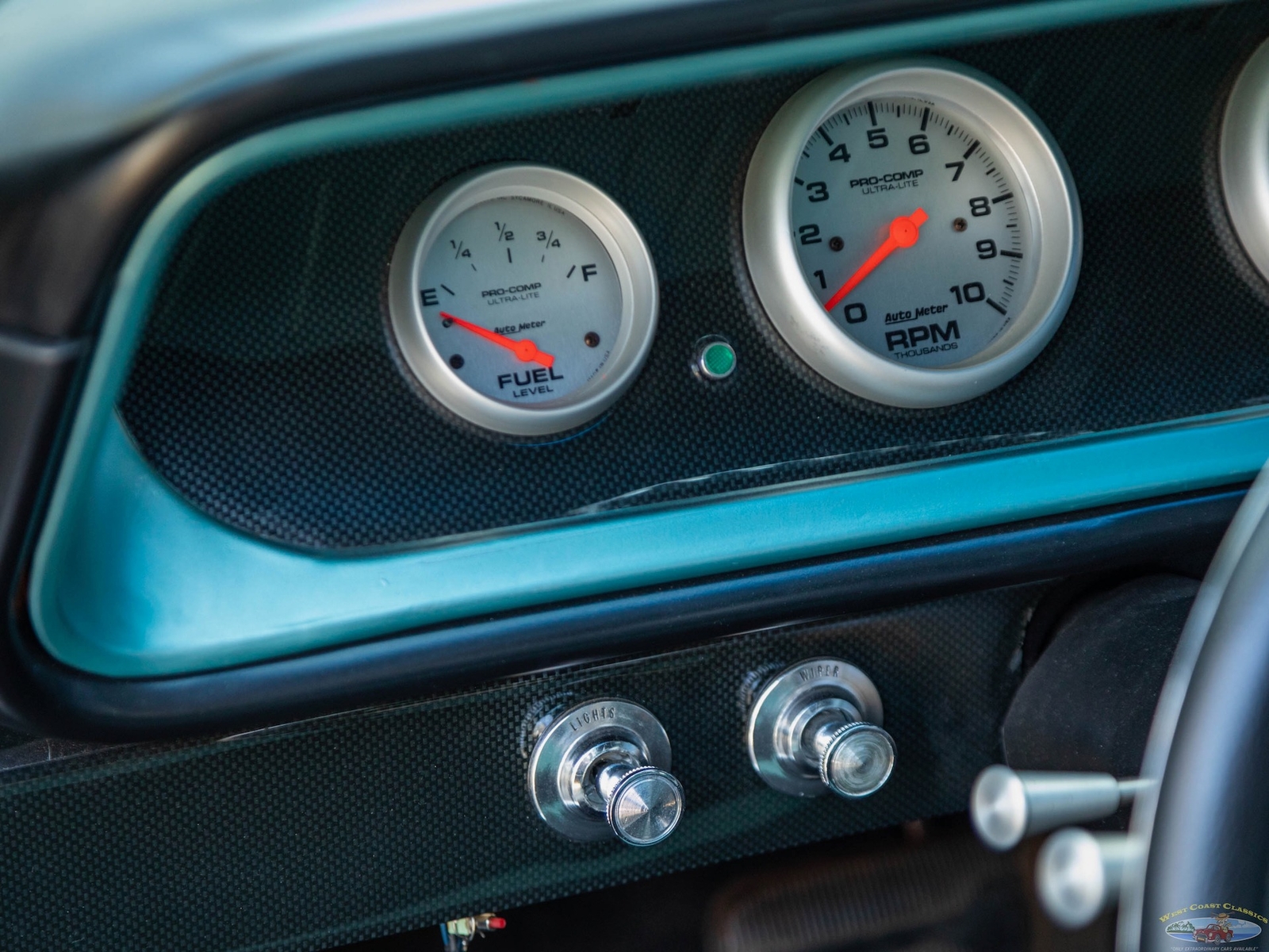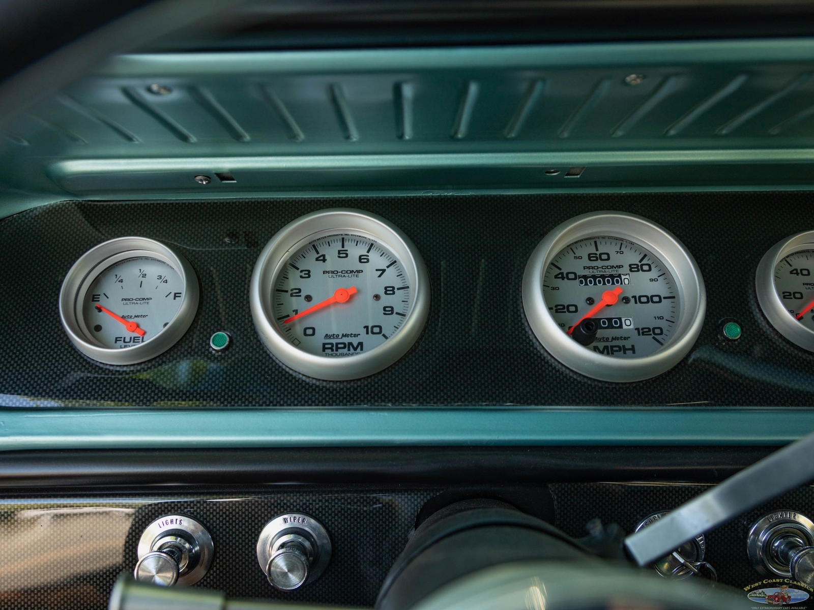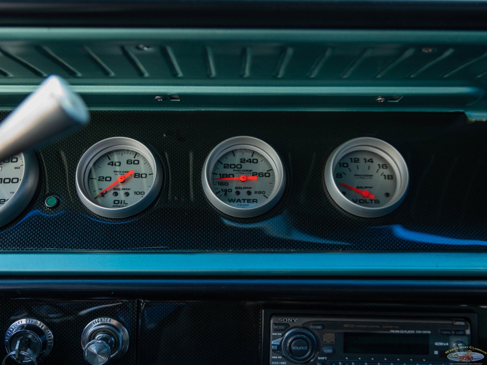 A 3-spoke Billet Specialties steering wheel is mounted to a tilt steering column with a billet gear selector. The original gauges have been replaced with AutoMeter Pro-Comp Ultralight gauges surrounded by a carbon-fiber trim panel. A 120mph speedometer is featured along with a 10k rpm tachometer. Additional gauges include fuel, water temperature, oil pressure, and voltage. The dash has been finished in turquoise to match the exterior.