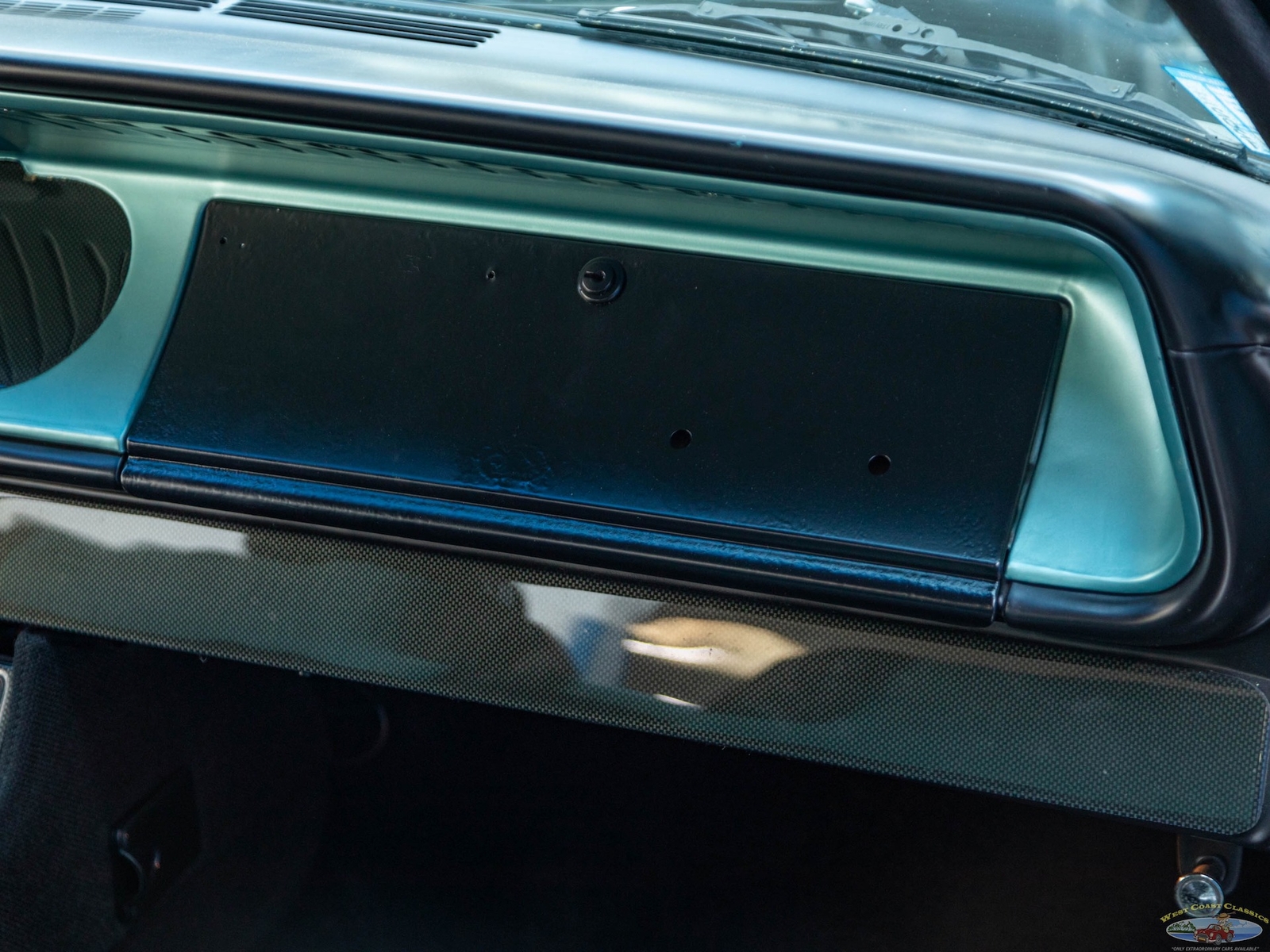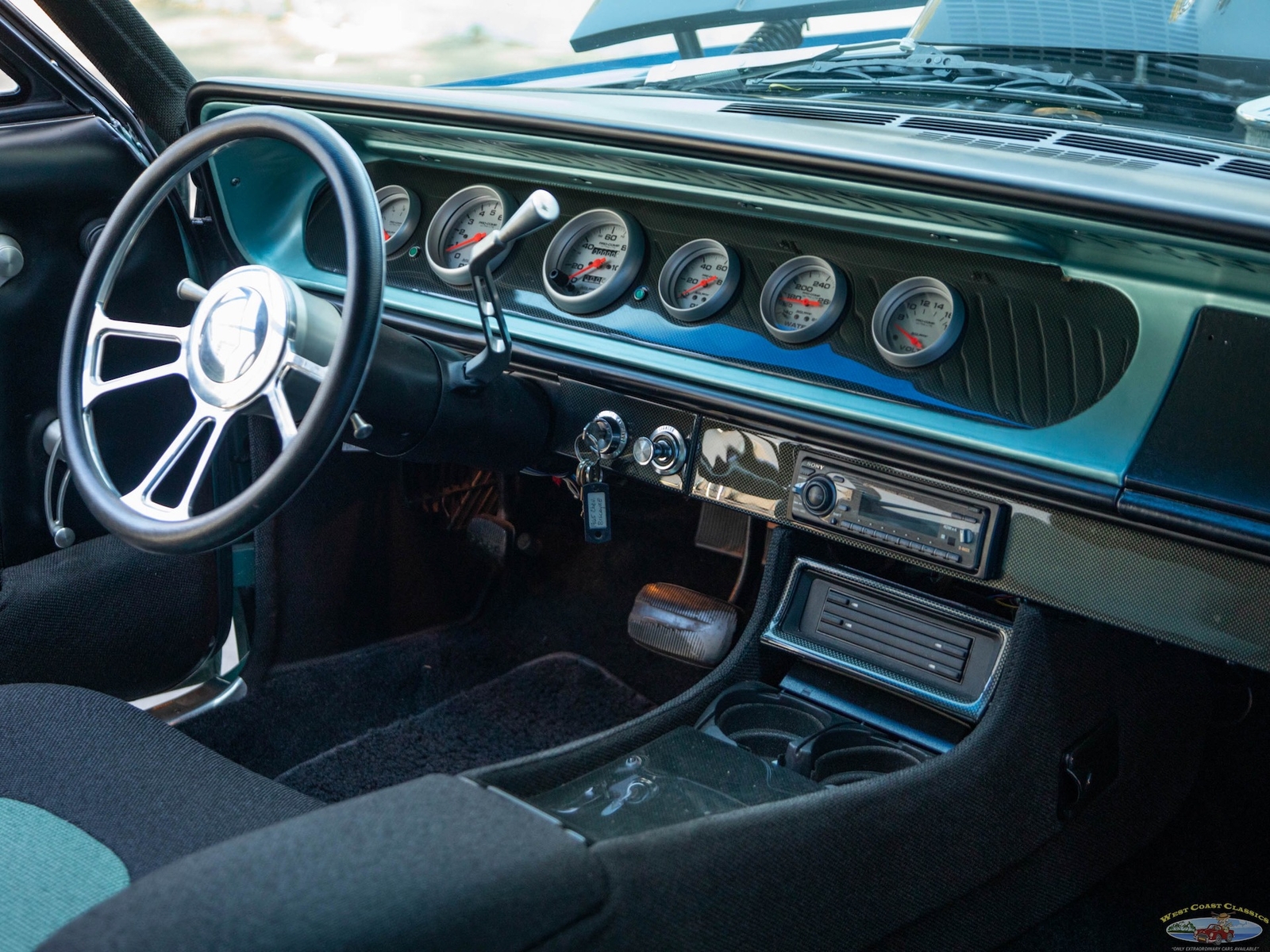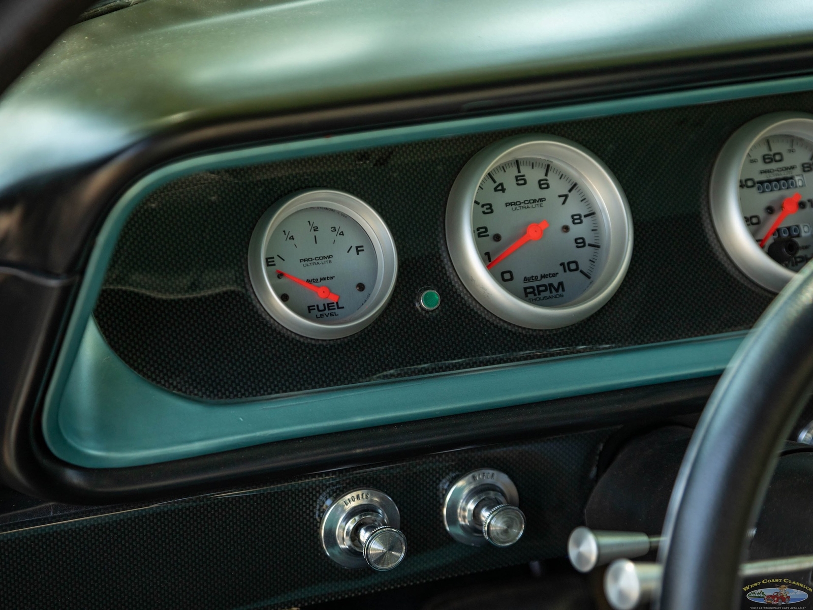 A 3-spoke Billet Specialties steering wheel is mounted to a tilt steering column with a billet gear selector. The original gauges have been replaced with AutoMeter Pro-Comp Ultralight gauges surrounded by a carbon-fiber trim panel. A 120mph speedometer is featured along with a 10k rpm tachometer. Additional gauges include fuel, water temperature, oil pressure, and voltage. The dash has been finished in turquoise to match the exterior.