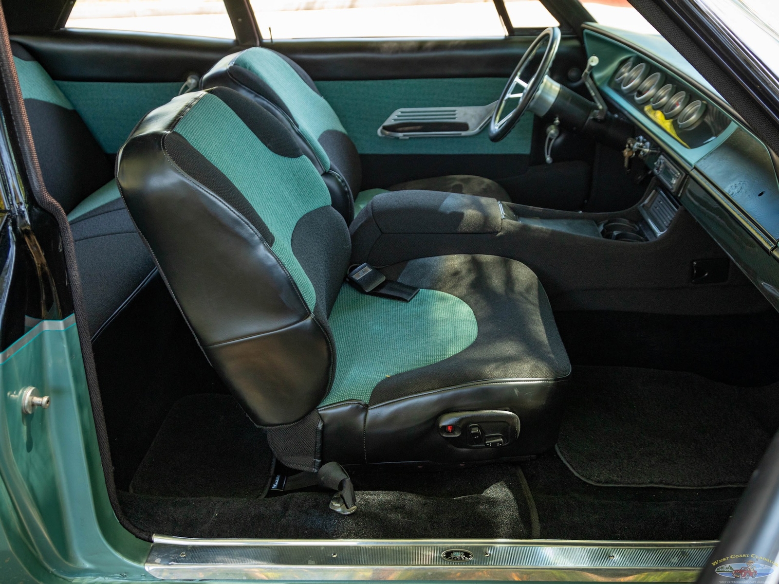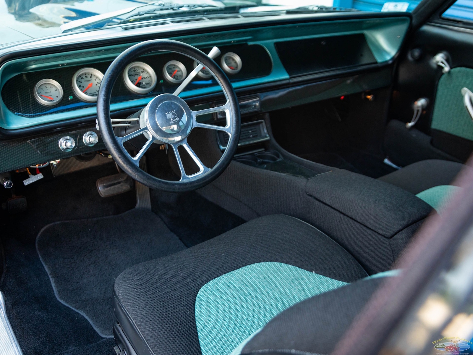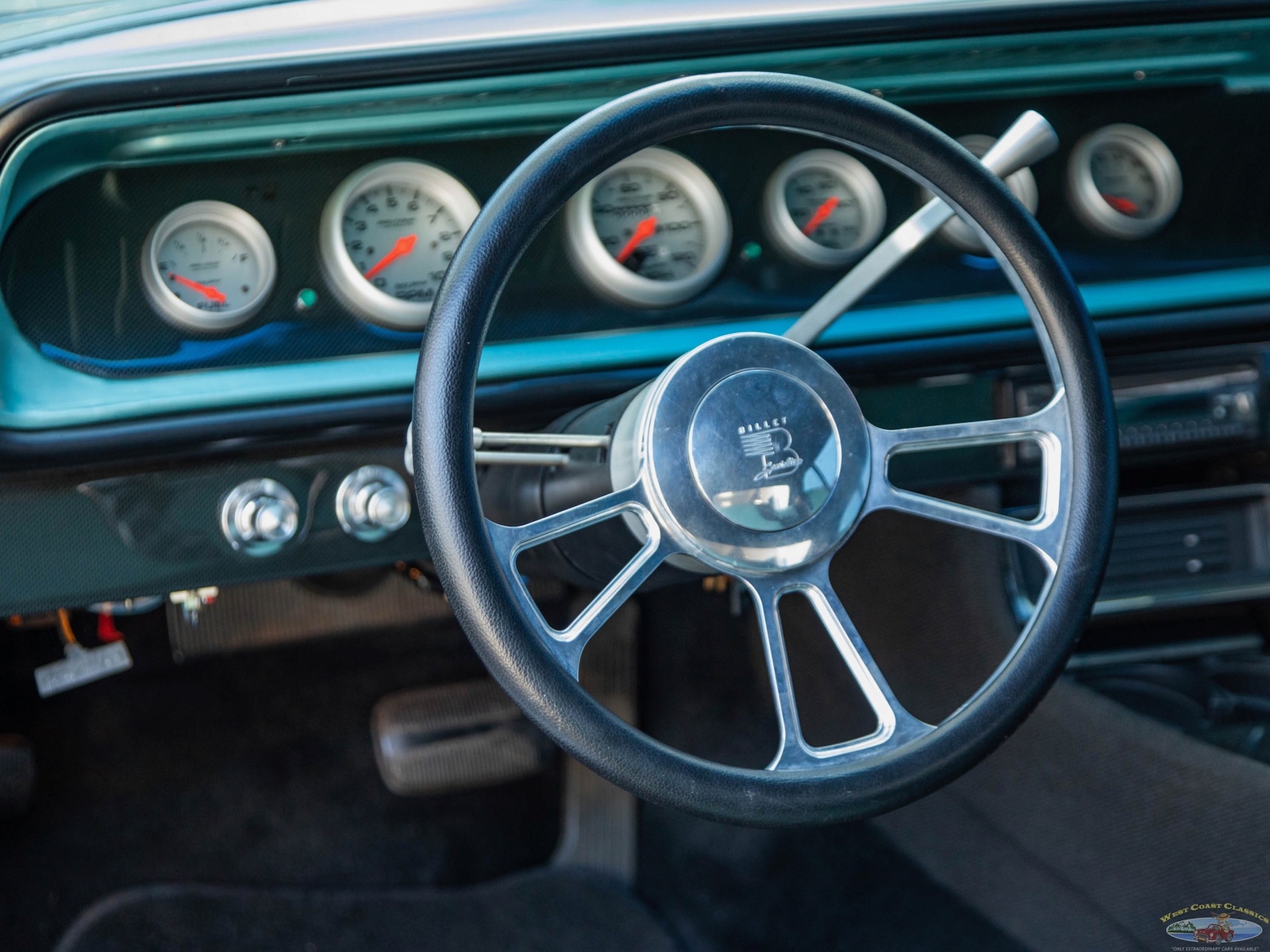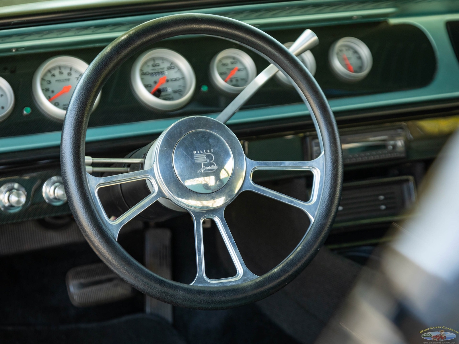 A 3-spoke Billet Specialties steering wheel is mounted to a tilt steering column with a billet gear selector. The original gauges have been replaced with AutoMeter Pro-Comp Ultralight gauges surrounded by a carbon-fiber trim panel. A 120mph speedometer is featured along with a 10k rpm tachometer. Additional gauges include fuel, water temperature, oil pressure, and voltage. The dash has been finished in turquoise to match the exterior.