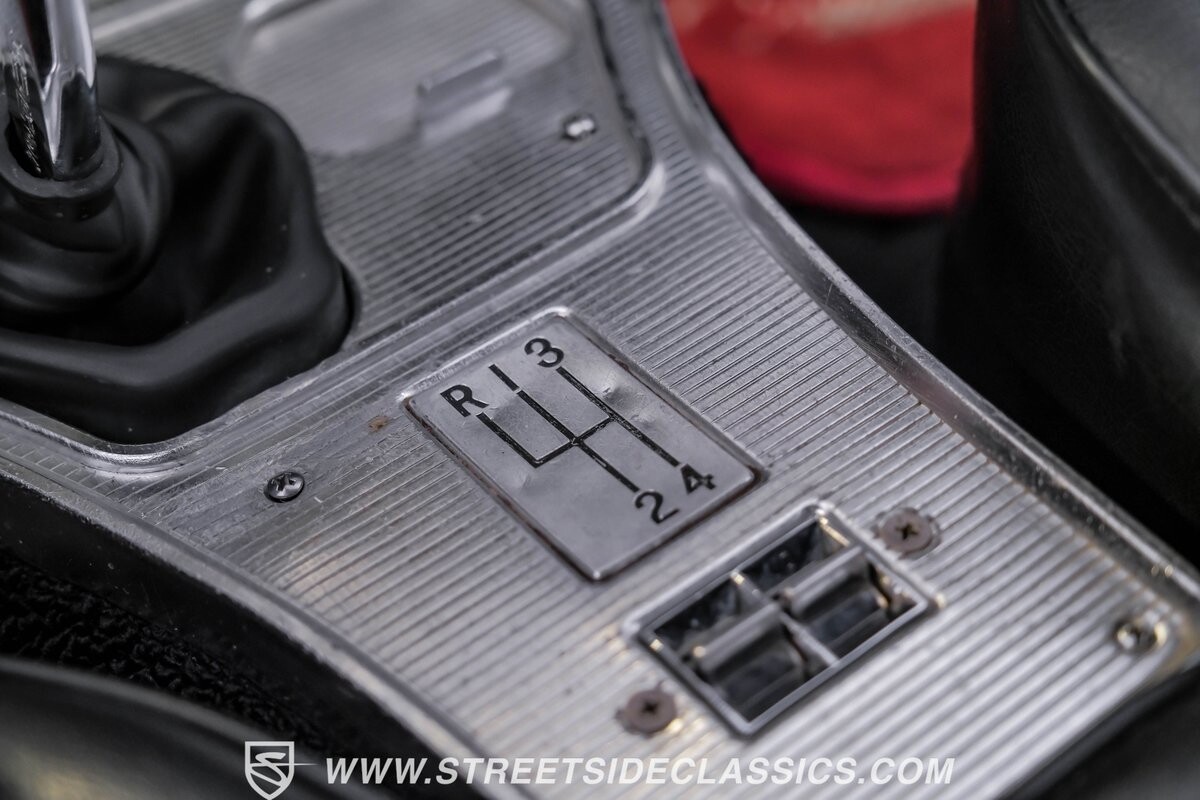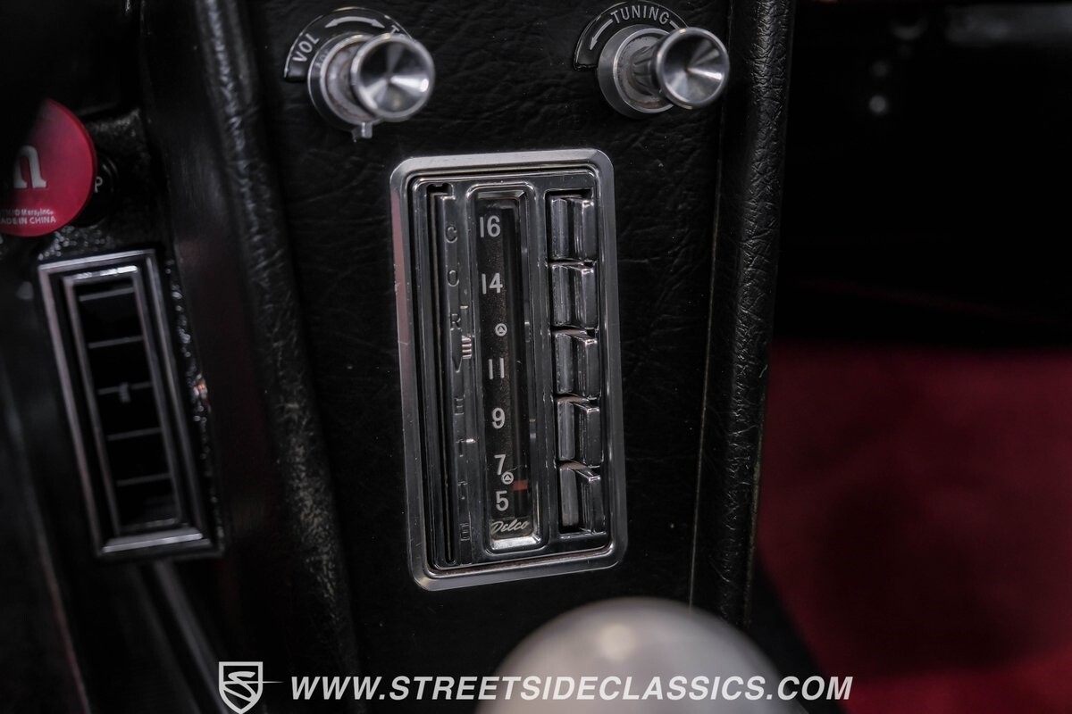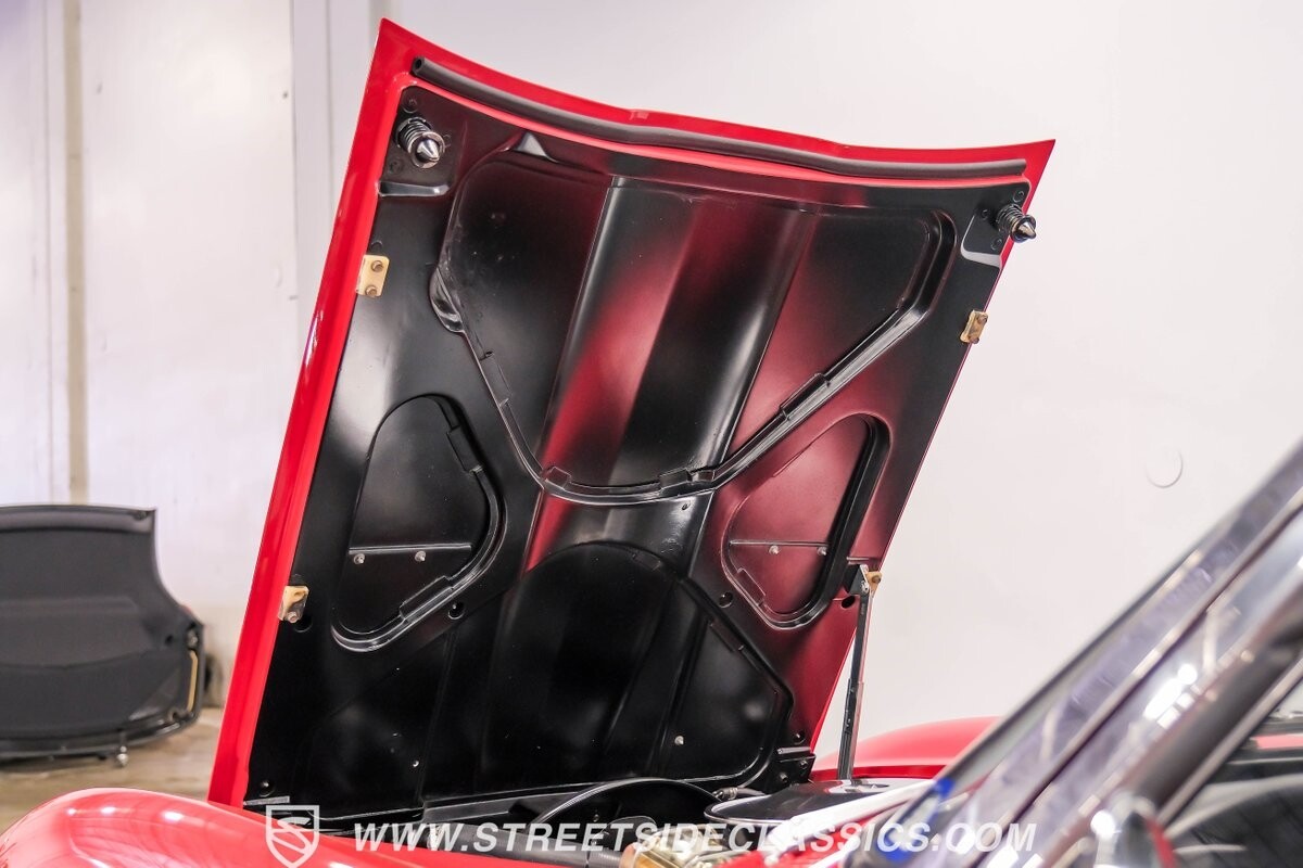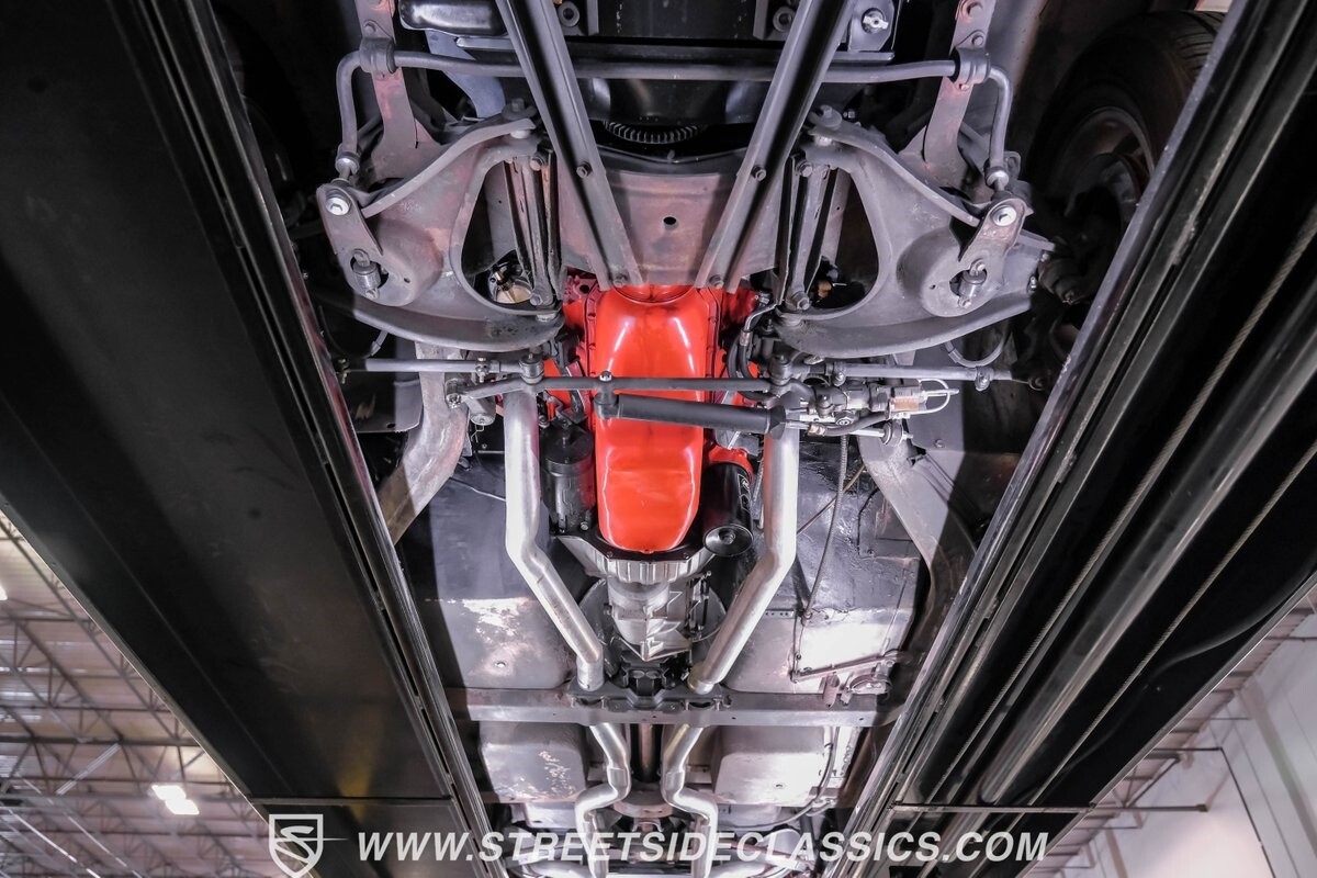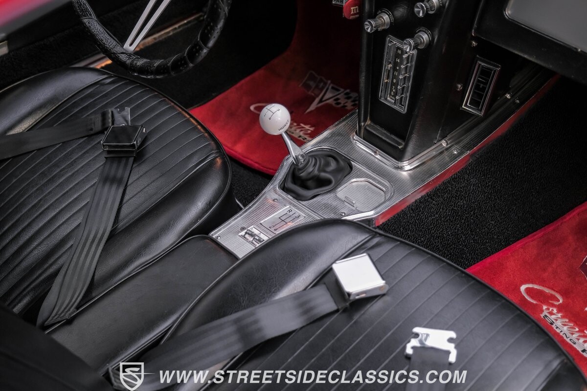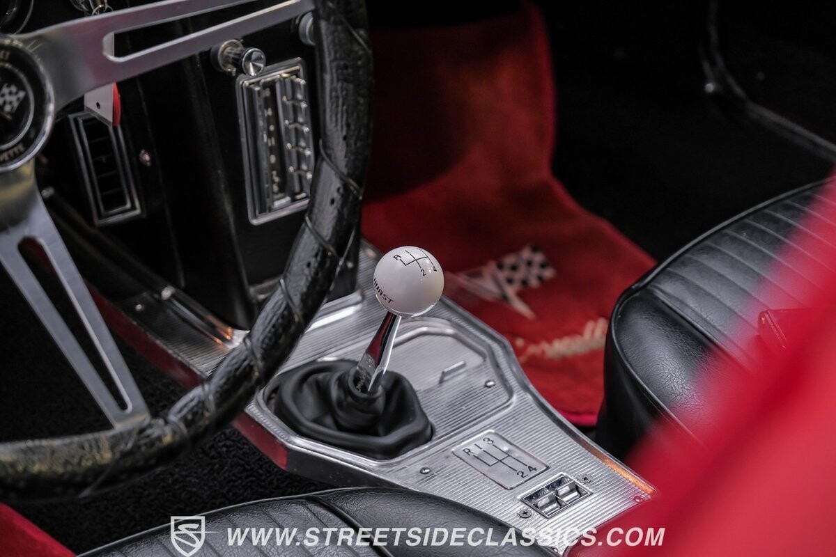 Inside, black vinyl upholstery captures classic Corvette spirit. Power windows, an uncommon luxury for the era, enhance the driving experience. The cockpit centers around sculpted bucket seats and a purposeful console. A Hurst shifter awaits action, while Classic Air A/C maintains comfort without compromising authenticity.