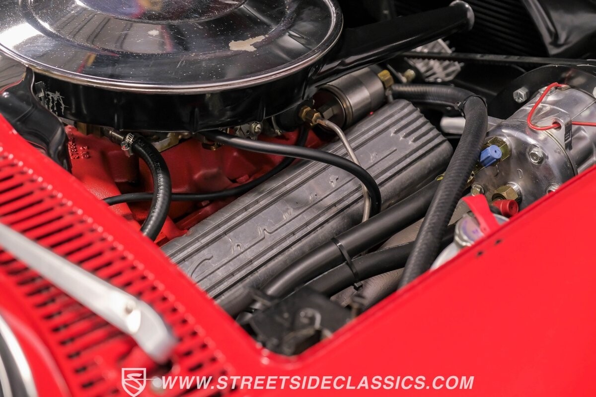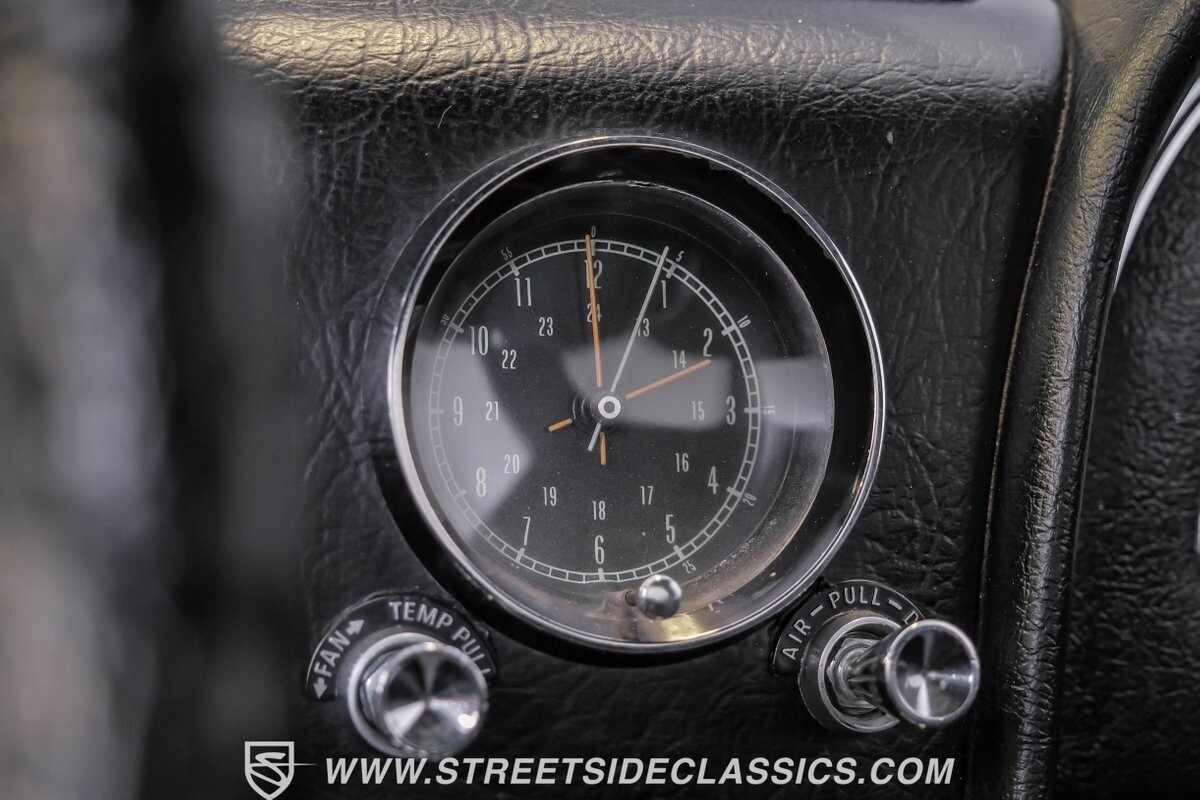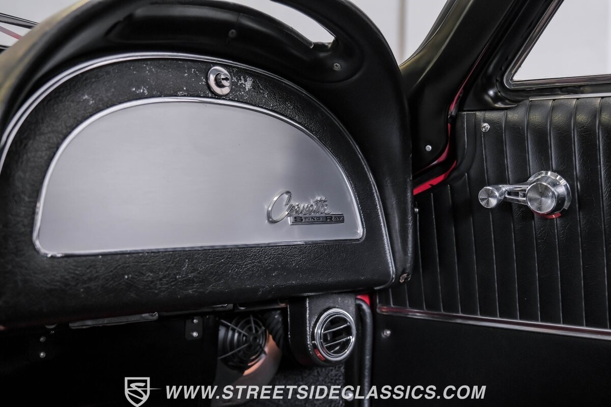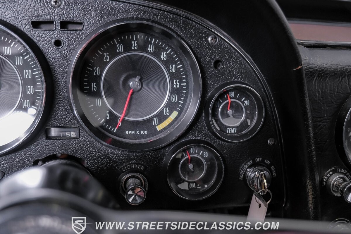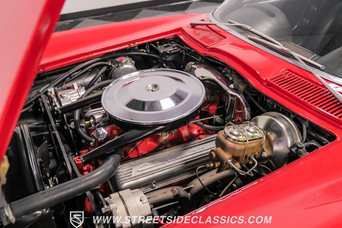 Inside, black vinyl upholstery captures classic Corvette spirit. Power windows, an uncommon luxury for the era, enhance the driving experience. The cockpit centers around sculpted bucket seats and a purposeful console. A Hurst shifter awaits action, while Classic Air A/C maintains comfort without compromising authenticity.