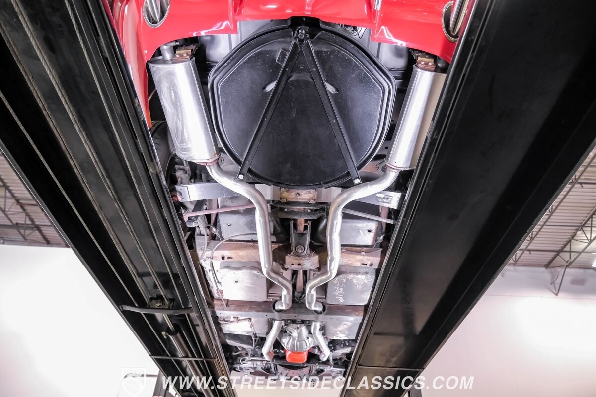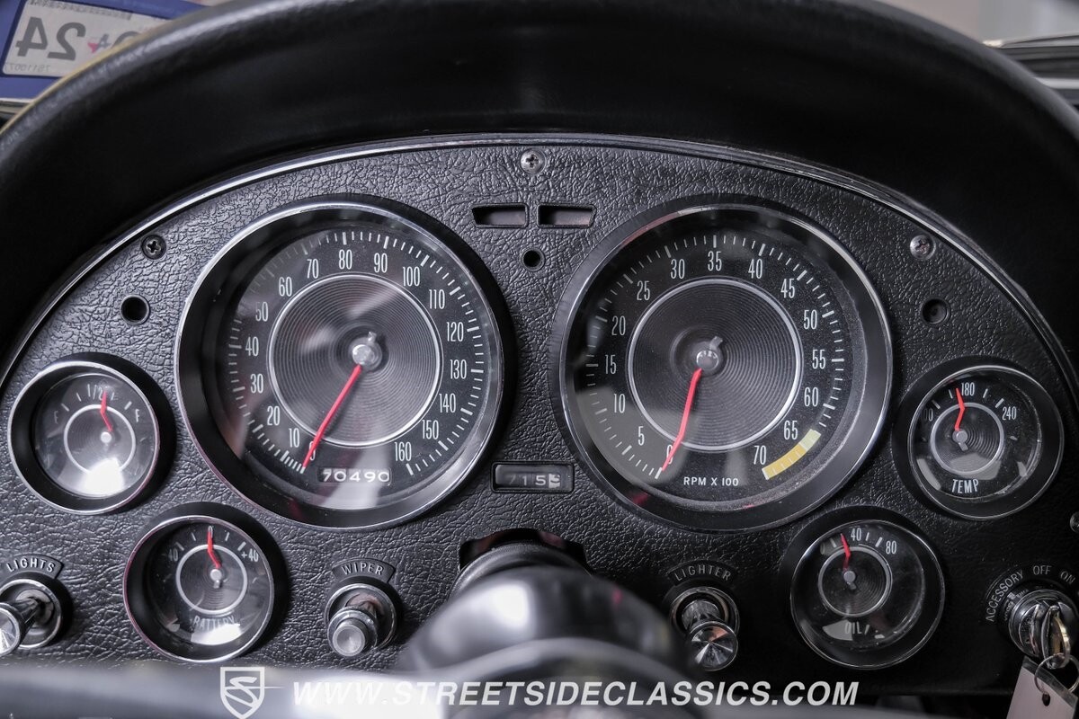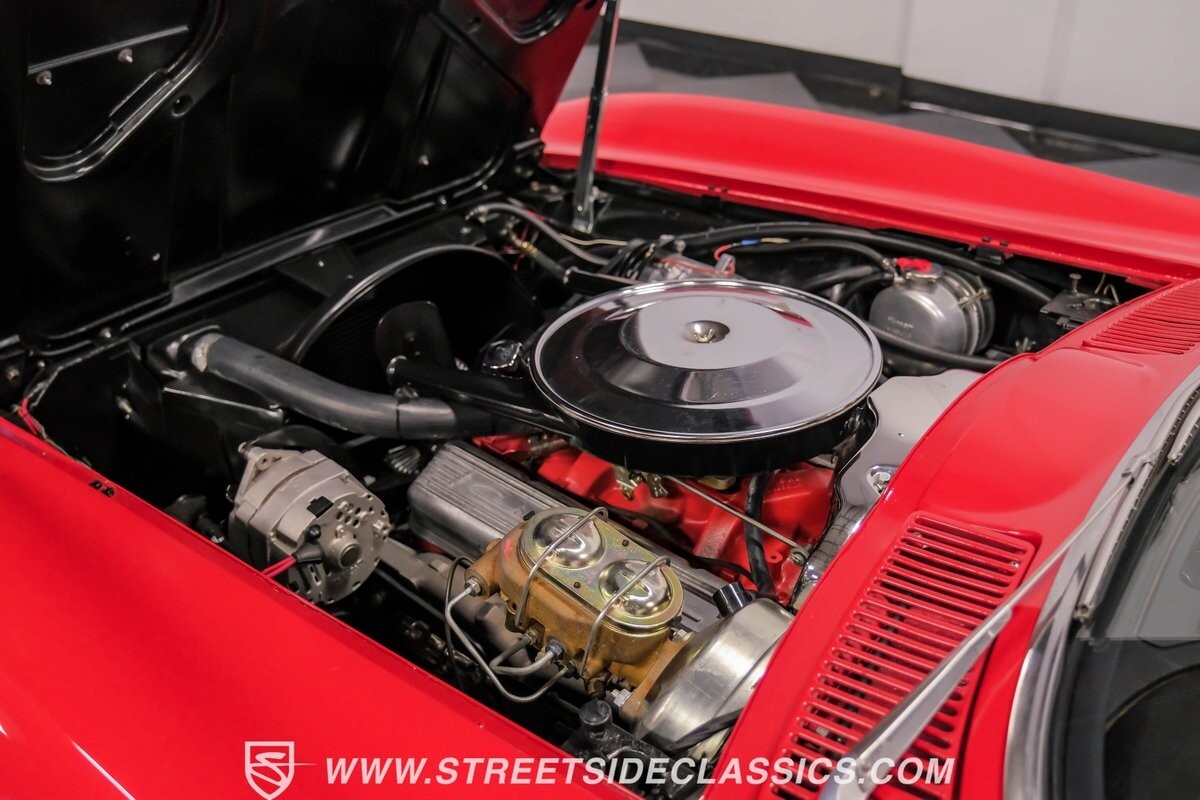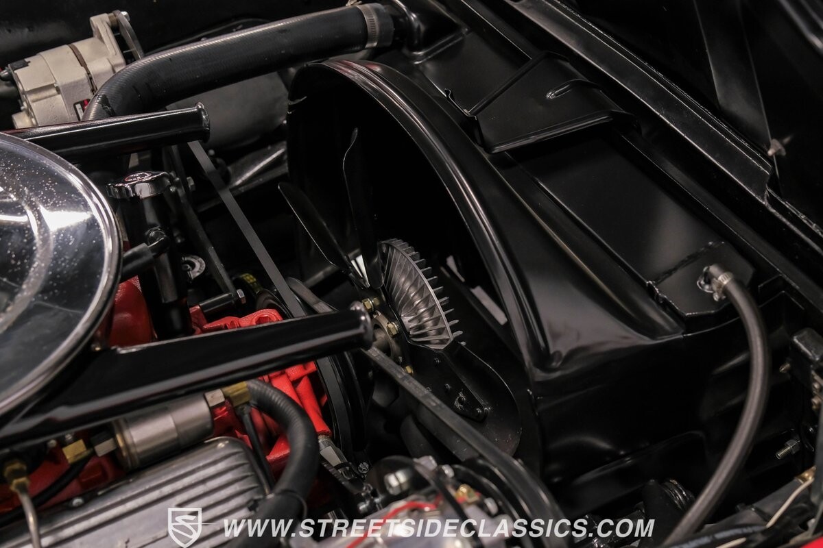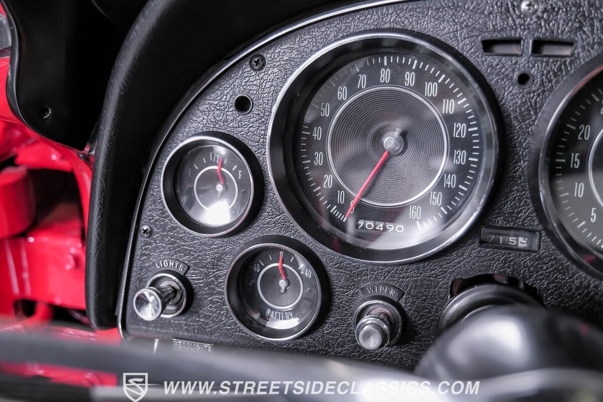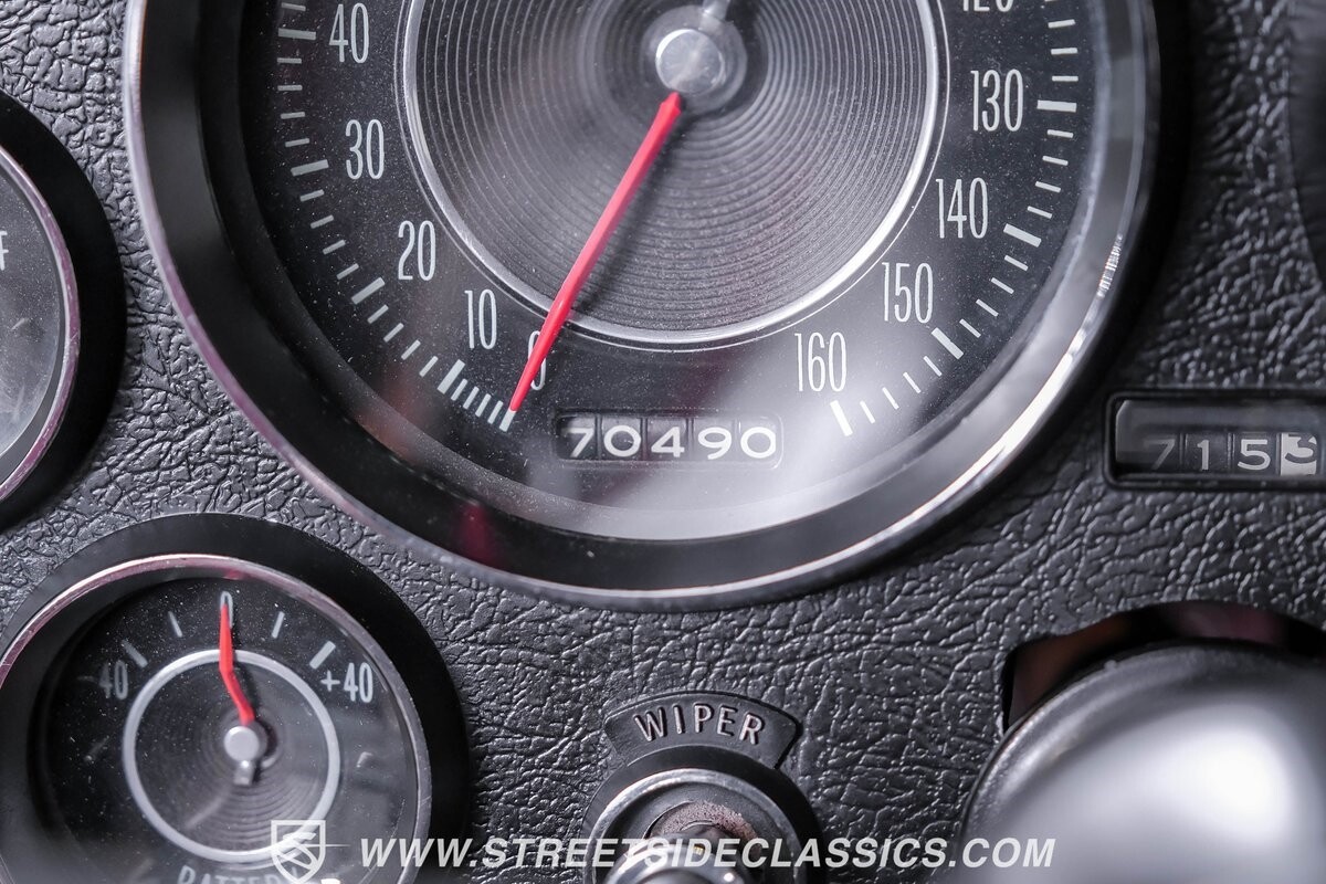 Inside, black vinyl upholstery captures classic Corvette spirit. Power windows, an uncommon luxury for the era, enhance the driving experience. The cockpit centers around sculpted bucket seats and a purposeful console. A Hurst shifter awaits action, while Classic Air A/C maintains comfort without compromising authenticity.